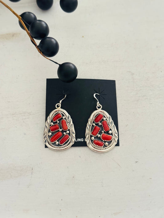 Julia Etsitty Coral & Sterling Silver Dangle Cluster Earrings