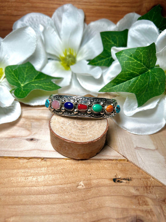 Navajo Made Multi Stone & Sterling Silver Inlay Cuff Bracelet