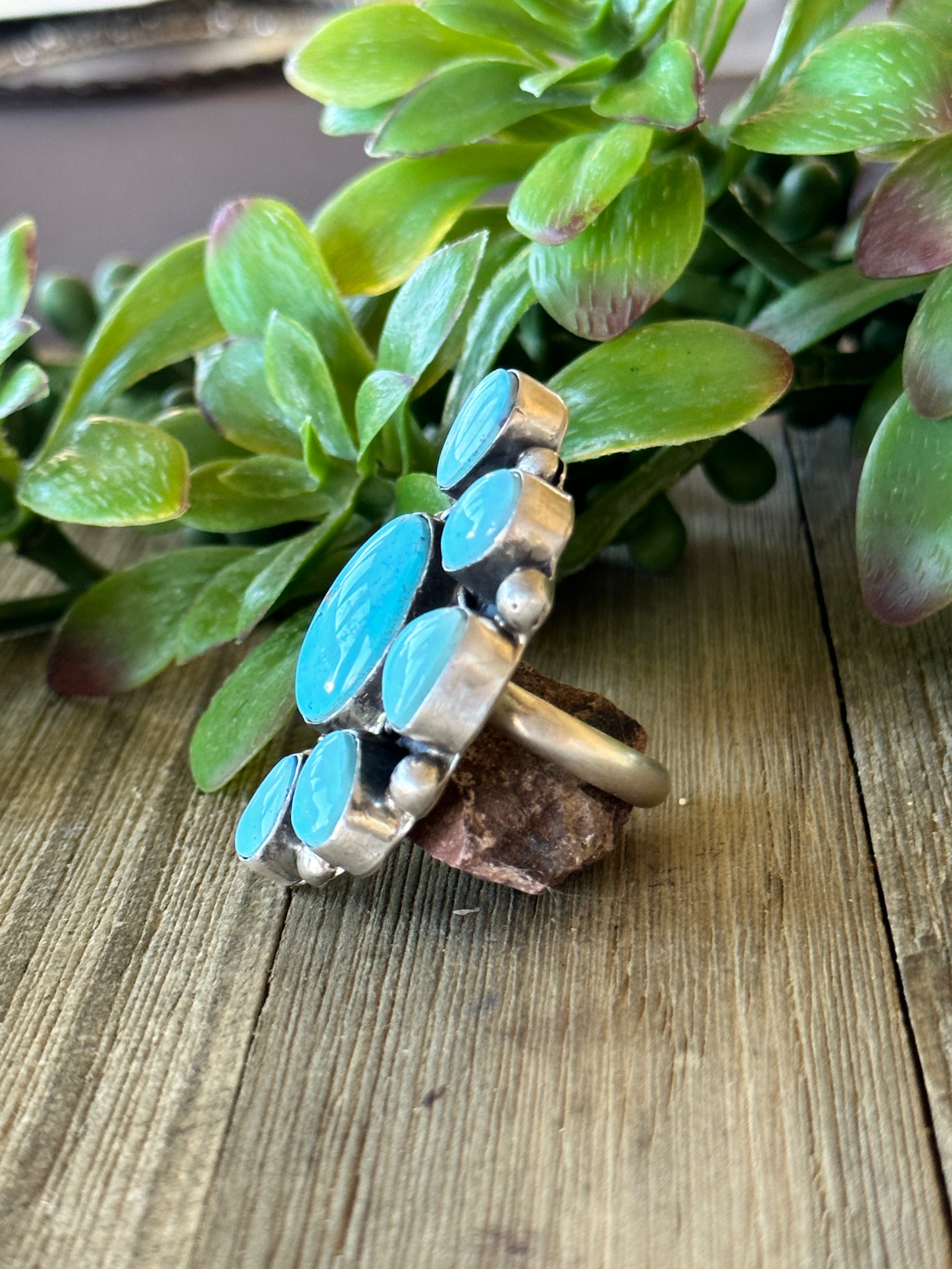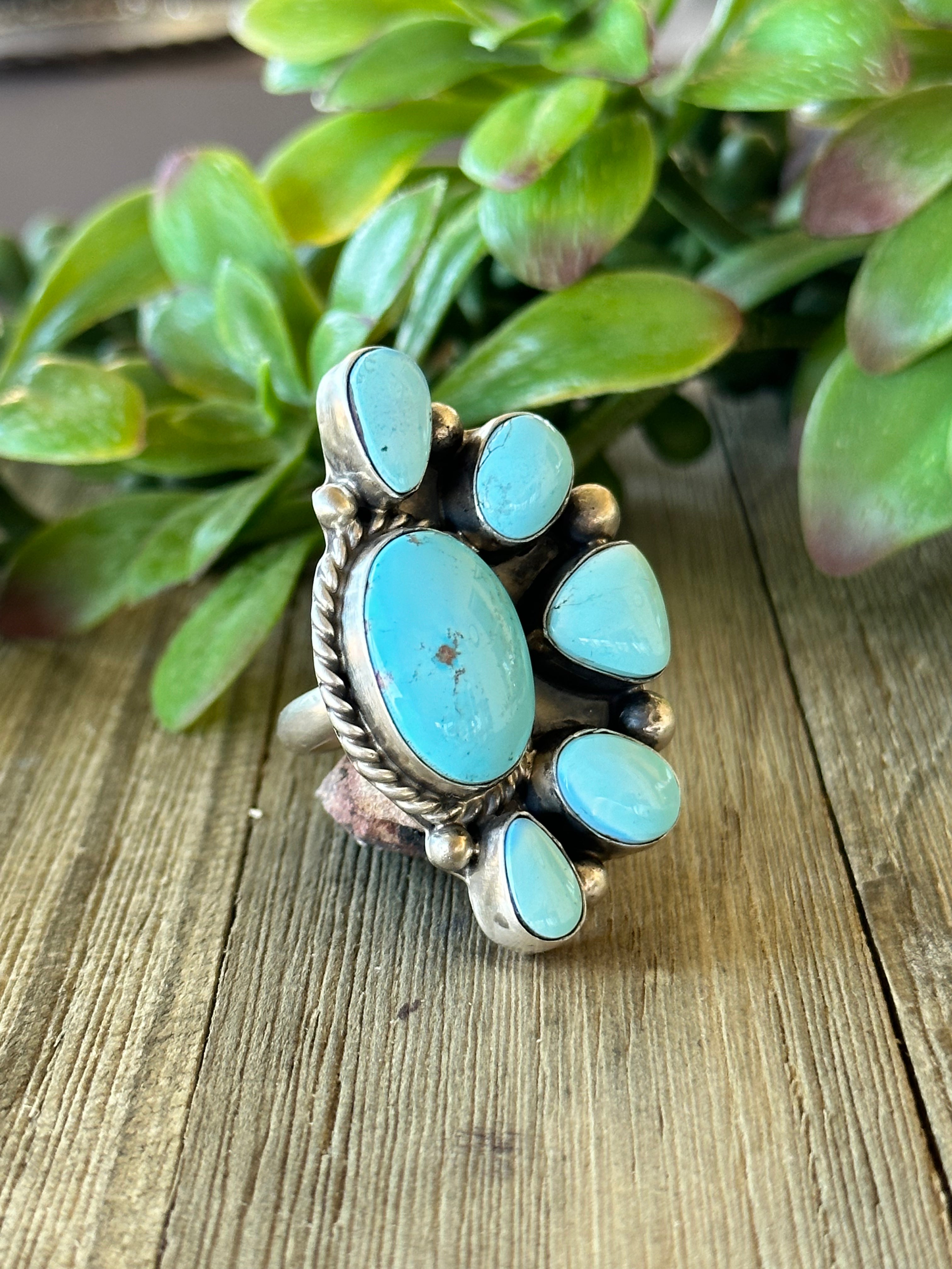 Beautiful ring Augustine Largo Golden Hills Turquoise & Sterling Silver Half Cluster Adjustable Ring. It measures 1 7/8 inches long and 1 1/8 inches wide. Signed by the artist and stamped sterling silver.