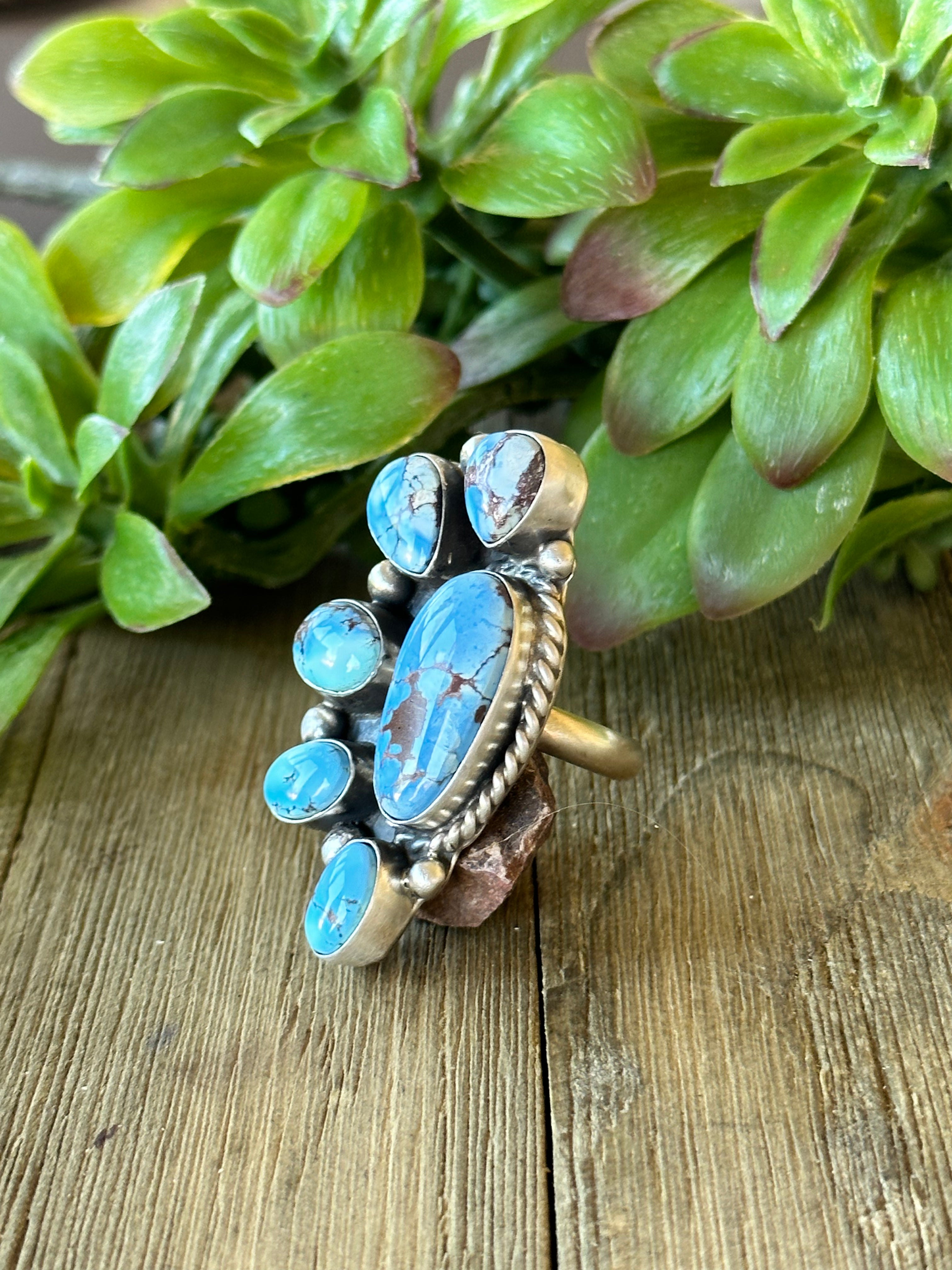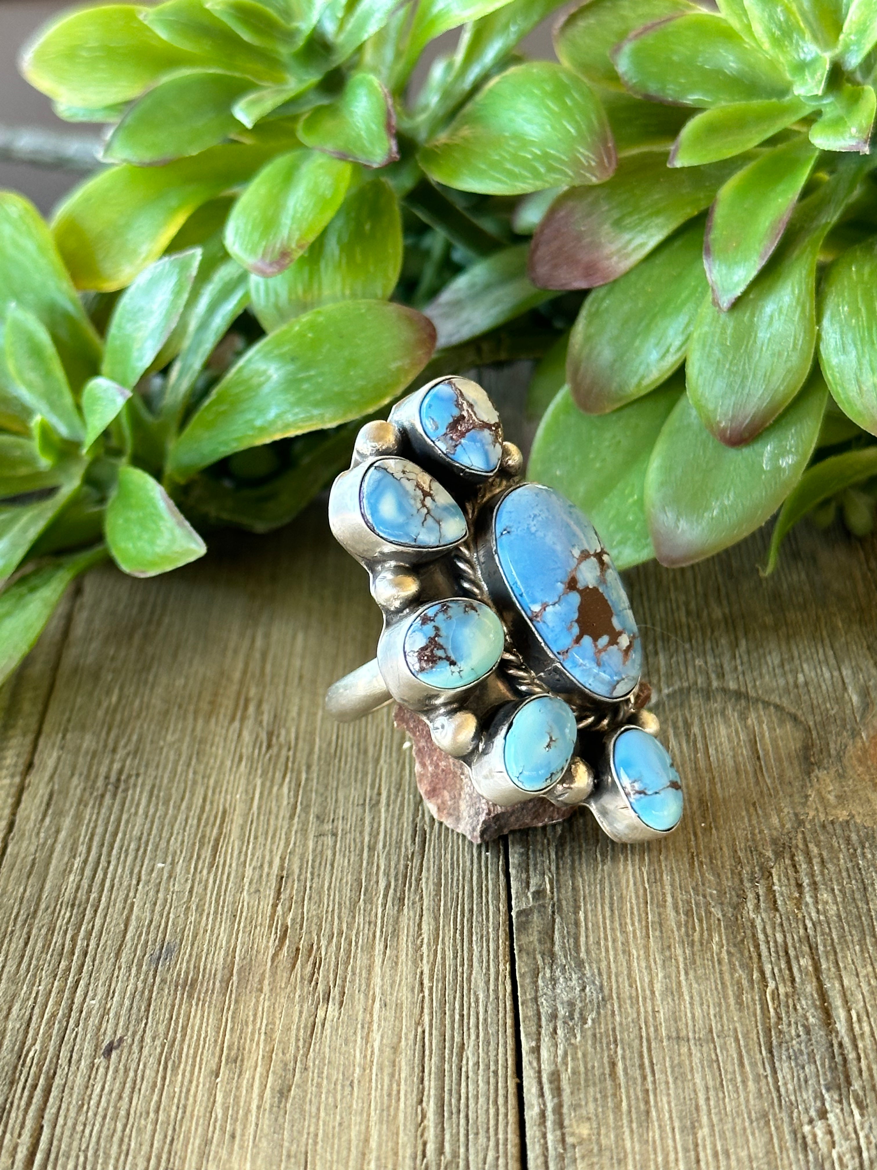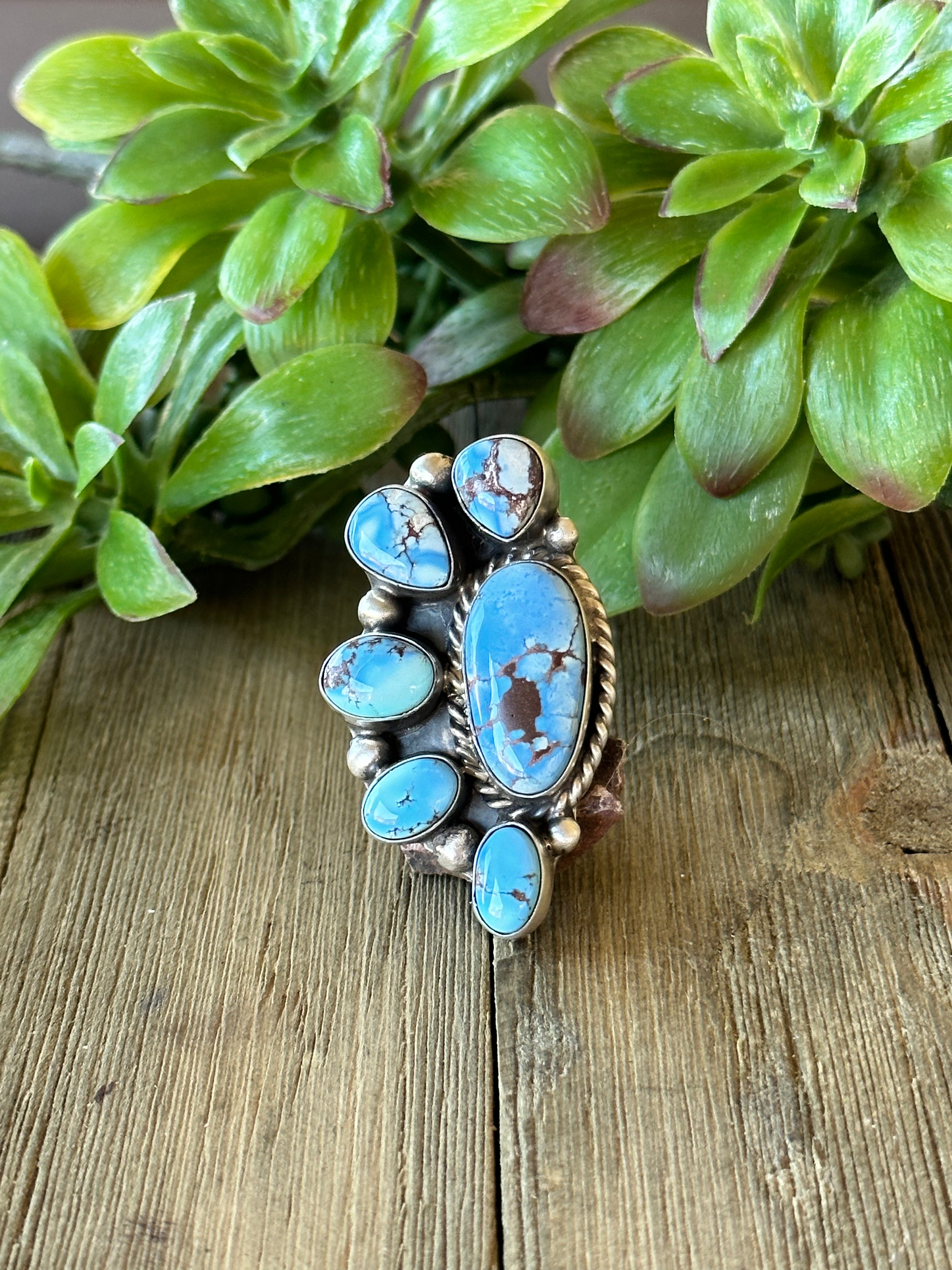 Beautiful ring Augustine Largo Golden Hills Turquoise & Sterling Silver Half Cluster Adjustable Ring. It measures 1 7/8 inches long and 1 1/8 inches wide. Signed by the artist and stamped sterling silver.