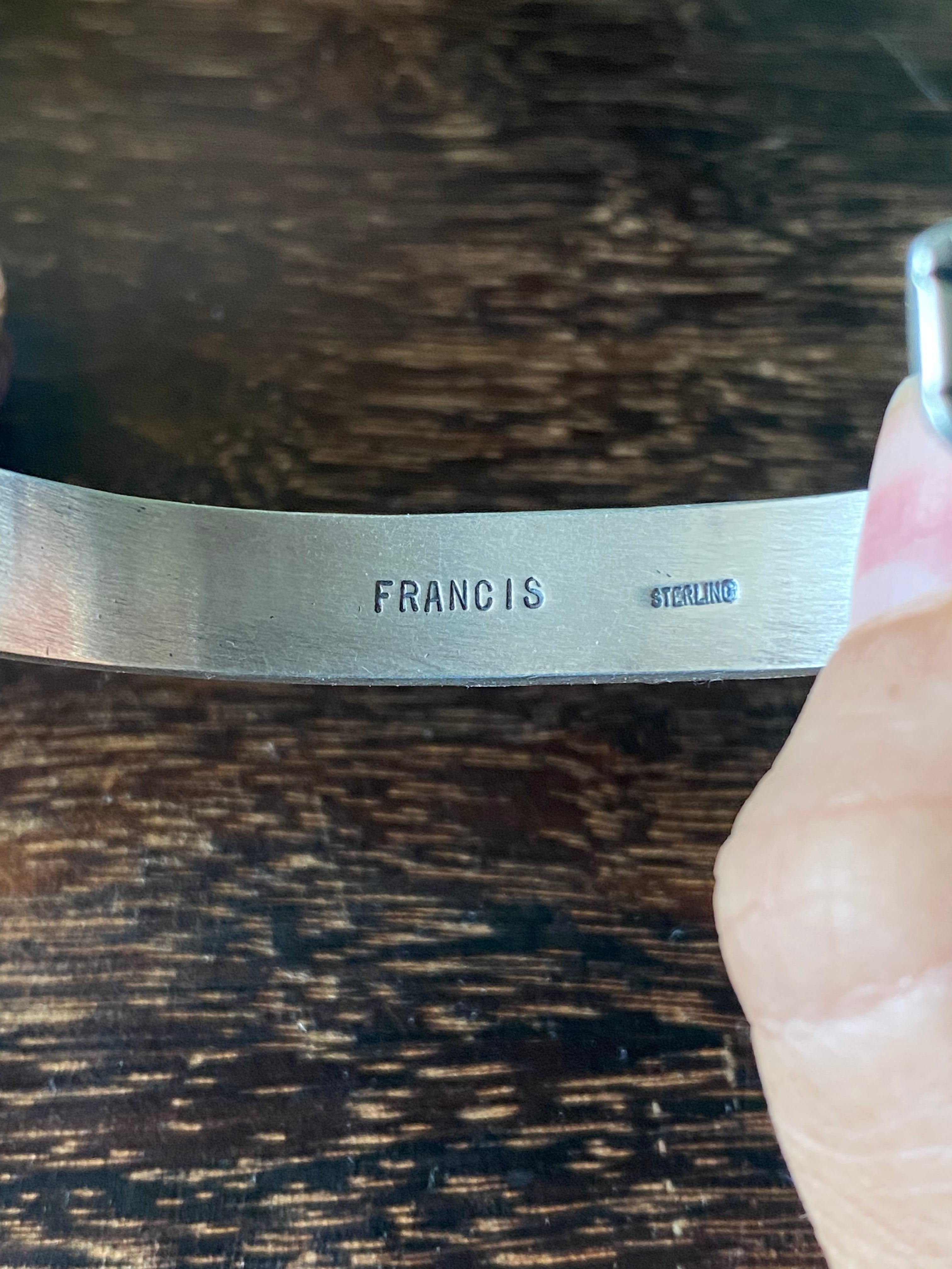 Francis Yazzie Golden Hill’s Turquoise & Sterling Silver Cuff Bracelet. It measures just over 3/8 of an inch wide with an inside circumference of 5 3/8 inches and a gap of 1 3/8 inches. Signed by the artist and stamped sterling silver.