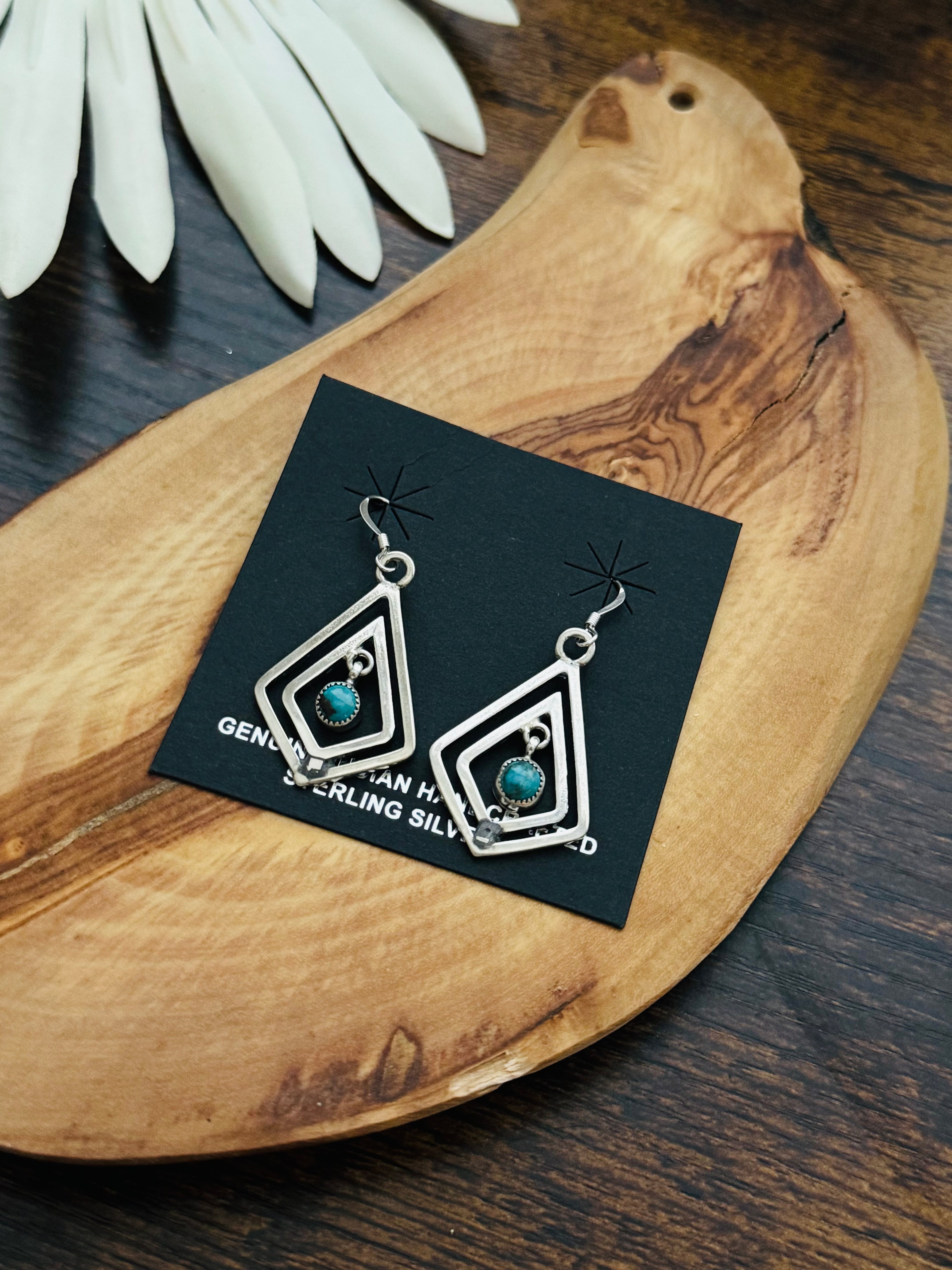 Beautiful dangle earrings. Navajo Made Kingman Turquoise & Sterling Silver Dangle Earrings. It measures 1 3/4 inches long and 7/8 of an inch wide . Signed and stamped.