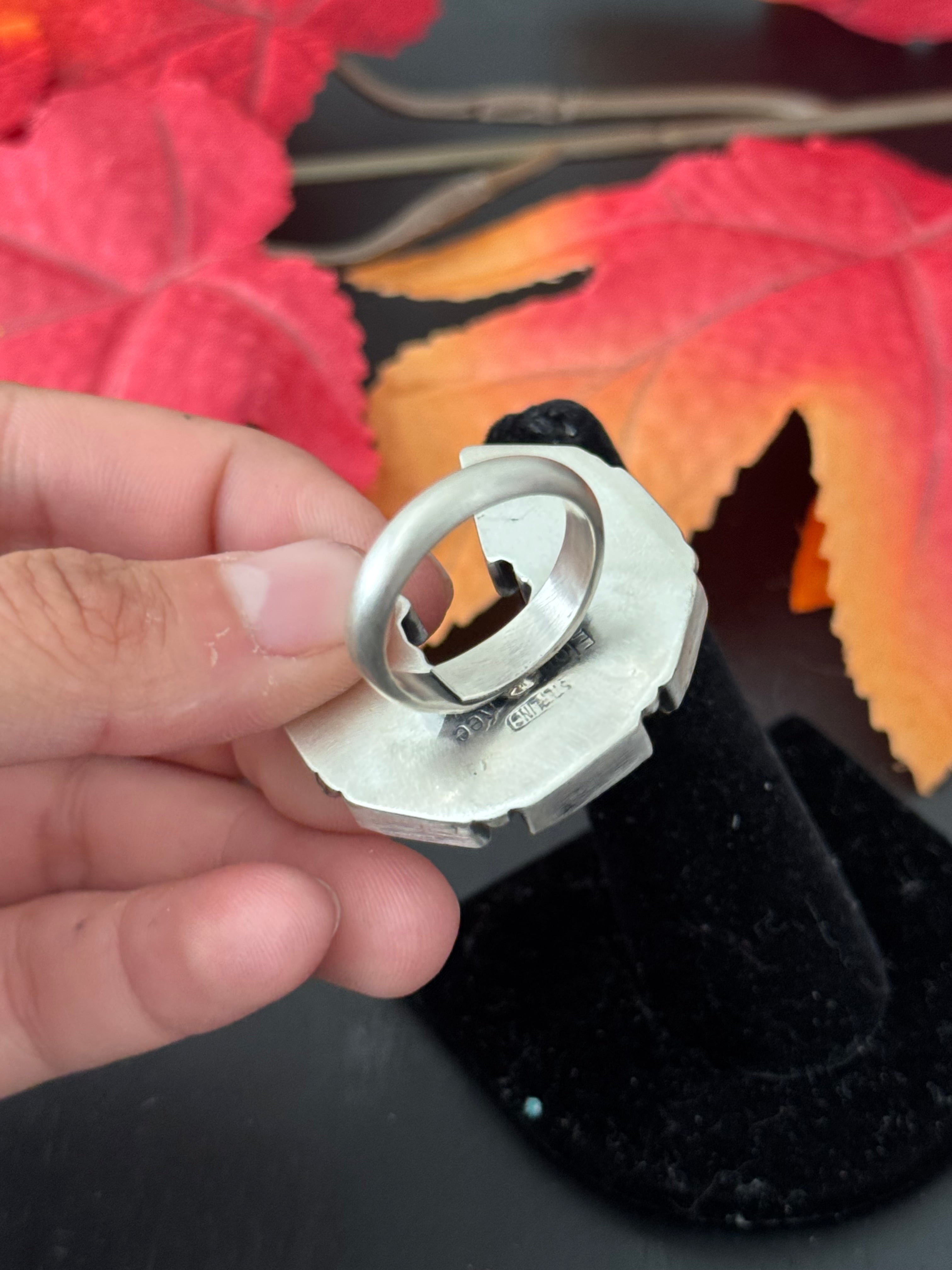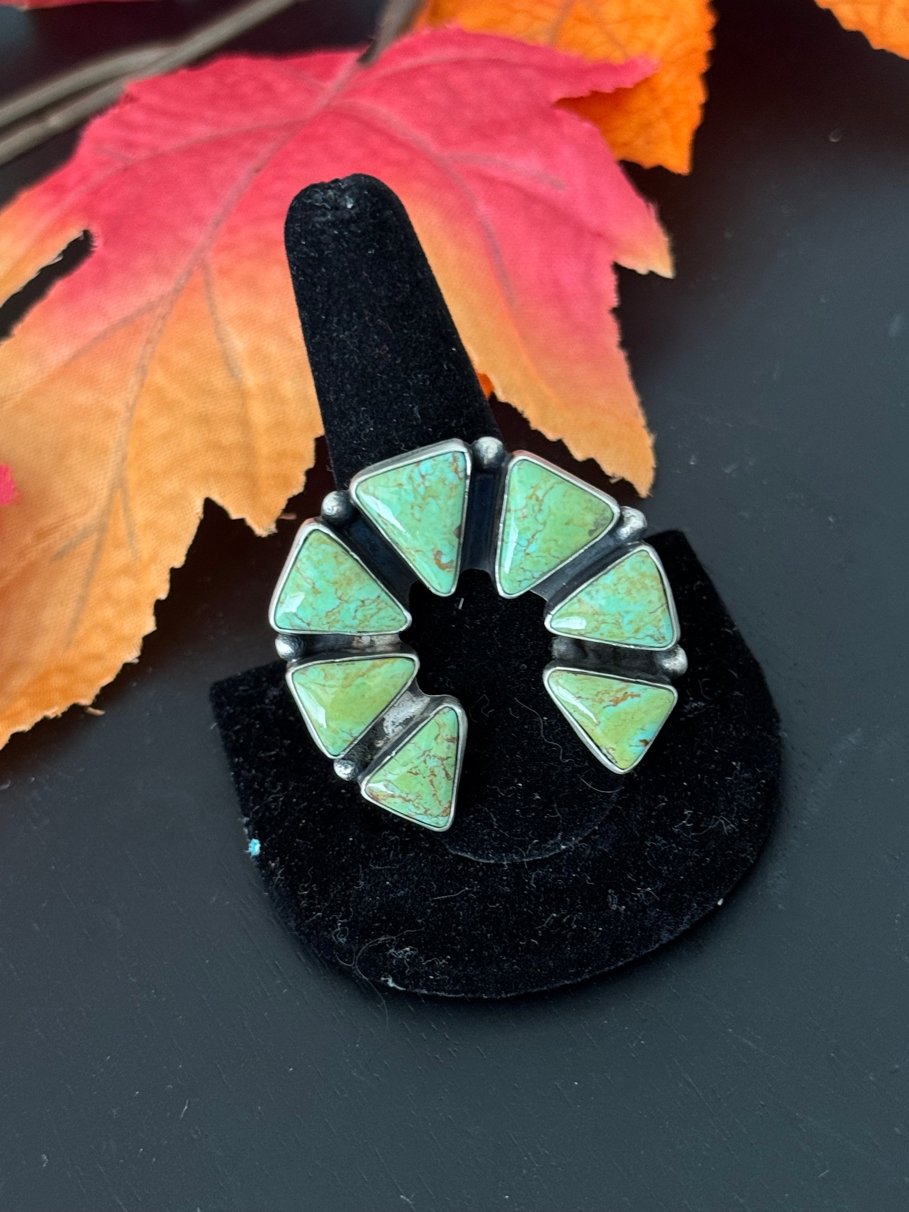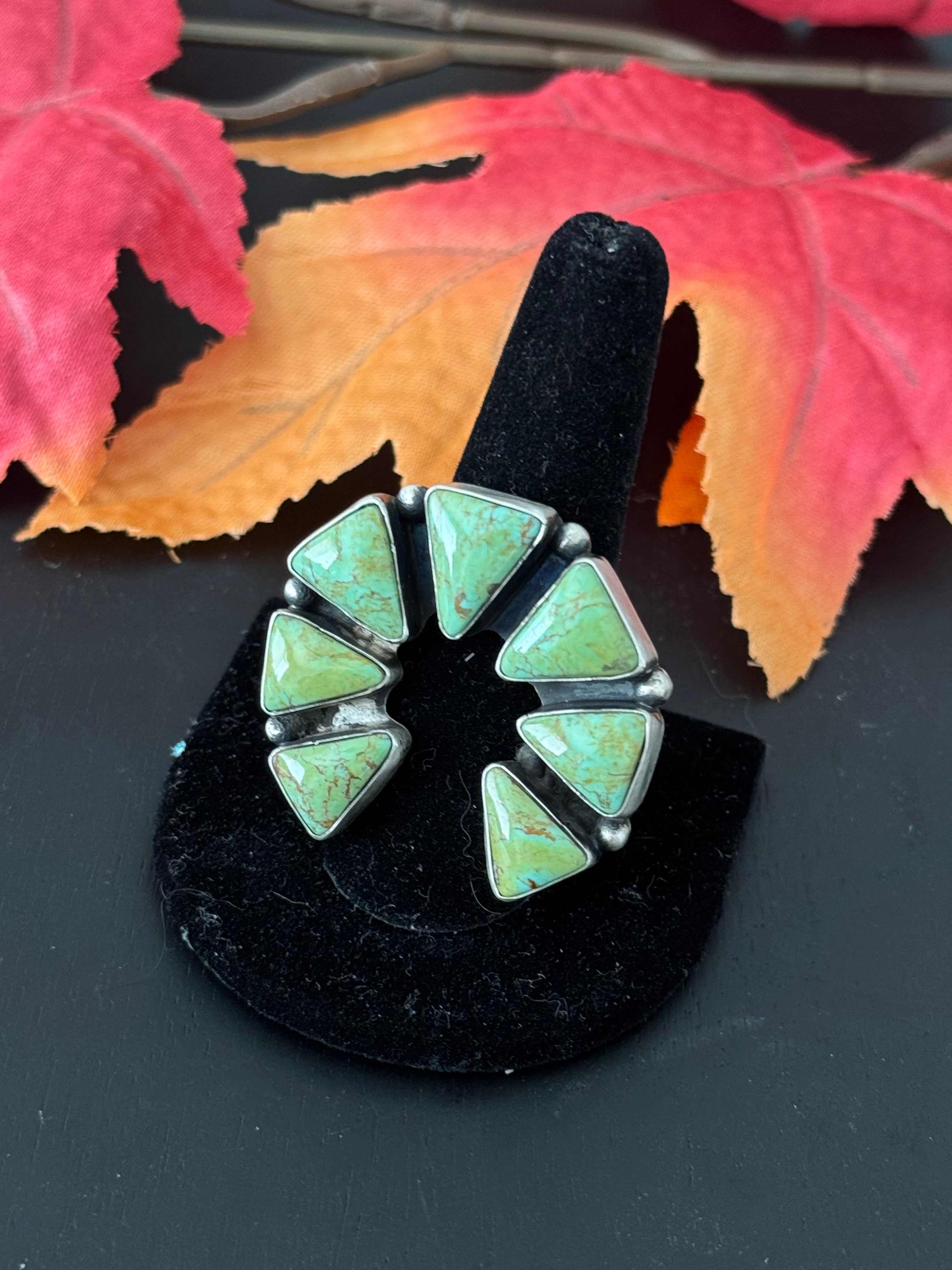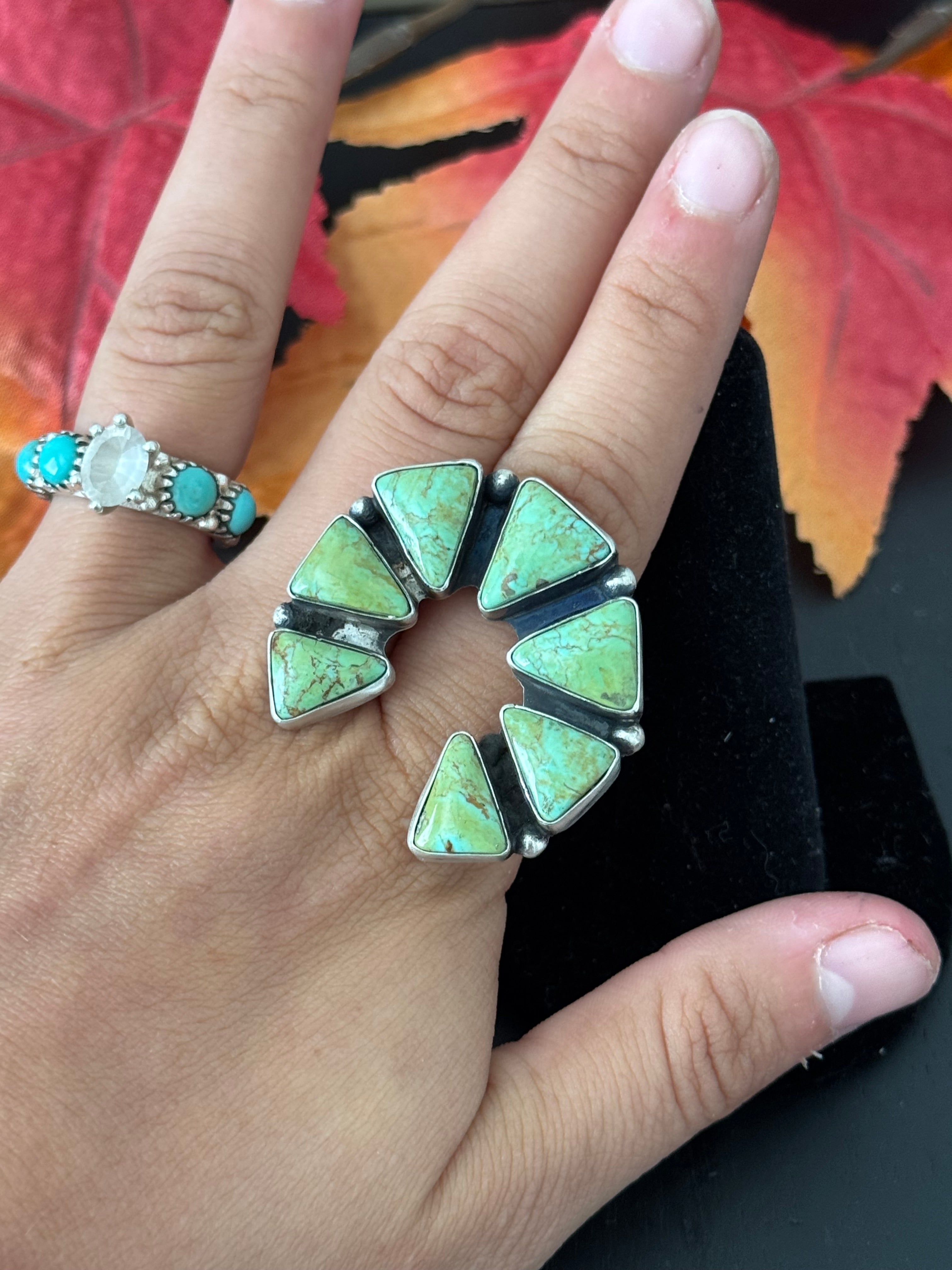 Beautiful naja ring. Elouise Kee Kingman Turquoise & Sterling Silver Adjustable Cluster Naja Ring. It measures 1 1/2 inches long and just over 1 3/8 inches wide. Signed by the artist and stamped sterling silver.