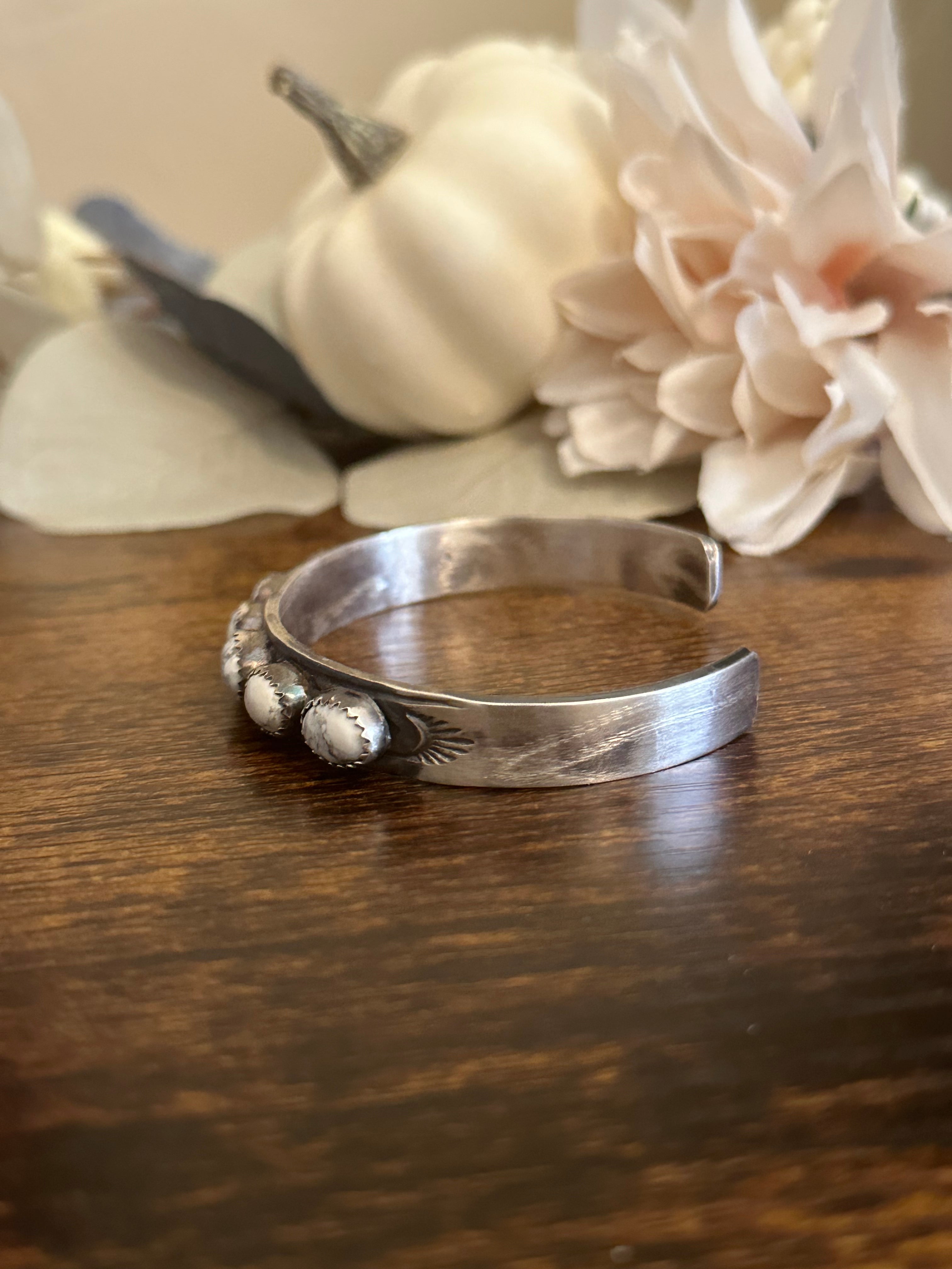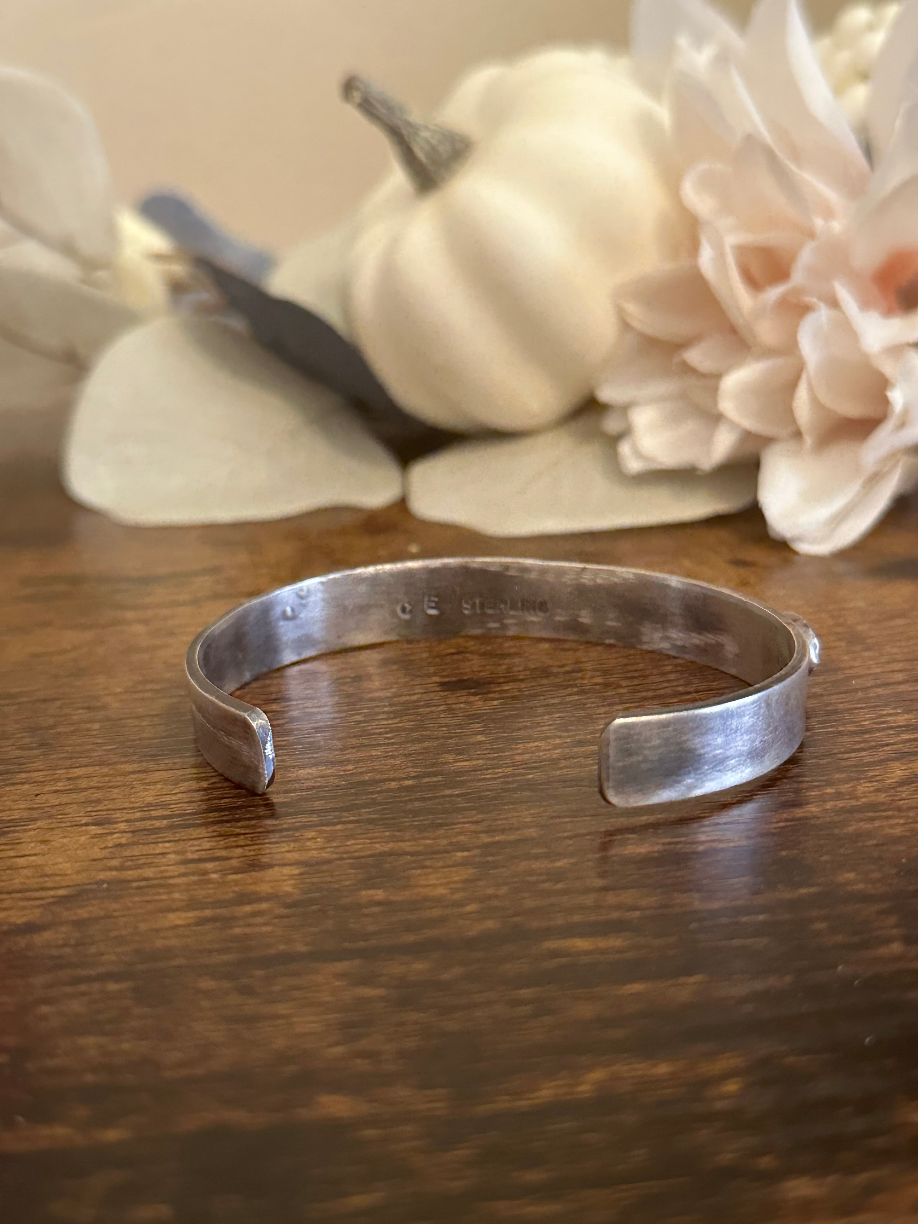 Rick Enriquez Howlite & Sterling Silver Cuff Bracelet. It measures 3/8 of an inch wide with an inside circumference of 5 5/8 inches and a gap of 1 1/4 inches. Signed by artist and stamped sterling silver.