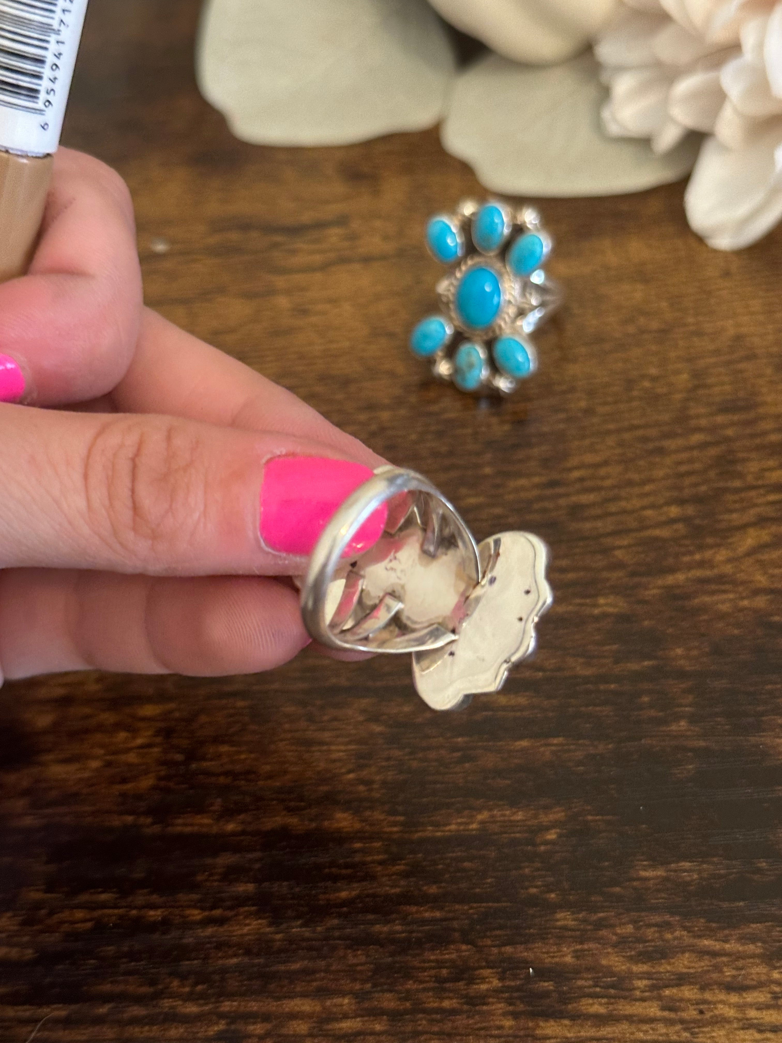 Beautiful ring. Navajo Made Kingman Turquoise & Sterling Silver Ring. It measures 1 1/8 inches long and 7/8 of an inch wide. Signed by the artist and stamped sterling silver.