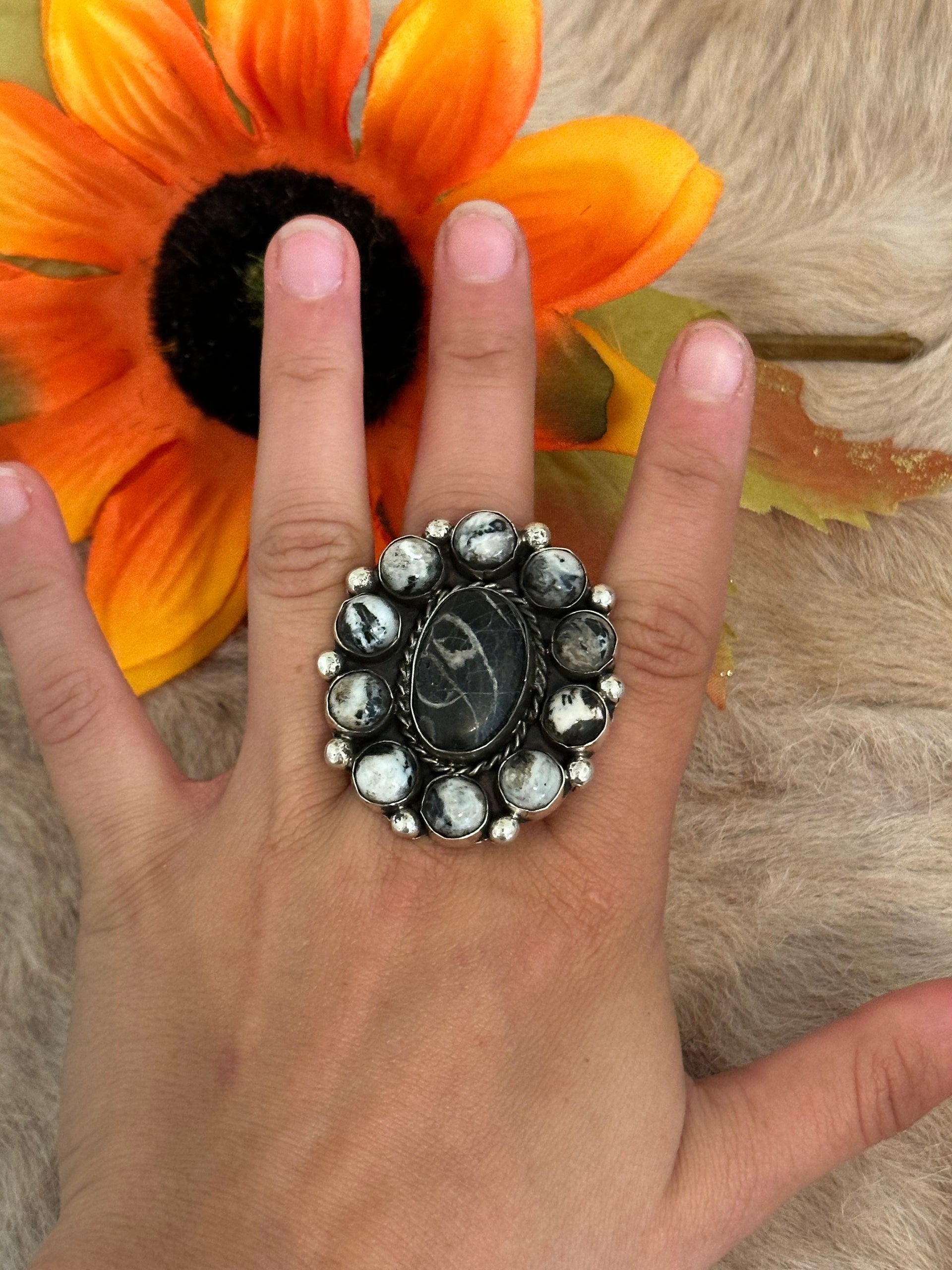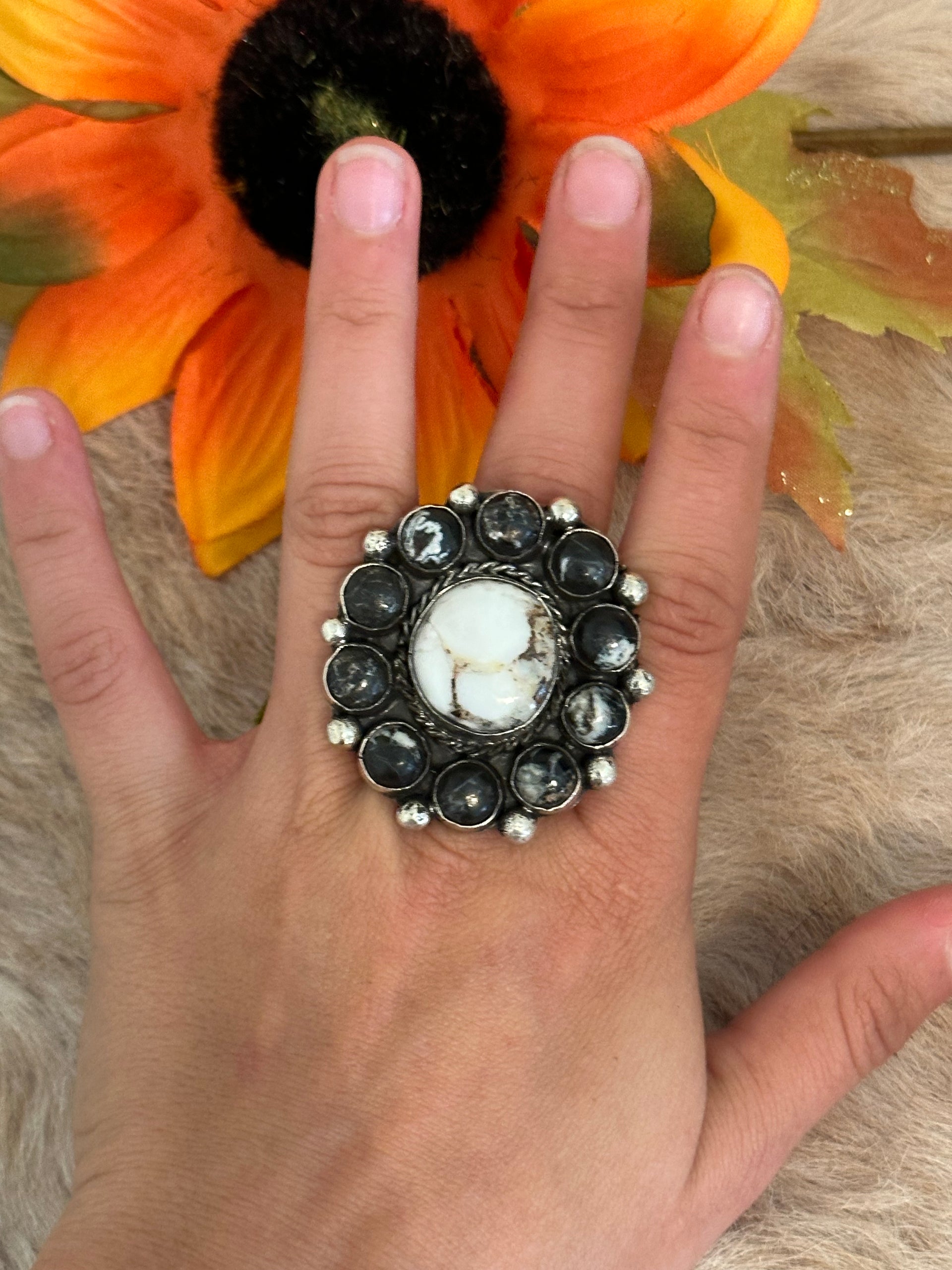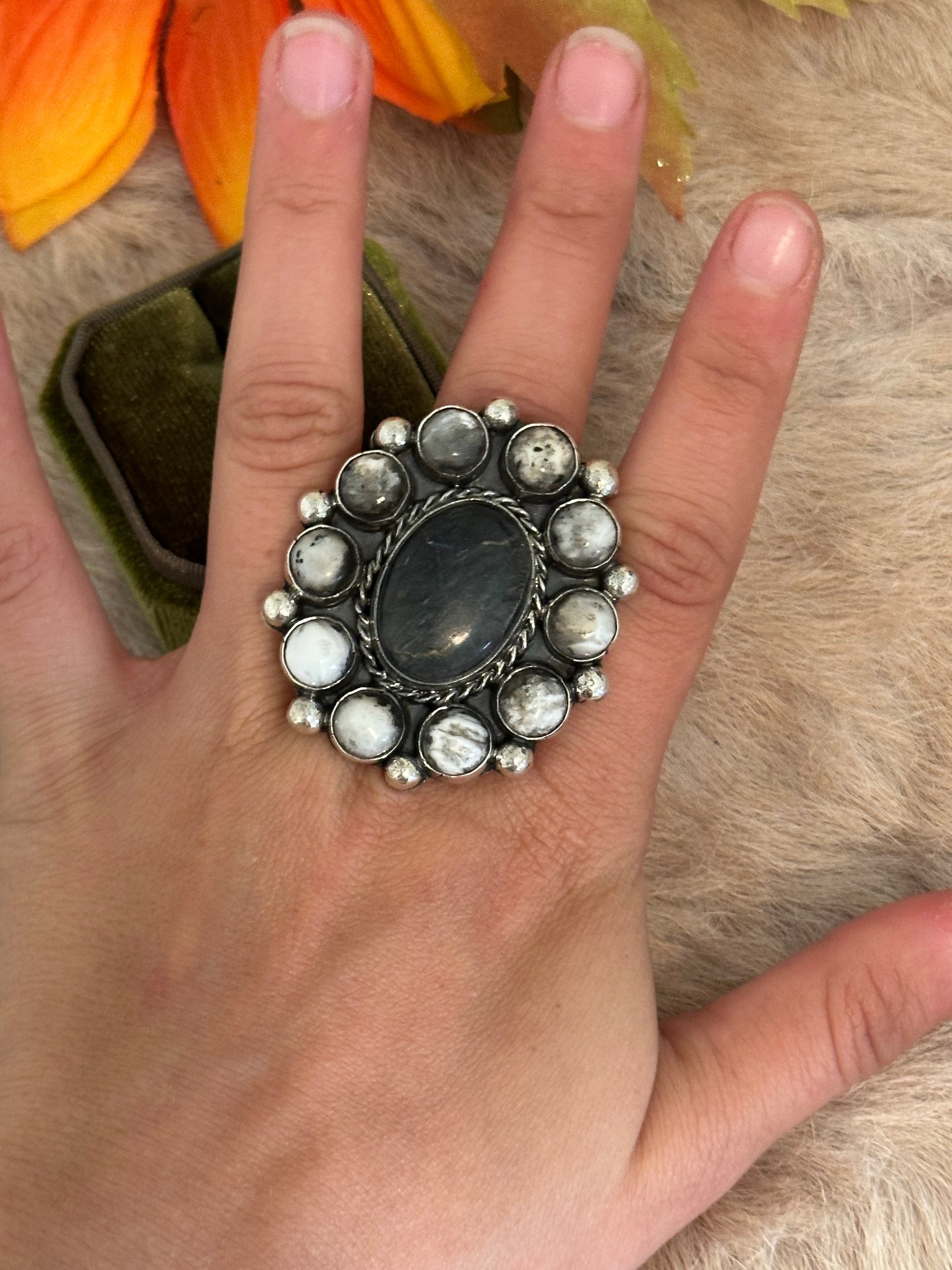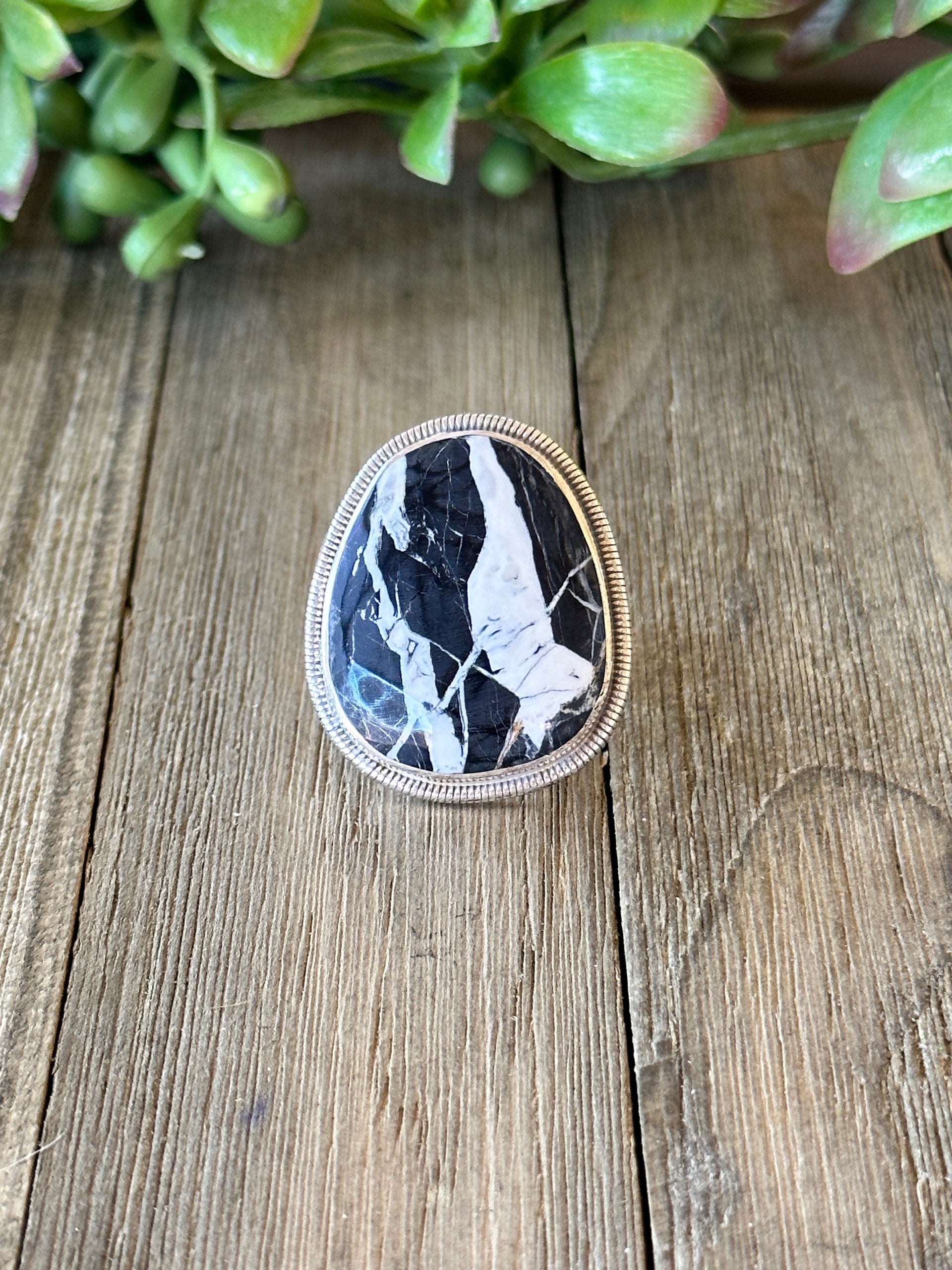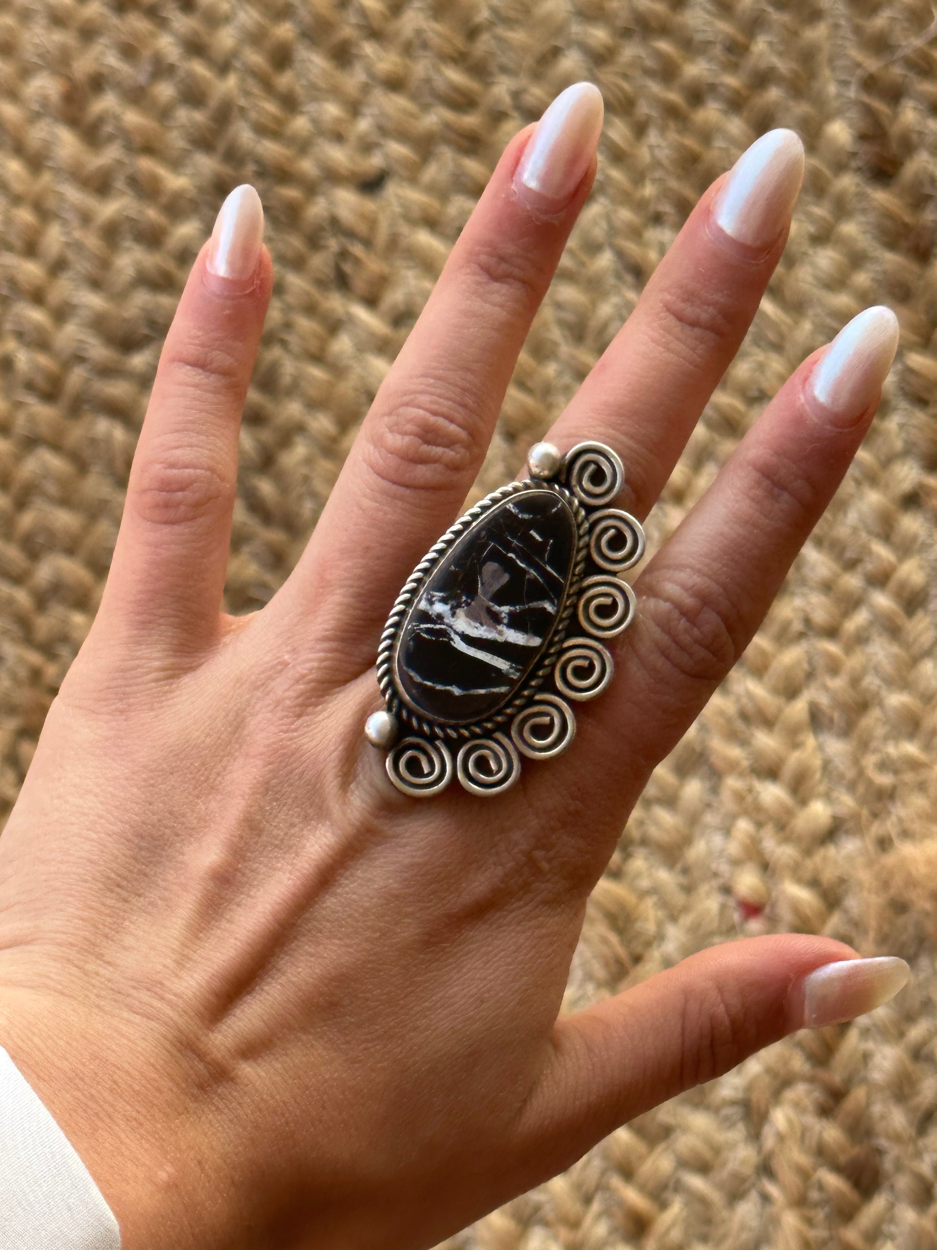 Navajo White Buffalo & Onyx Sterling Silver Inlay Ring Size 6.5