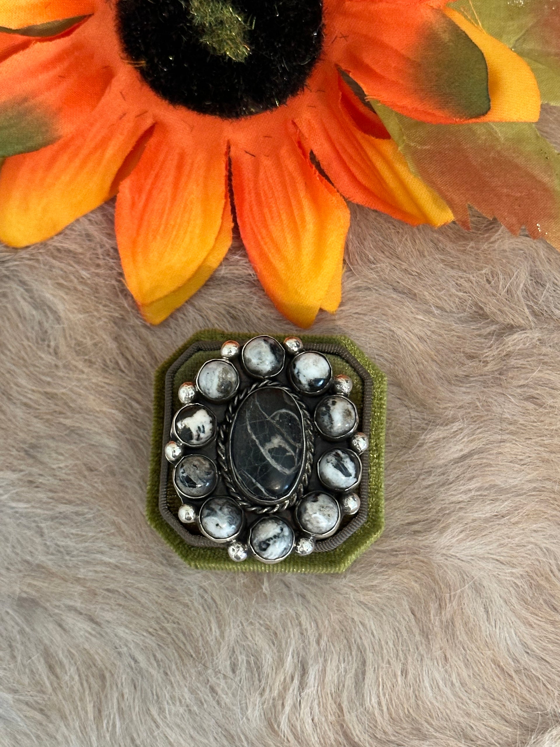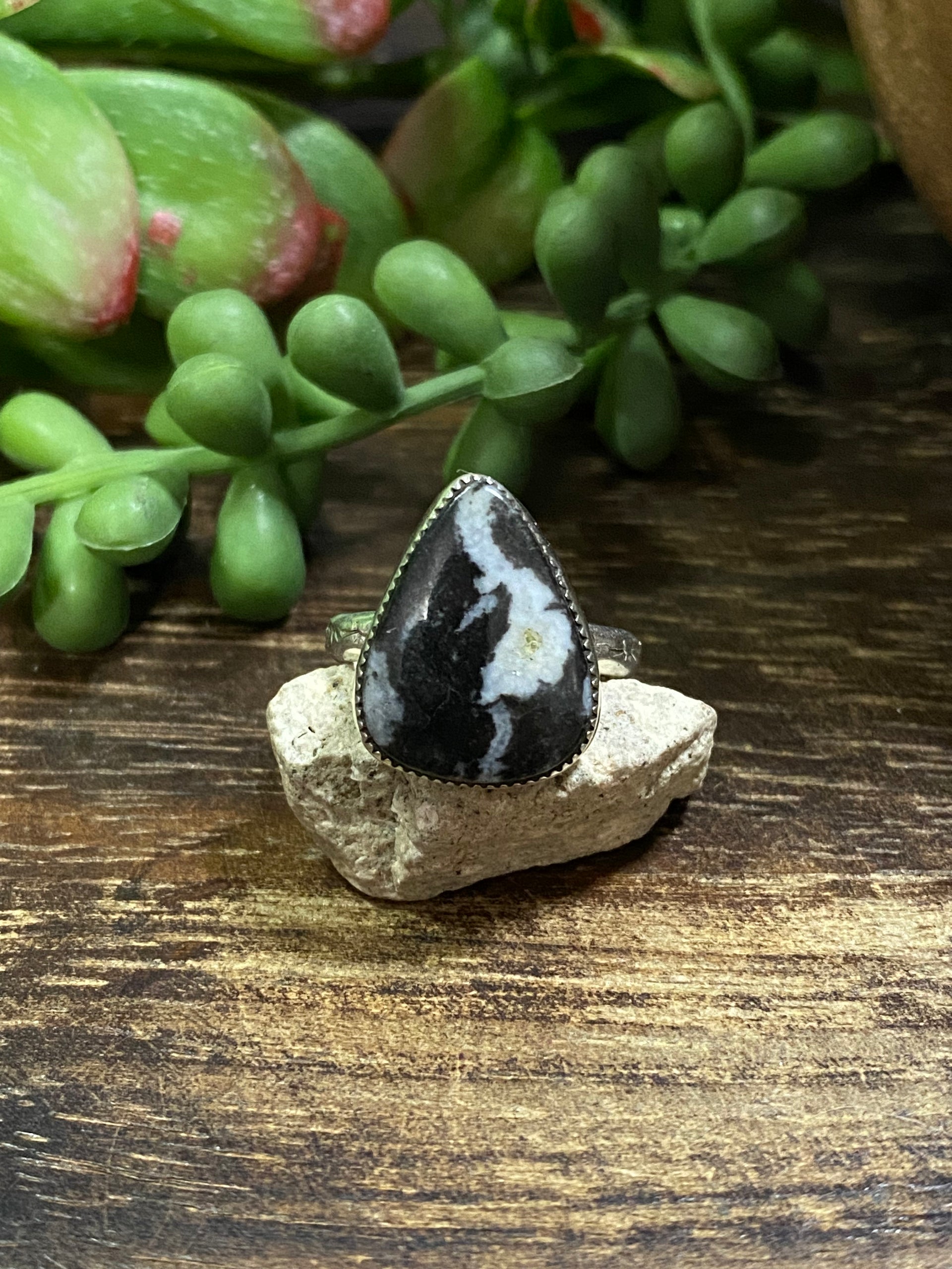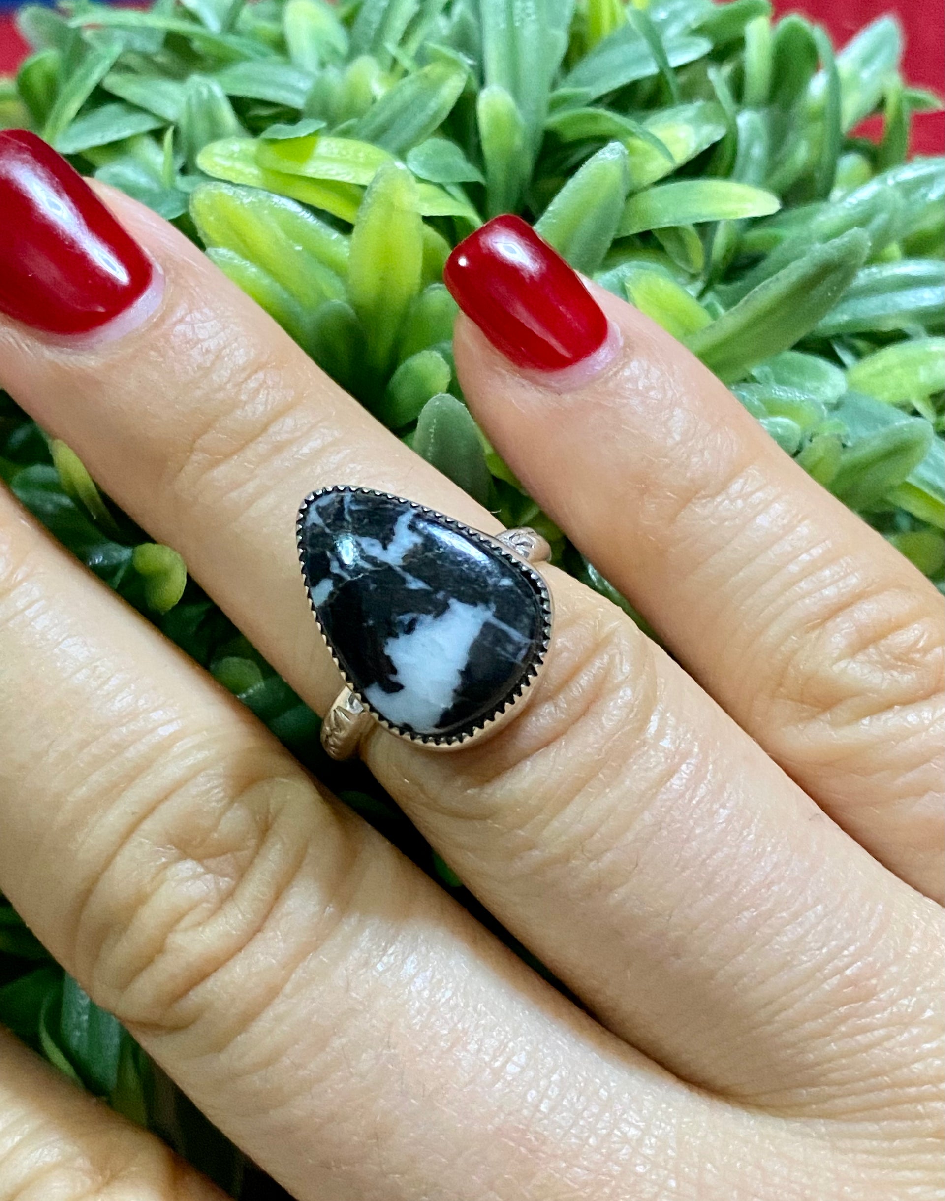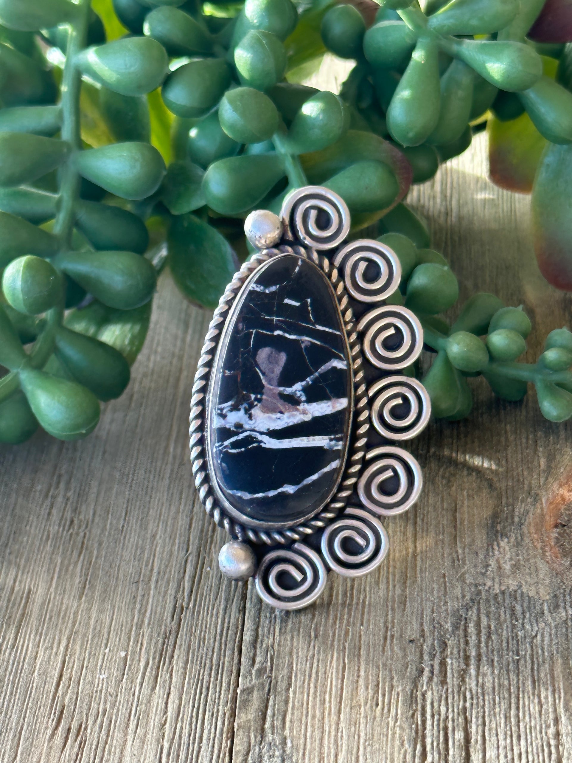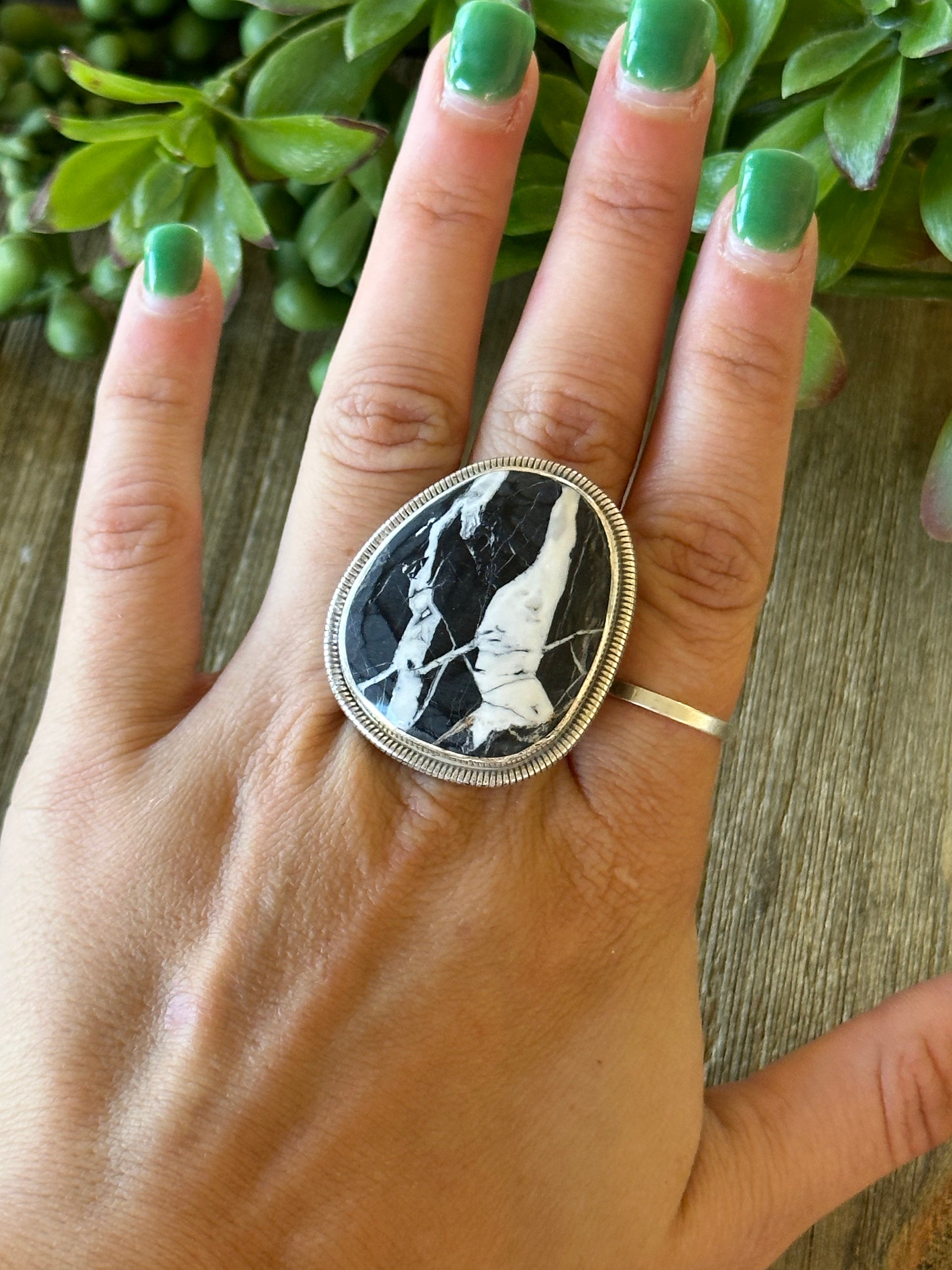 Navajo White Buffalo & Onyx Sterling Silver Inlay Ring Size 6.5
