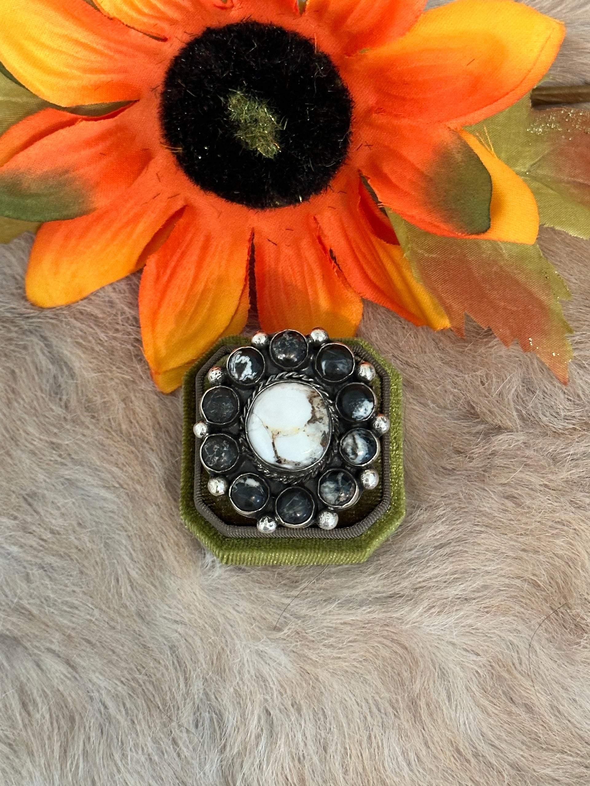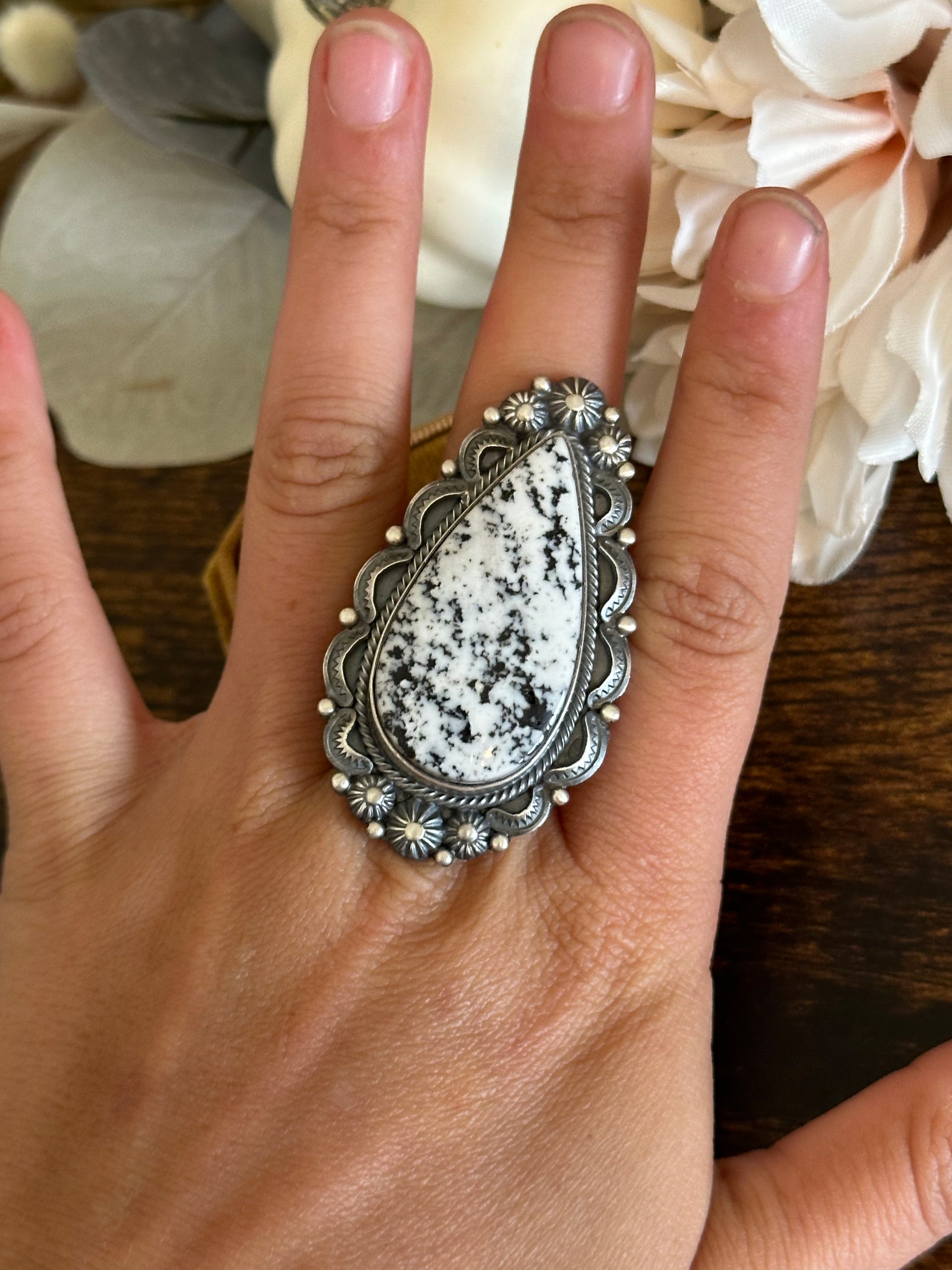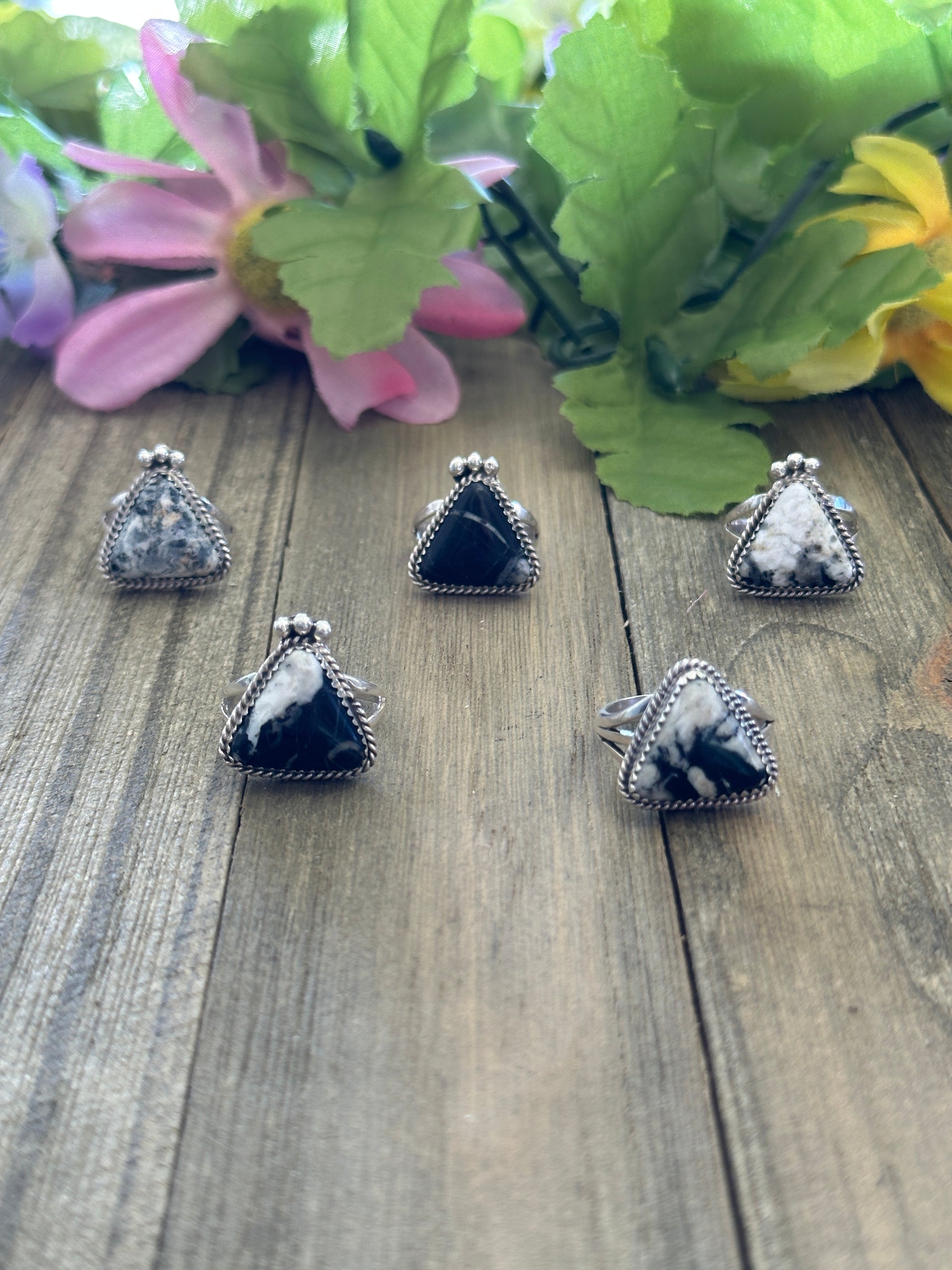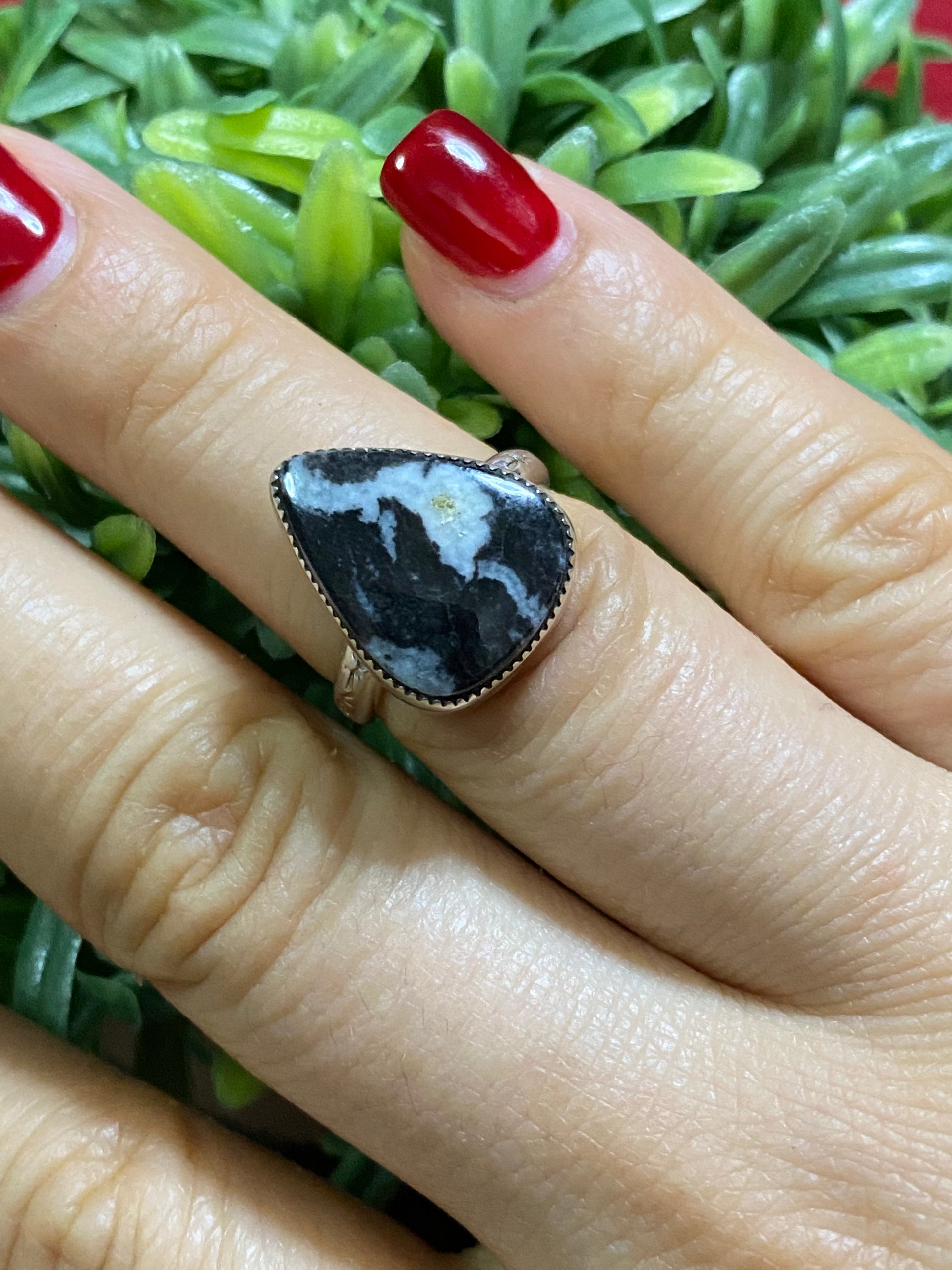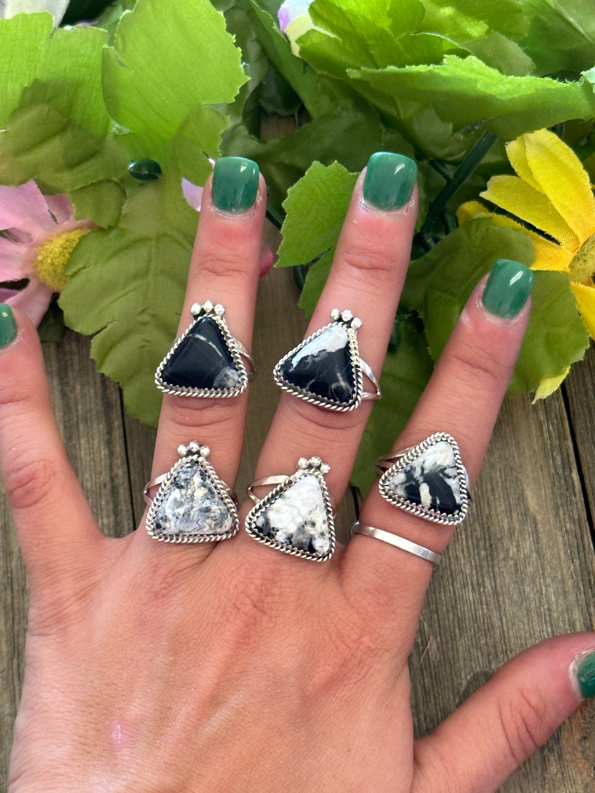 Navajo White Buffalo & Onyx Sterling Silver Inlay Ring Size 6.5