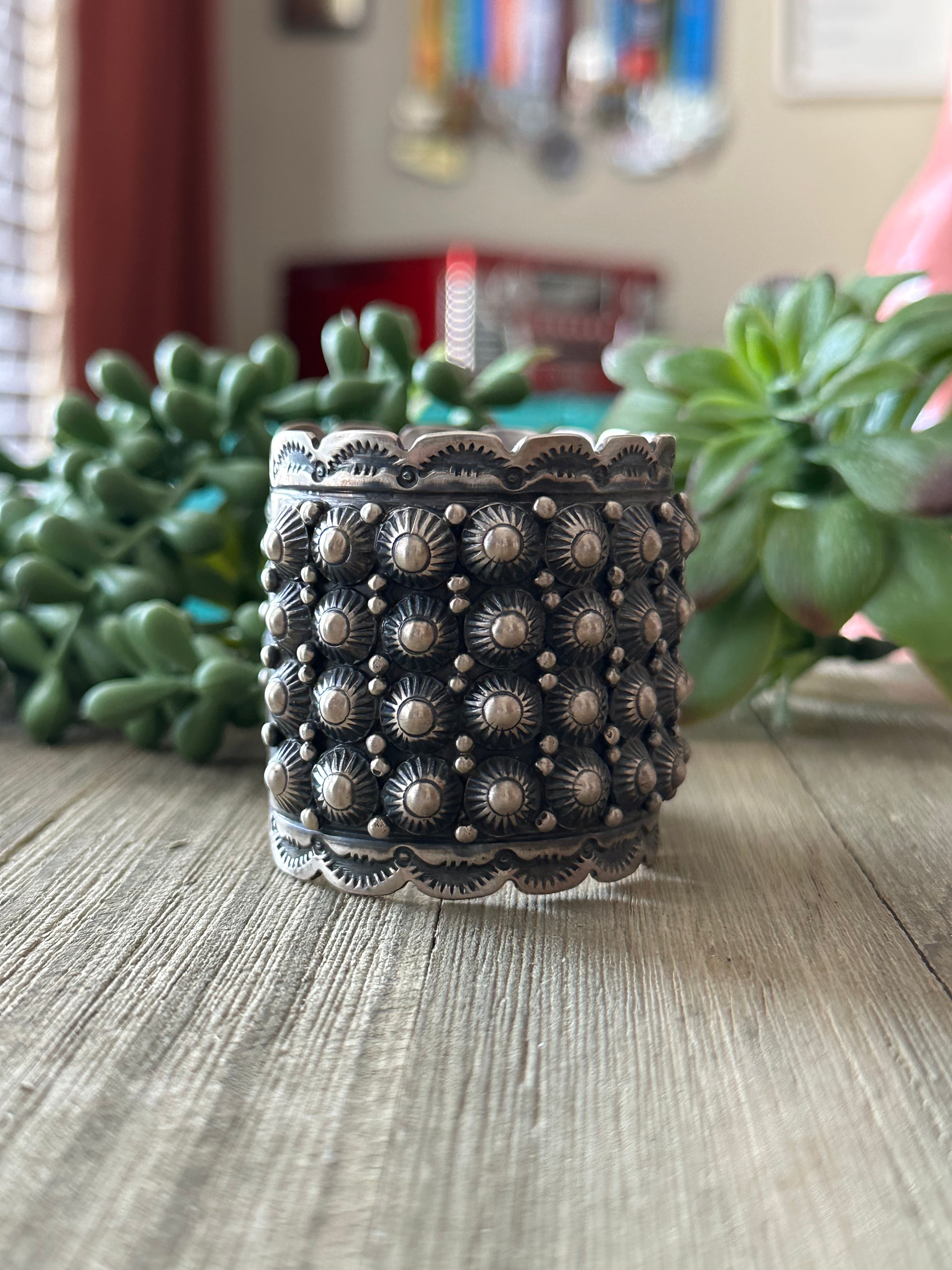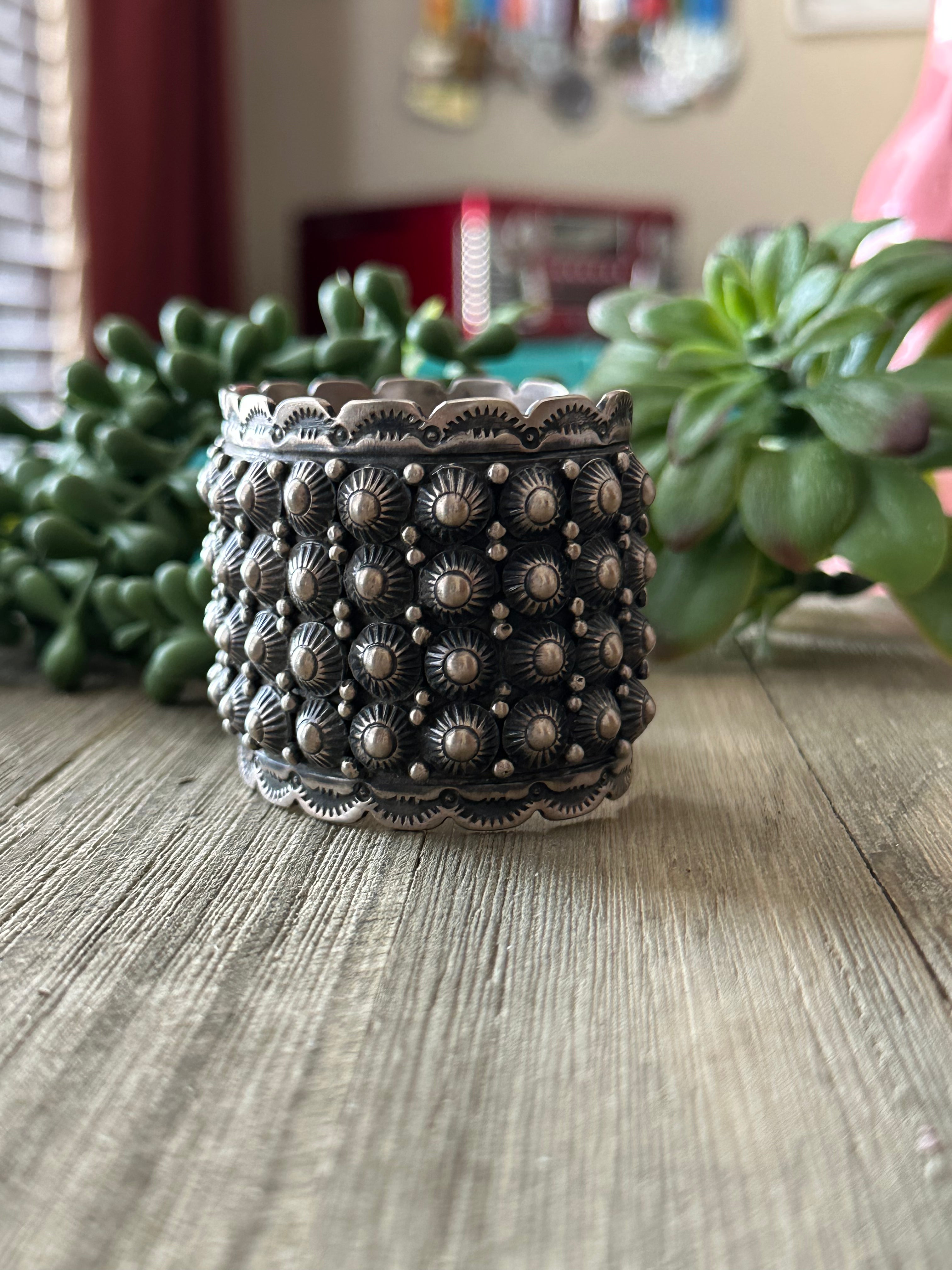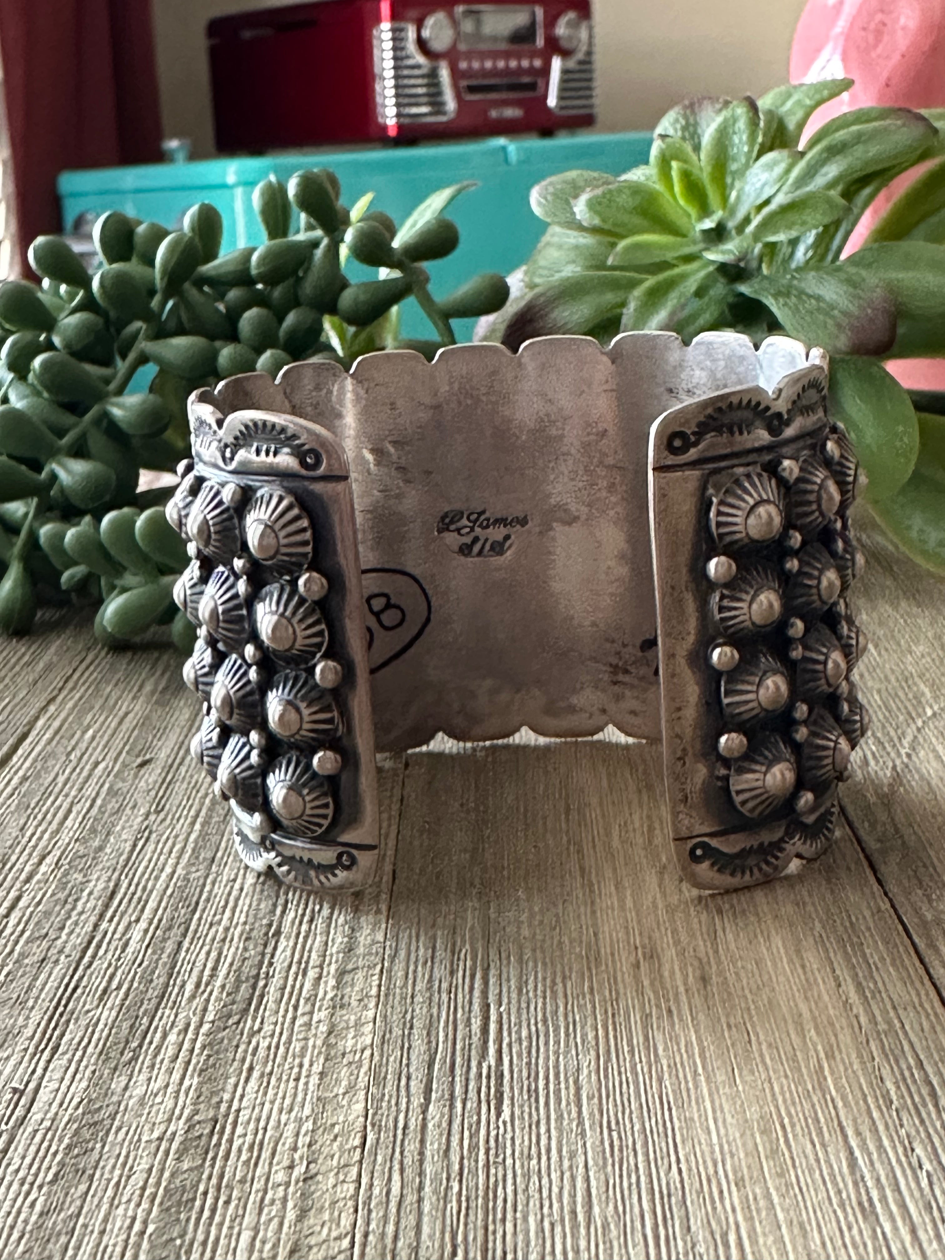 Lorenzo James Sterling Silver Cuff Bracelet. It measures 2 inches wide with an inside circumference of 5 5/8 loop inches and a gap of 1 1/8 inches. Signed by the artist and stamped sterling silver.