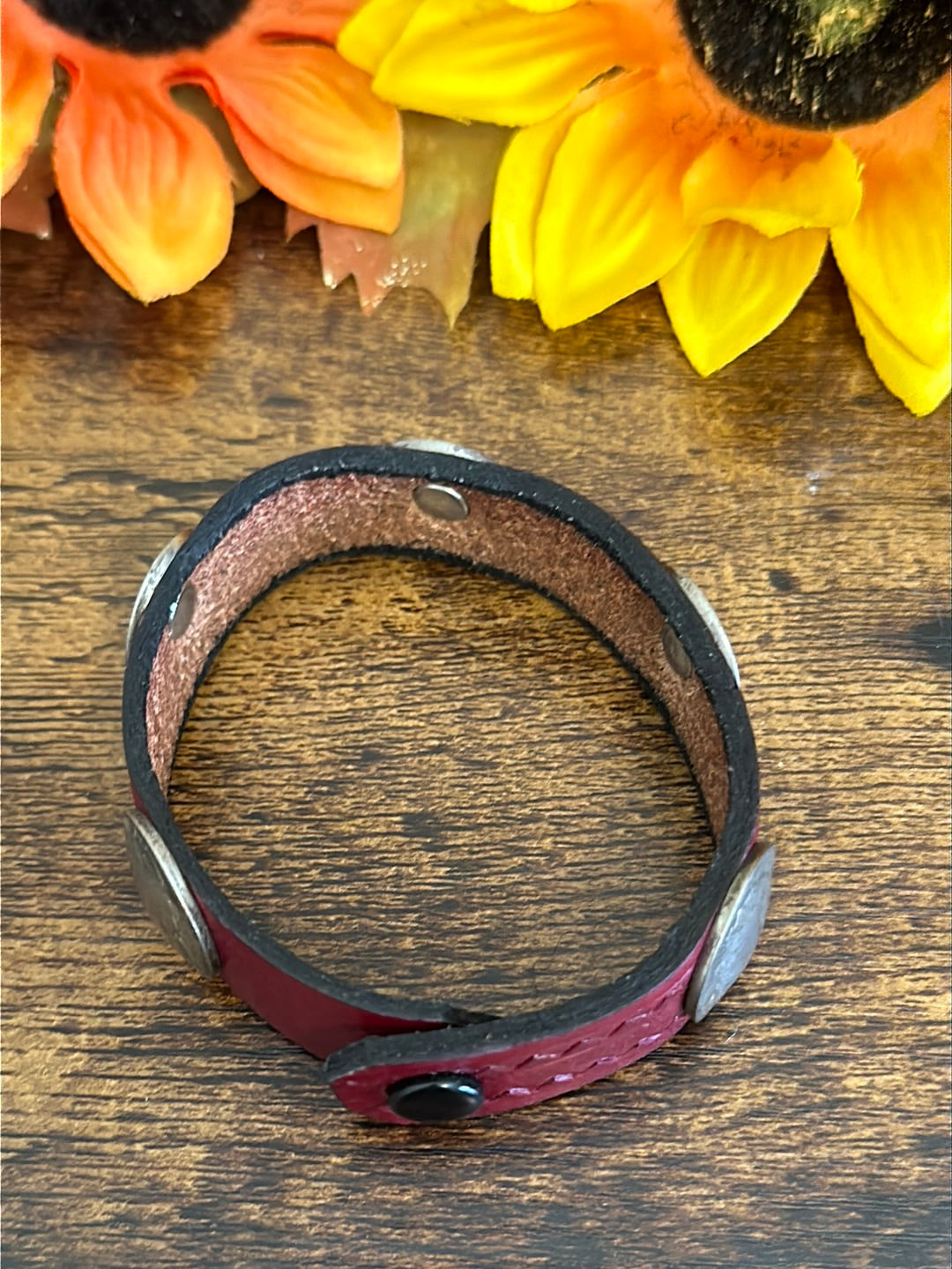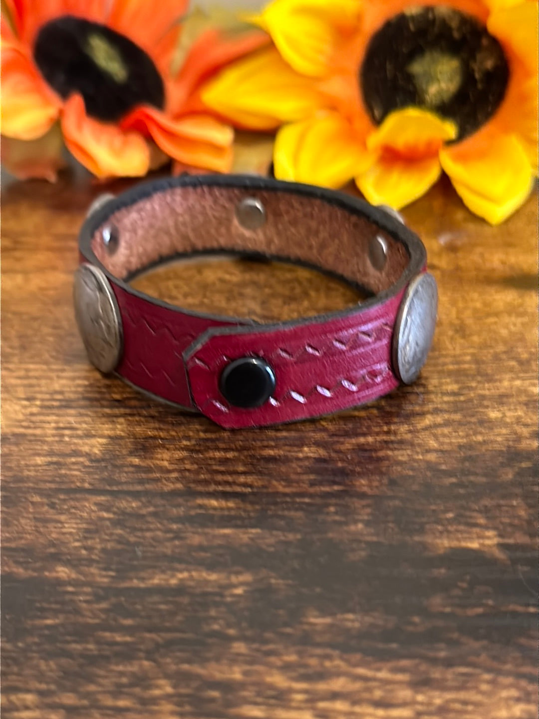Navajo Made Leather & Sterling Silver Coin Bracelet. It measures 3/4 of an inch wide and 9 3/8 inches long.