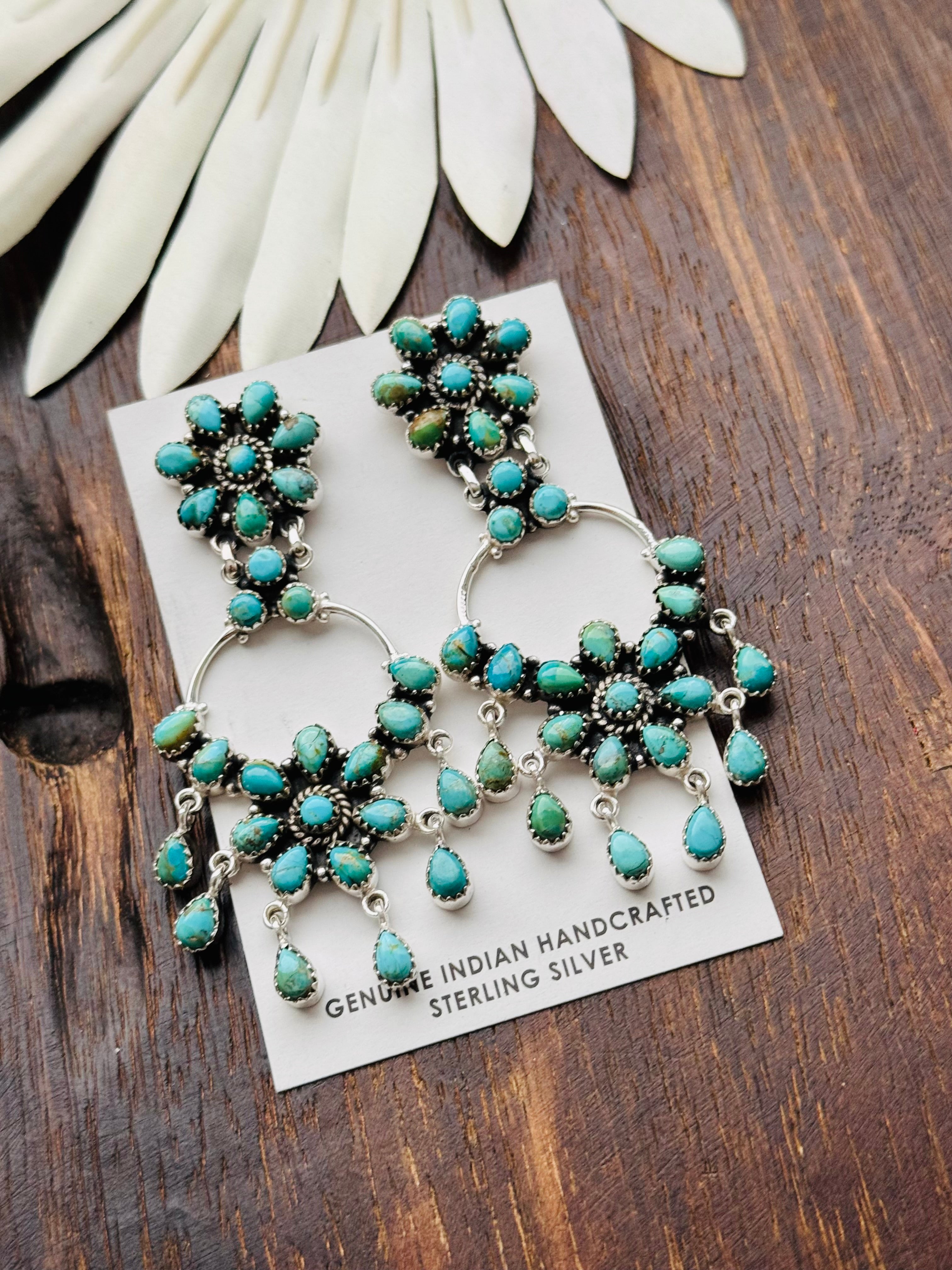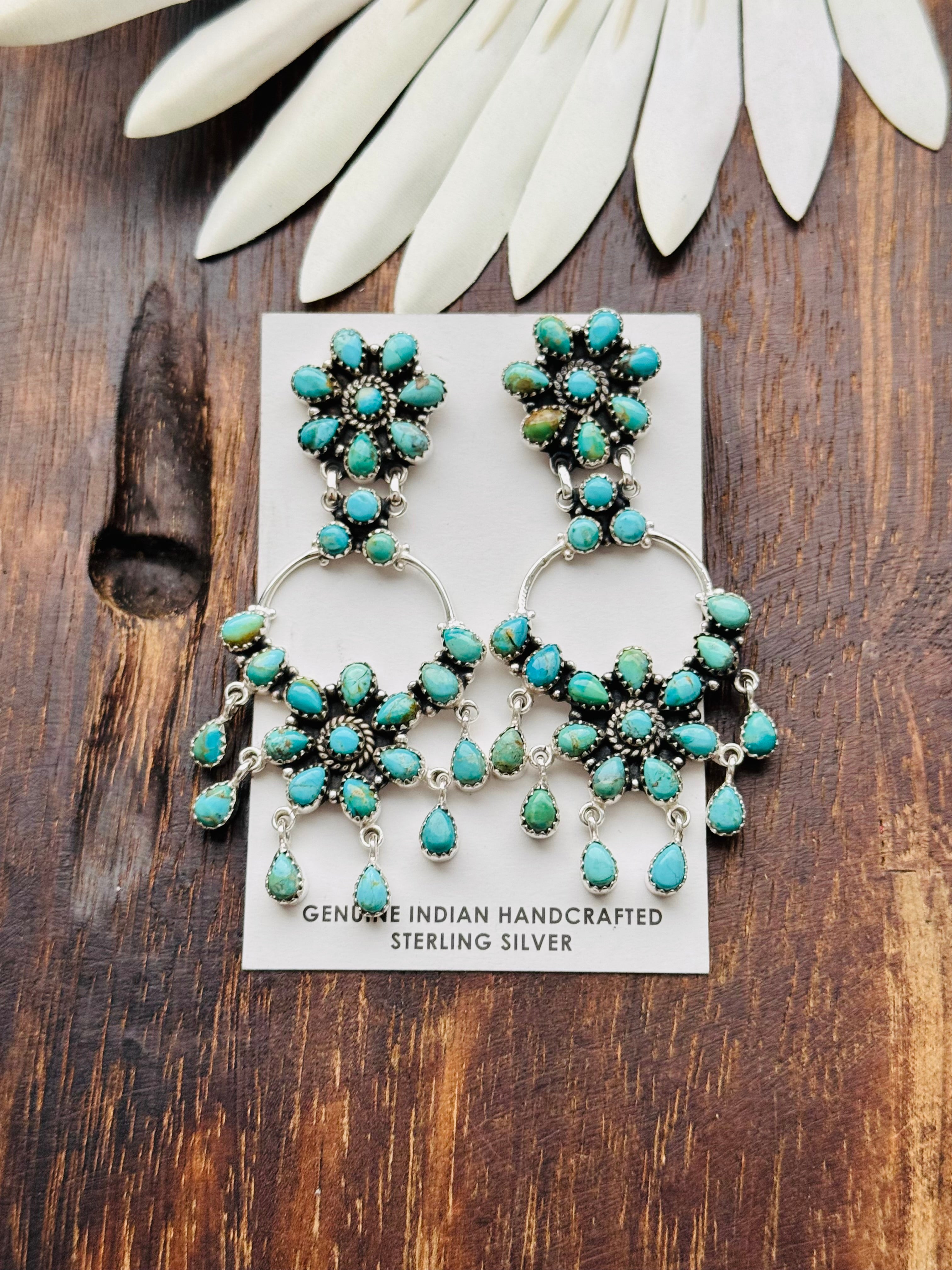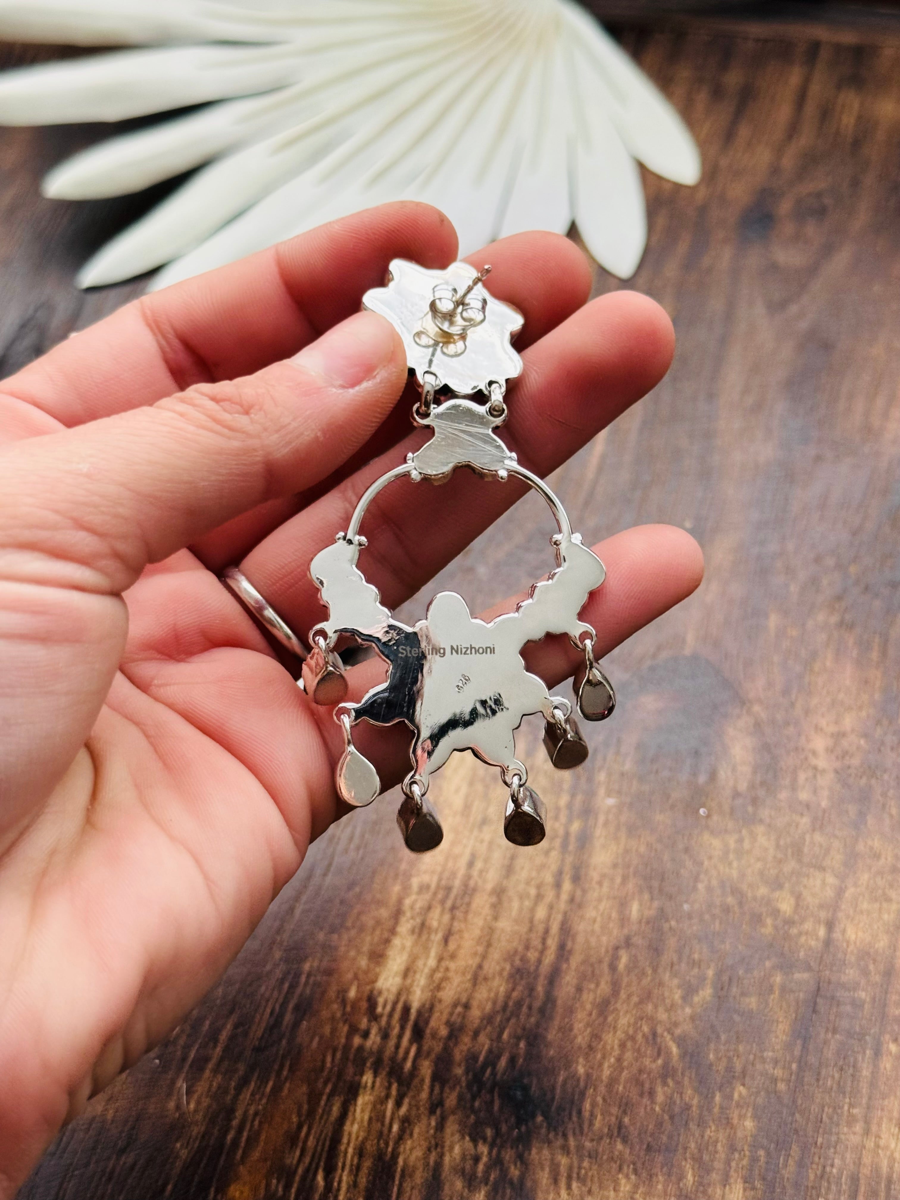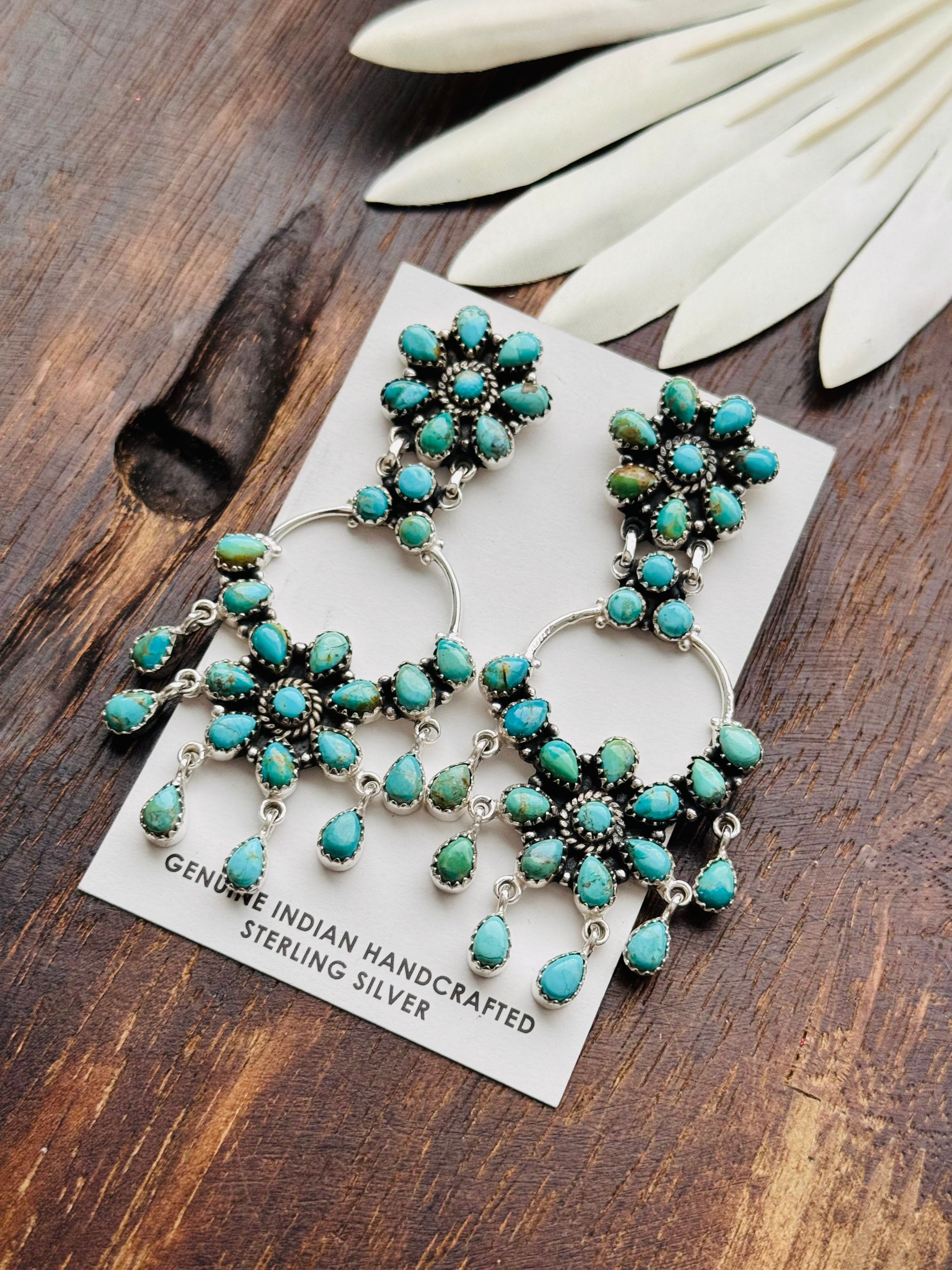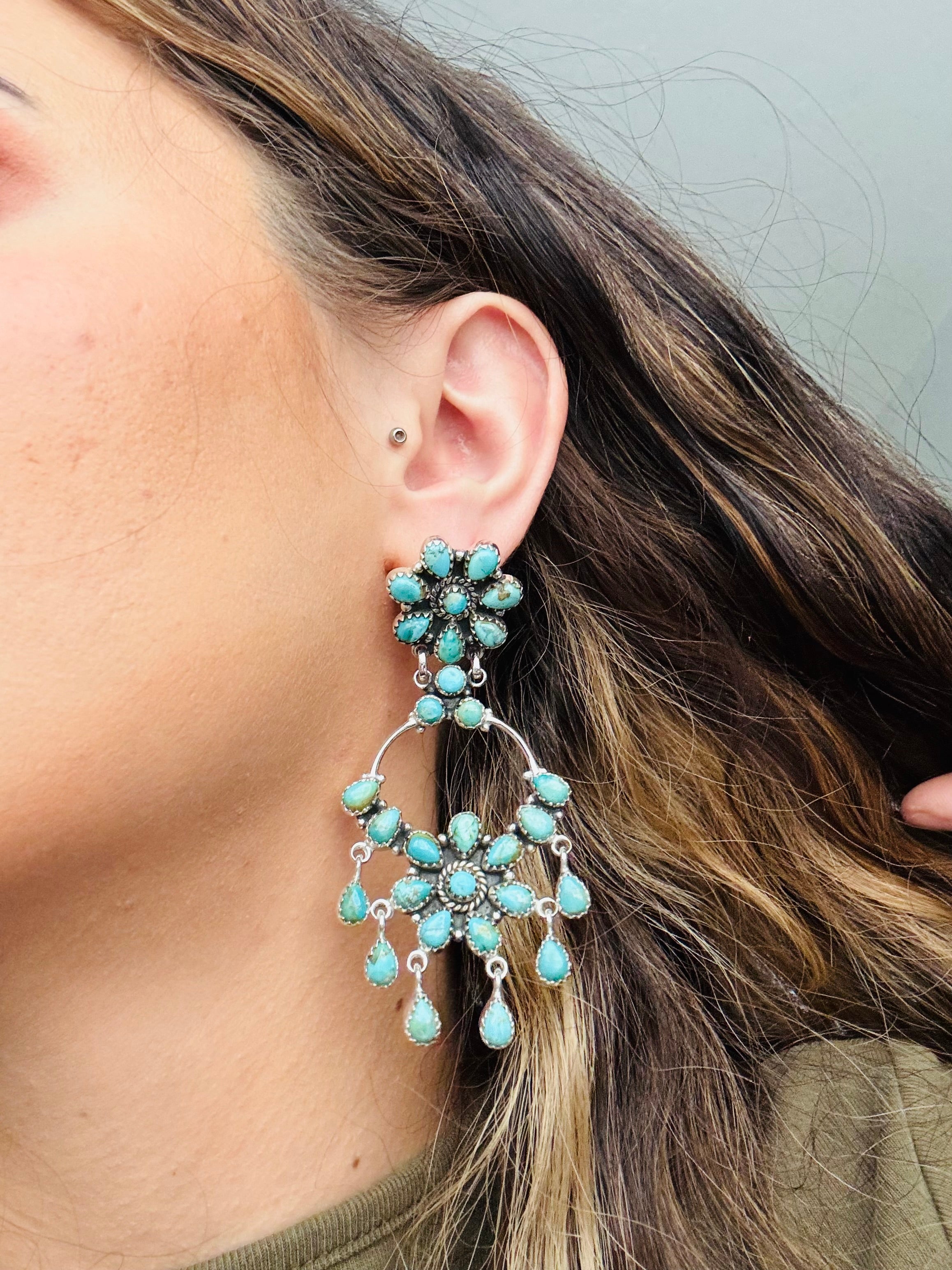 Southwest Handmade Kingman Turquoise & Sterling Silver Post Dangle Earrings. It measures 3 1/8 inches long and 1 3/8 inches wide. Signed by the artist and stamped sterling silver.
