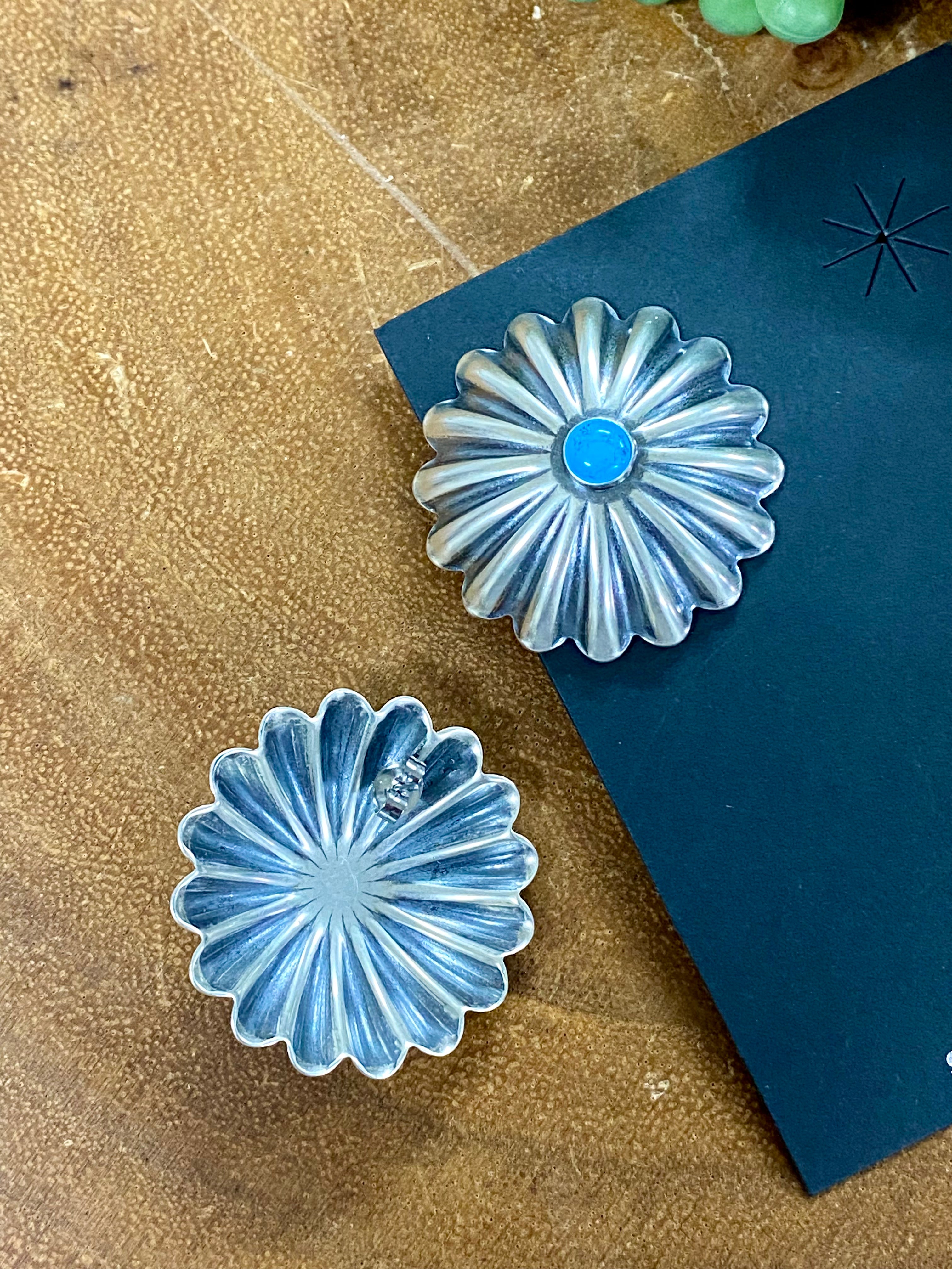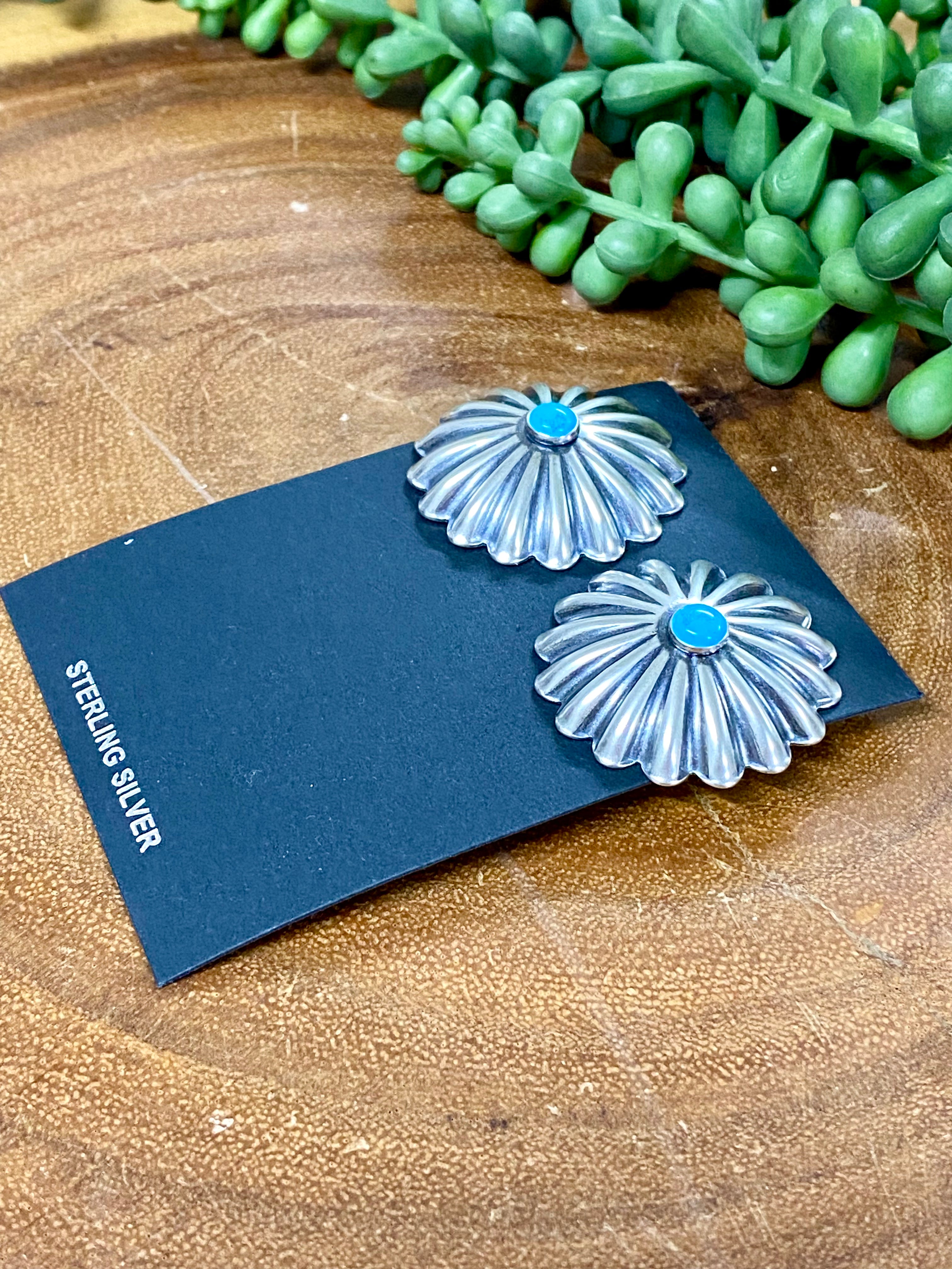 Navajo made kingman turquoise & sterling silver post earrings. They measure 1 1/4 inches round. Stamped sterling silver.