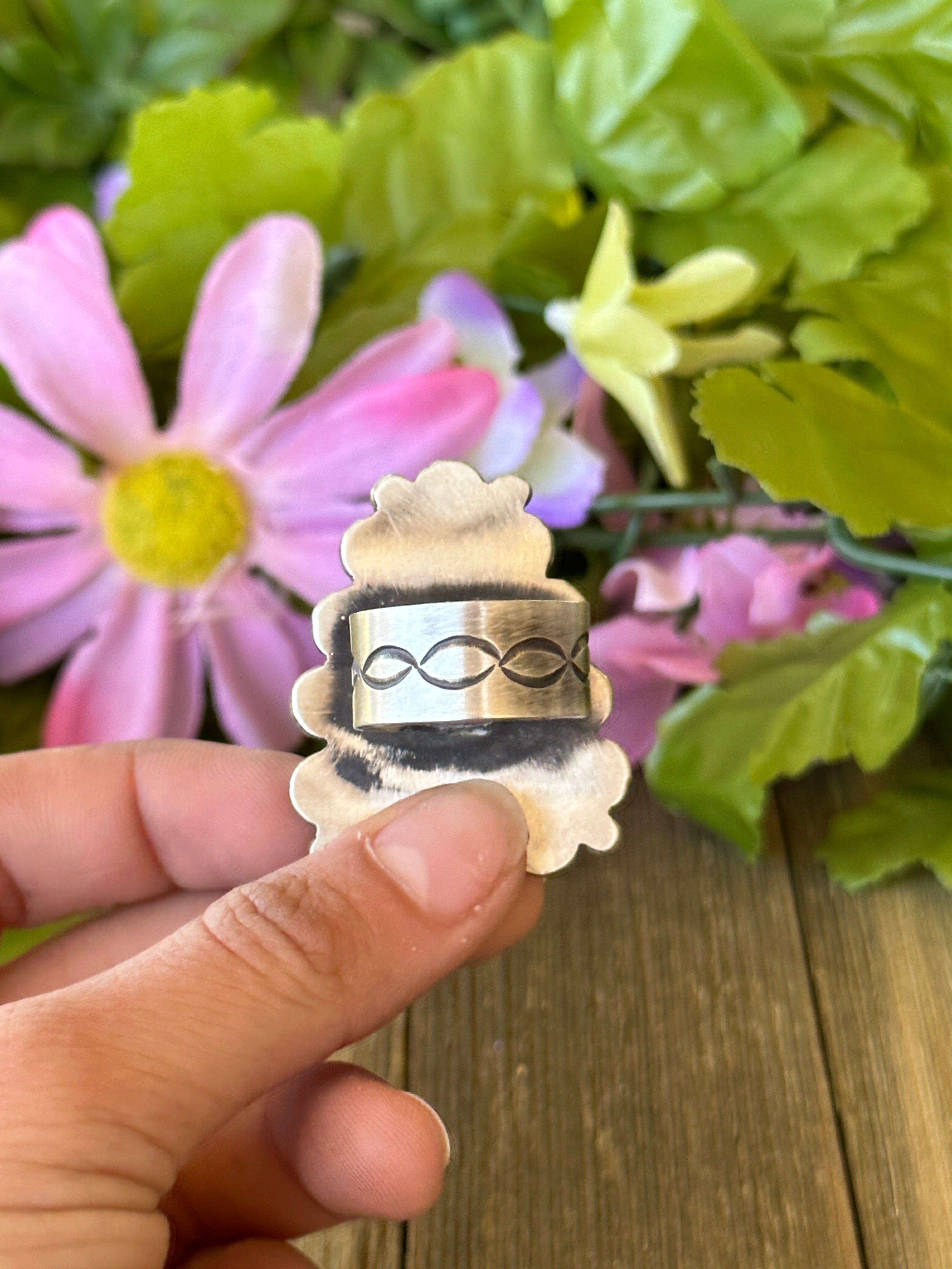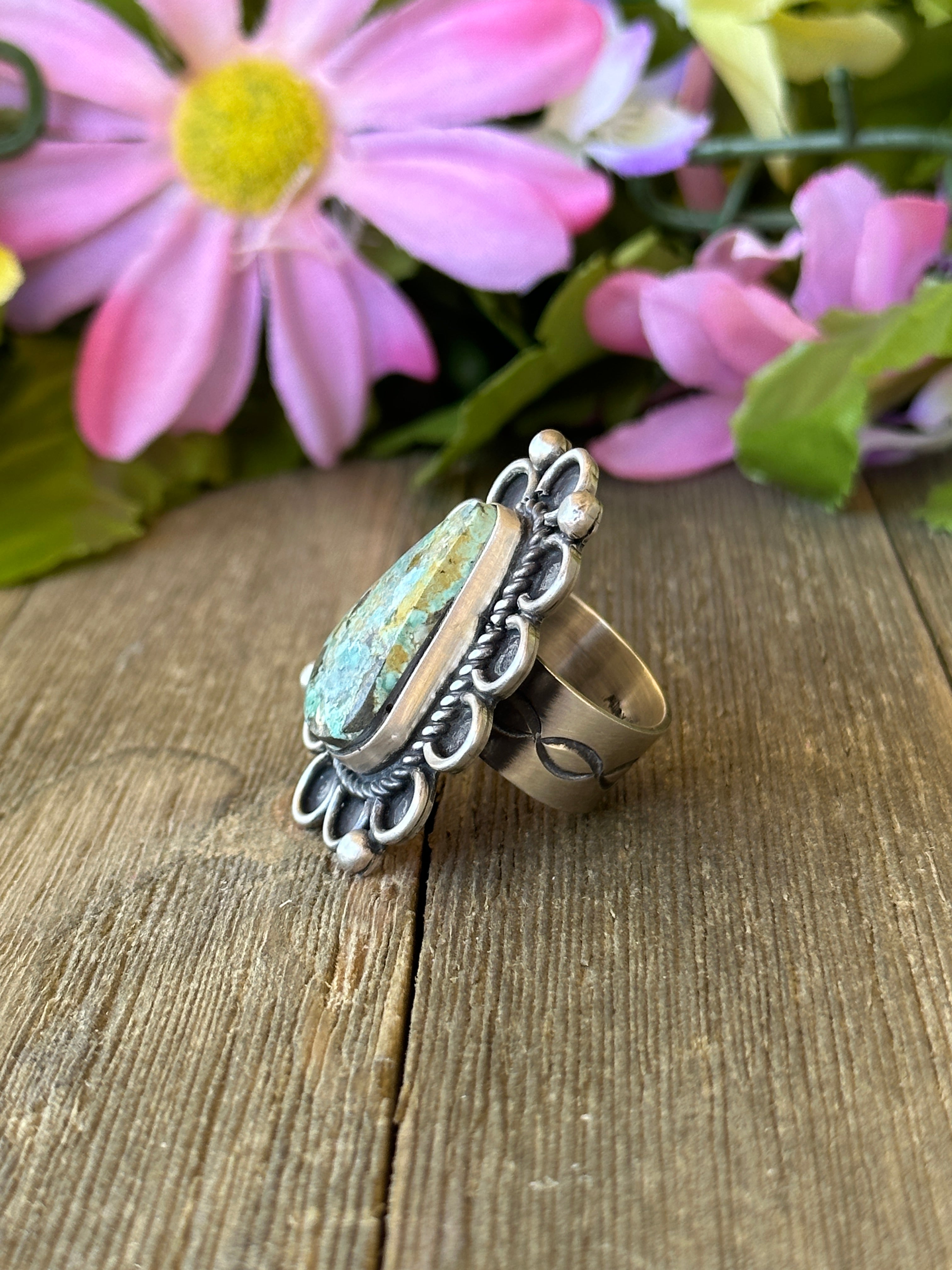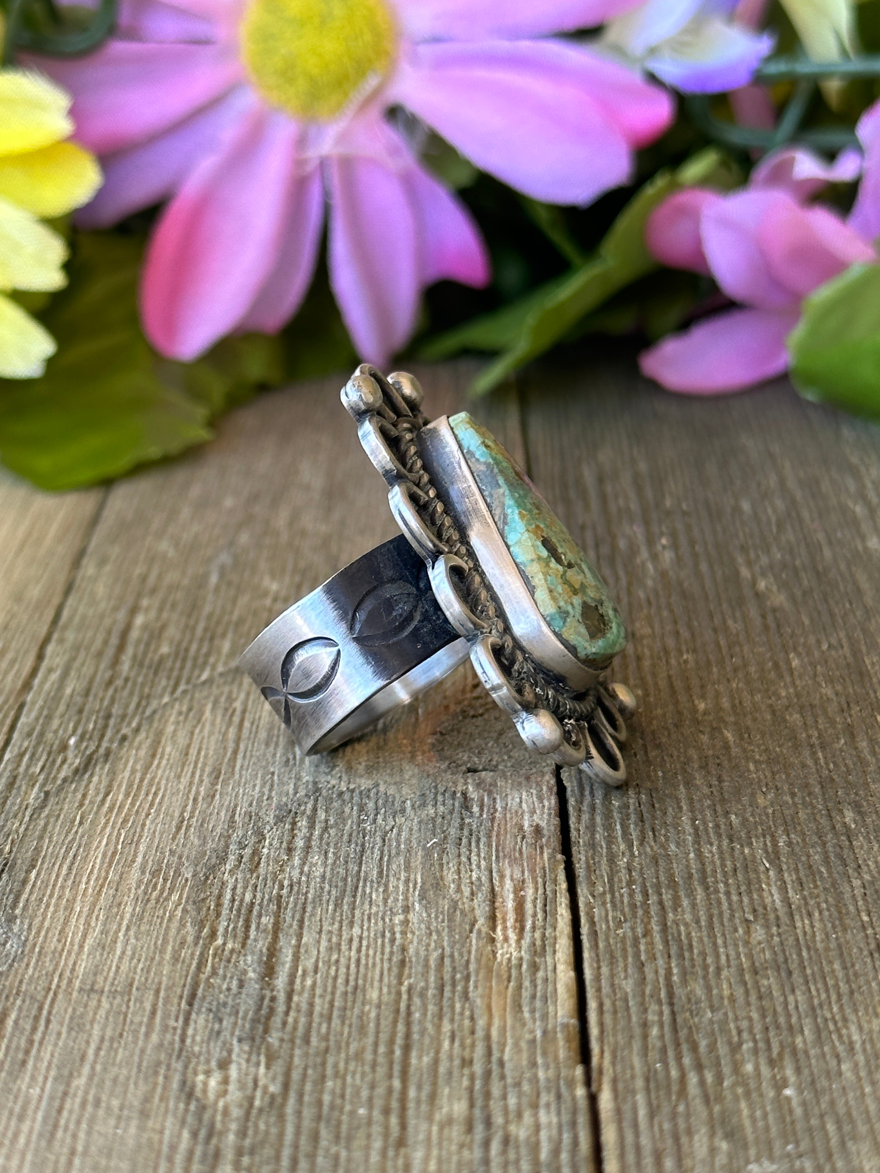 Alex Sanchez Sonoran Gold Turquoise & Sterling Silver Adjustable Ring. It measures 1 3/4 inches long and 1 1/4 inches wide. Signed by artist and stamped sterling silver.