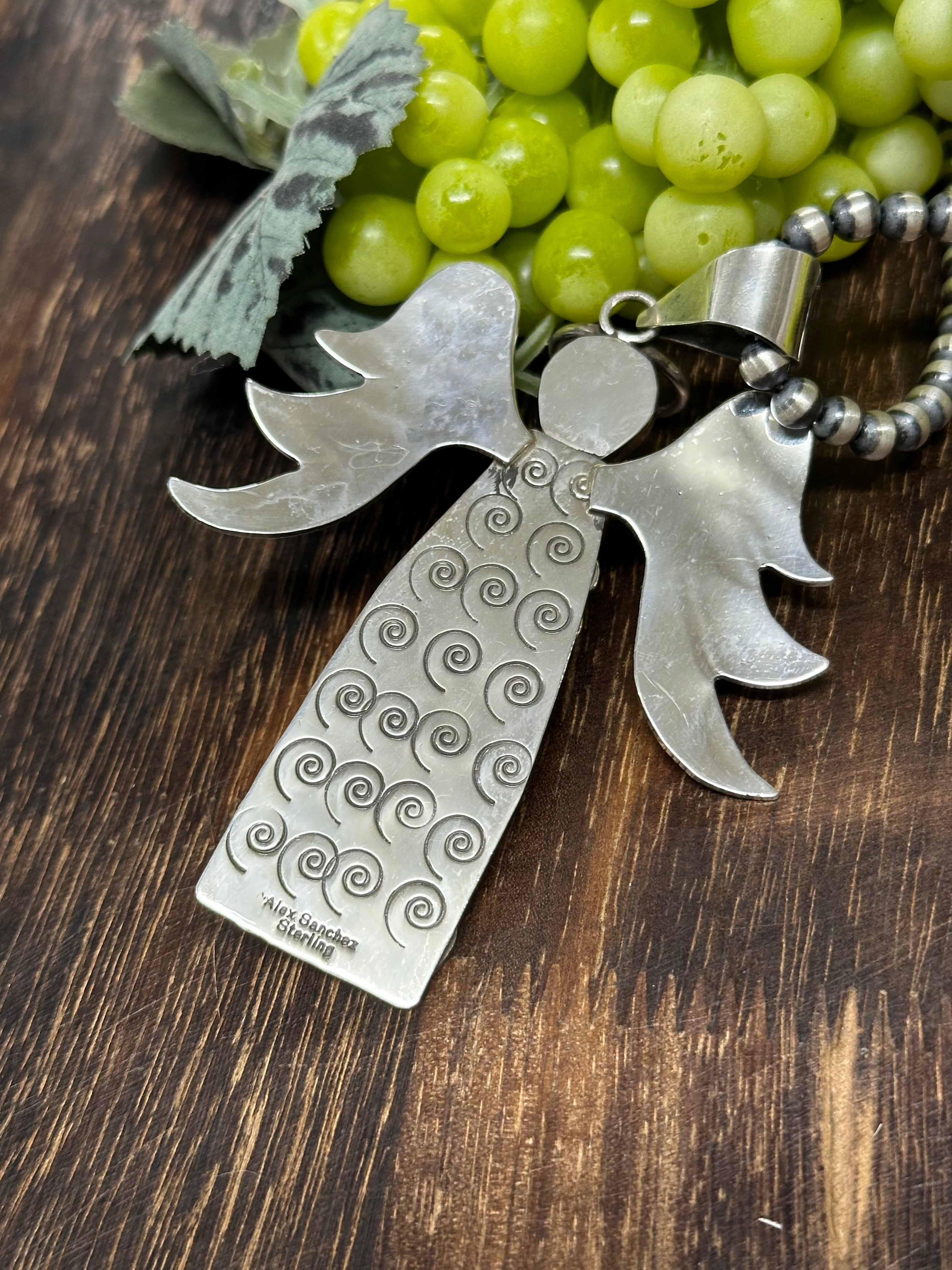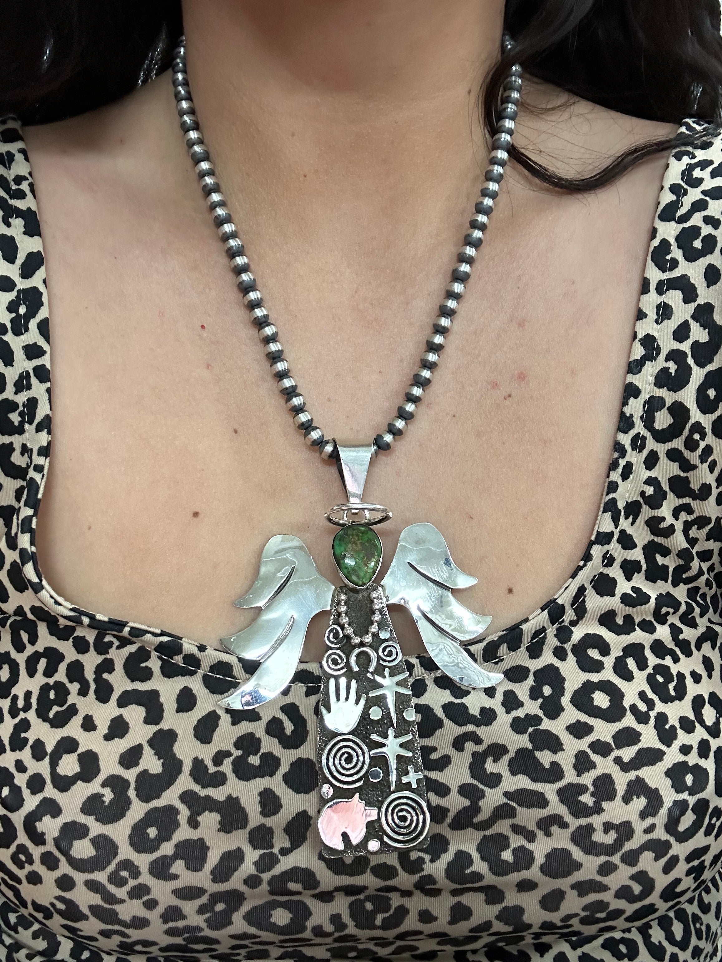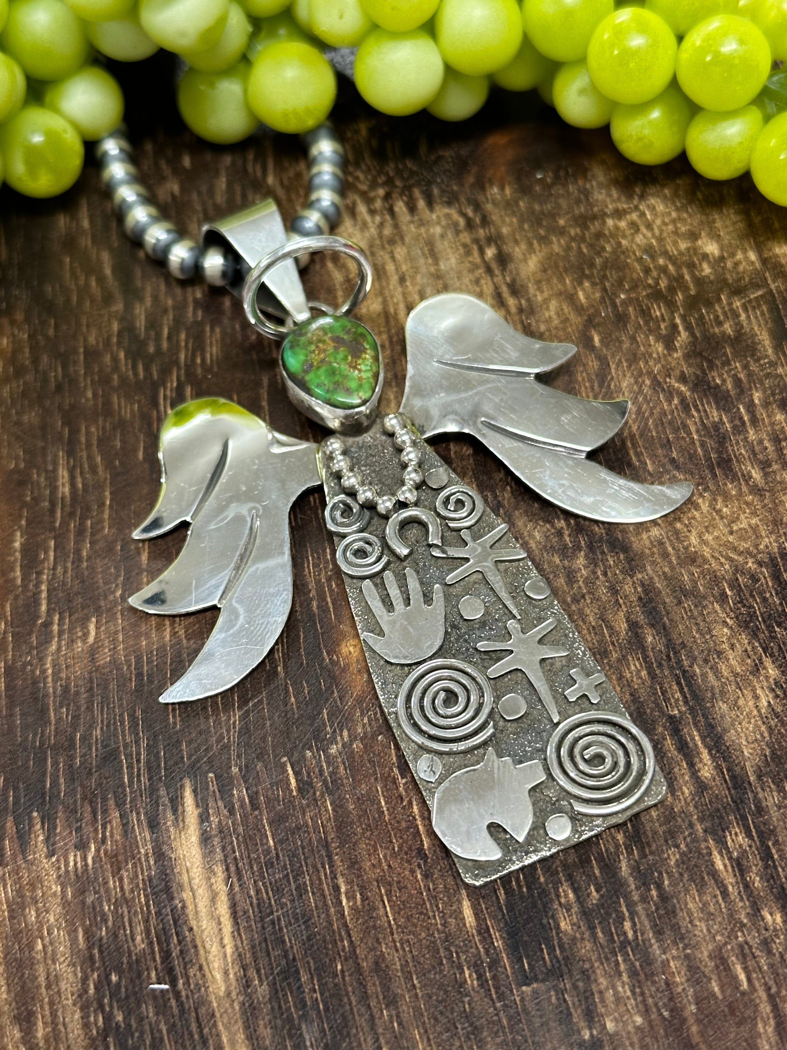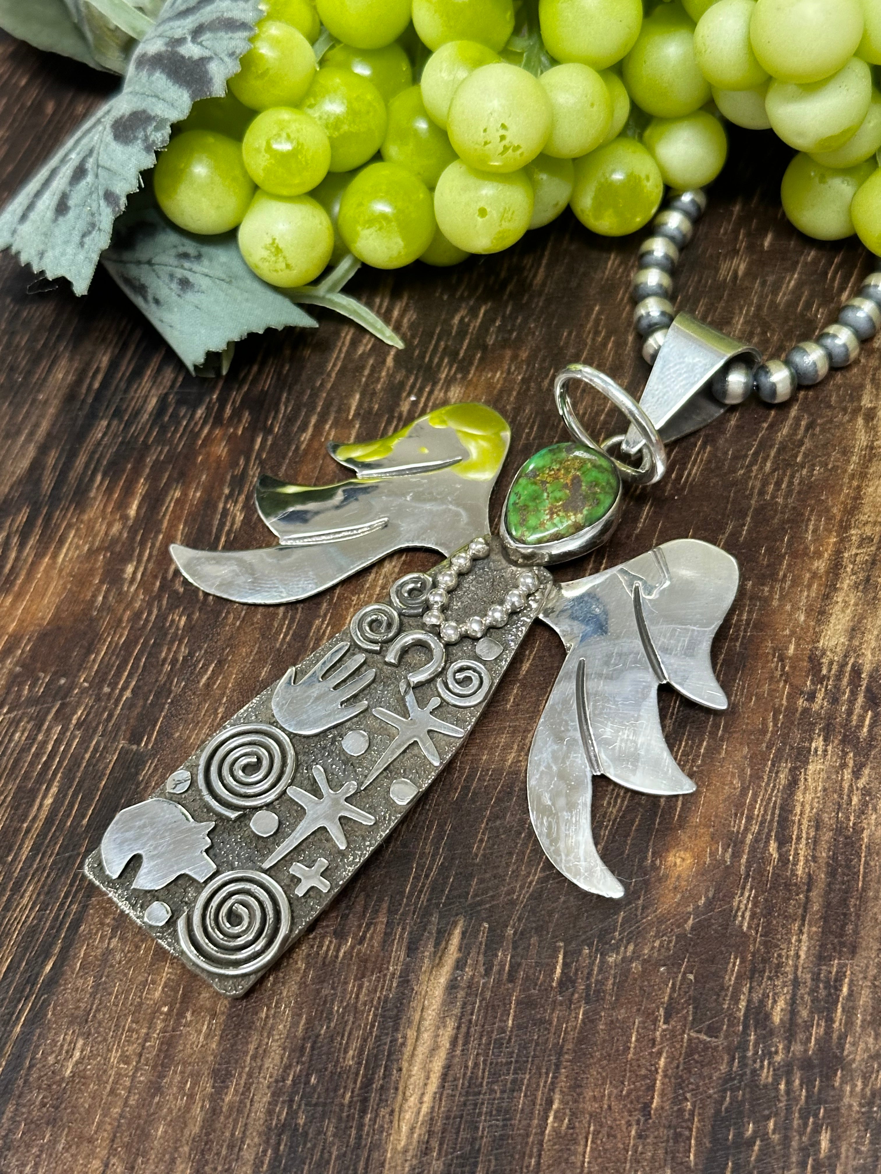 Alex Sanchez Sonoran Gold Turquoise & Sterling Silver Angle Pendant. It measures 4 3/8 inches long and 3 1/8 inches wide. Signed by the artist and stamped sterling silver.