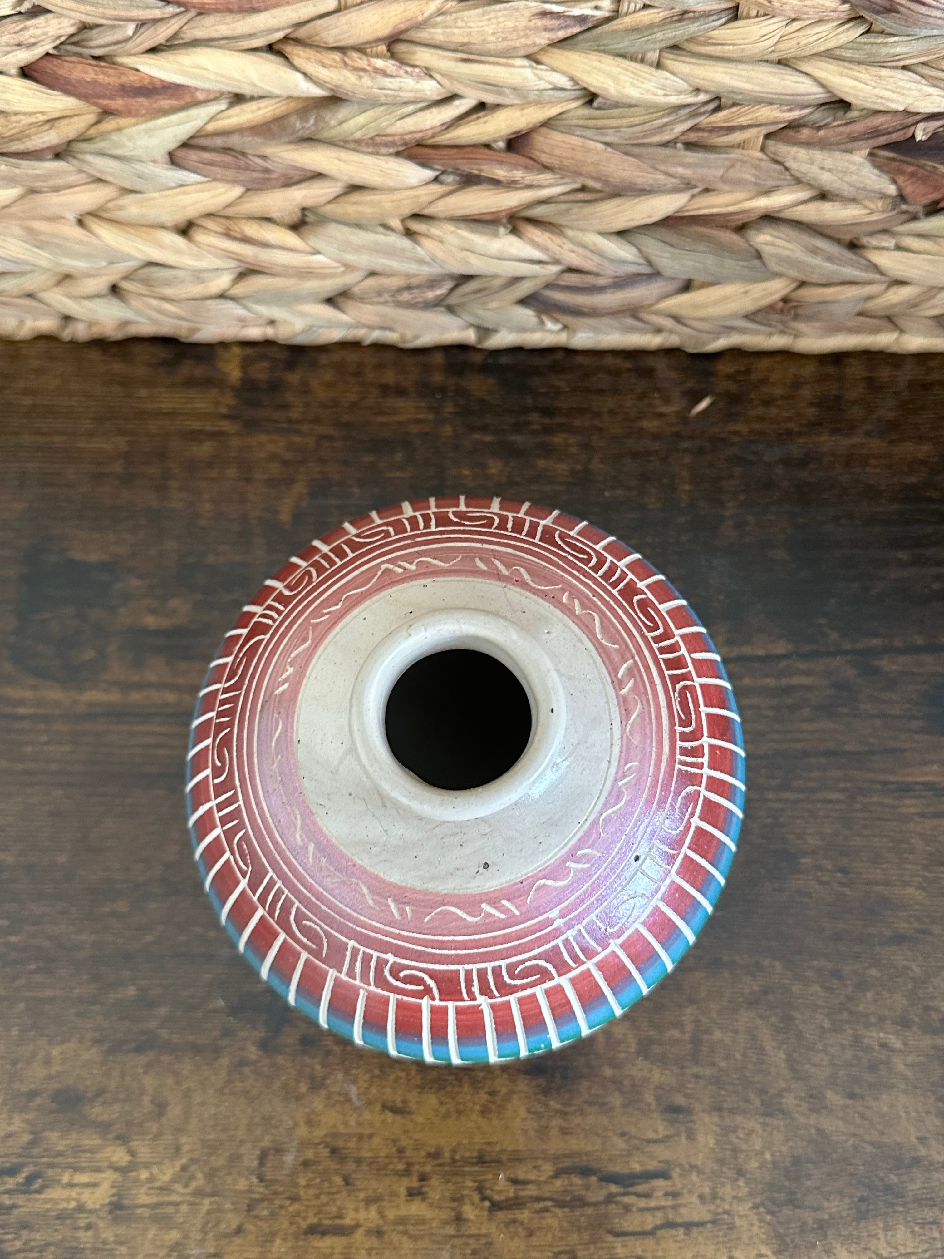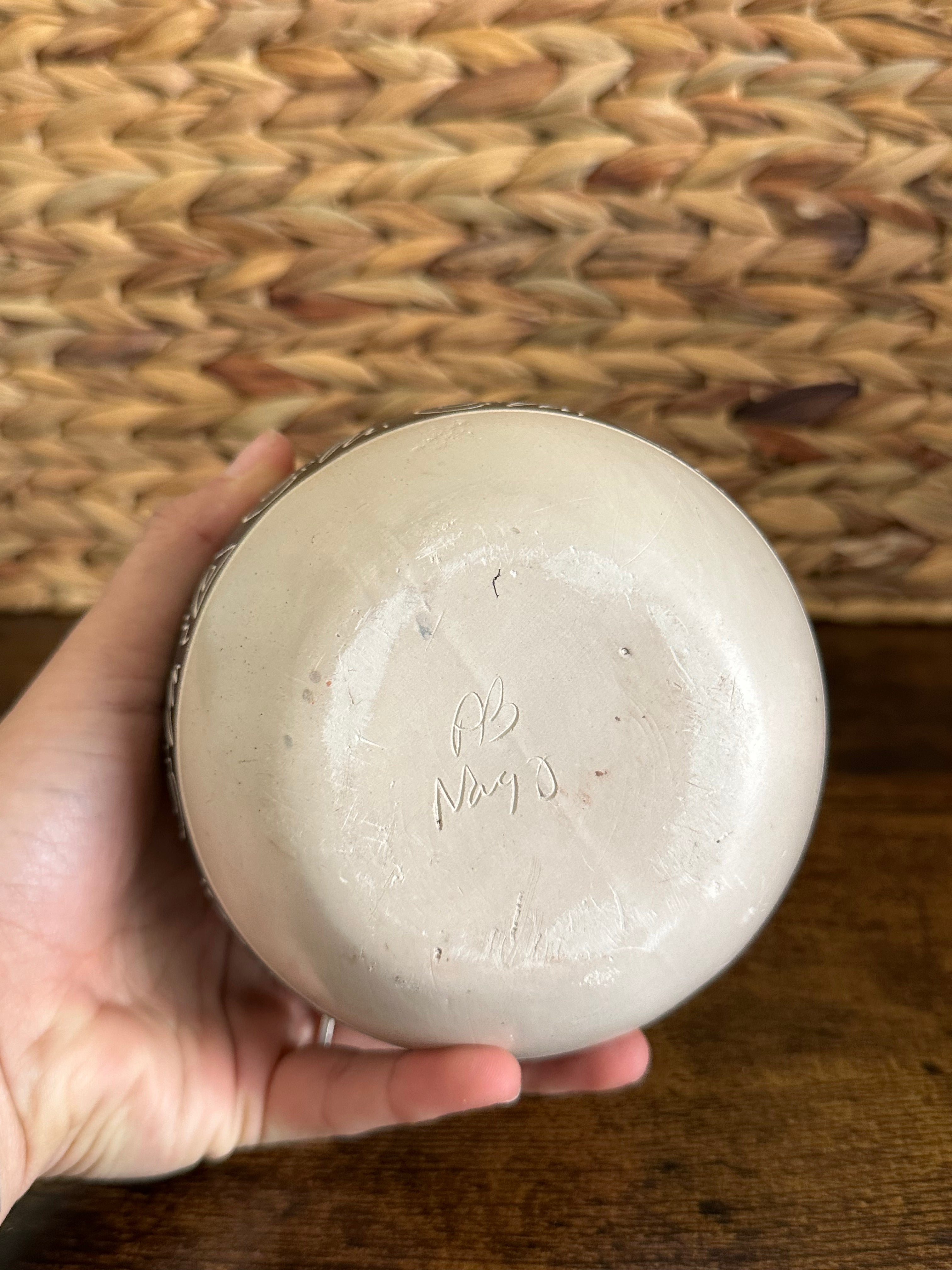 Ariel Benally Navajo Made Pottery. It measures 5 1/8 inches long and 14 1/2 inches round. Signed by the artist.
