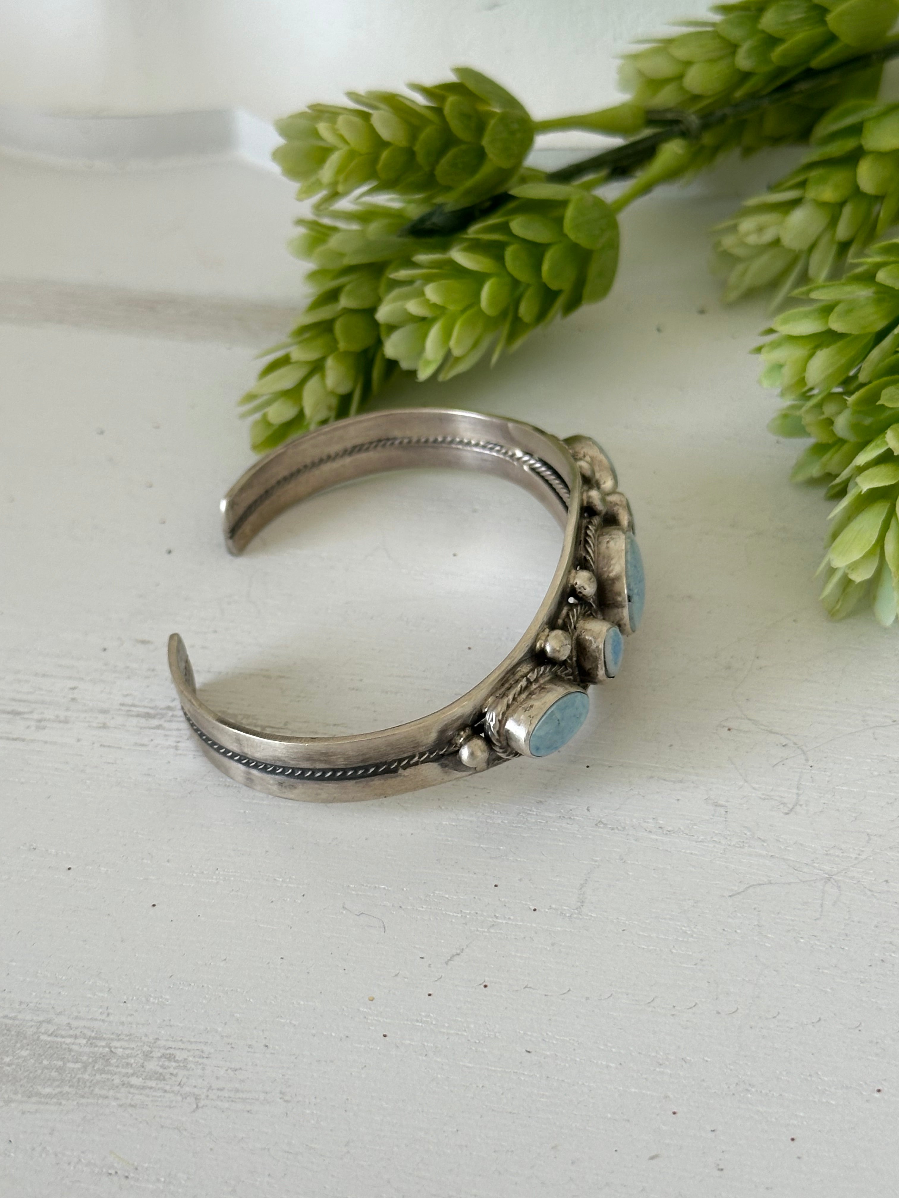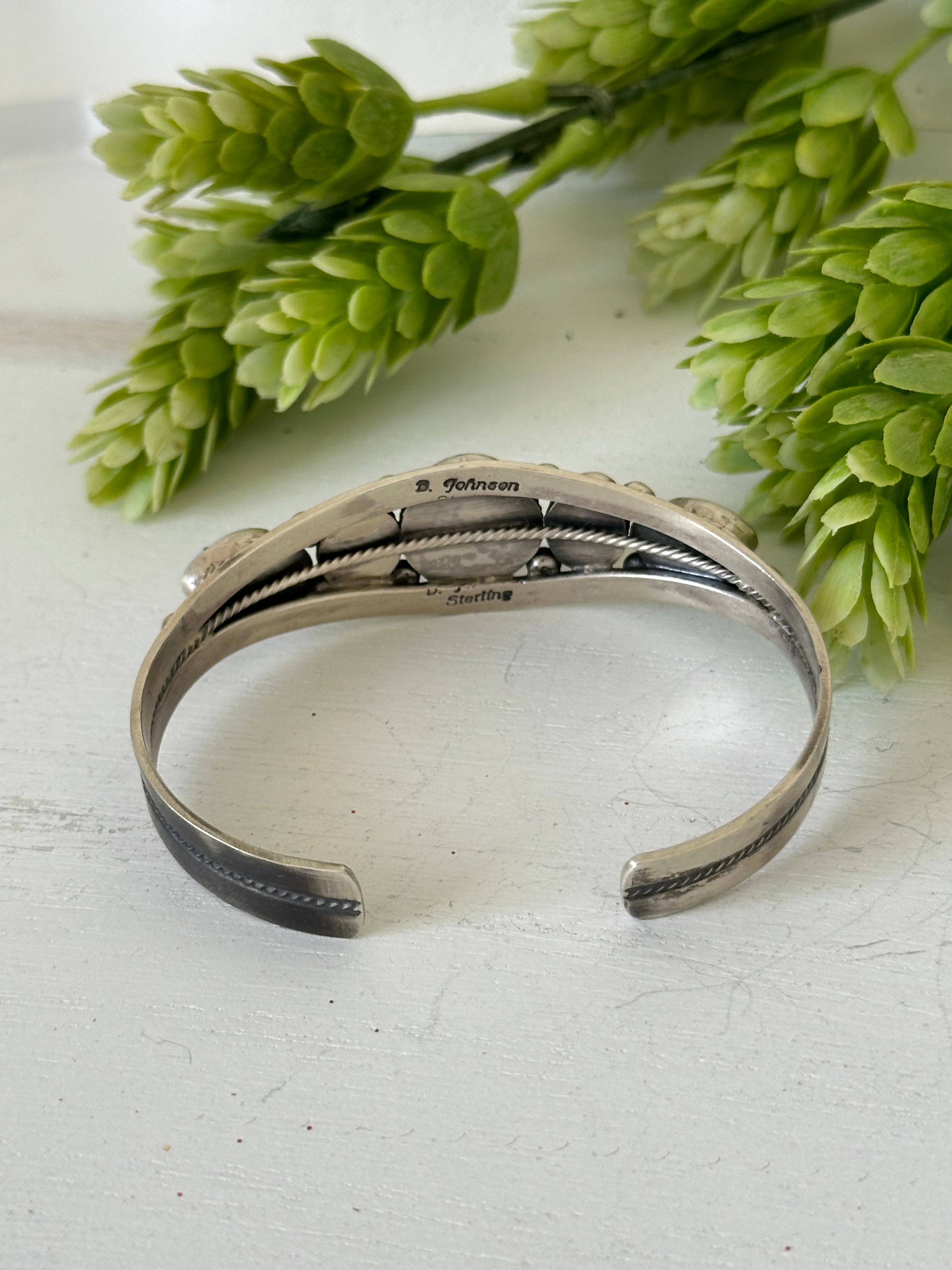Bobby Johnson Golden Hills Turquoise & Sterling Silver Cuff Bracelet. It measures 3/4 of an inch wide with an inside circumference of 5 3/4 inches and a gap 7/8 of an inch. Signed by the artist and stamped sterling silver.
