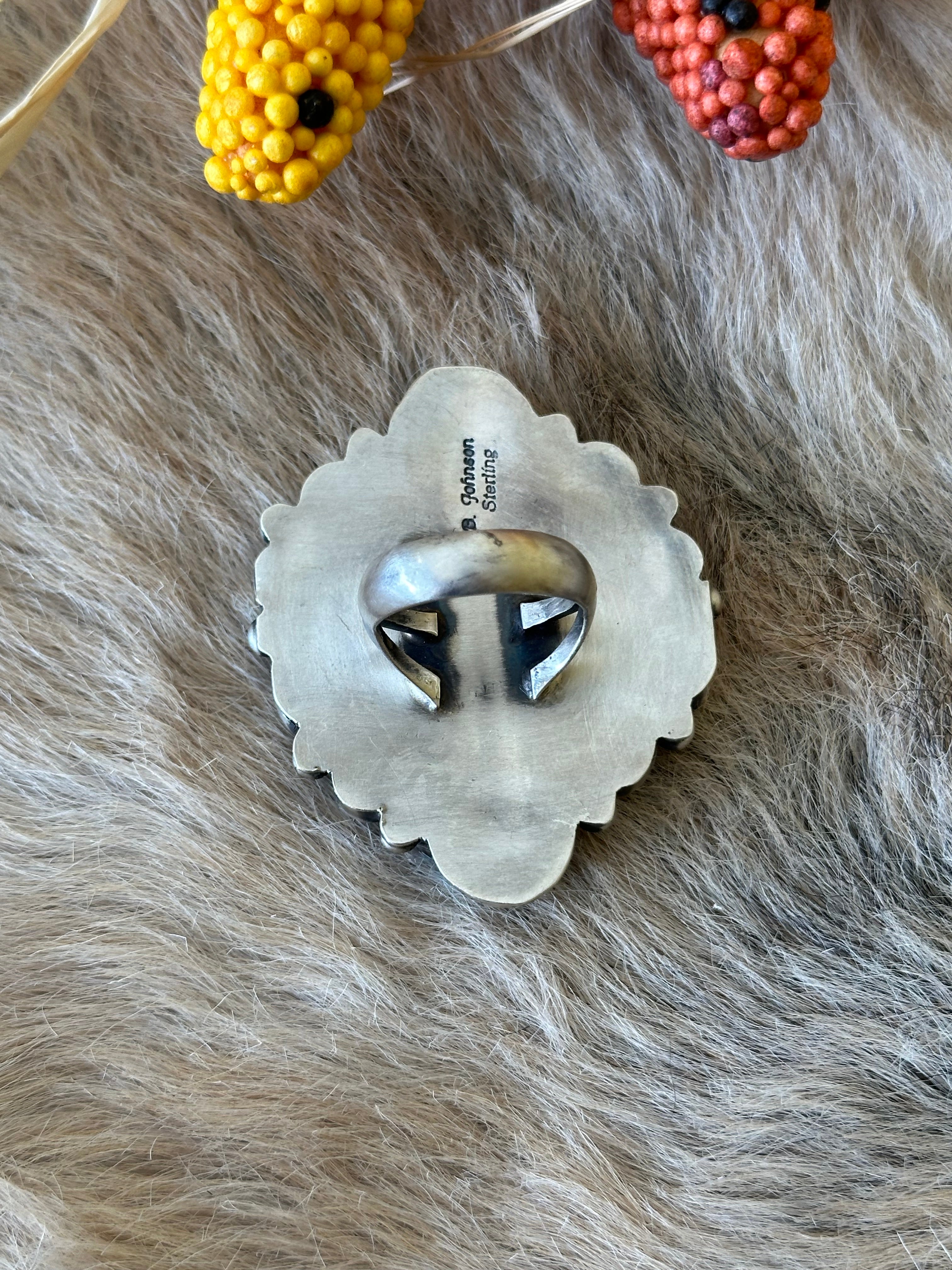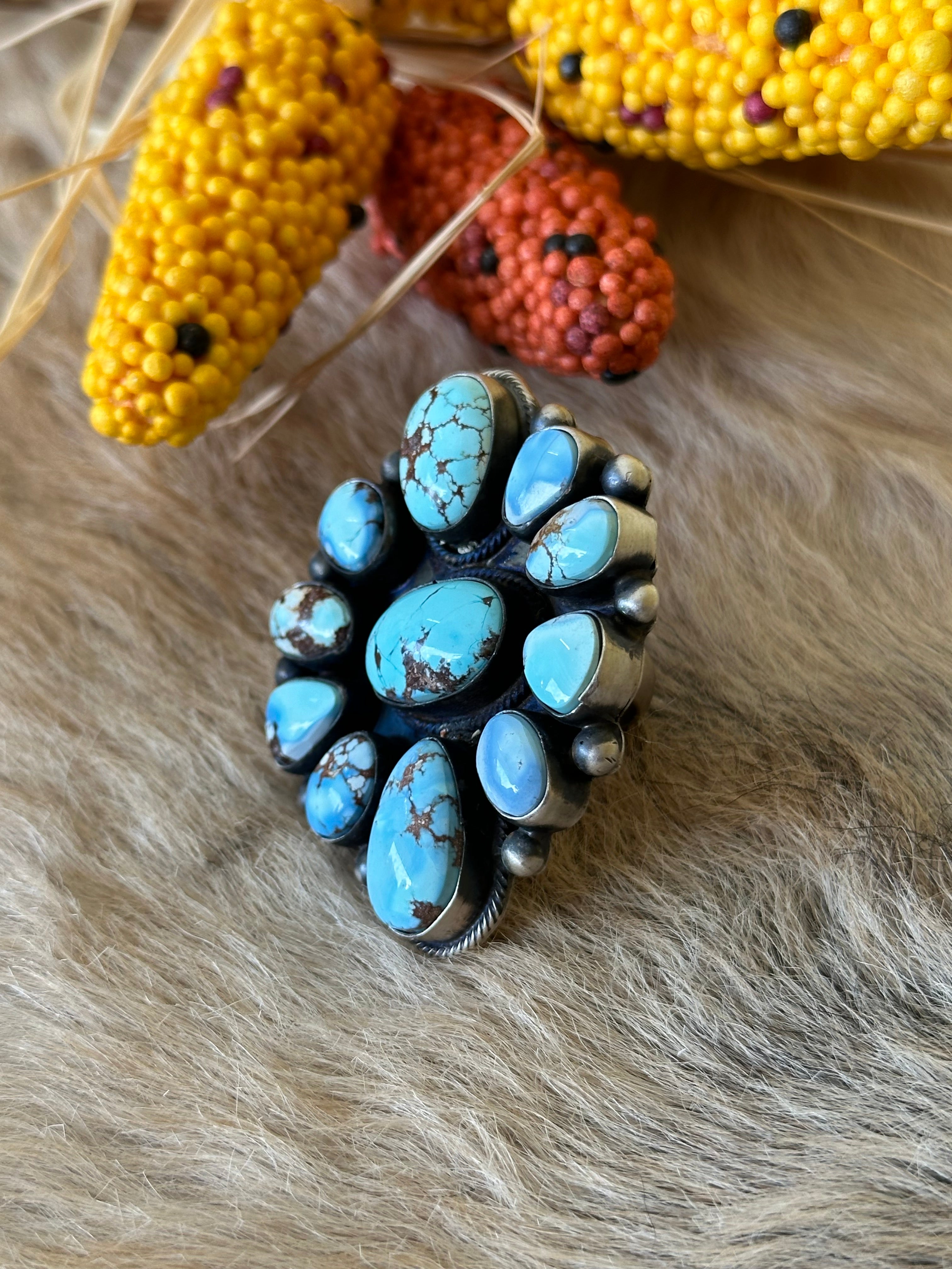 Beautiful ring. Bobby Johnson Golden Hills Turquoise& Sterling Silver Ring Size 8. It measures 2 1/4 inches long and 1 3/4 inches wide. Stamped sterling silver and signed by artist.