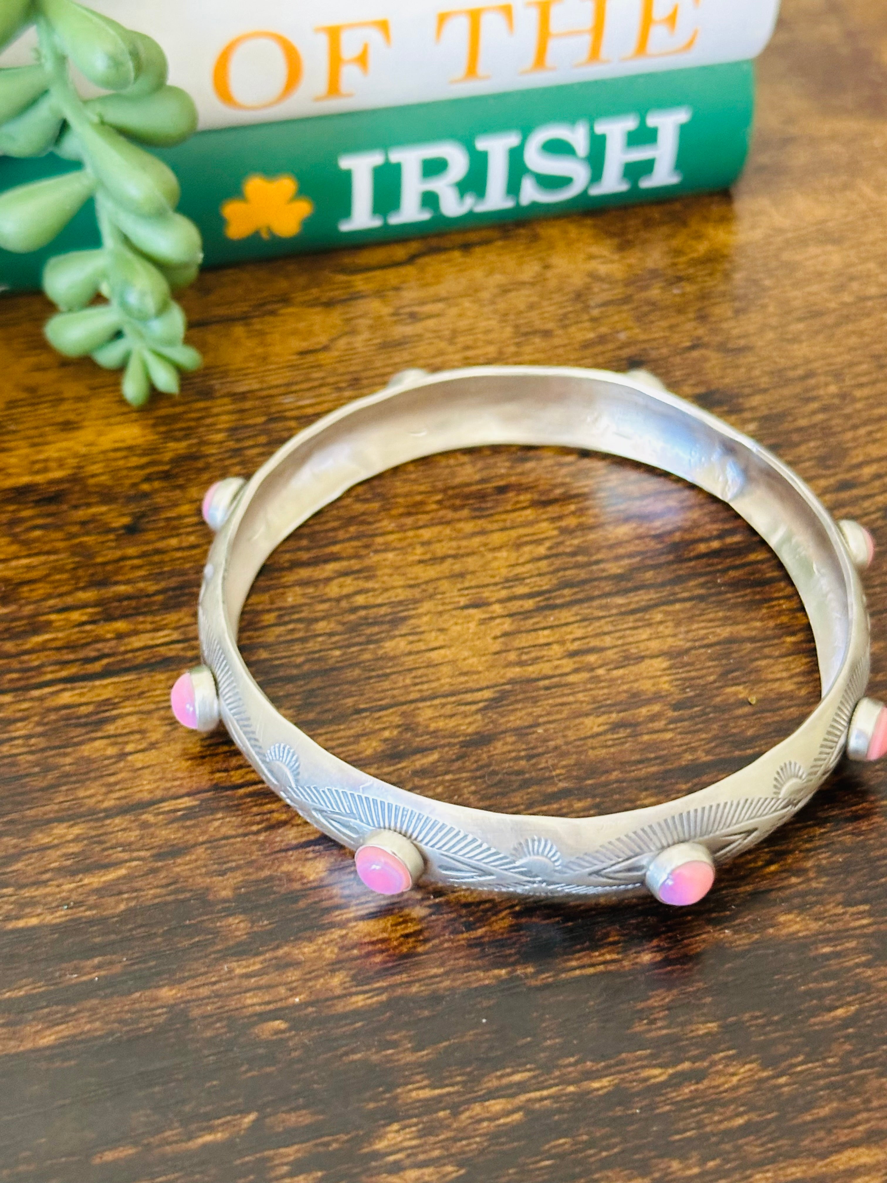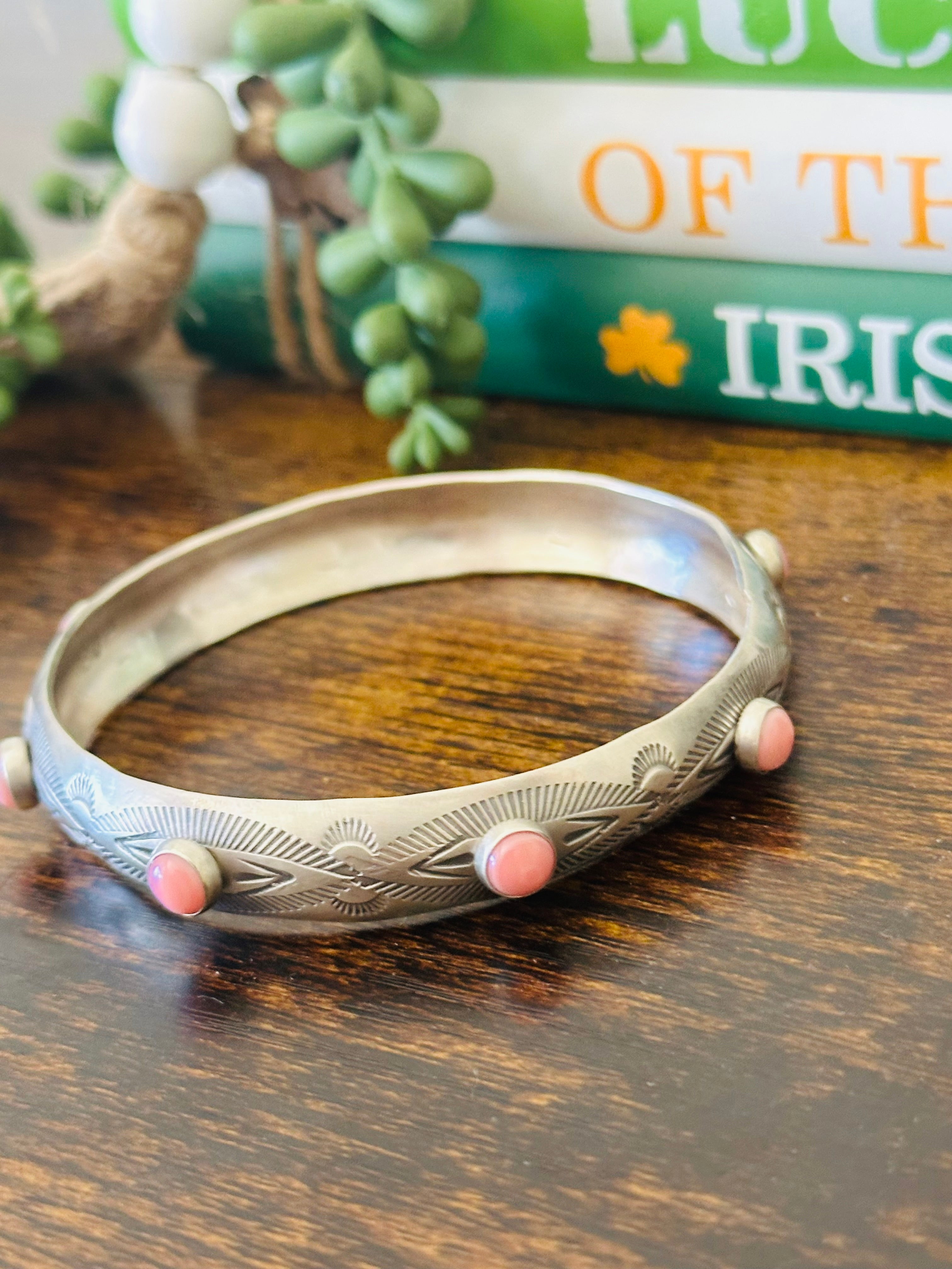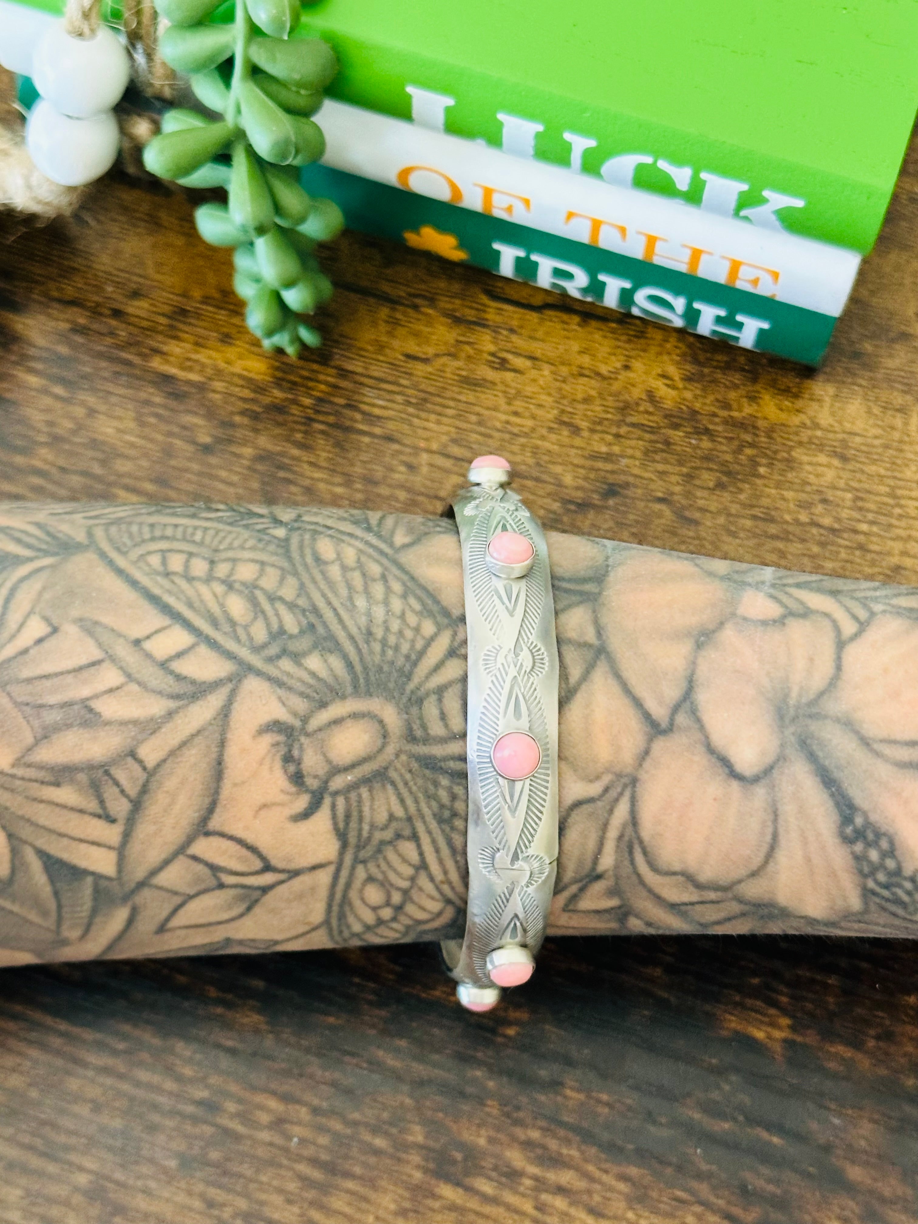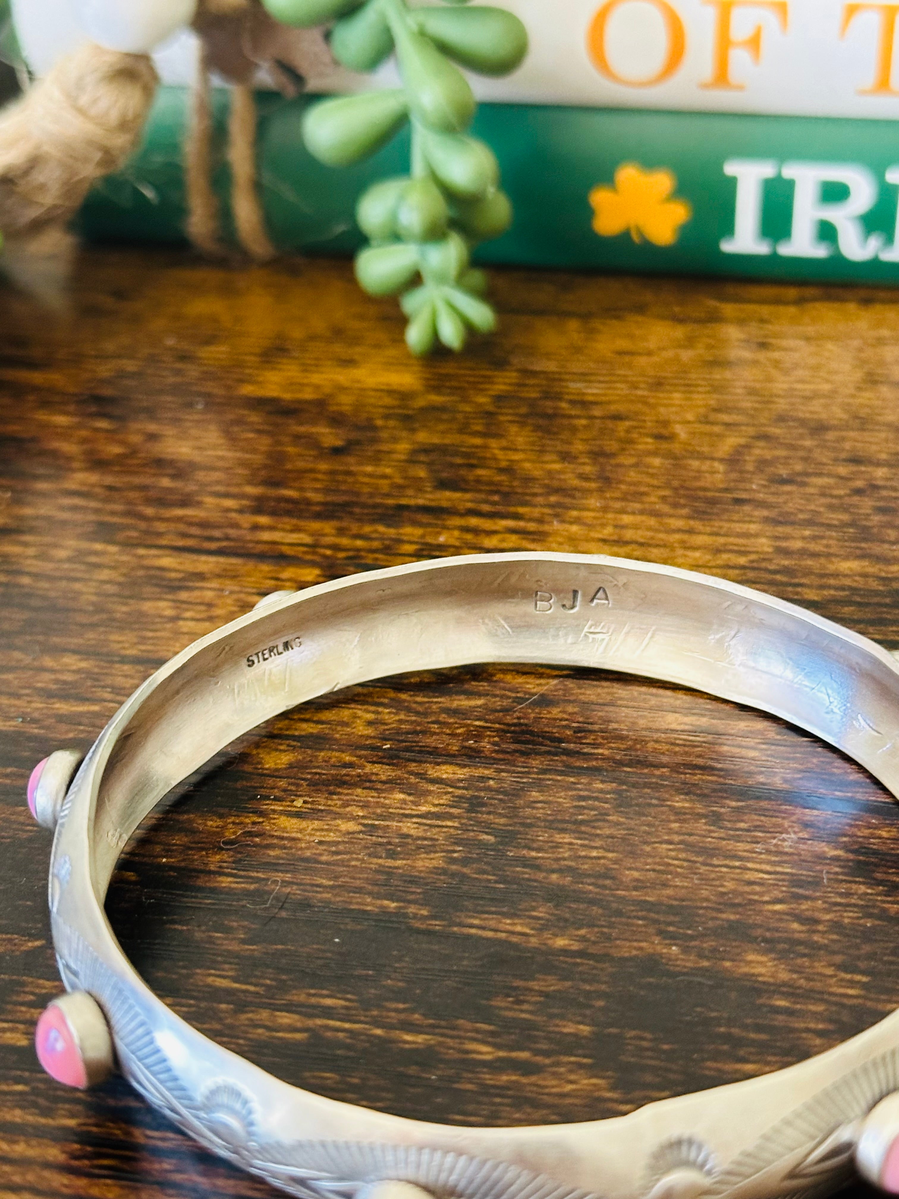 Boyd Ashley Pink Conch & Sterling Silver Bracelet. It measures just under 1/2 of an inch wide with an inside circumference of 8 inches. Signed by artist and stamped sterling silver. Stones will differ due to natural stones.