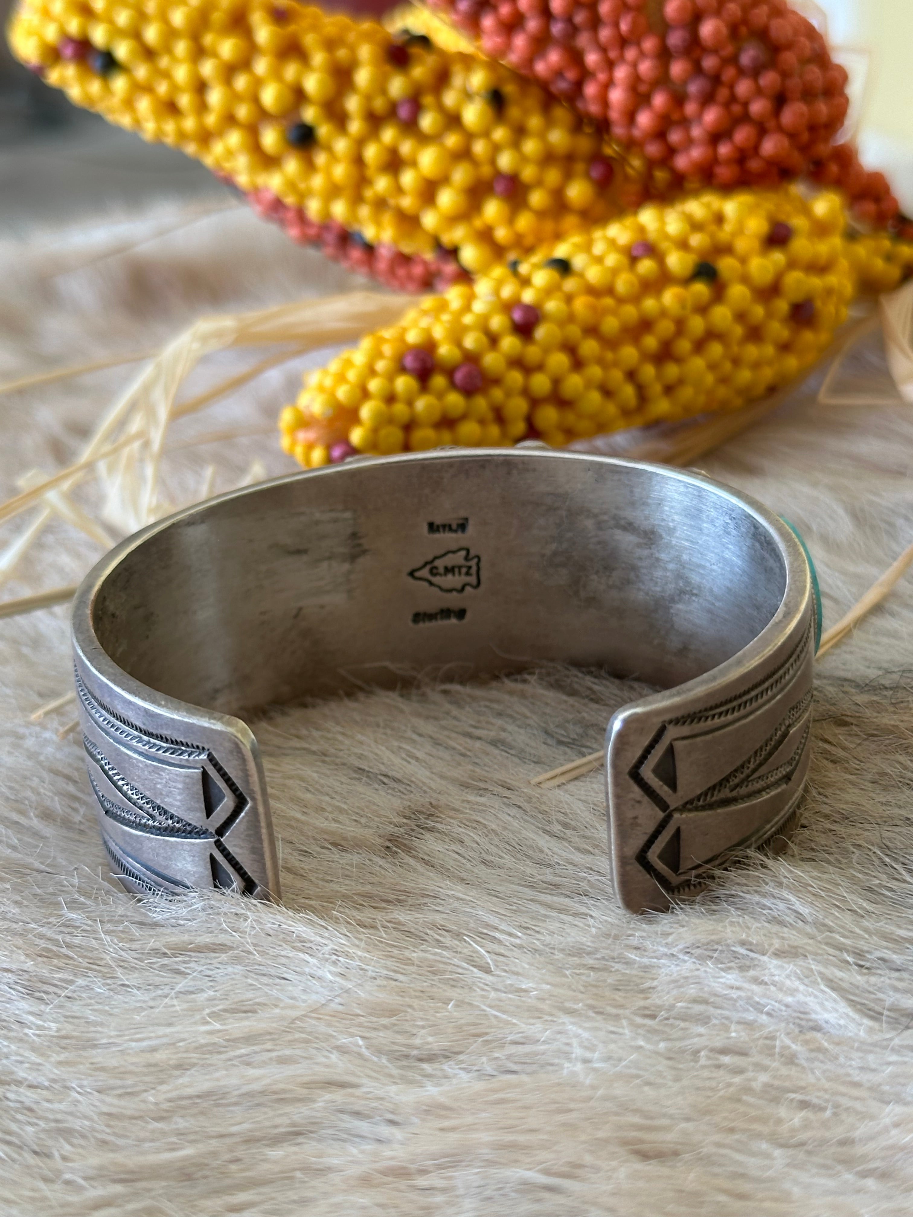 Calvin Martinez Valley Blue Turquoise & Sterling Silver Cuff Bracelet. It measures 1 inch wide with an inside circumference of 5 1/2 inches and a gap of 1 inch. Signed by artist and stamped sterling silver.