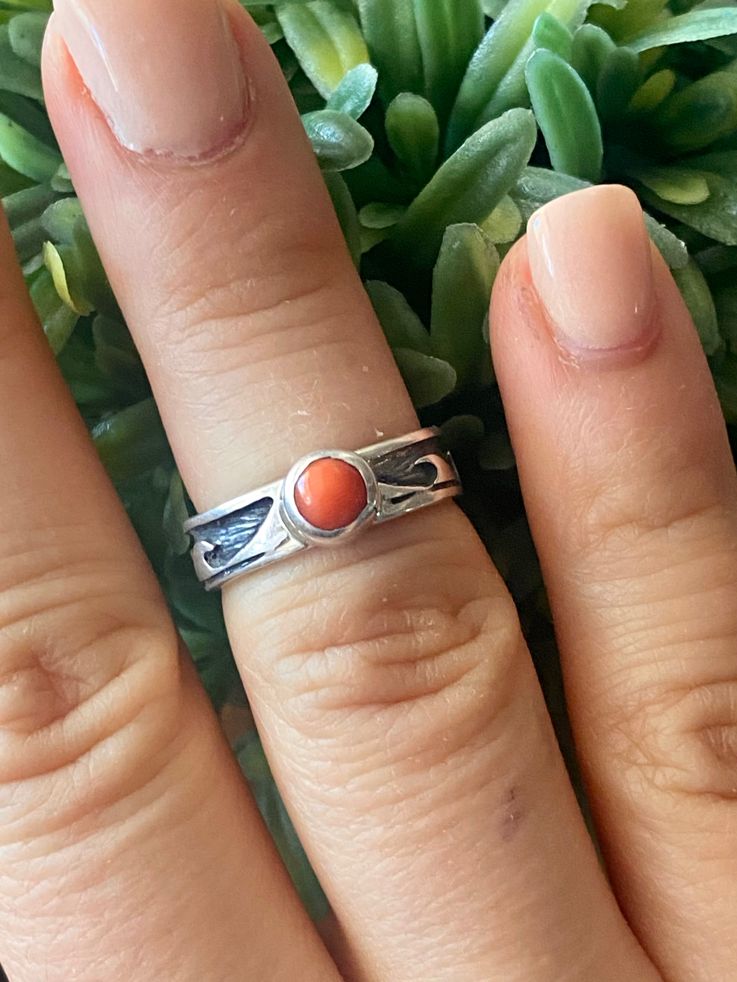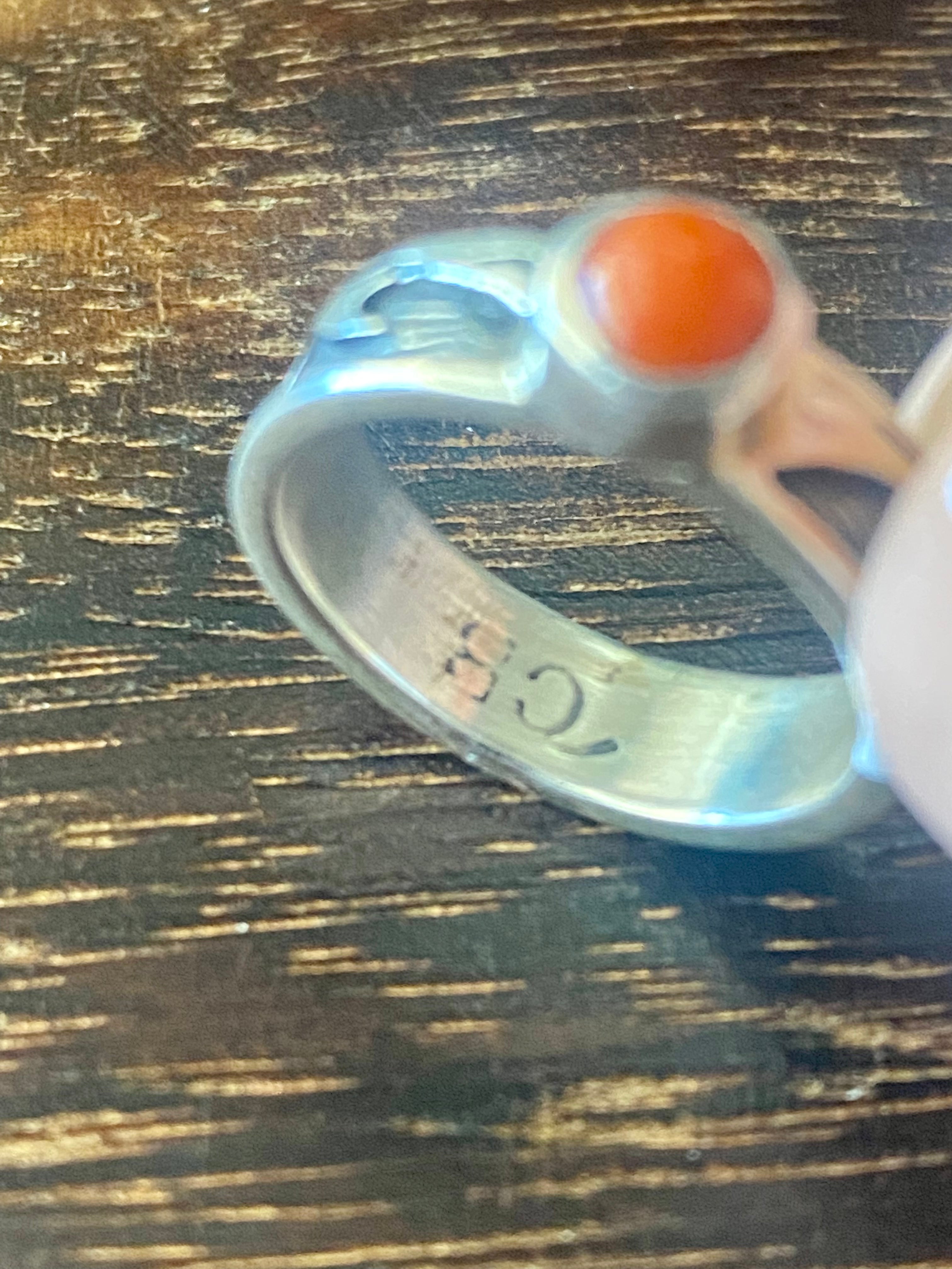 Carson Blackgoat Coral & Sterling Silver Ring Size 5.75. It measures 1/4 of an inch lonf and 1/4 of an inch wide. Signed by the artist and stamped sterling silver.