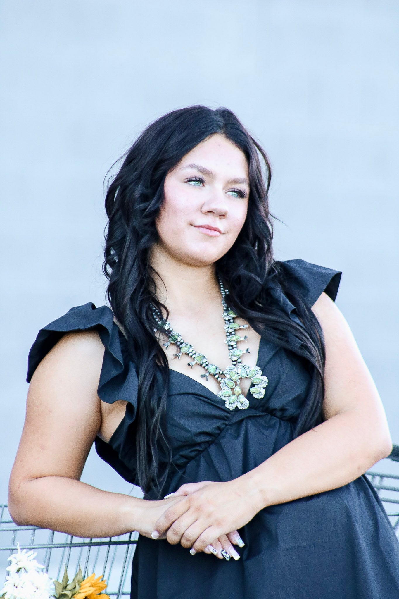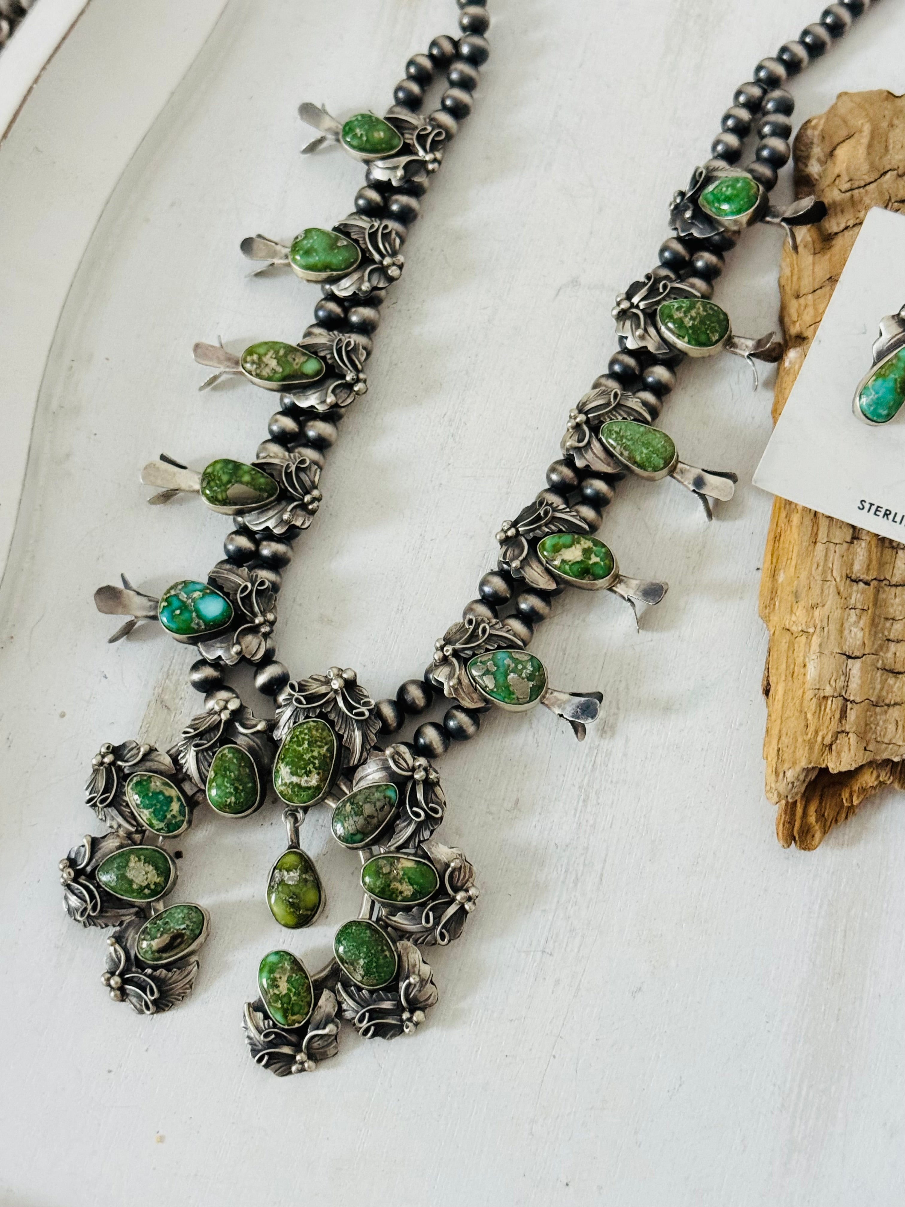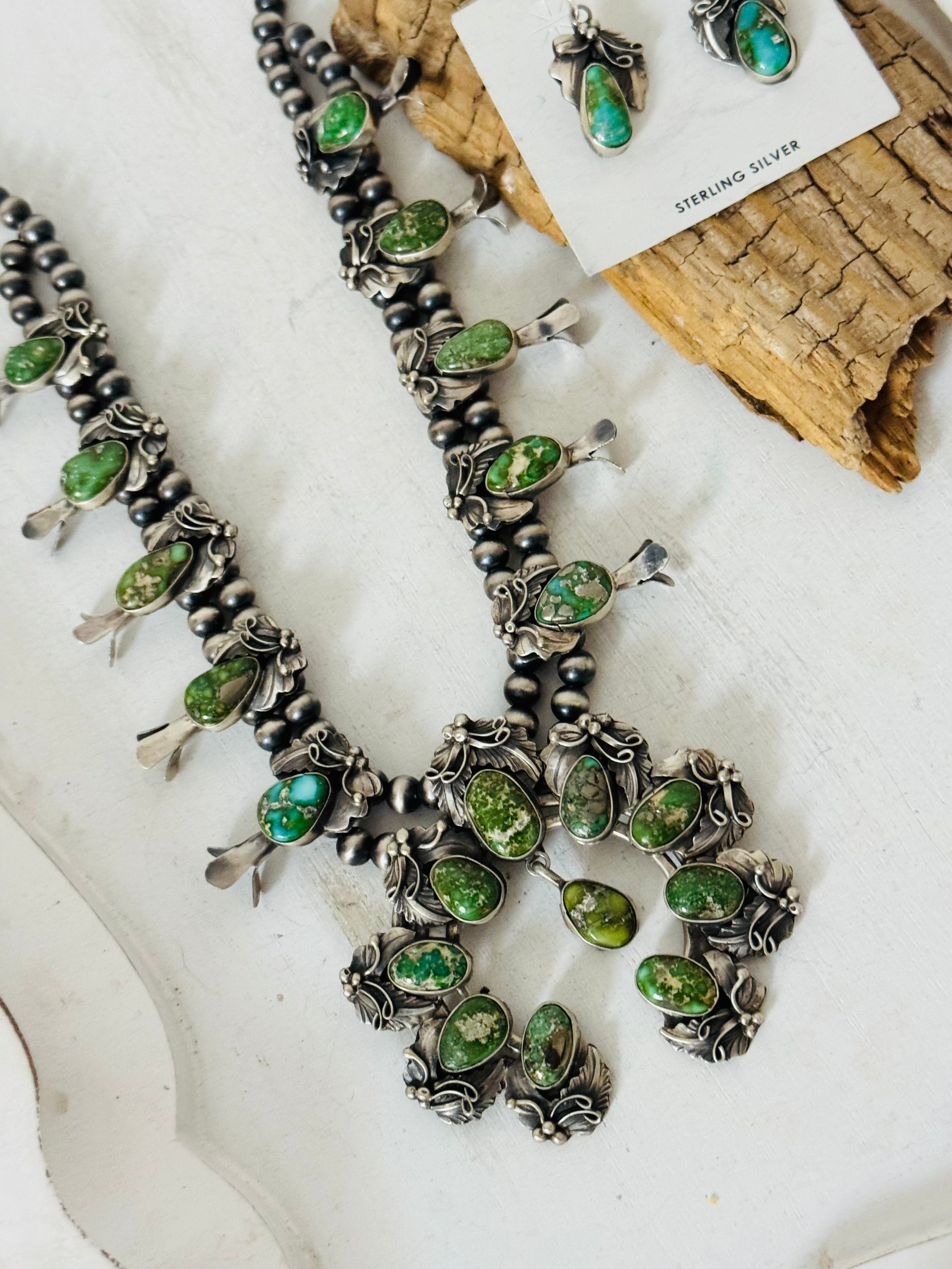 Navajo Made Sonoran Mountain Turquoise & Sterling Silver Squash Blossom Necklace Set