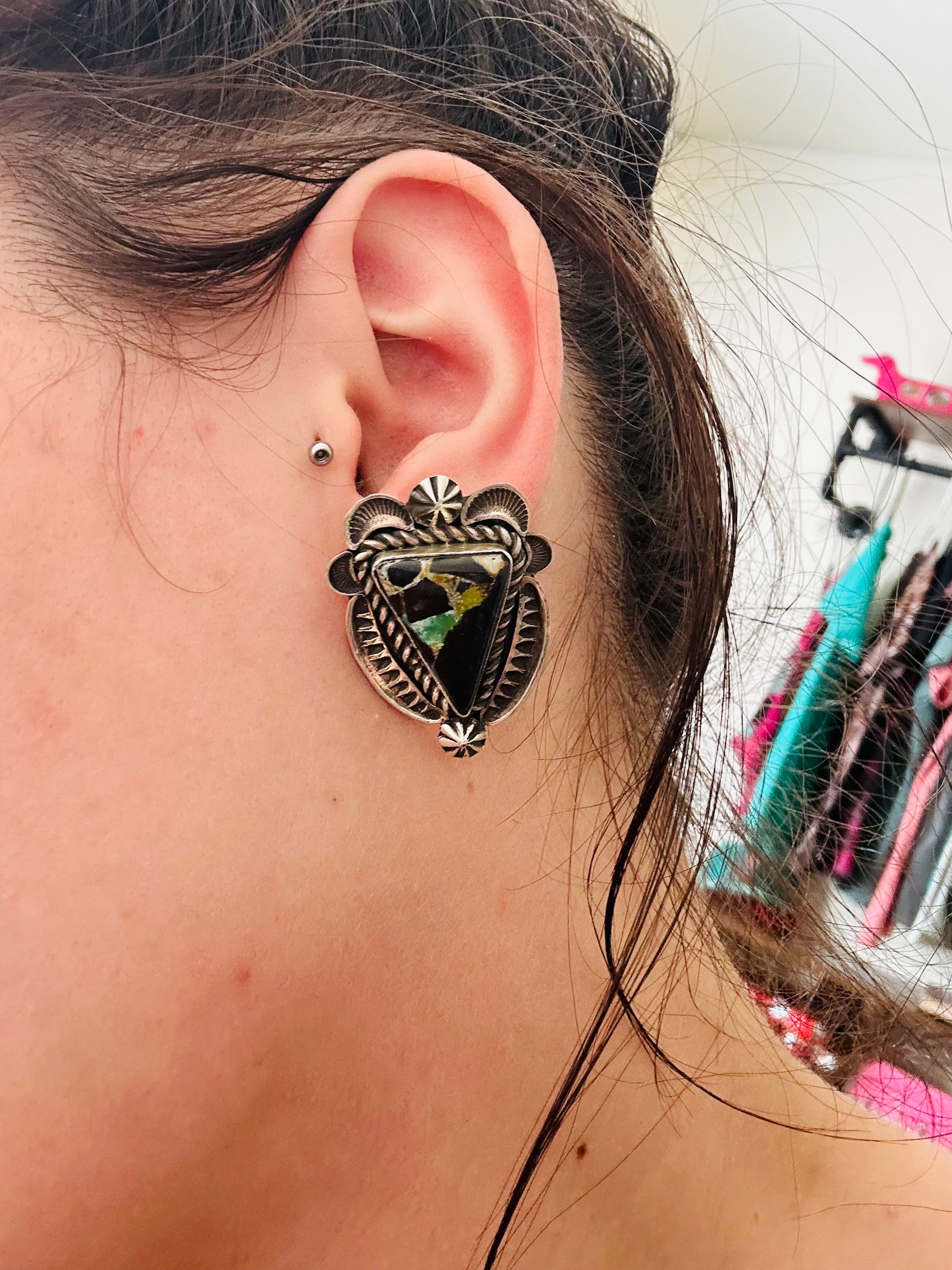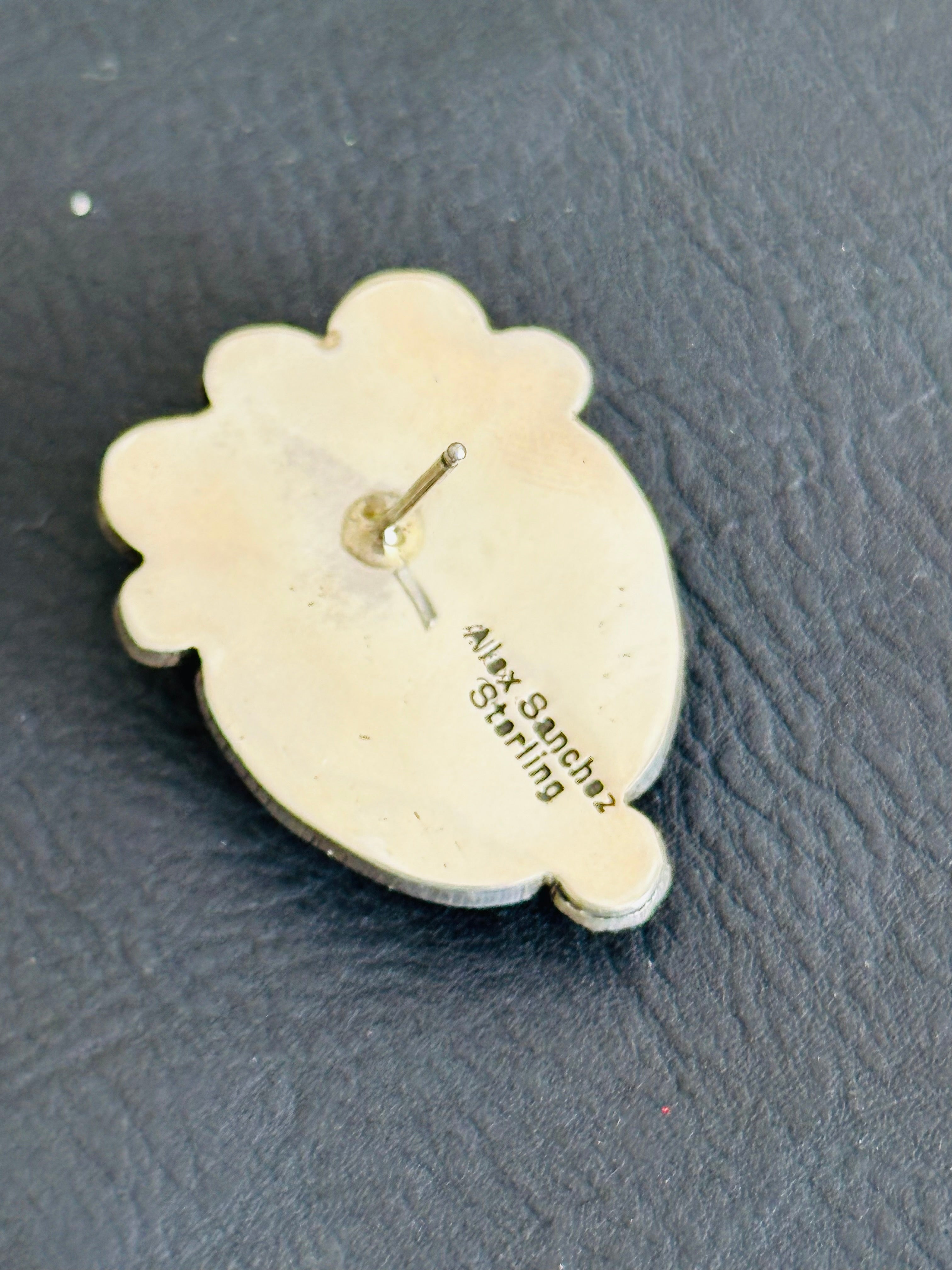 Alex Sanchez Black Jack & Sterling Silver Post Earrings. They measures just over 1 3/8 inches long and 1 1/8 inches wide. Signed by the artist and stamped sterling silver.