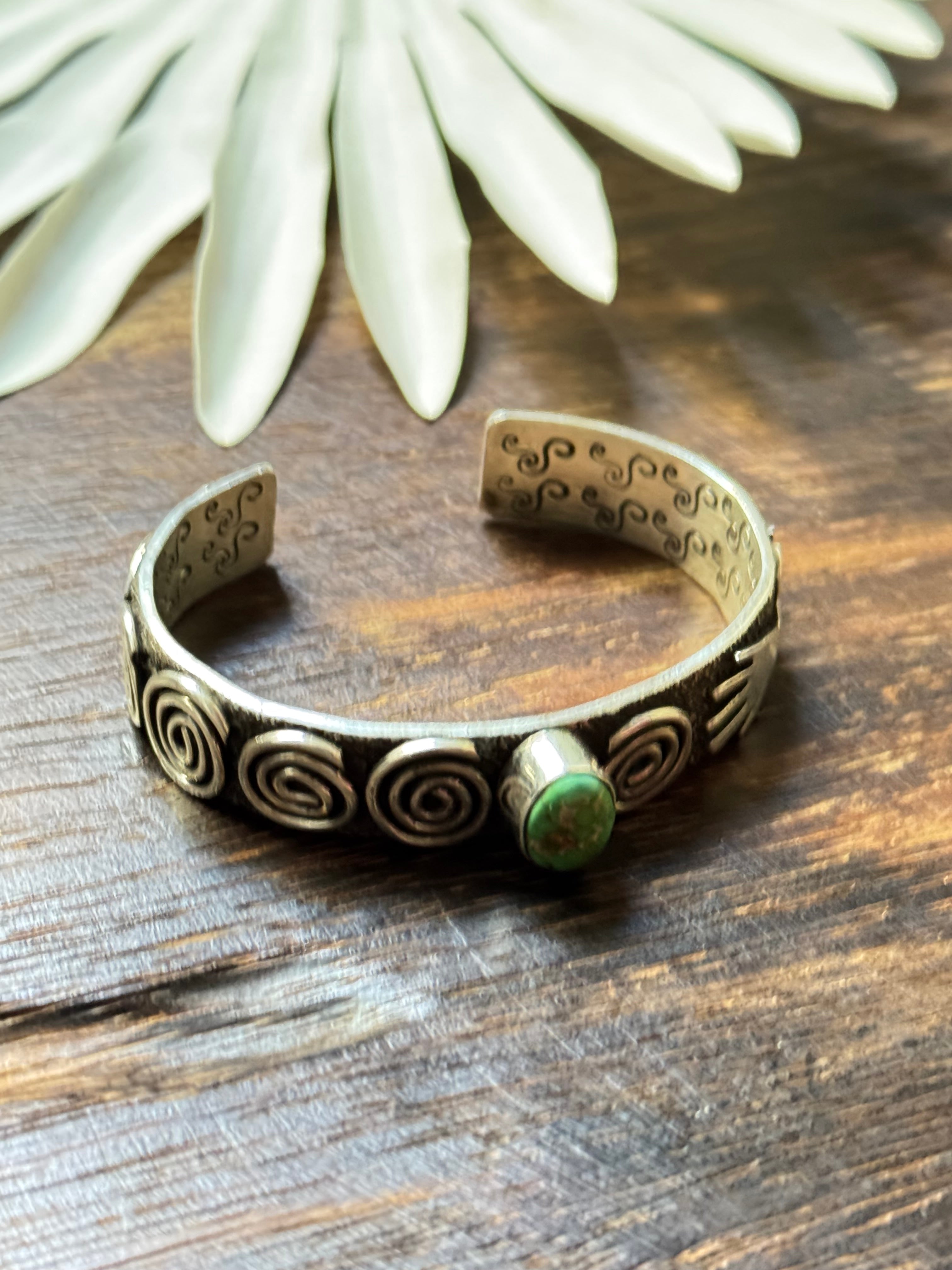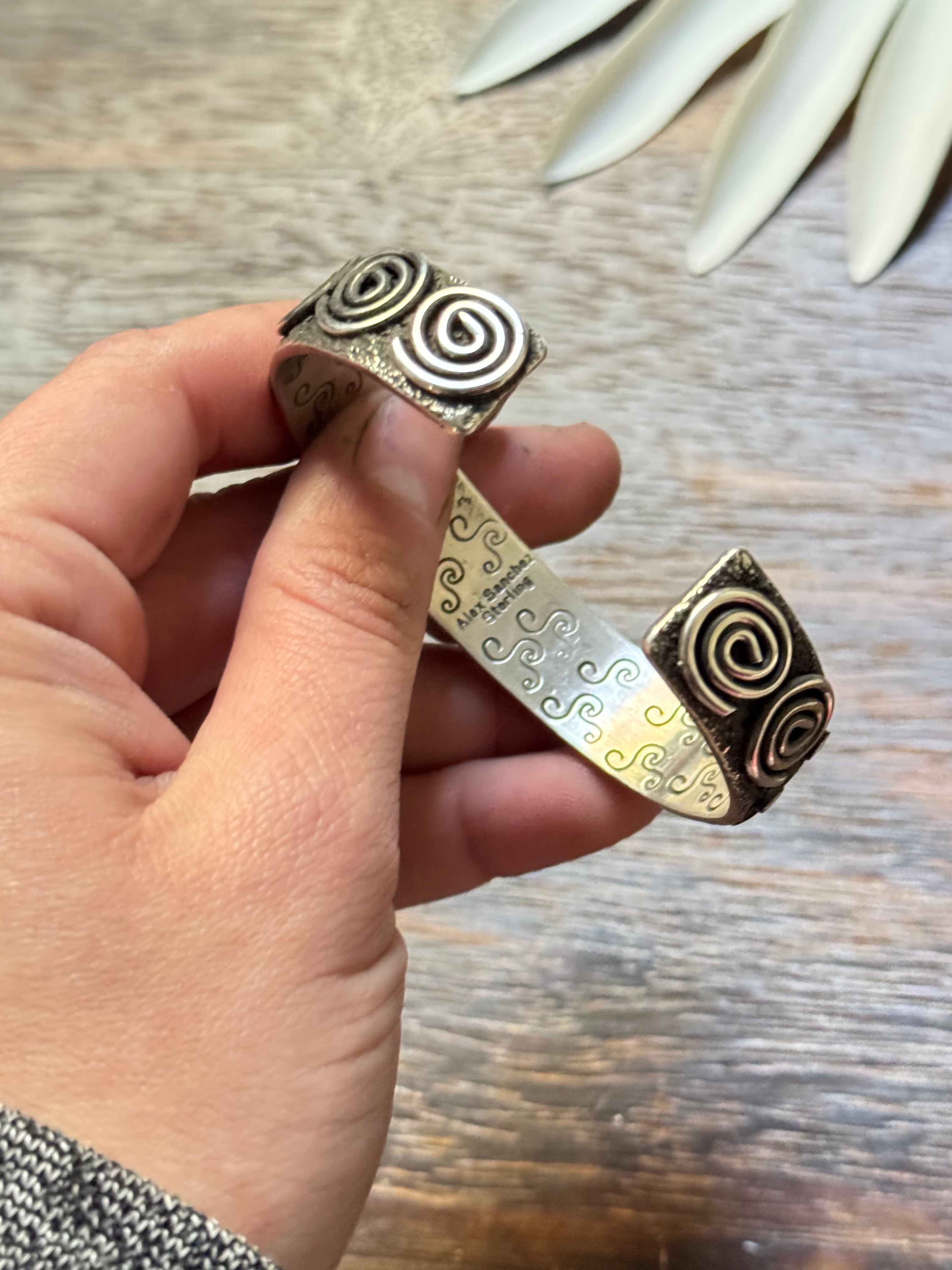 Alex Sanchez Sonoran Mountain Turquoise & Sterling Silver Cuff Bracelet. It measures 1/2 of an inch wide with an inside circumference of 5 1/2 inches and a gap of 7/8 of an inch. Signed by the artist and stamped sterling silver.