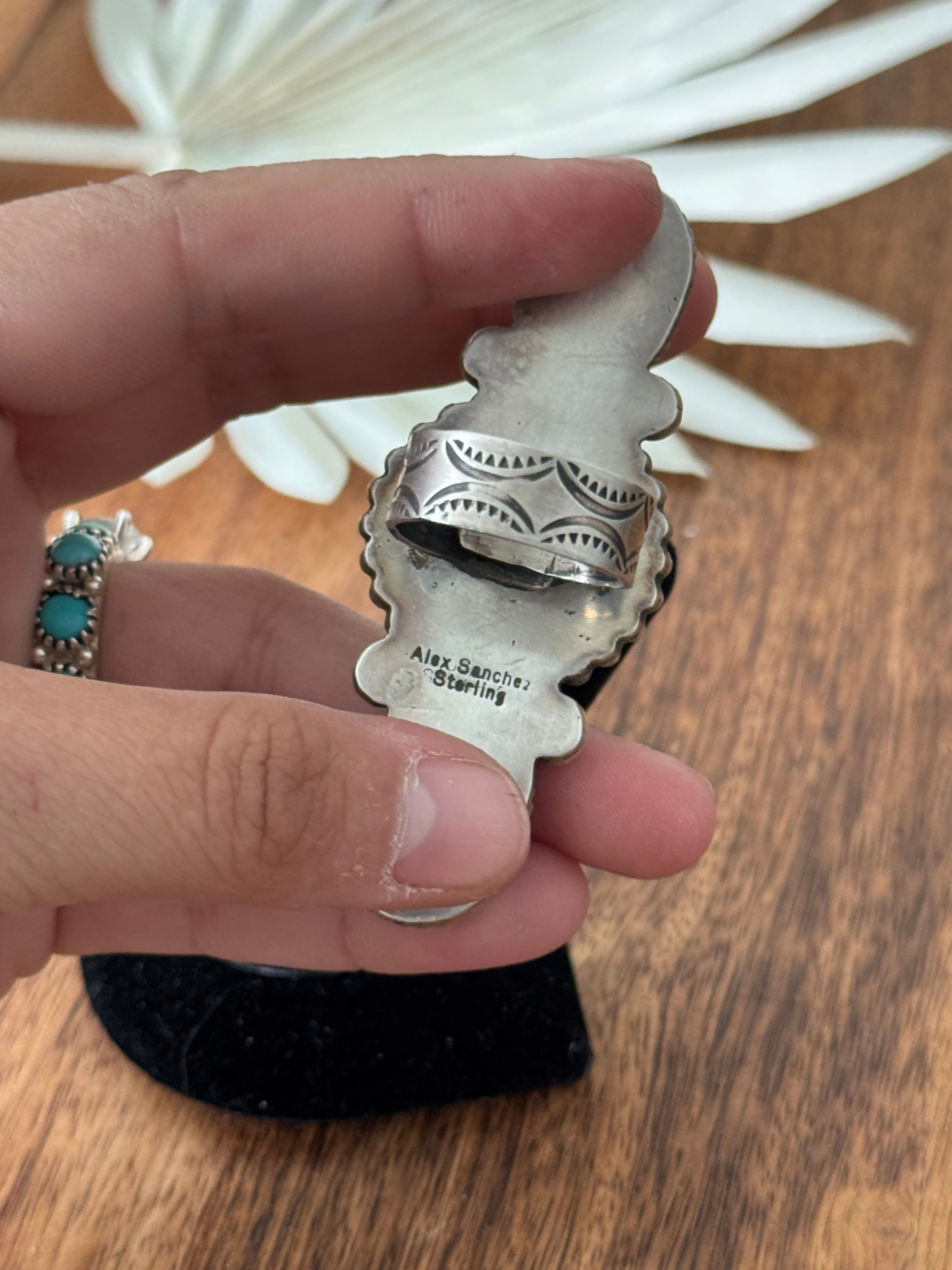 Alex Sanchez Sonoran Mountain Turquoise & Sterling Silver Adjustable Ring. It measures 2 3/4 inches long and 1 1/8 inches wide. Signed by the artist and stamped sterling silver.