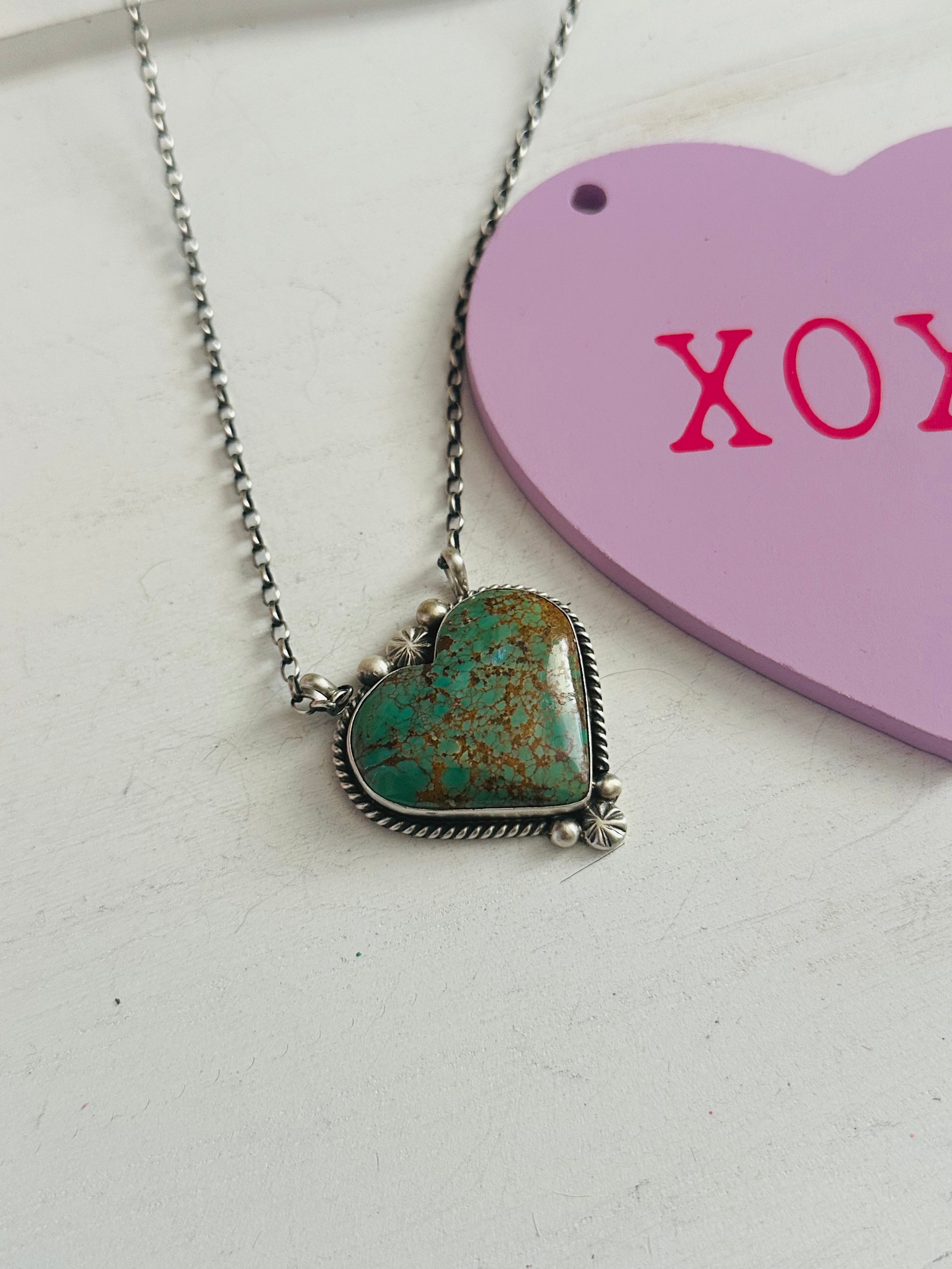 Beautiful Necklace. Alfred Martinez Kingman Turquoise & Sterling Silver Heart Necklace. It measures 21 1/2 inches long with hang while the chain measures 18 inches long. Signed by the artist and stamped sterling silver.