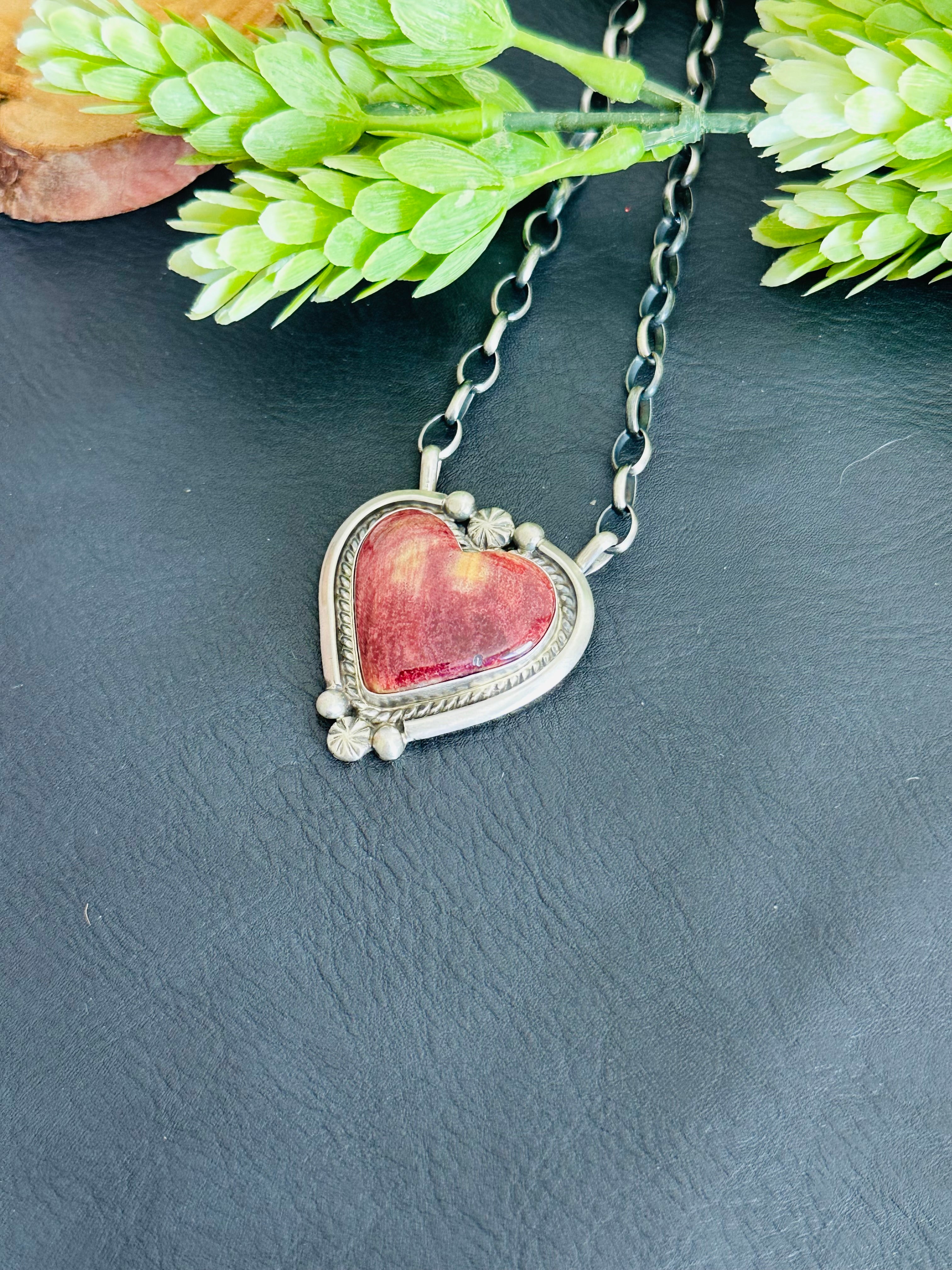 Beautiful Necklace. Alfred Martinez Purple Spiny Oyster & Sterling Silver Heart Necklace. It measures 19 inches long with hang while the chain measures 16 inches long. Signed by the artist and stamped sterling silver.