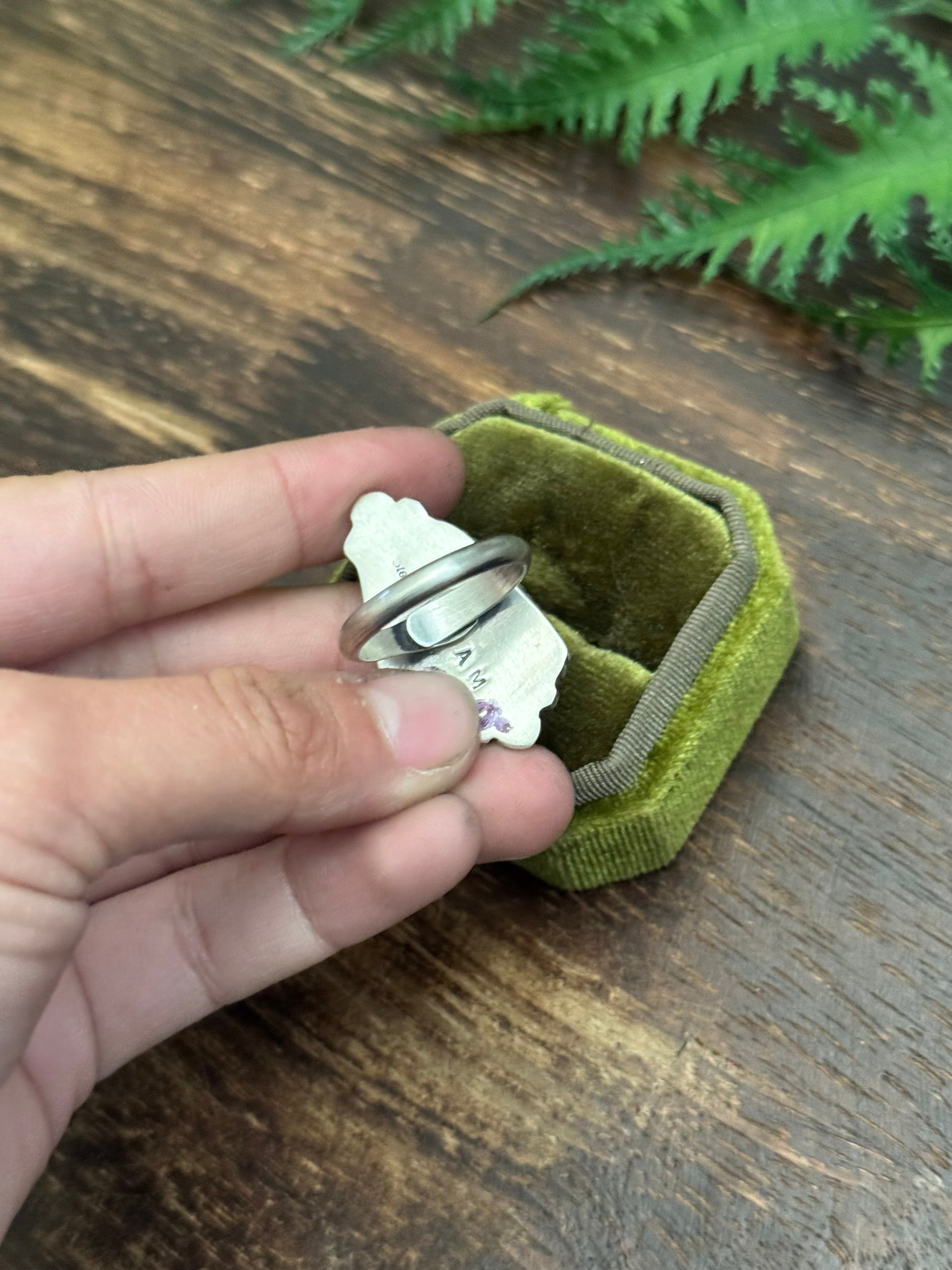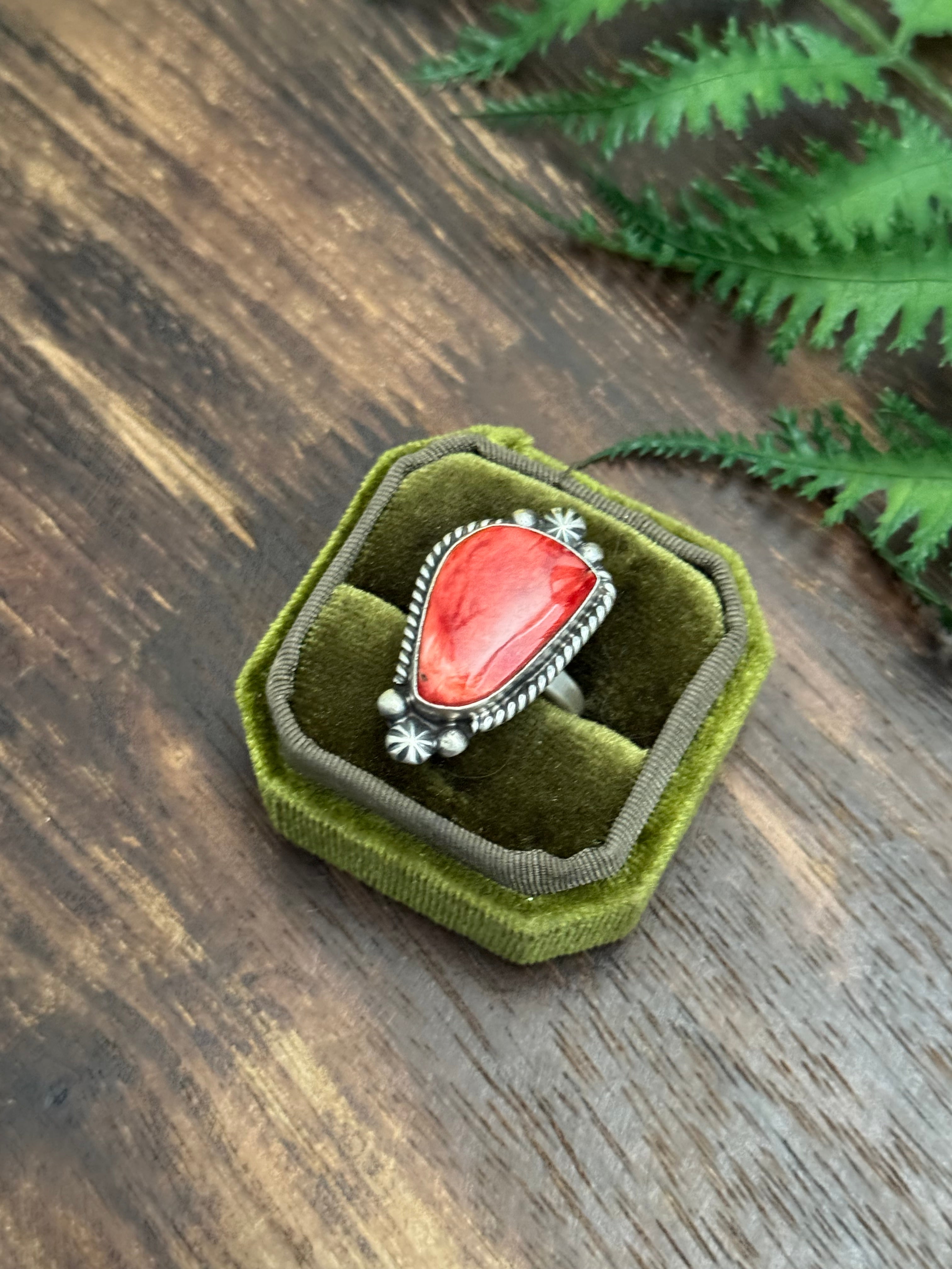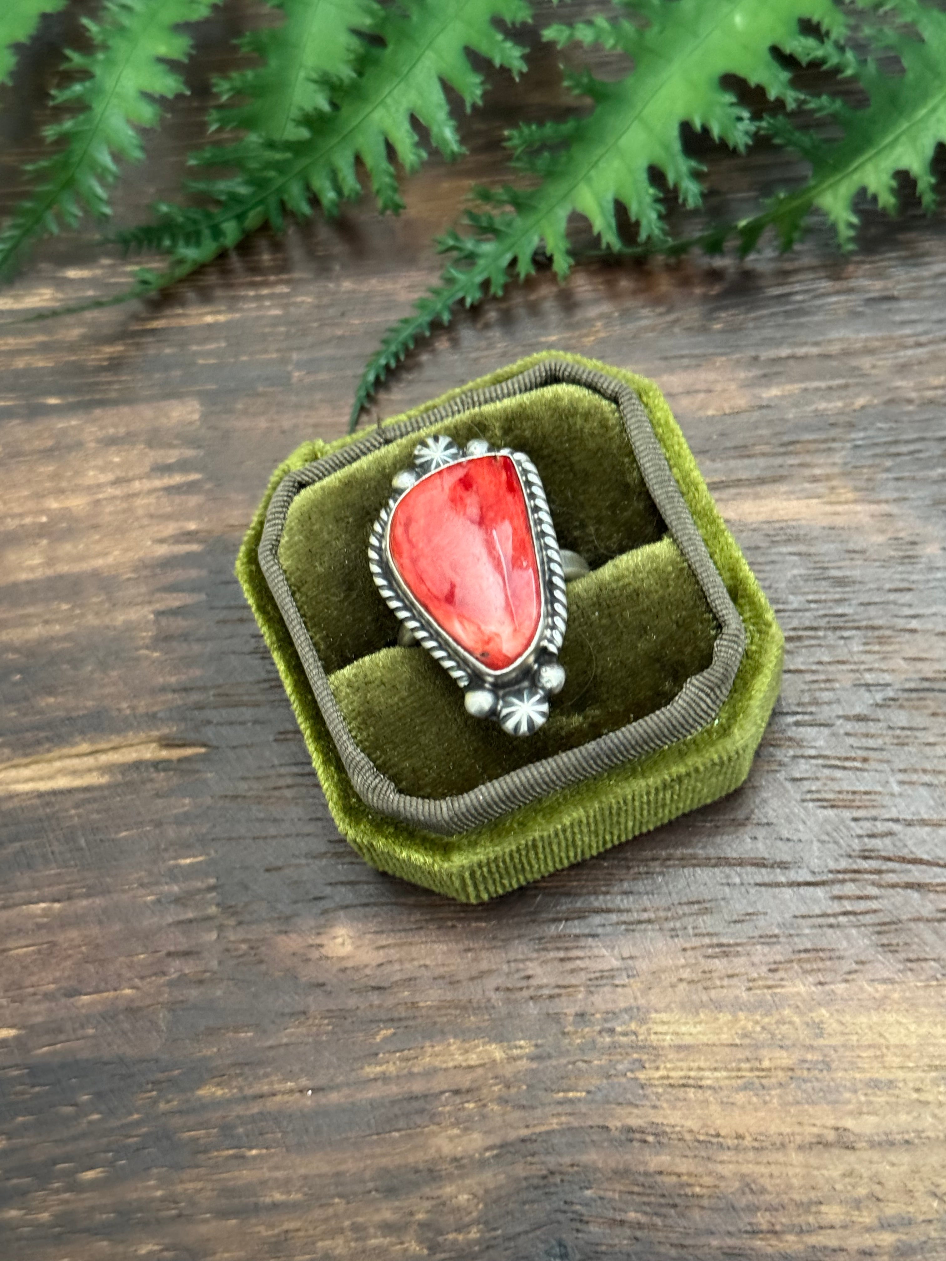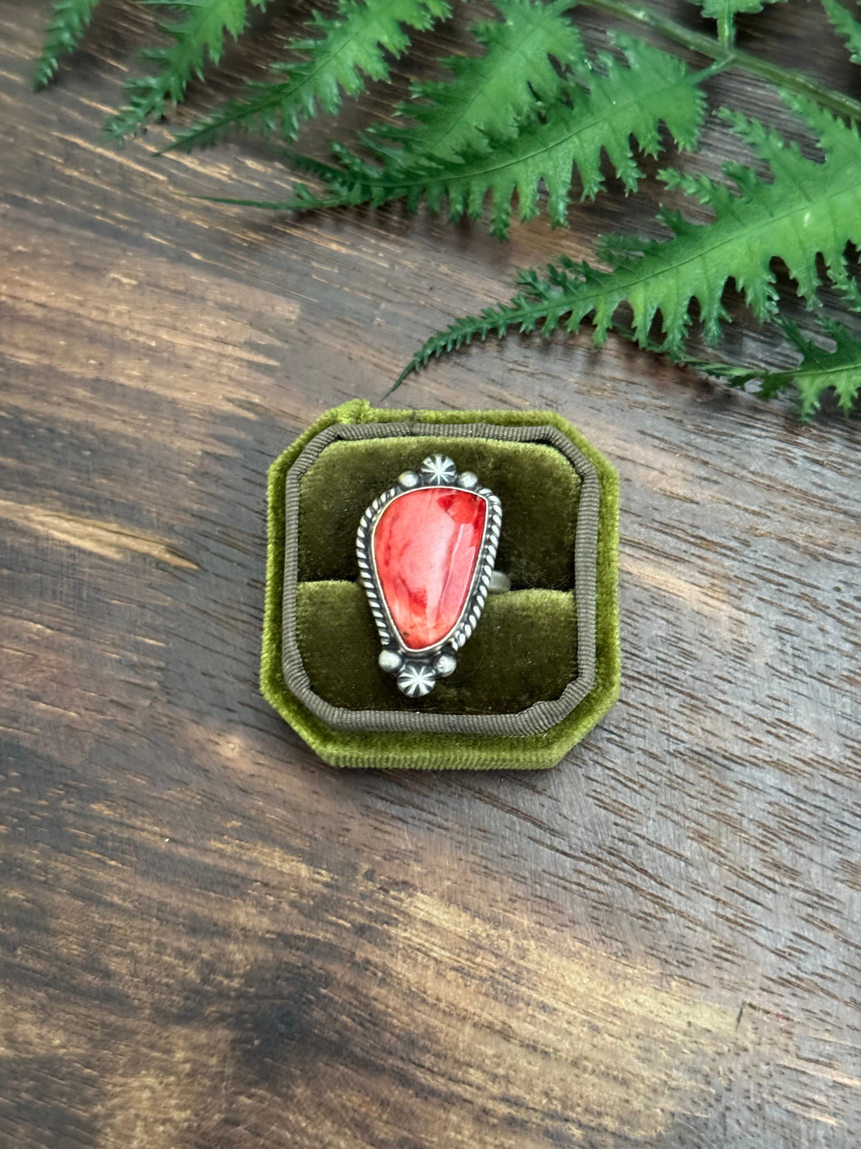 Alfred Martinez Red Spiny Oyster & Sterling Silver Adjustable Ring. It measures 1 3/8 inches long and just over 3/4 of an inch wide. Signed by the artist and stamped sterling silver.