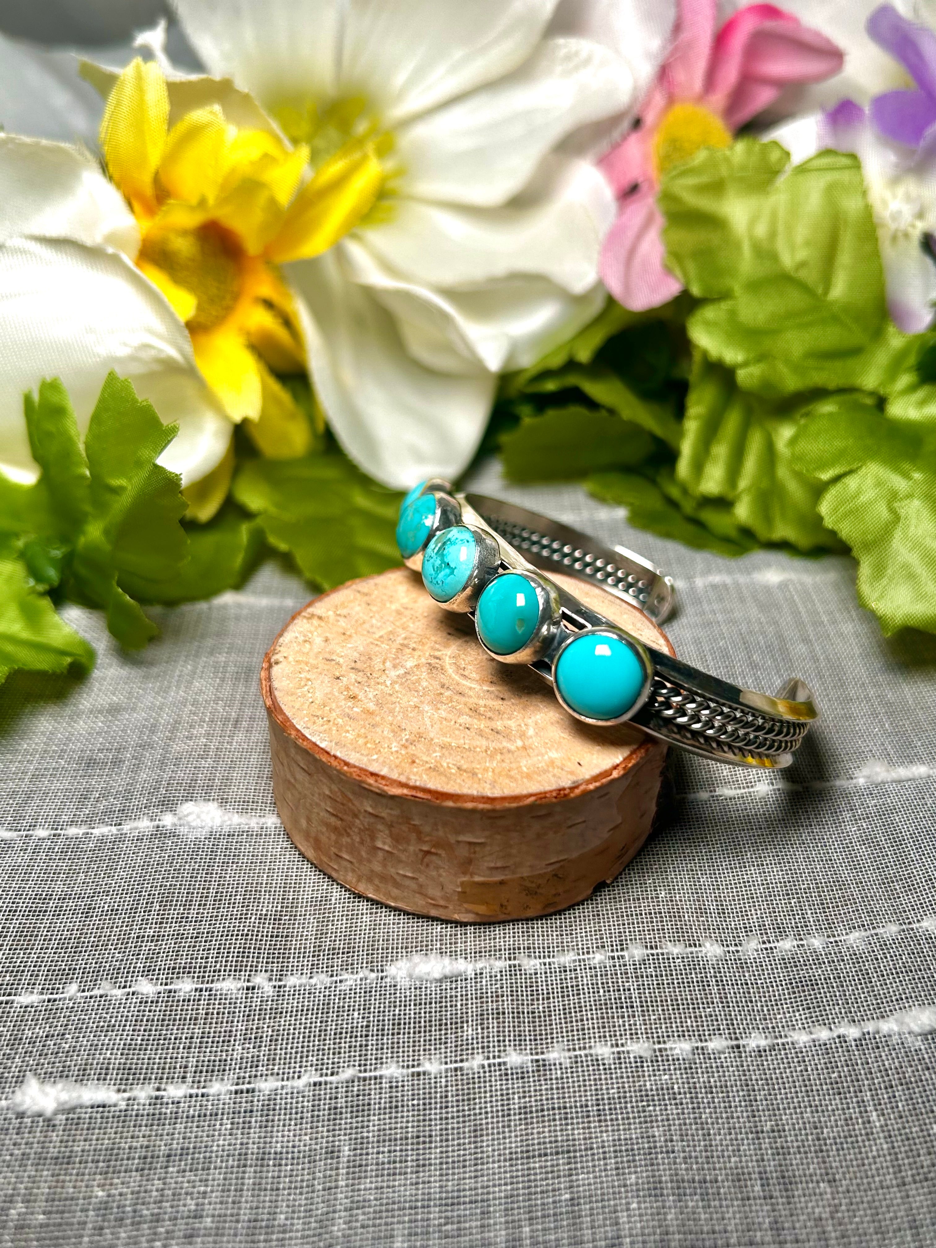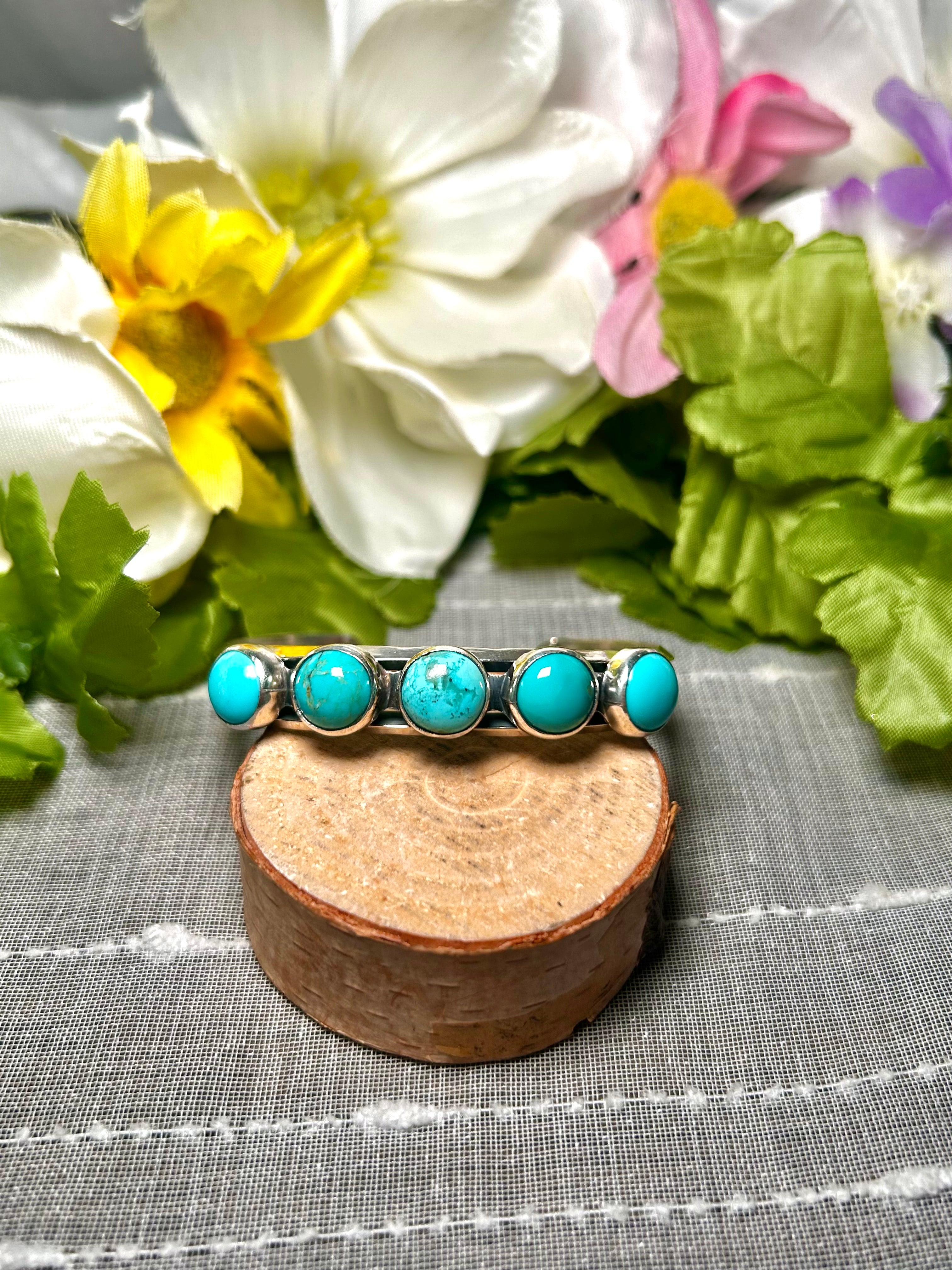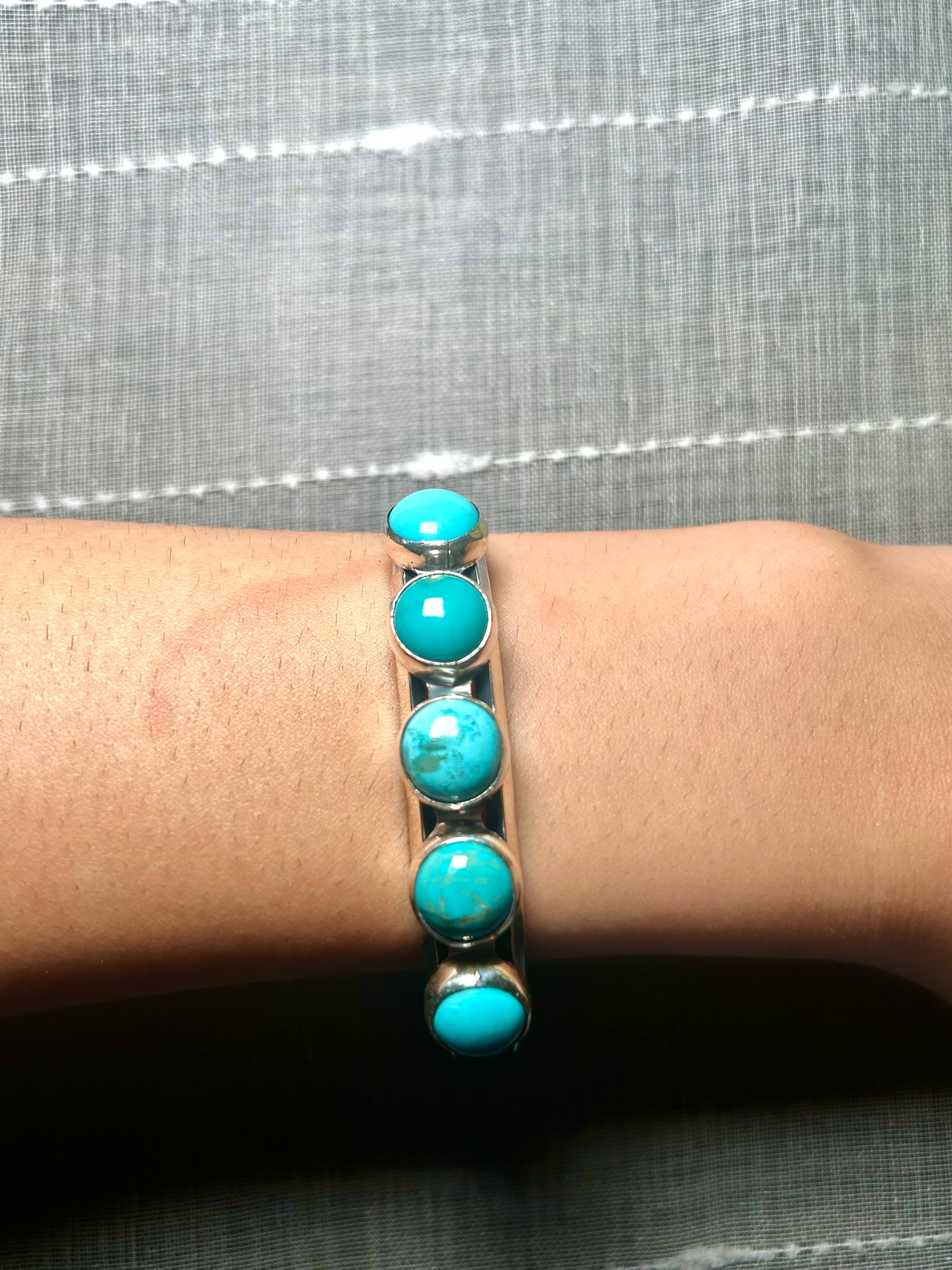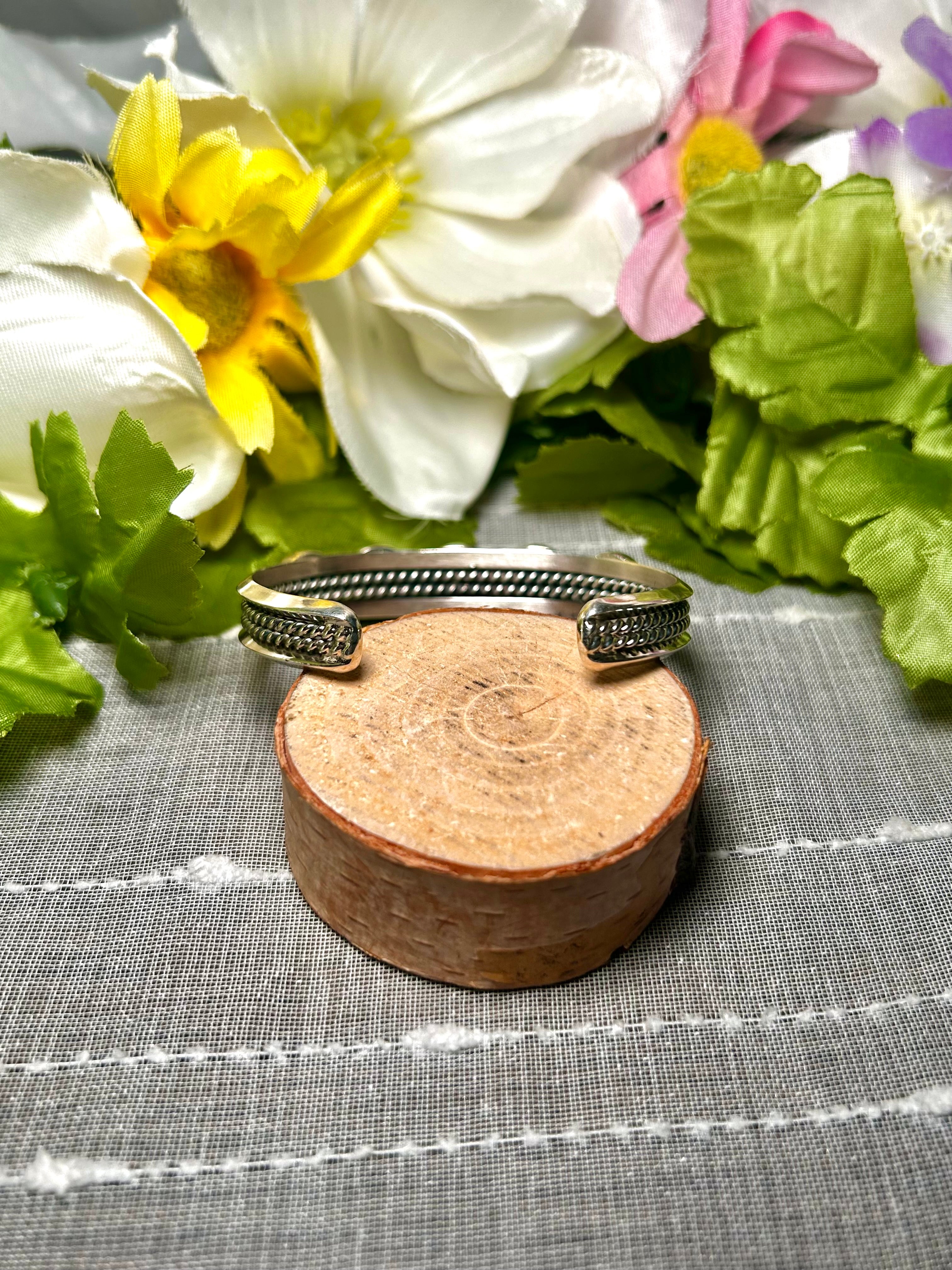 Duane Smith Red Skin Turquoise & Sterling Silver Cuff Bracelet. It measures 3/8 of an inch wide with an inside circumference of 5 3/8 inches and a gap of 1 inch. Signed by the artist and stamped sterling silver.