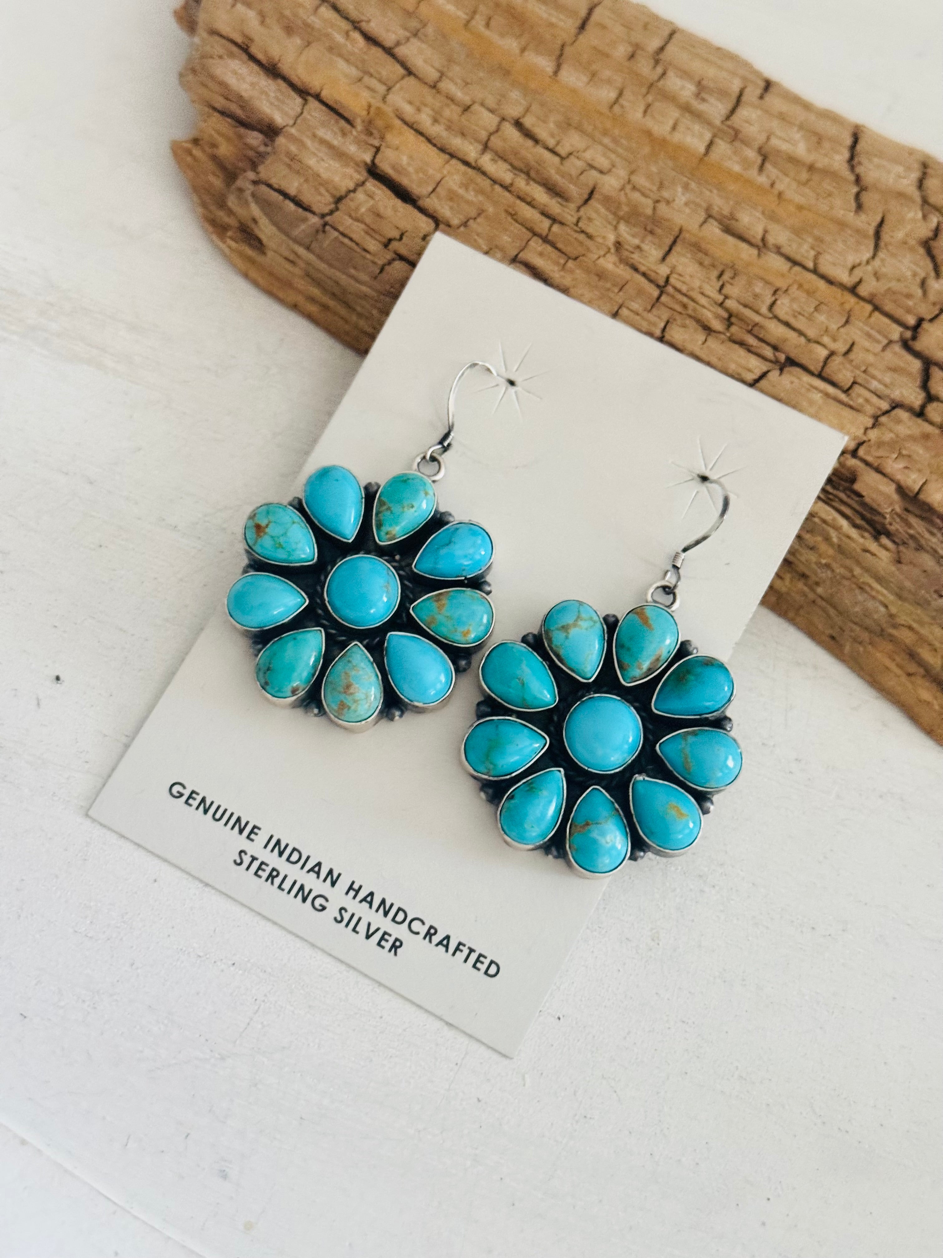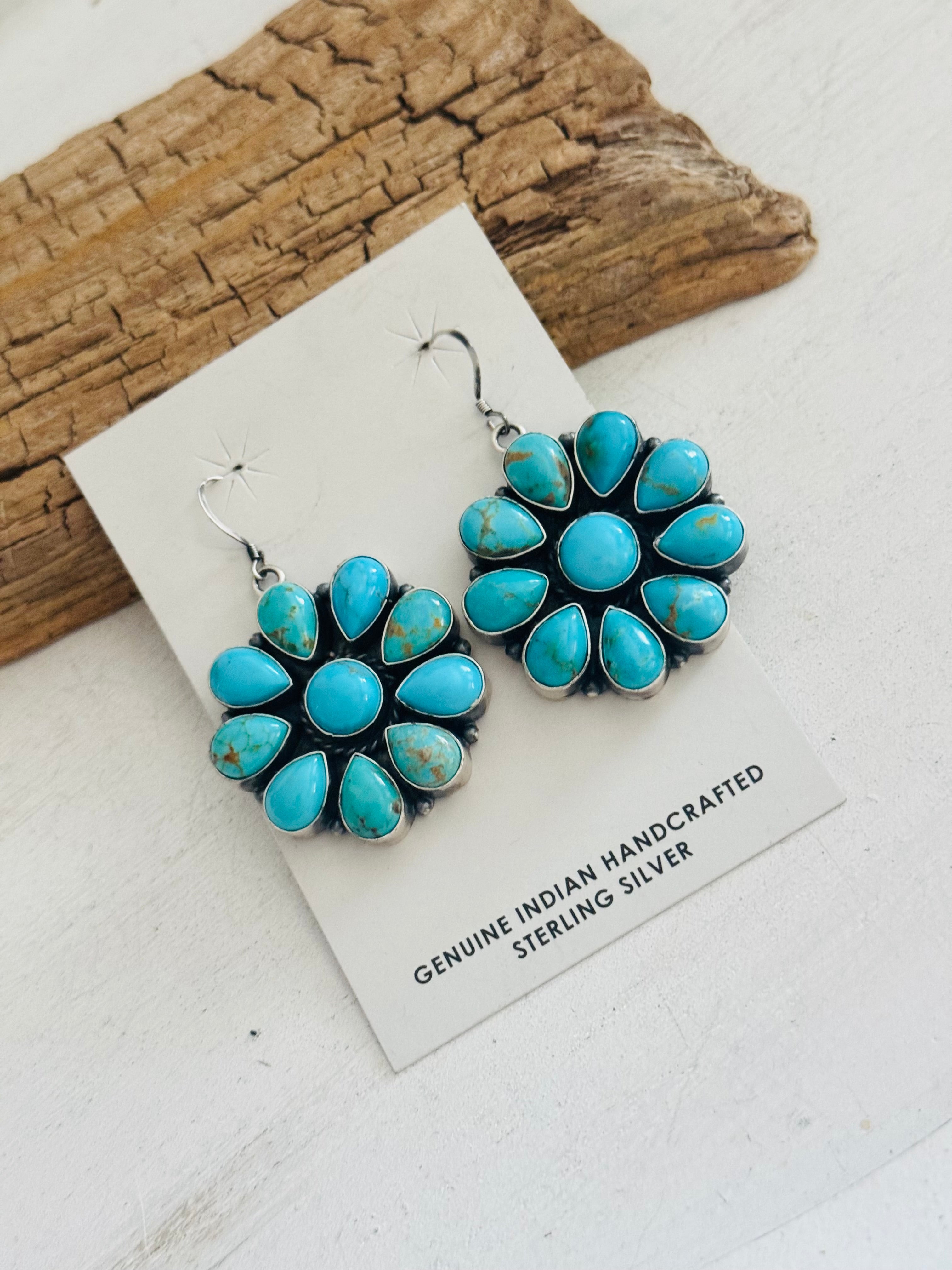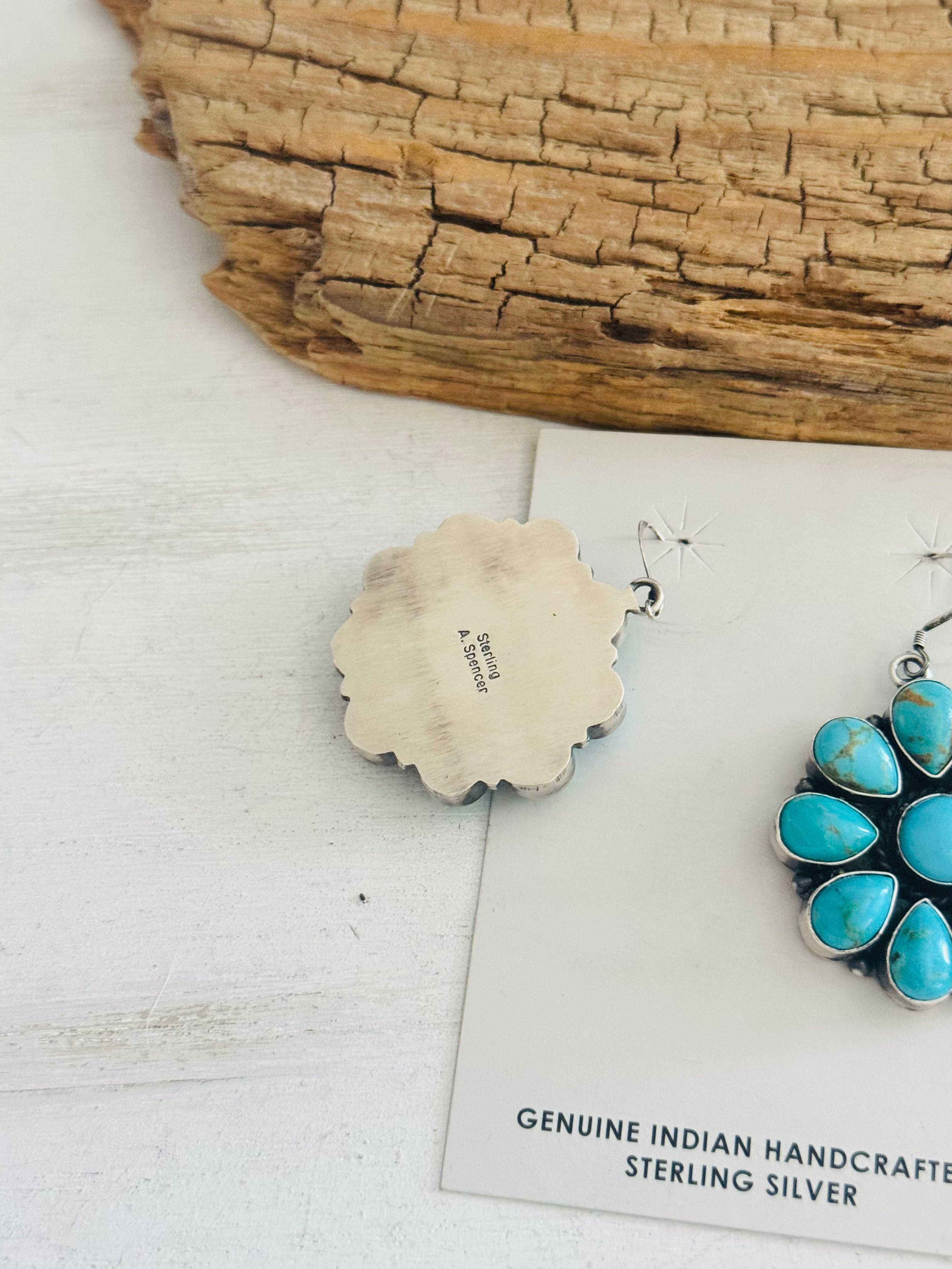 Annie Spencer Kingman Turquoise & Sterling Silver Cluster Dangle Earrings. They measure 2 1/4 inches long and 1 3/8 inches wide. Signed by the artist and stamped sterling silver.