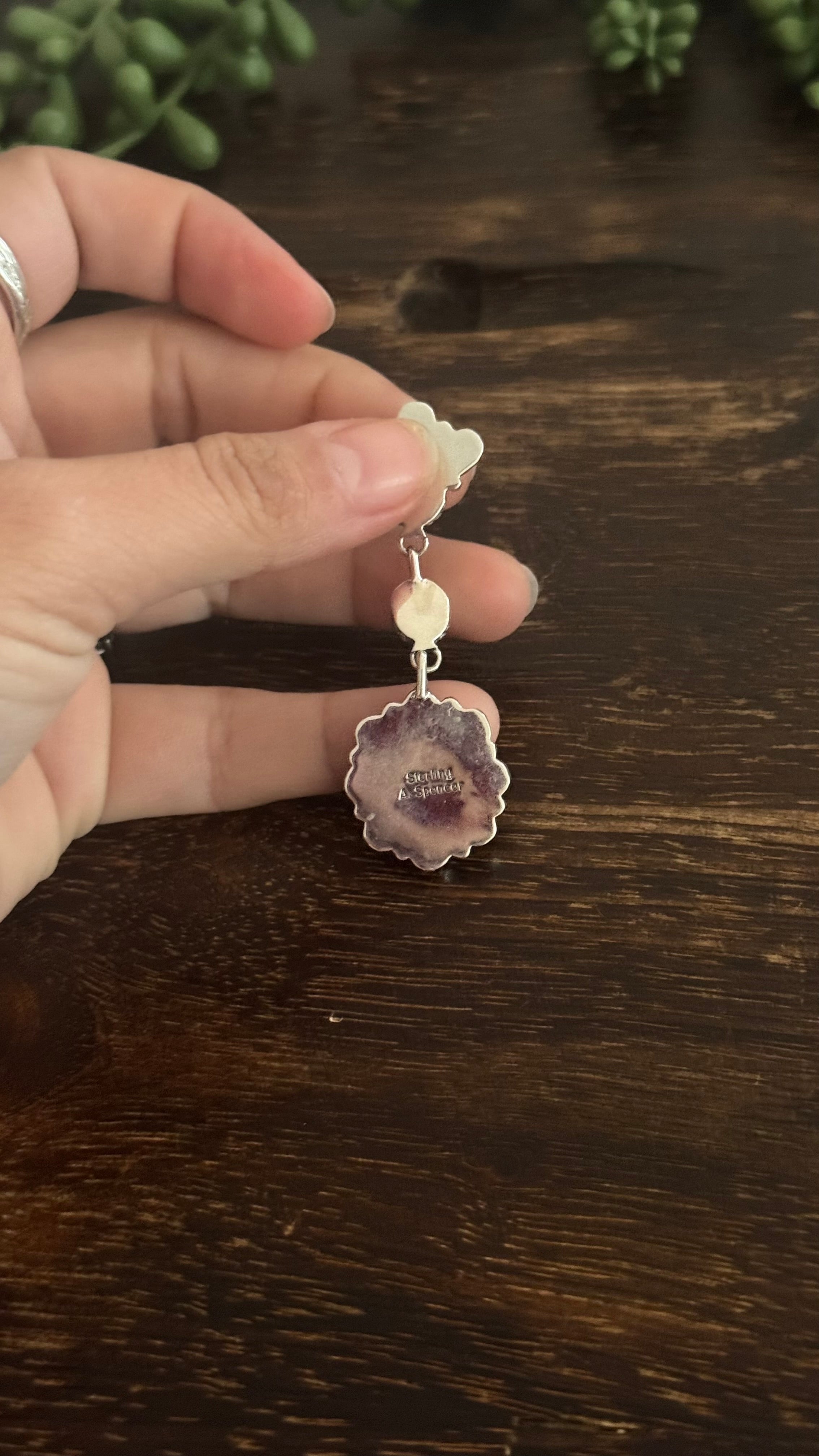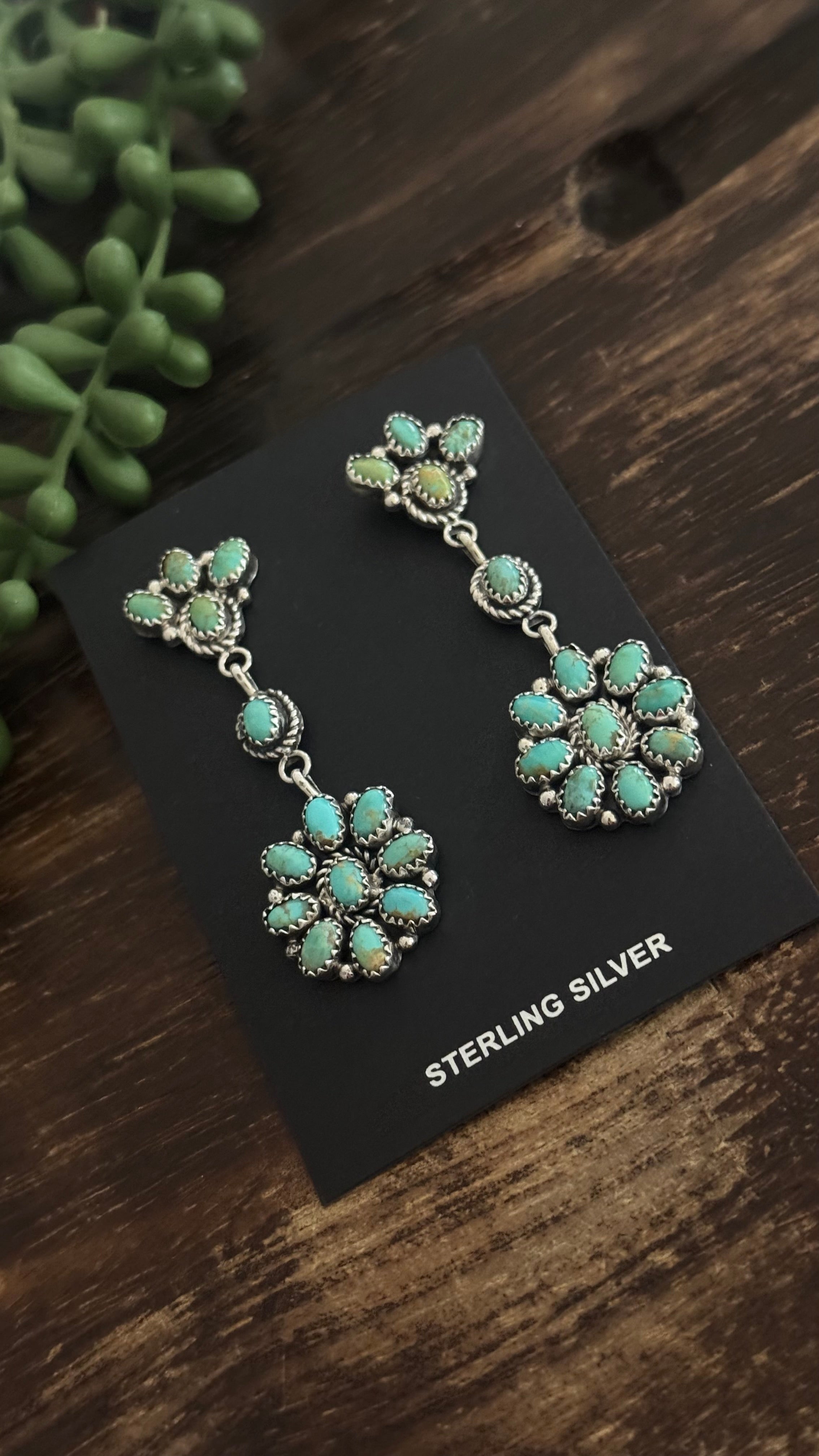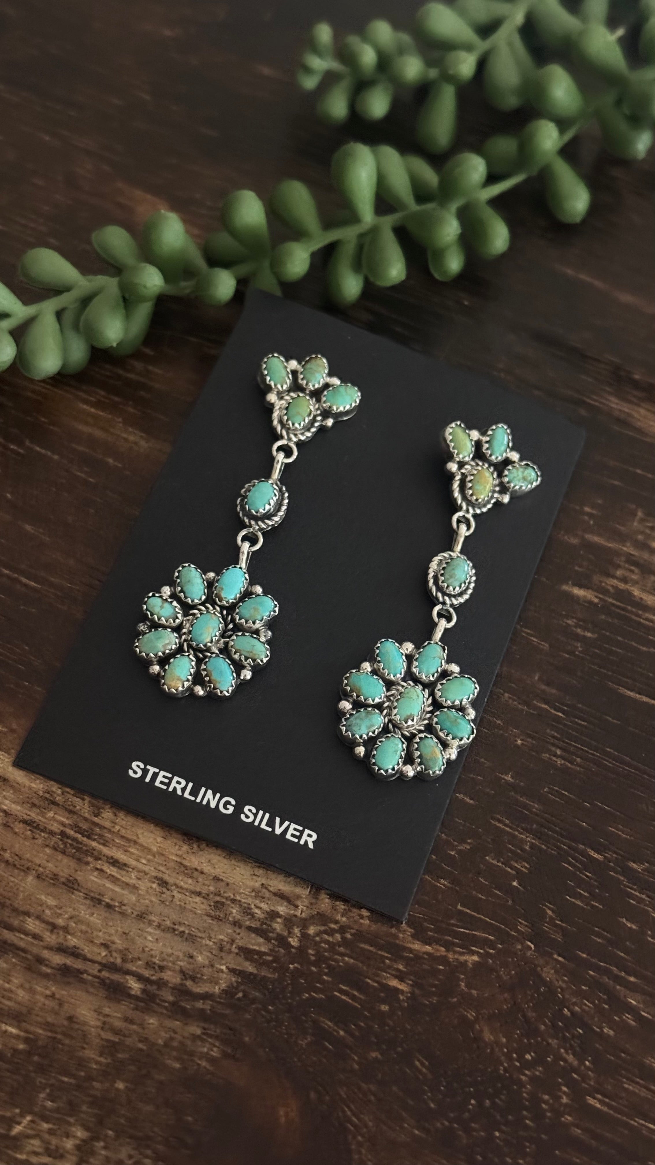 Annie Spencer Kingman Turquoise & Sterling Silver Cluster Post Dangle Earrings . They measure 2 1/2 inches long and just over 3/4 of an inch wide. Signed by the artist and stamped sterling silver.