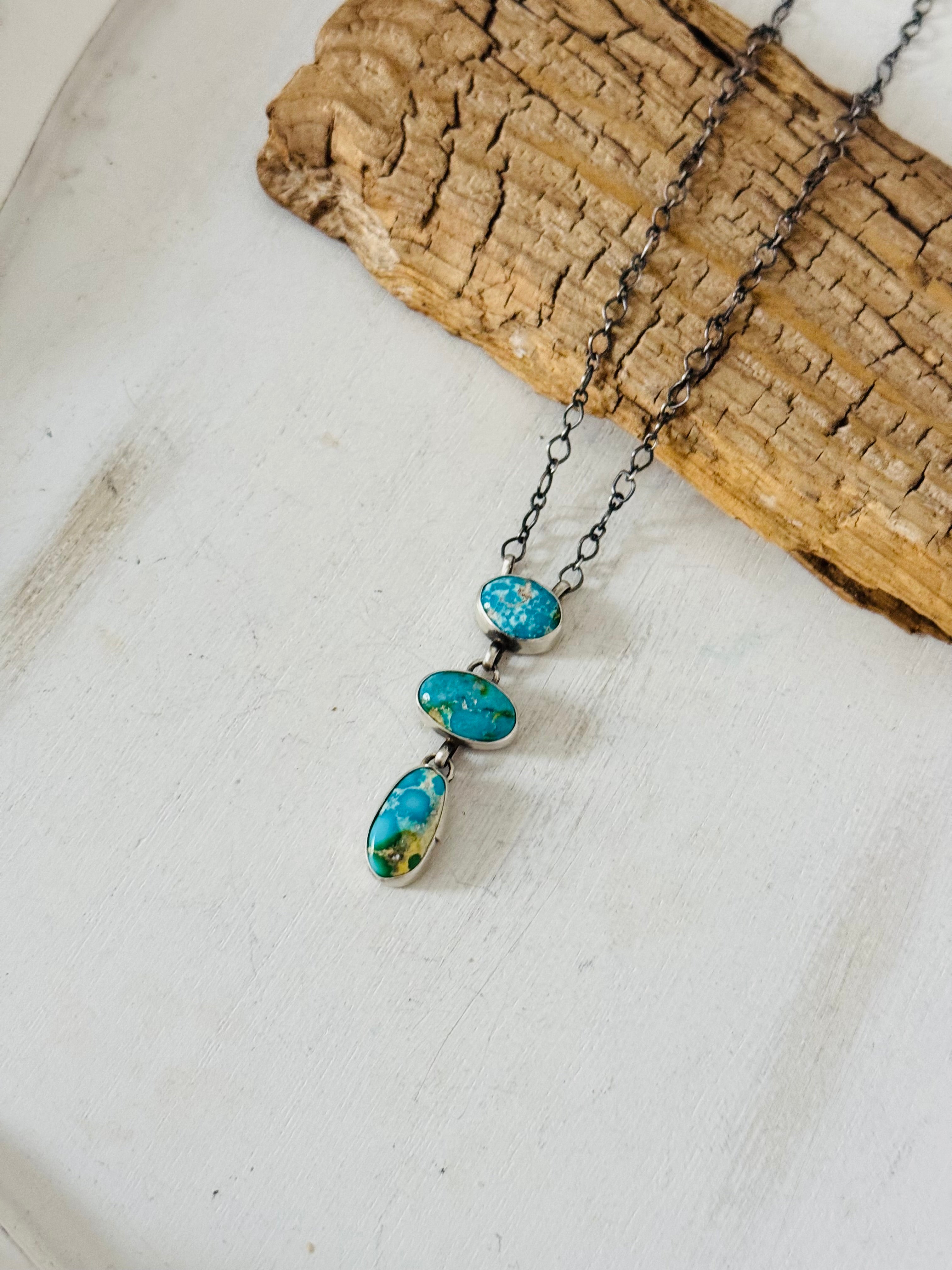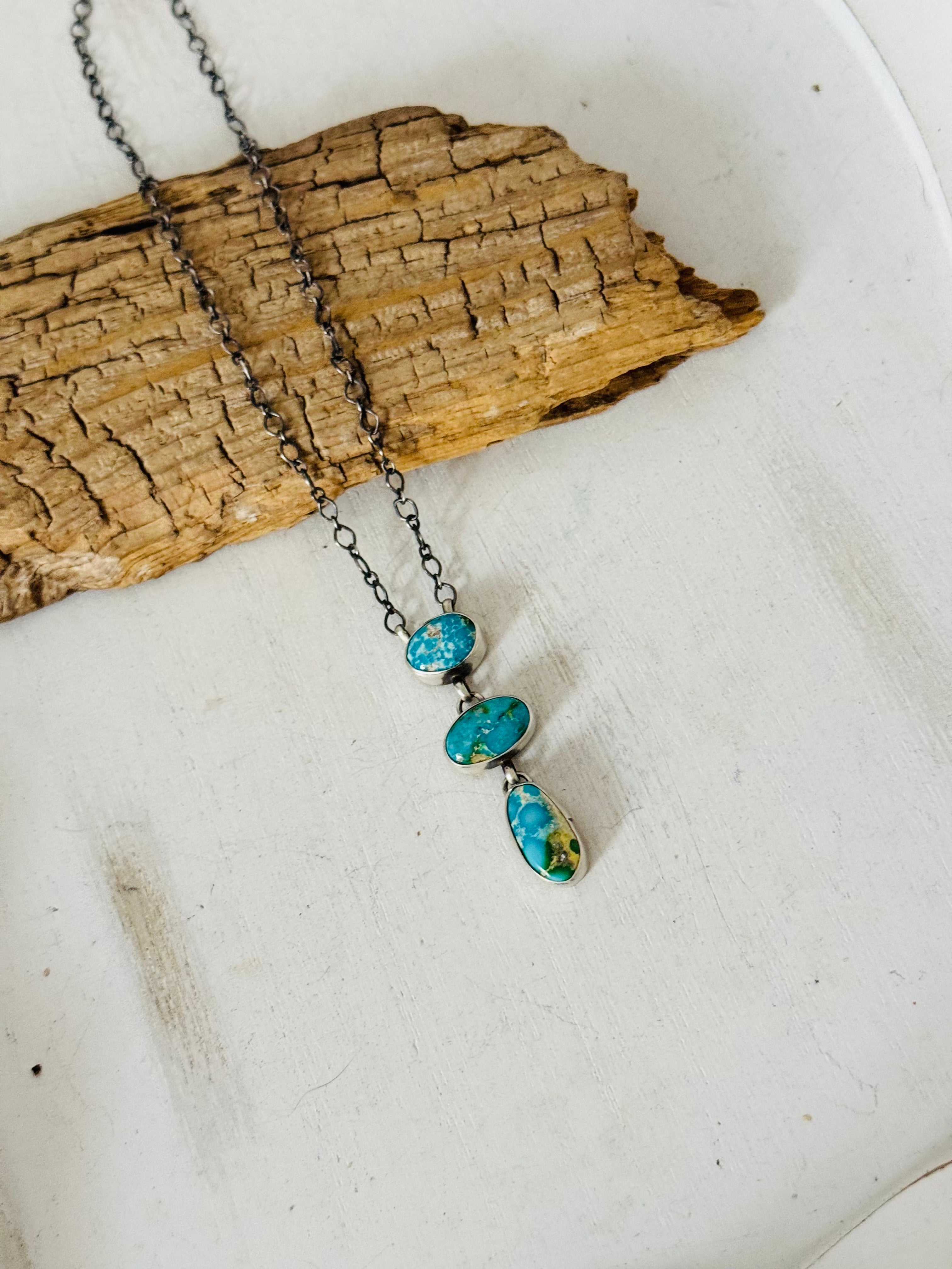 Antionette Martinez Sonoran Mountain Turquoise & Sterling Silver Lariat Necklace. It measures 23 inches long with hang while the chain measures 18 inches long. Signed by the artist and stamped sterling silver.