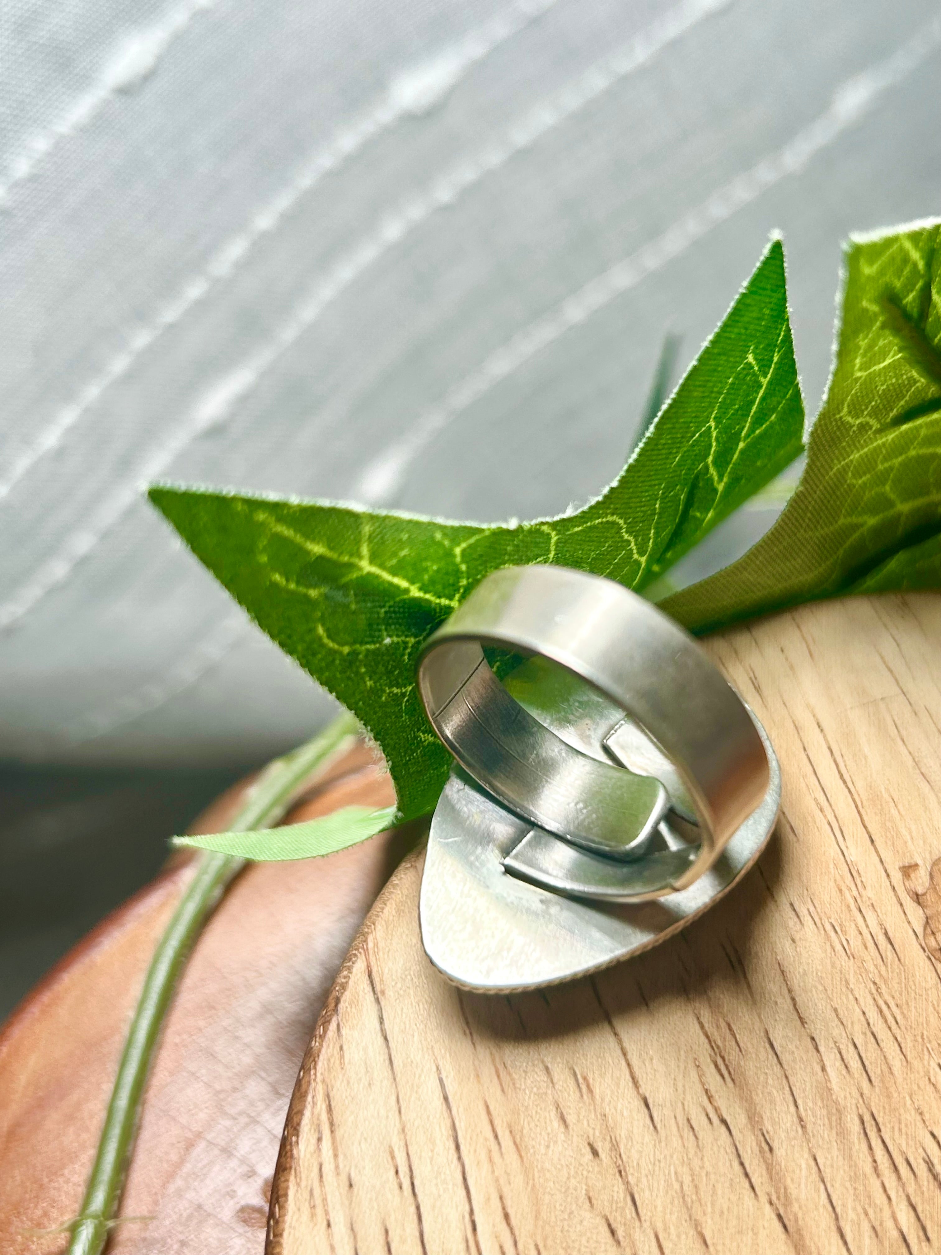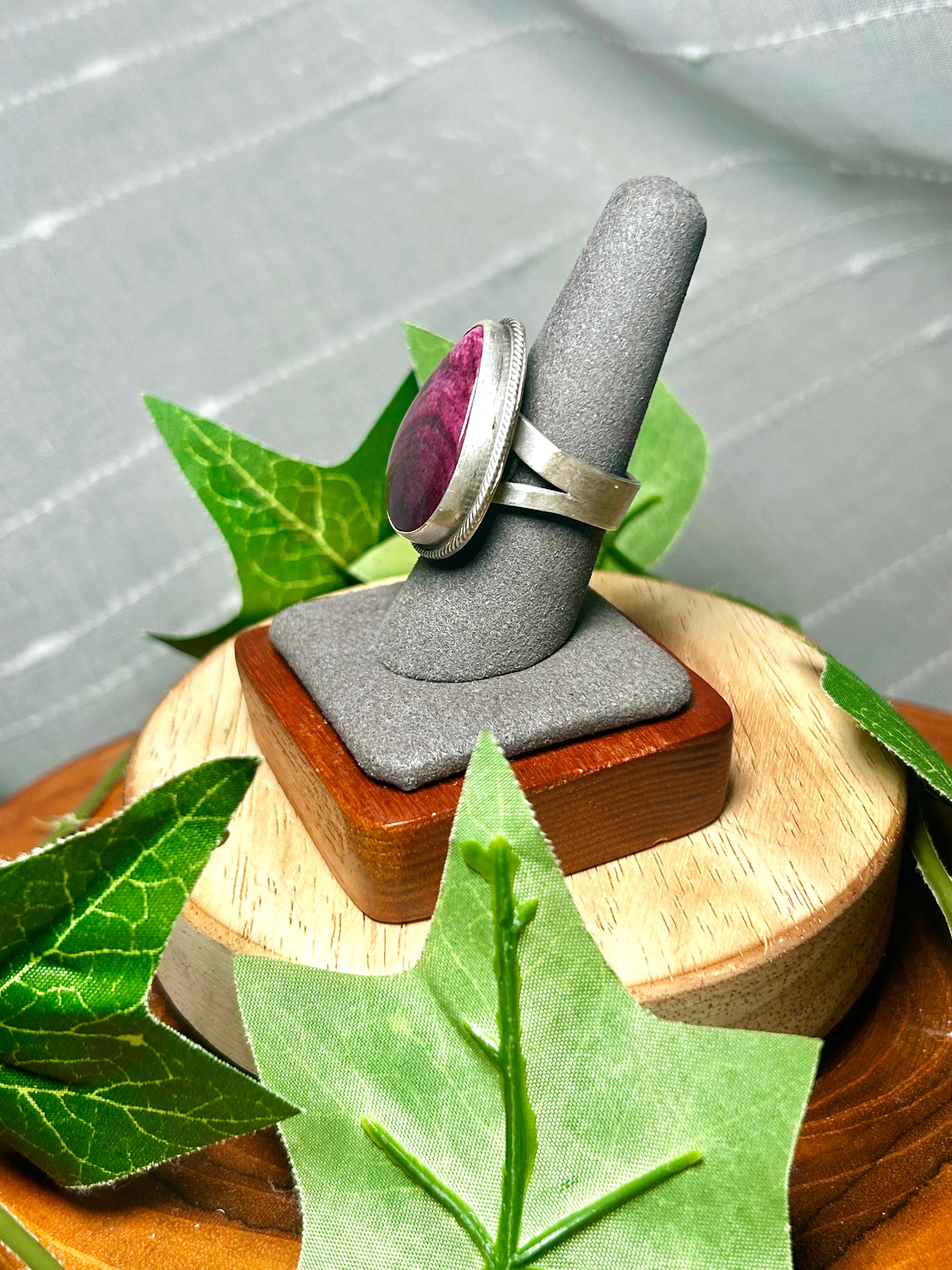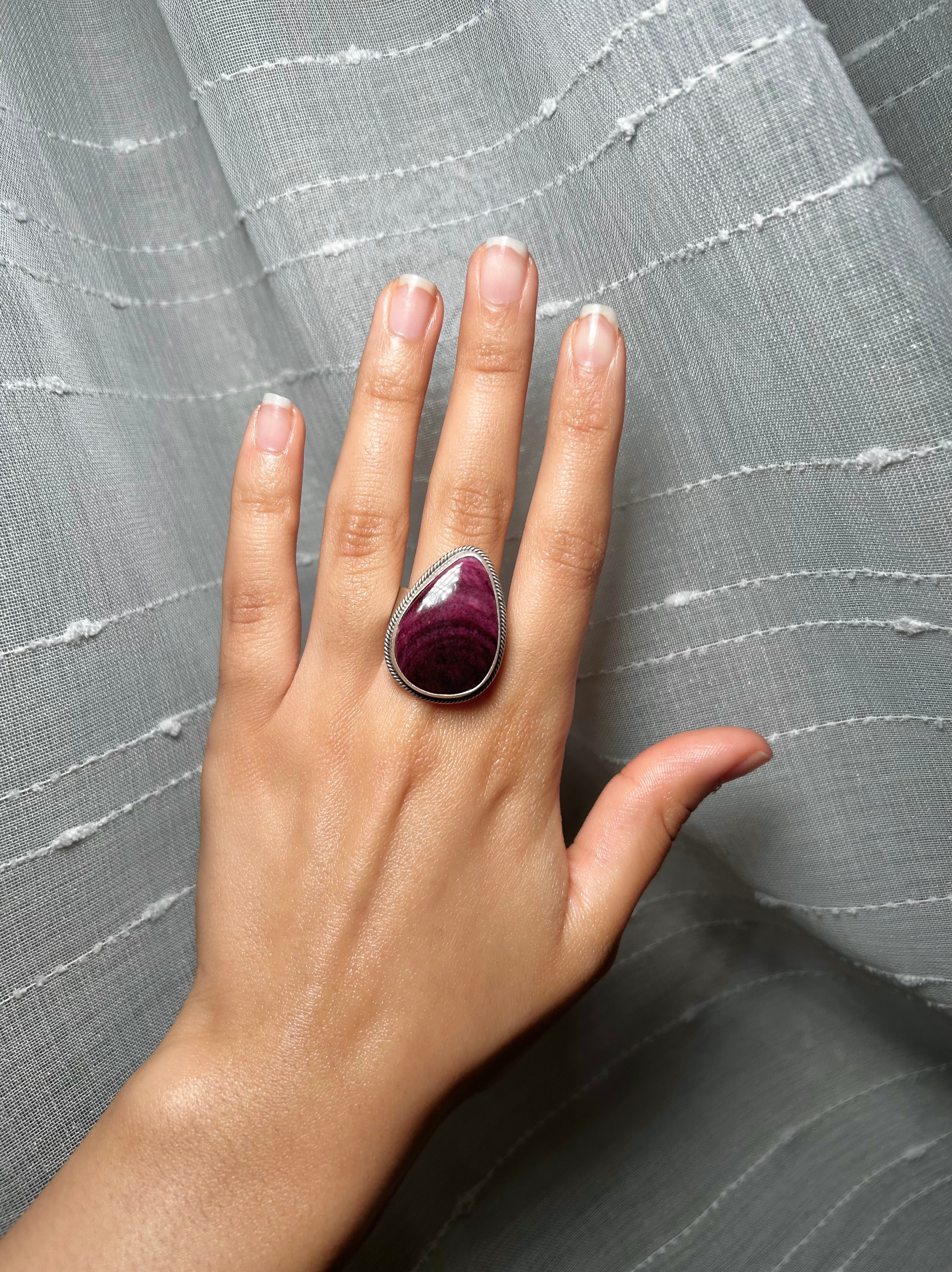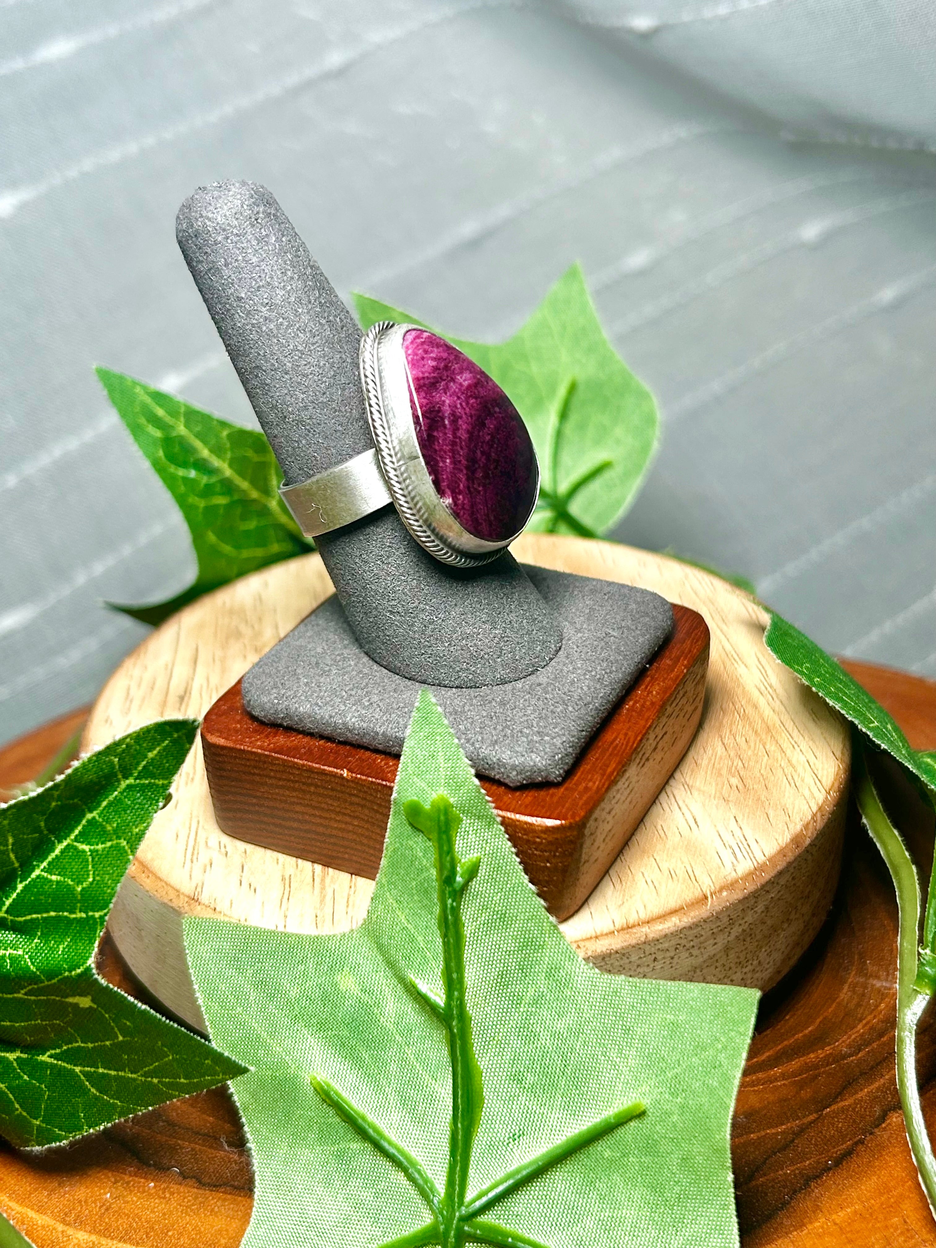 Antionette Martinez Purple Spiny Oyster & Sterling Silver Adjustable Ring. It measures 1 1/8 inches long and 7/8 of an inch wide. Signed by the artist and stamped sterling silver.