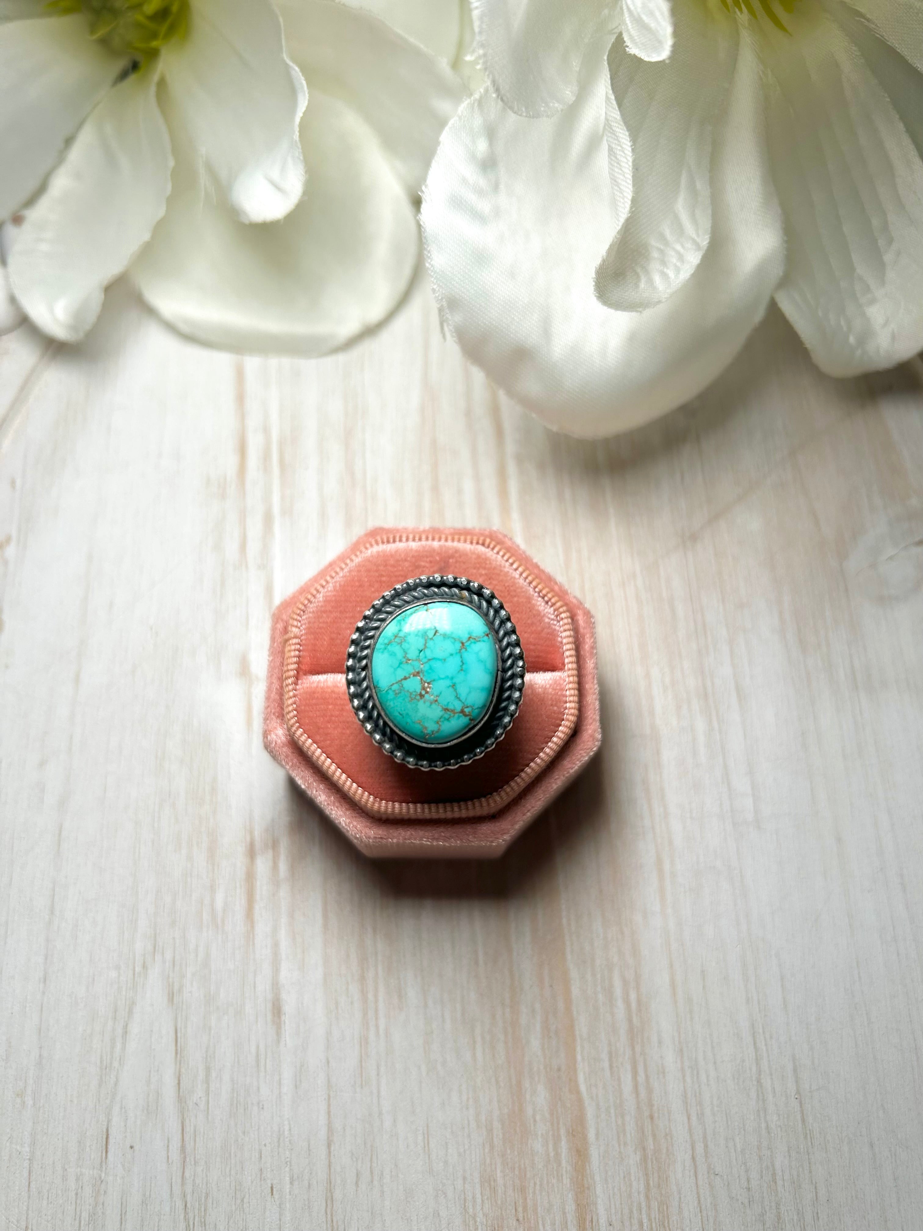 Antionette Martinez Royston Turquoise & Sterling Silver Ring Size 8.75. It measures 1 inch long and 1 inch wide. Signed by the artist and stamped sterling silver.
