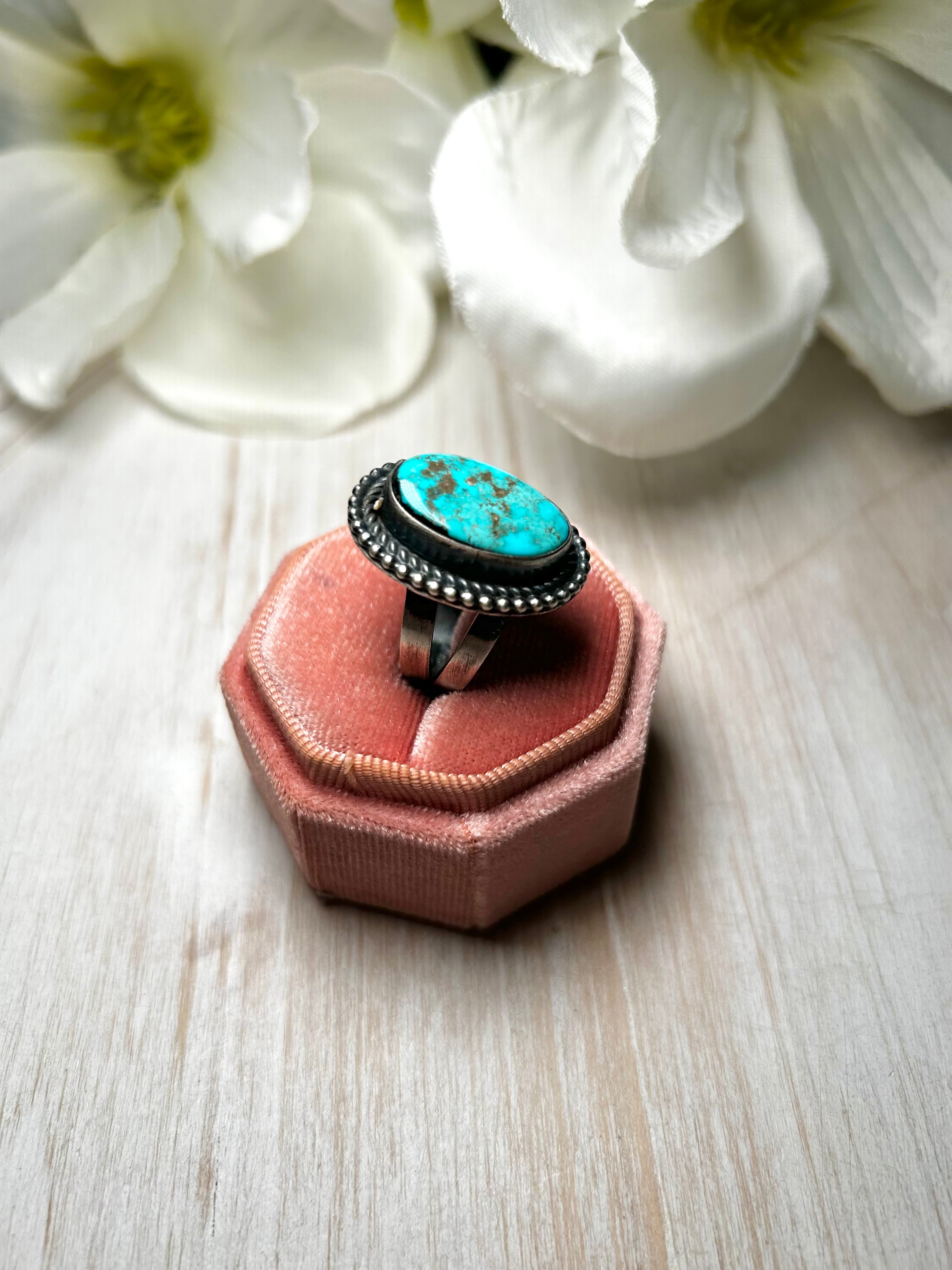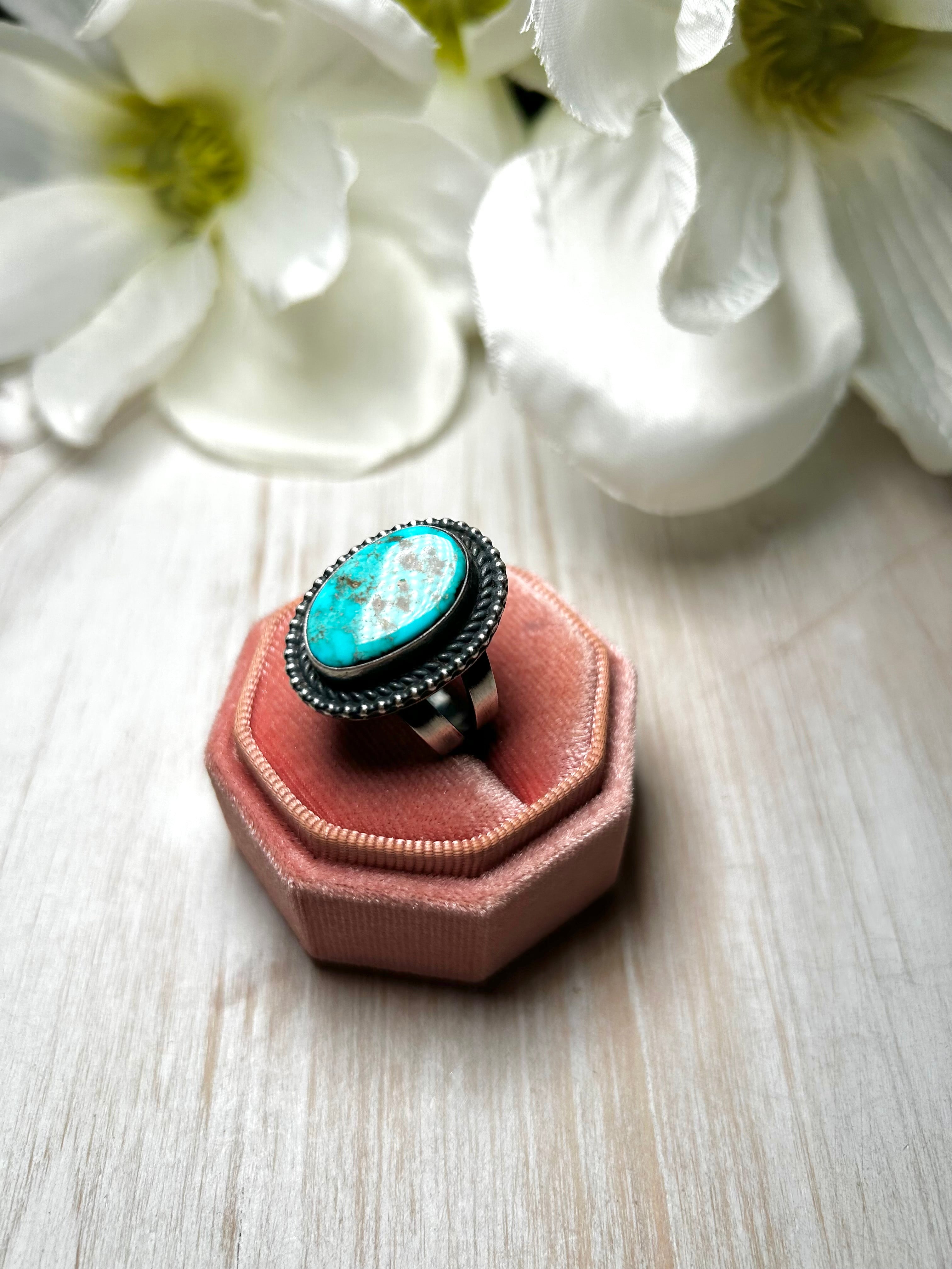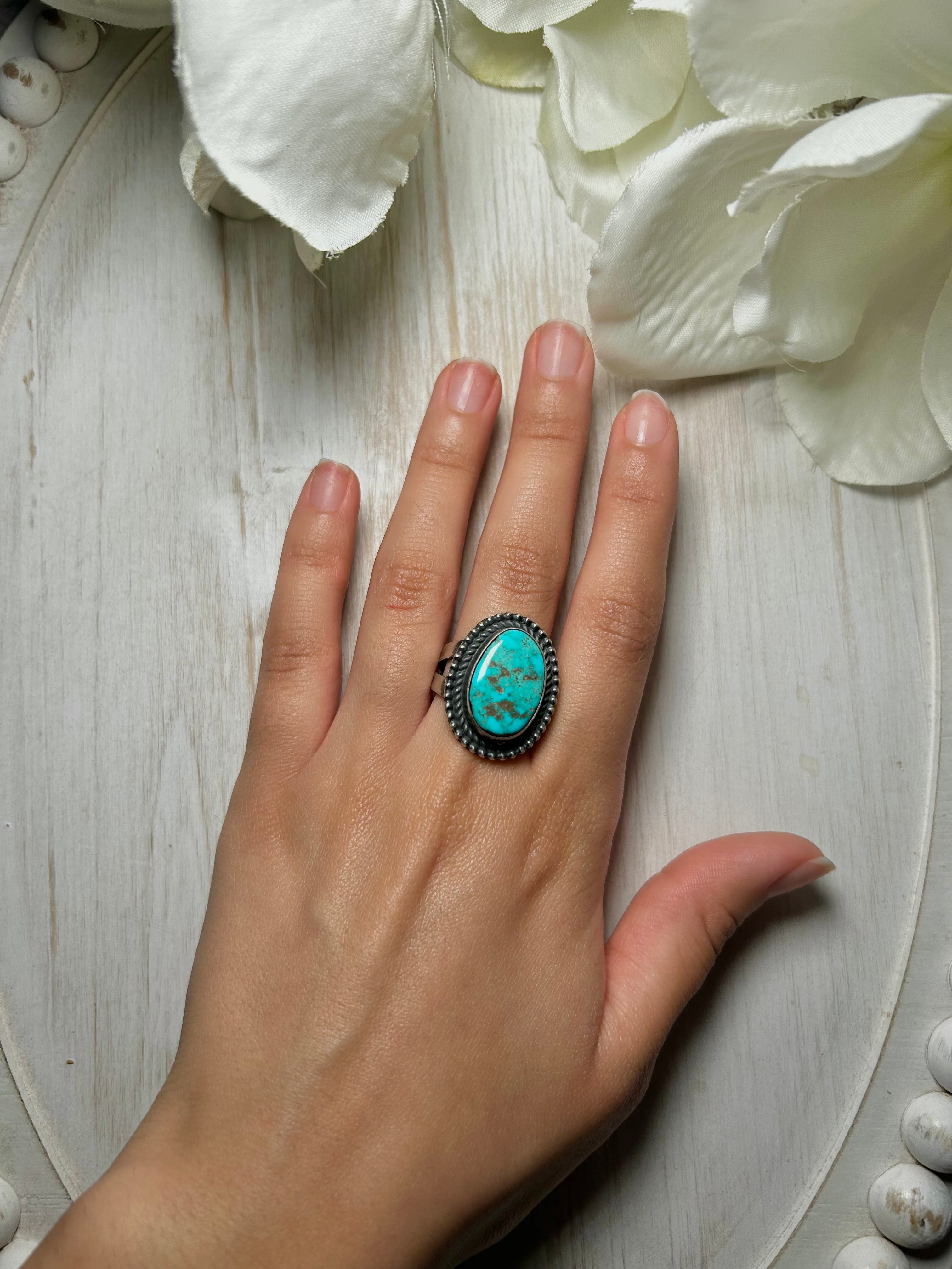 Antionette Martinez Royston Turquoise & Sterling Silver Ring Size 8. It measures 1 inch long and 3/4 of an inch wide. Signed by the artist and stamped sterling silver.