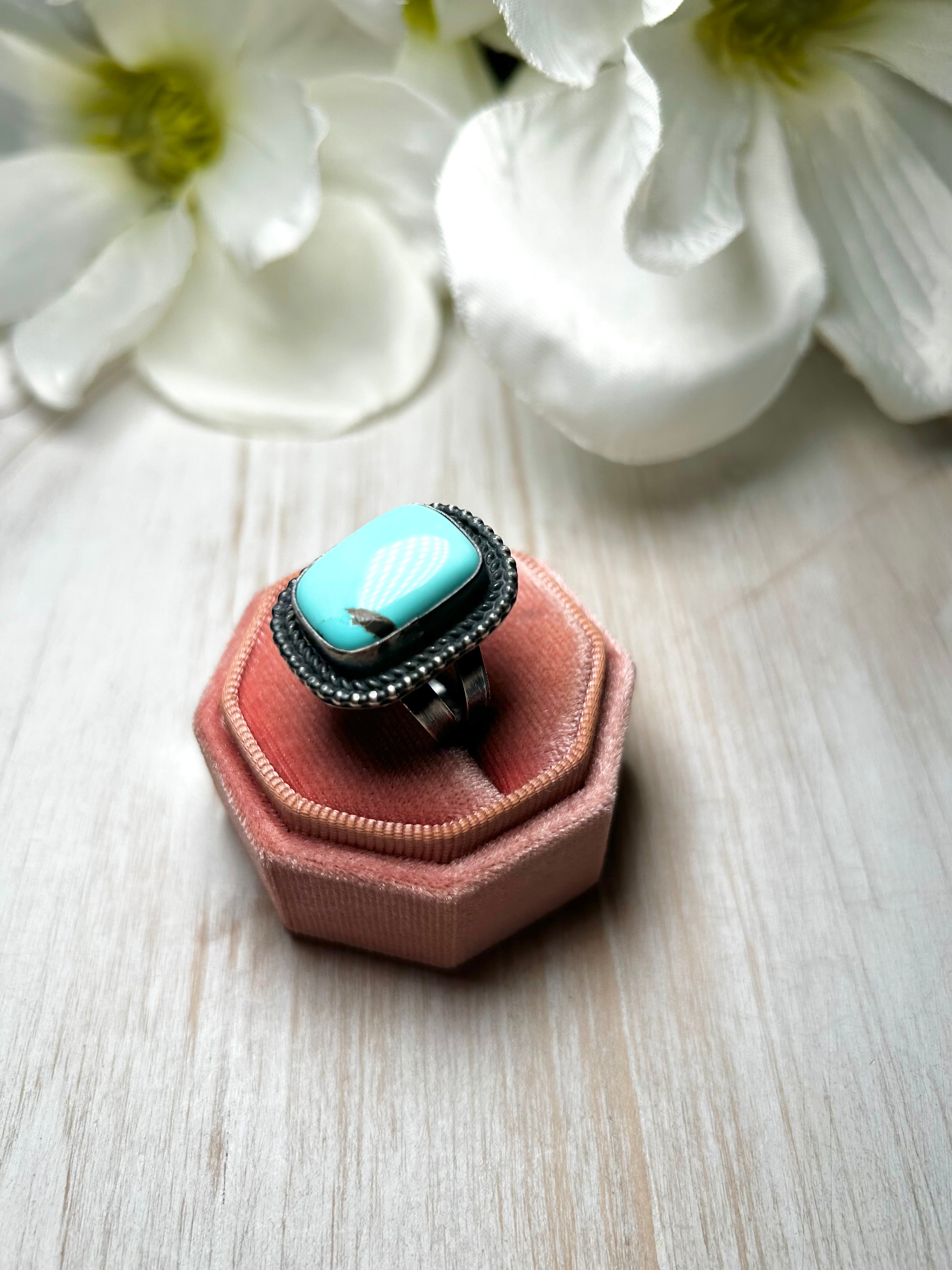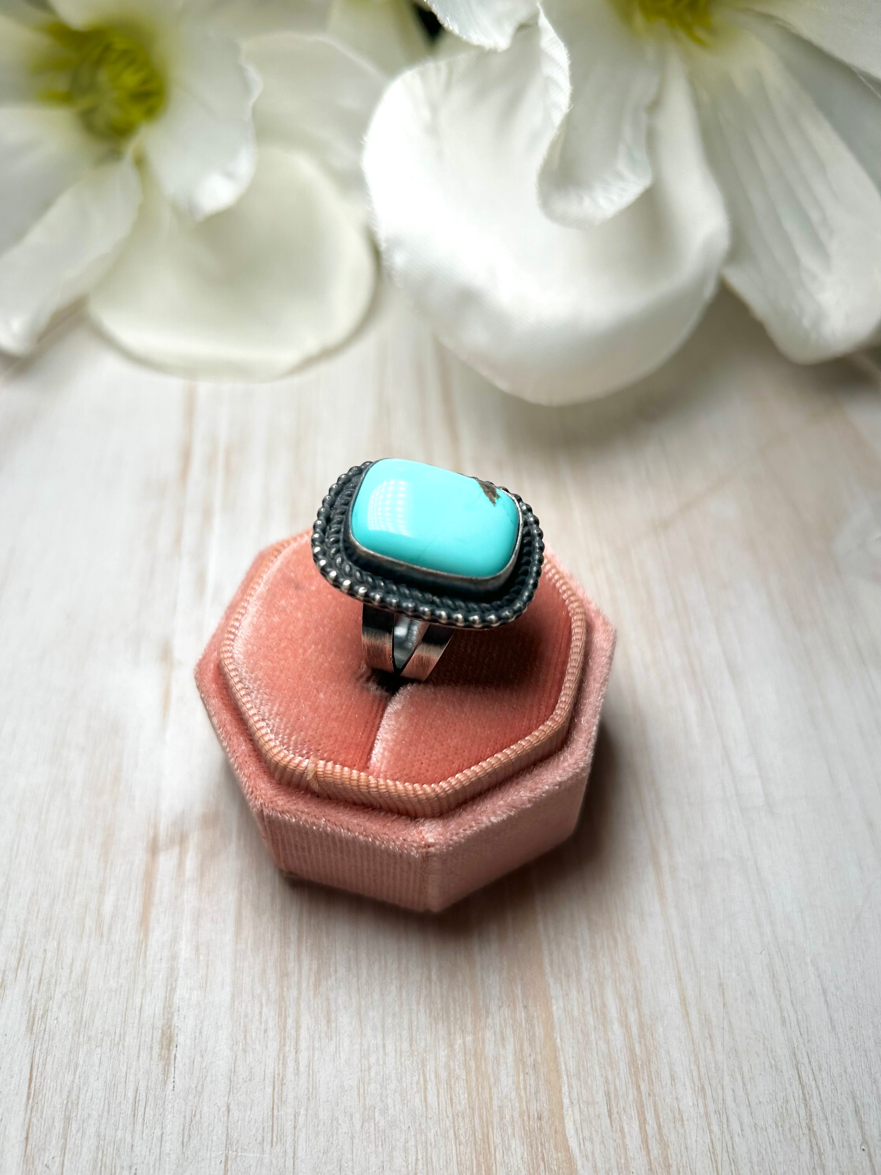 Antionette Martinez Royston Turquoise & Sterling Silver Ring Size 7.5. It measures 1 inch long and 3/4 of an inch wide. Signed by the artist and stamped sterling silver.