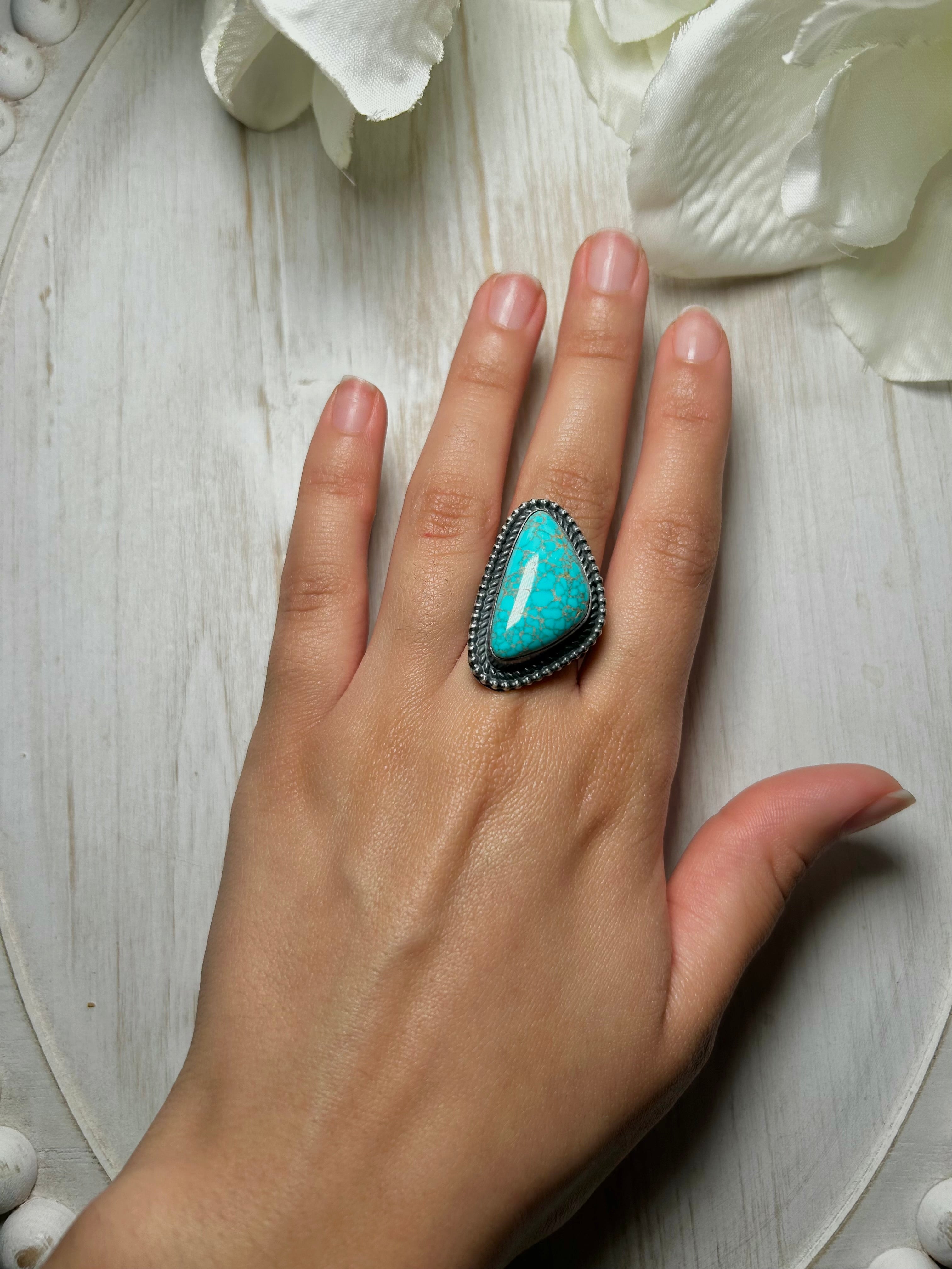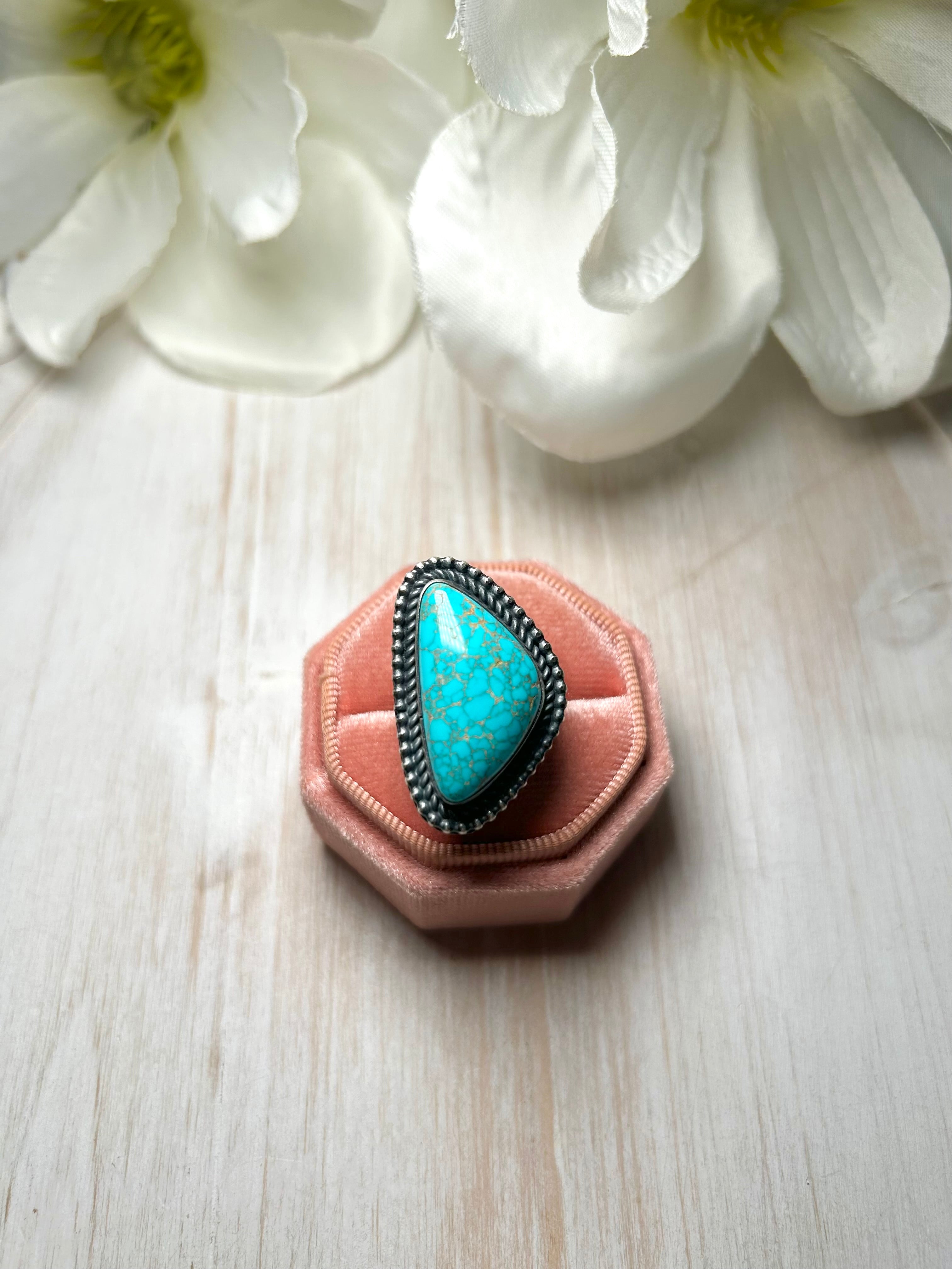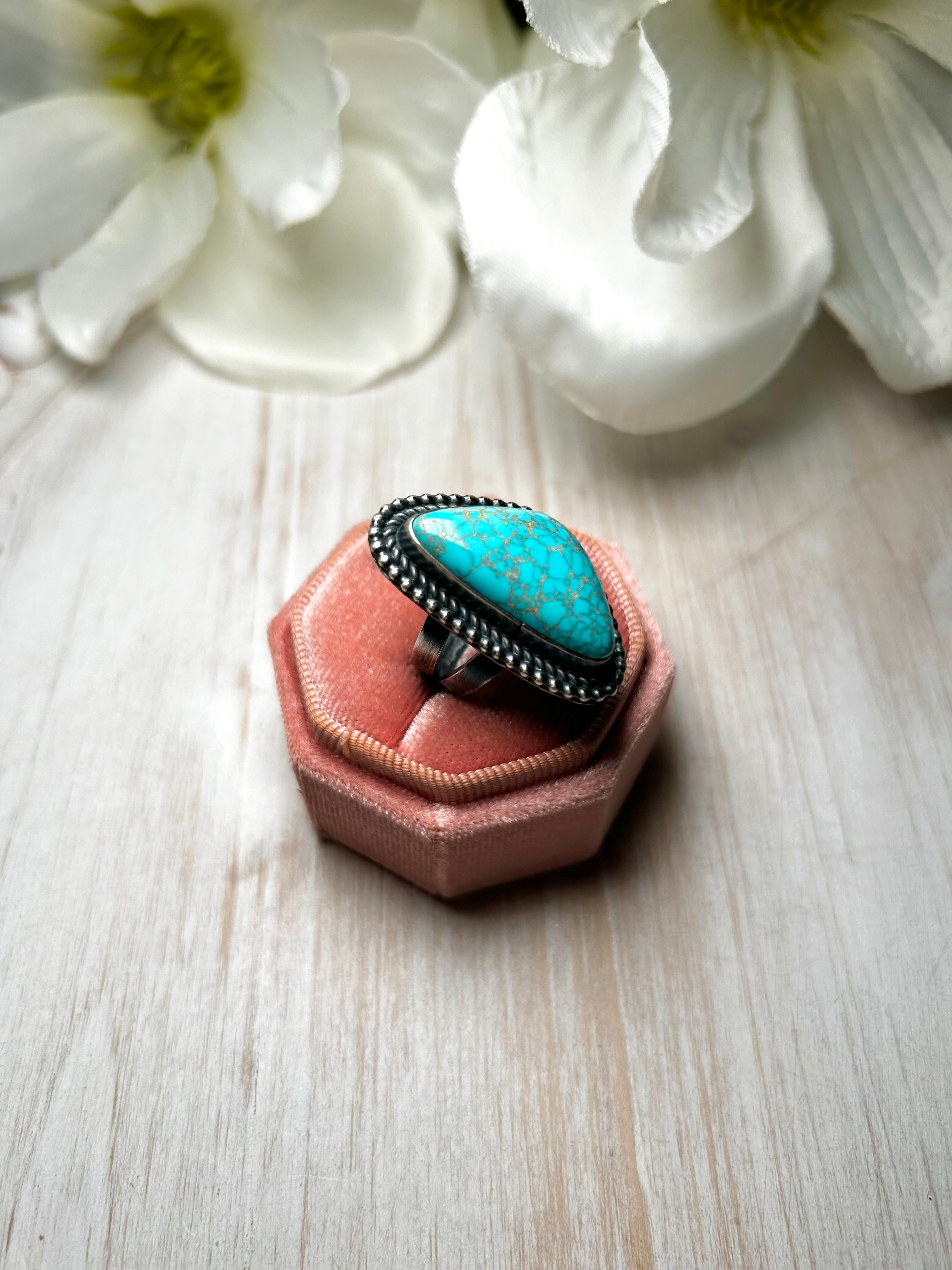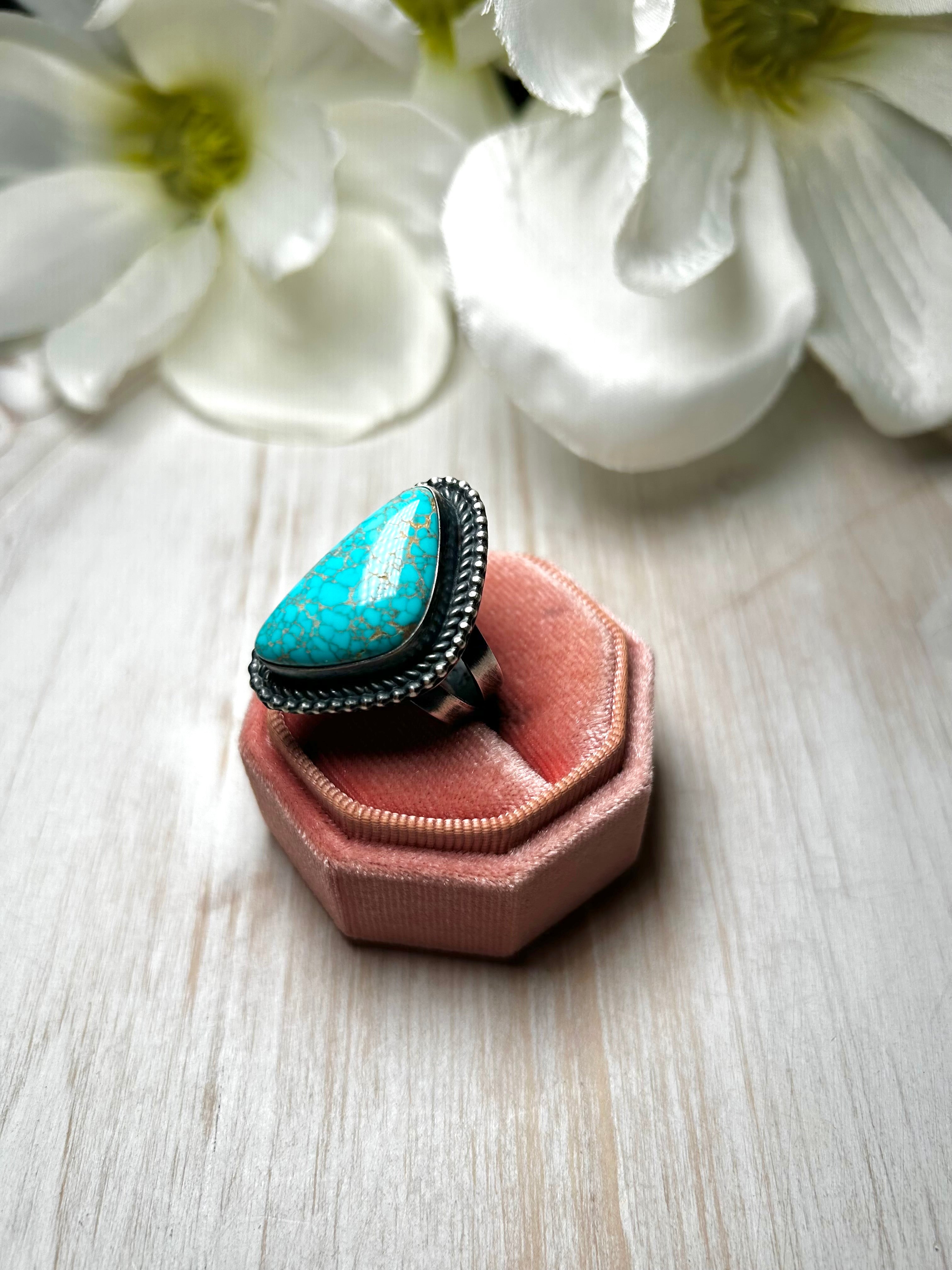 Antionette Martinez Royston Turquoise & Sterling Silver Ring Size 7. It measures 1 1/4 inches long and 3/4 of an inch wide. Signed by the artist and stamped sterling silver.