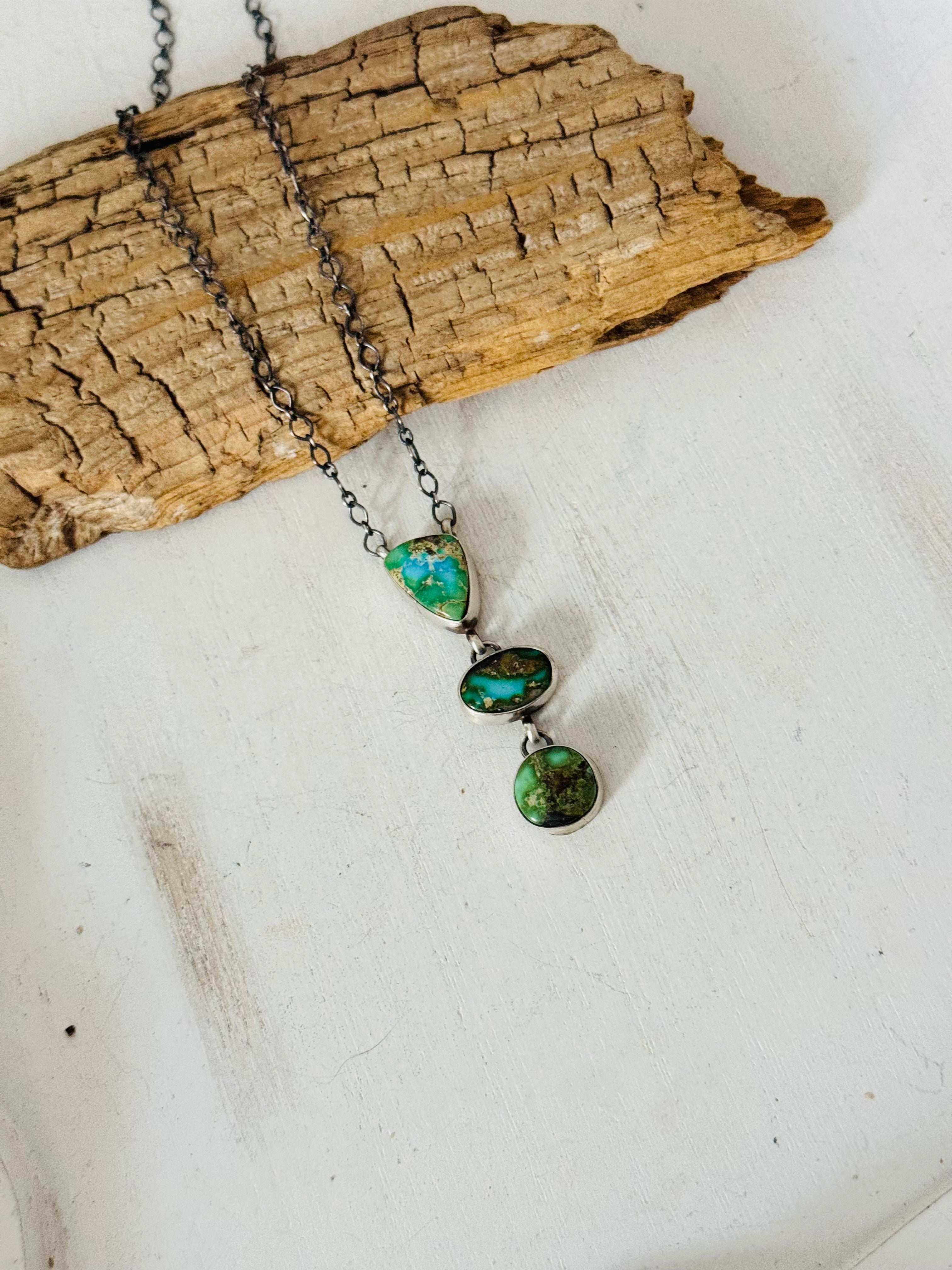 Antionette Martinez Sonoran Mountain Turquoise & Sterling Silver Lariat Necklace. It measures 23 inches long with hang while the chain measures 18 inches long. Signed by the artist and stamped sterling silver.