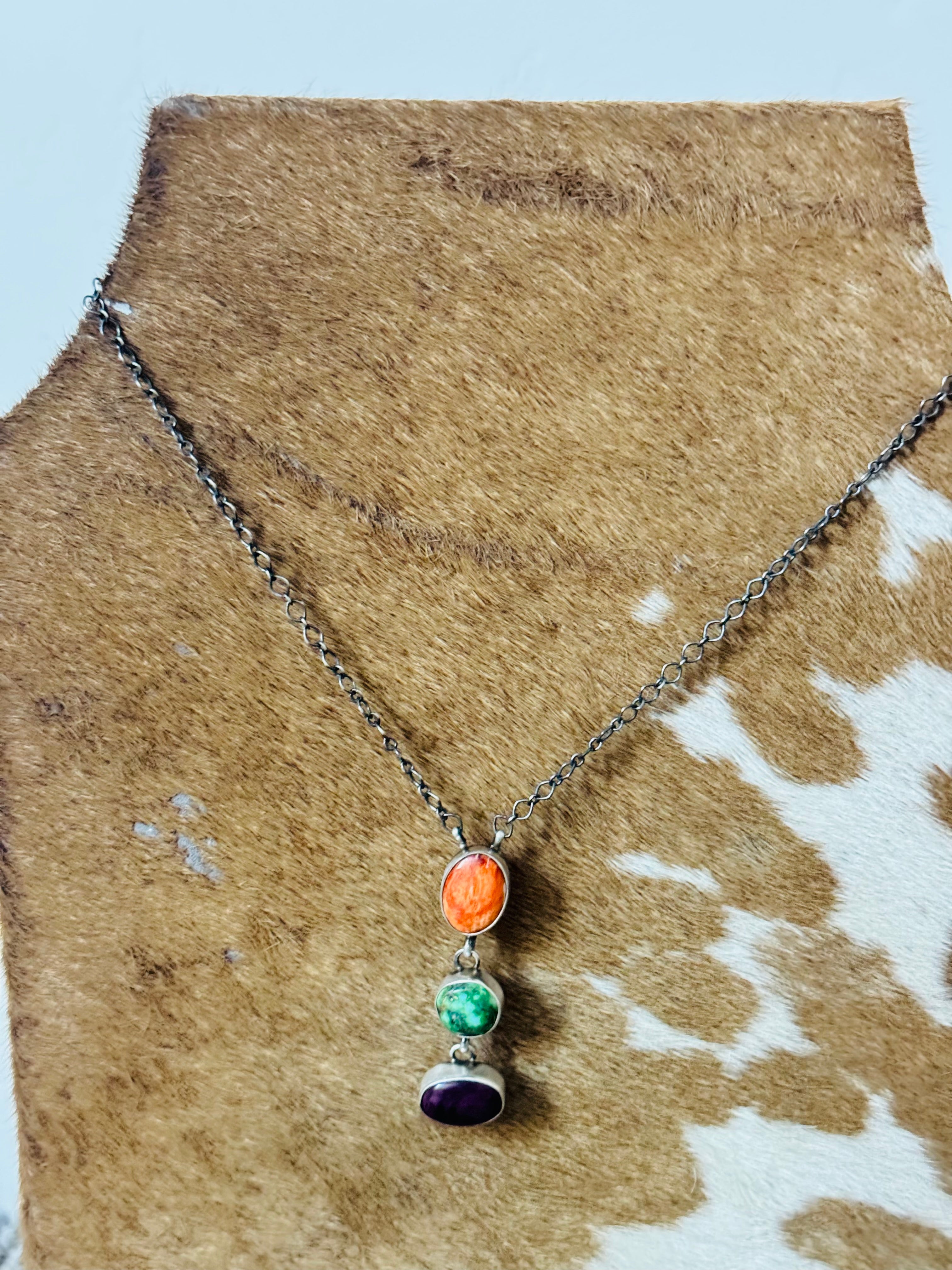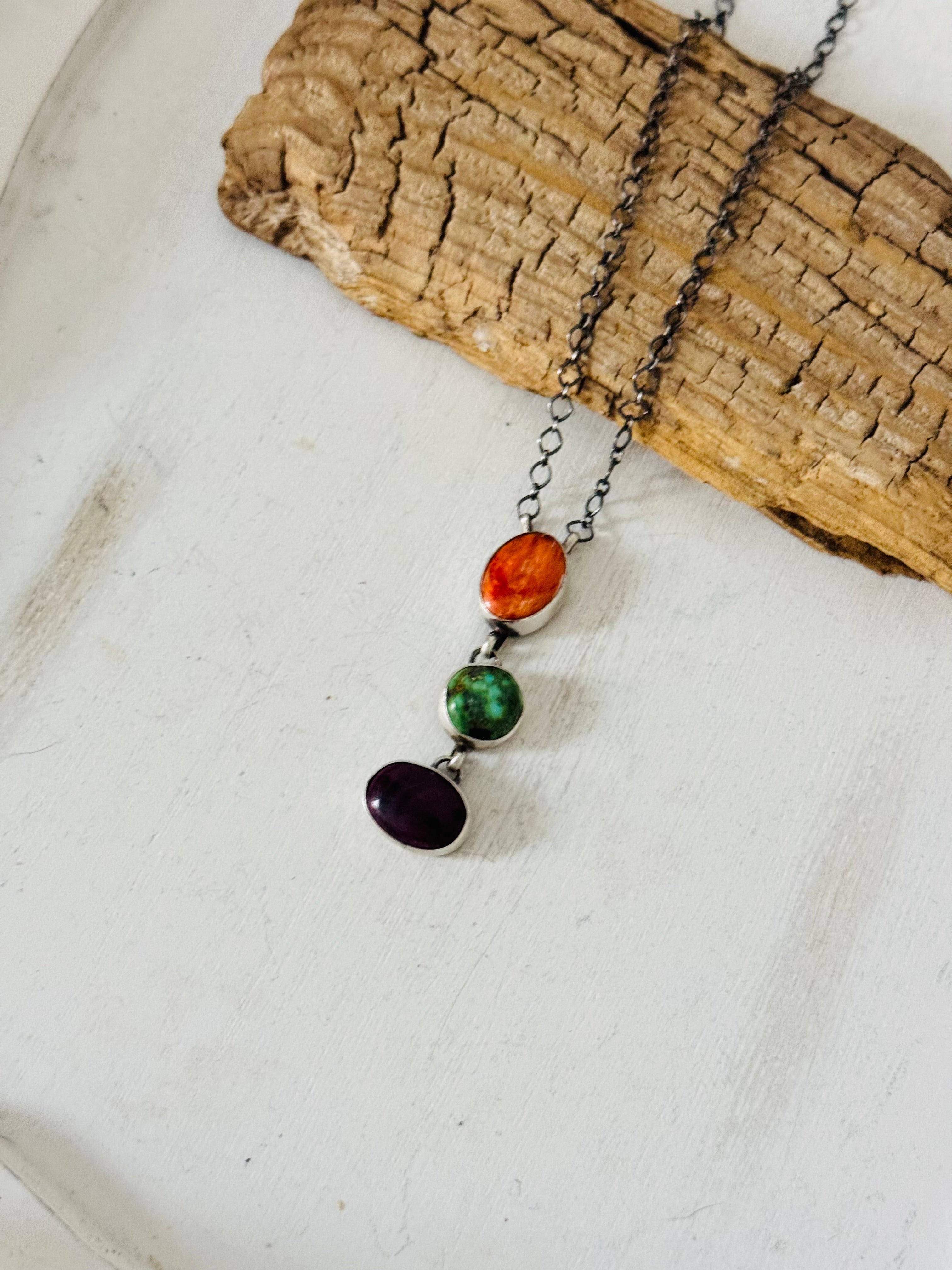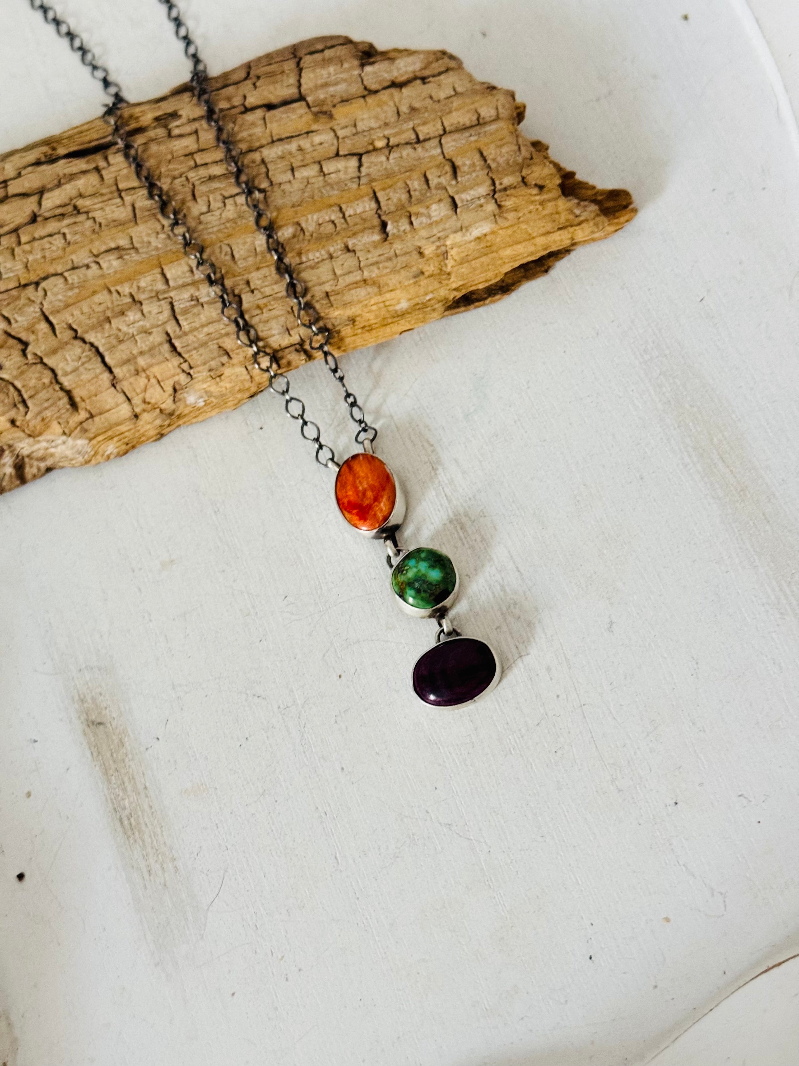 Antionette Martinez Multi Stone & Sterling Silver Lariat Necklace.  It measures 23 inches long with hang while the chain measures 18 inches long. Signed by the artist and stamped sterling silver.