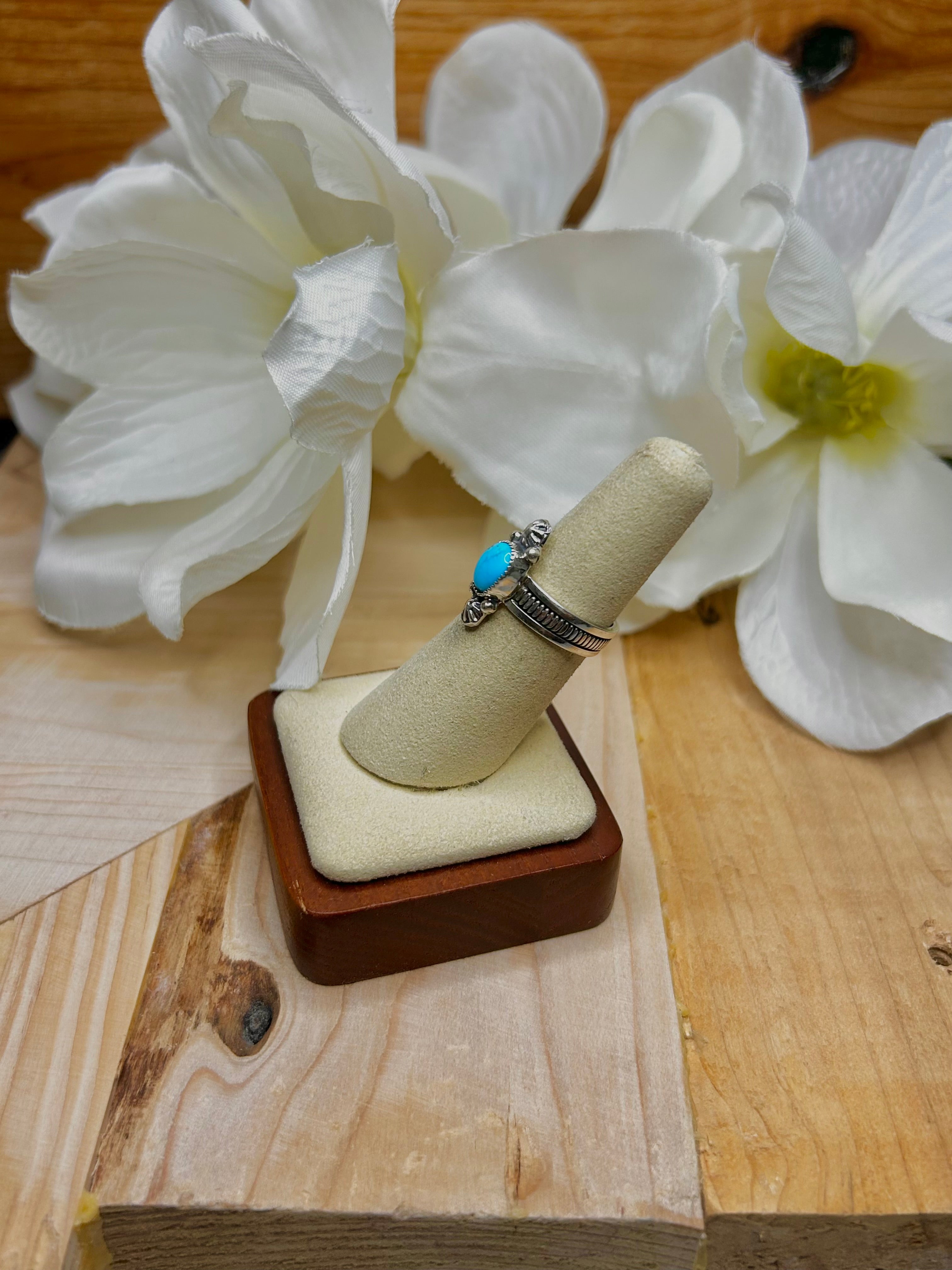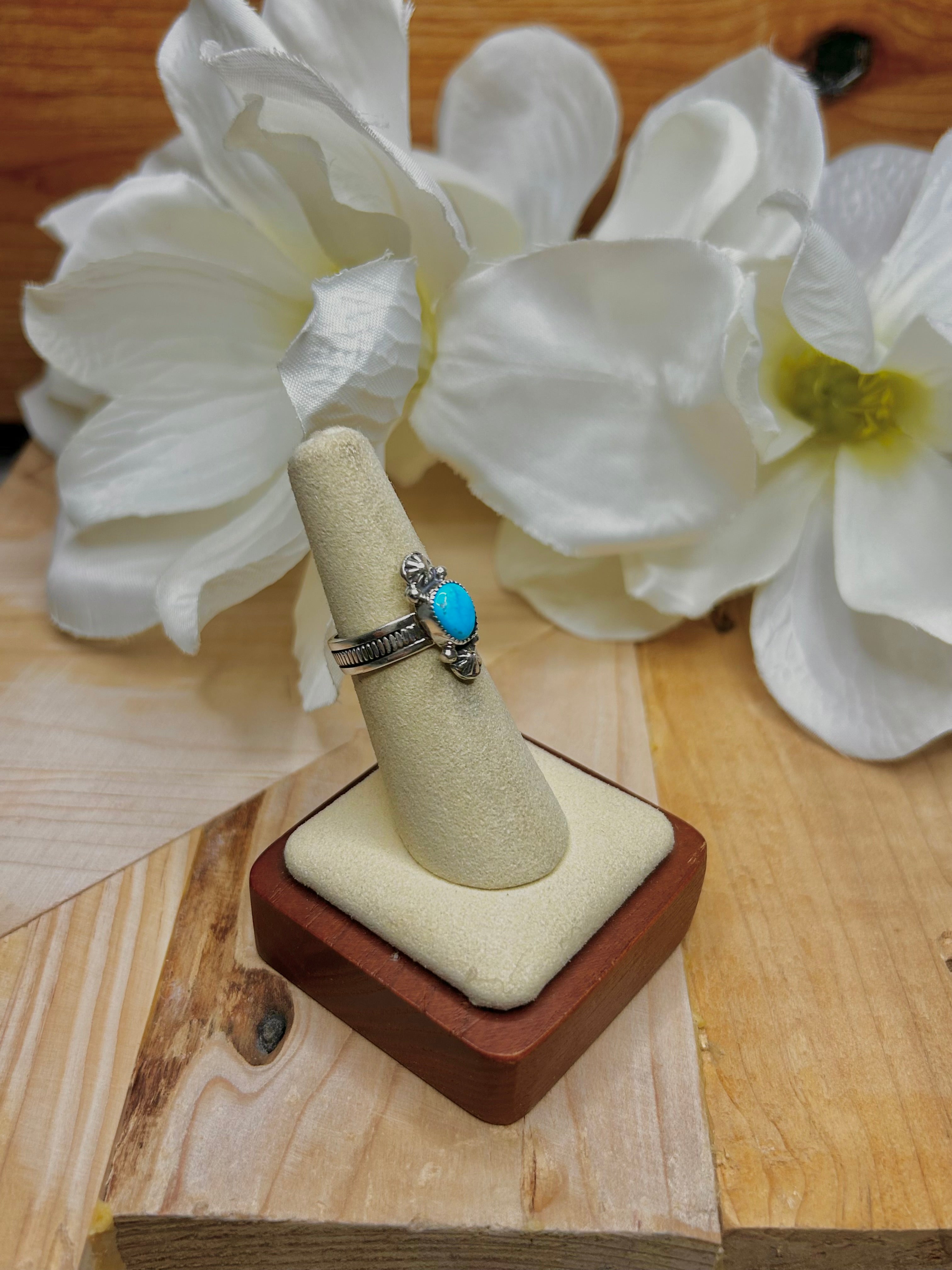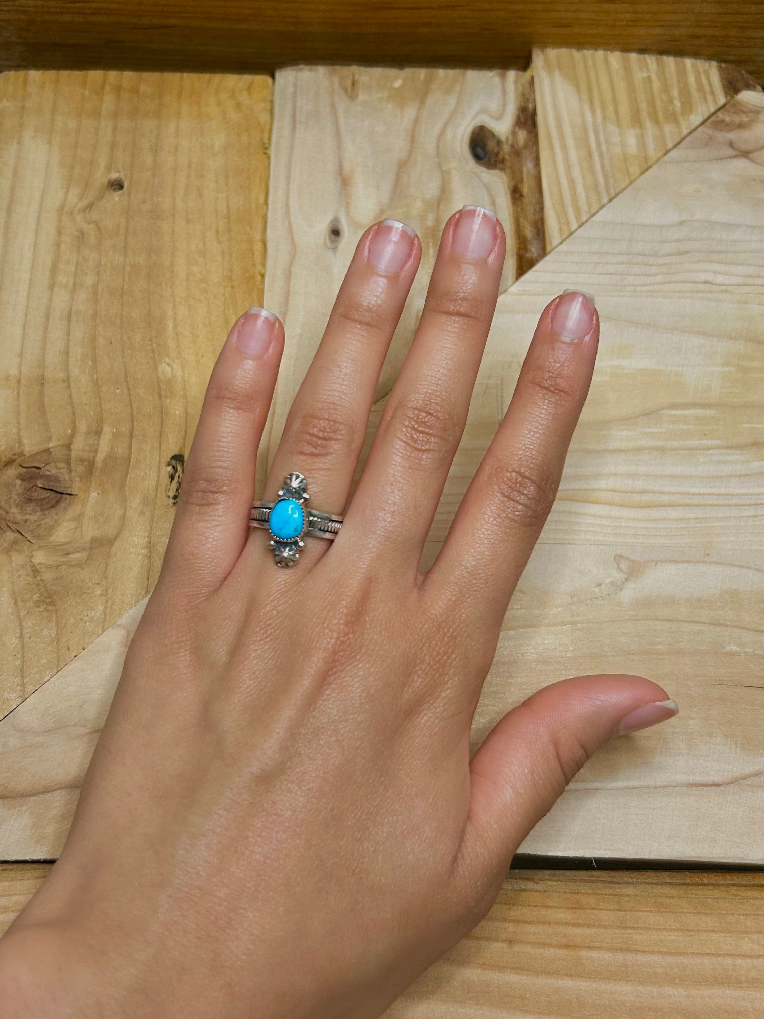 Arlene Lewis Kingman Turquoise & Sterling Silver Cluster Ring Size 6. It measures 3/4 of an inch long and 1/4 of an inch wide. Signed by artist and stamped sterling silver.