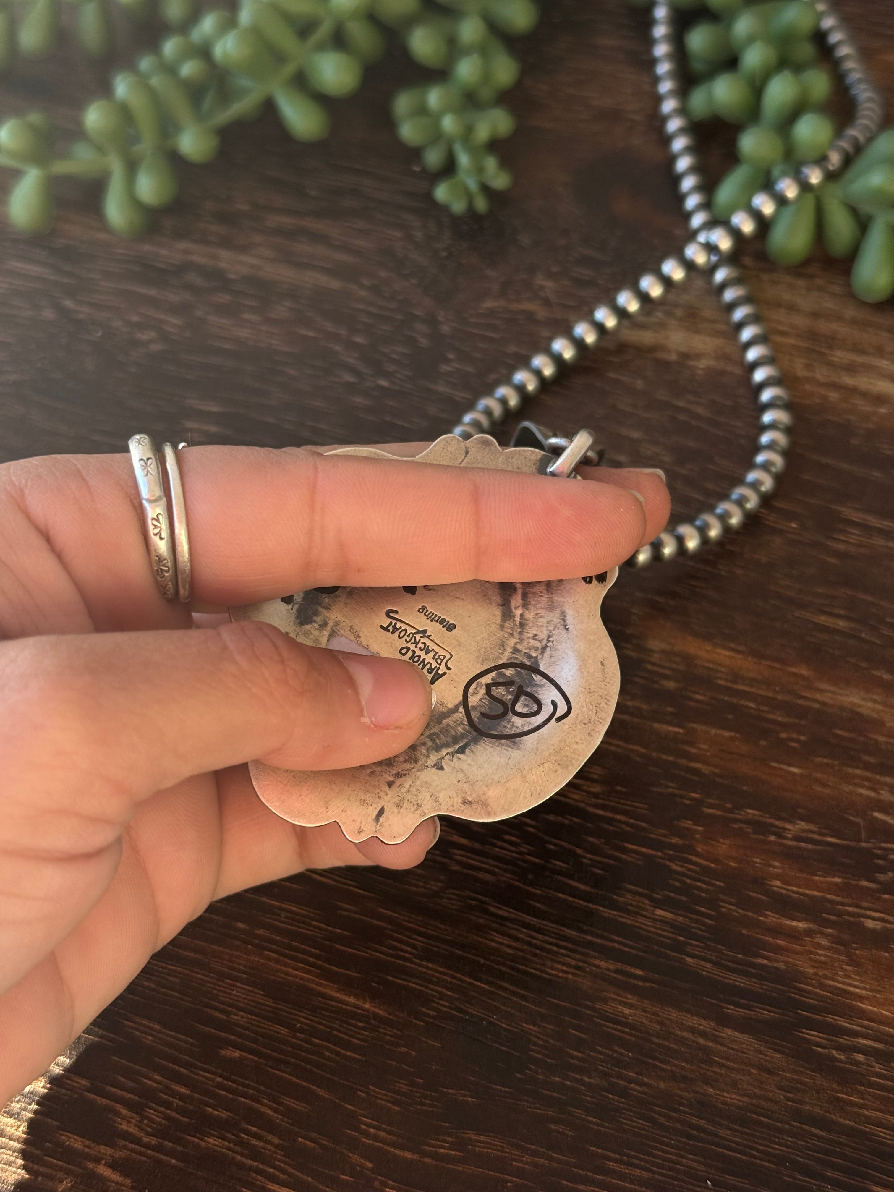 Arnold Blackgoat Royston Turquoise & Sterling Silver Concho Pendant. It measures 3 7/8 inches long and 2 1/8 inches wide. Pendant Only!! Signed by the artist and stamped sterling silver.