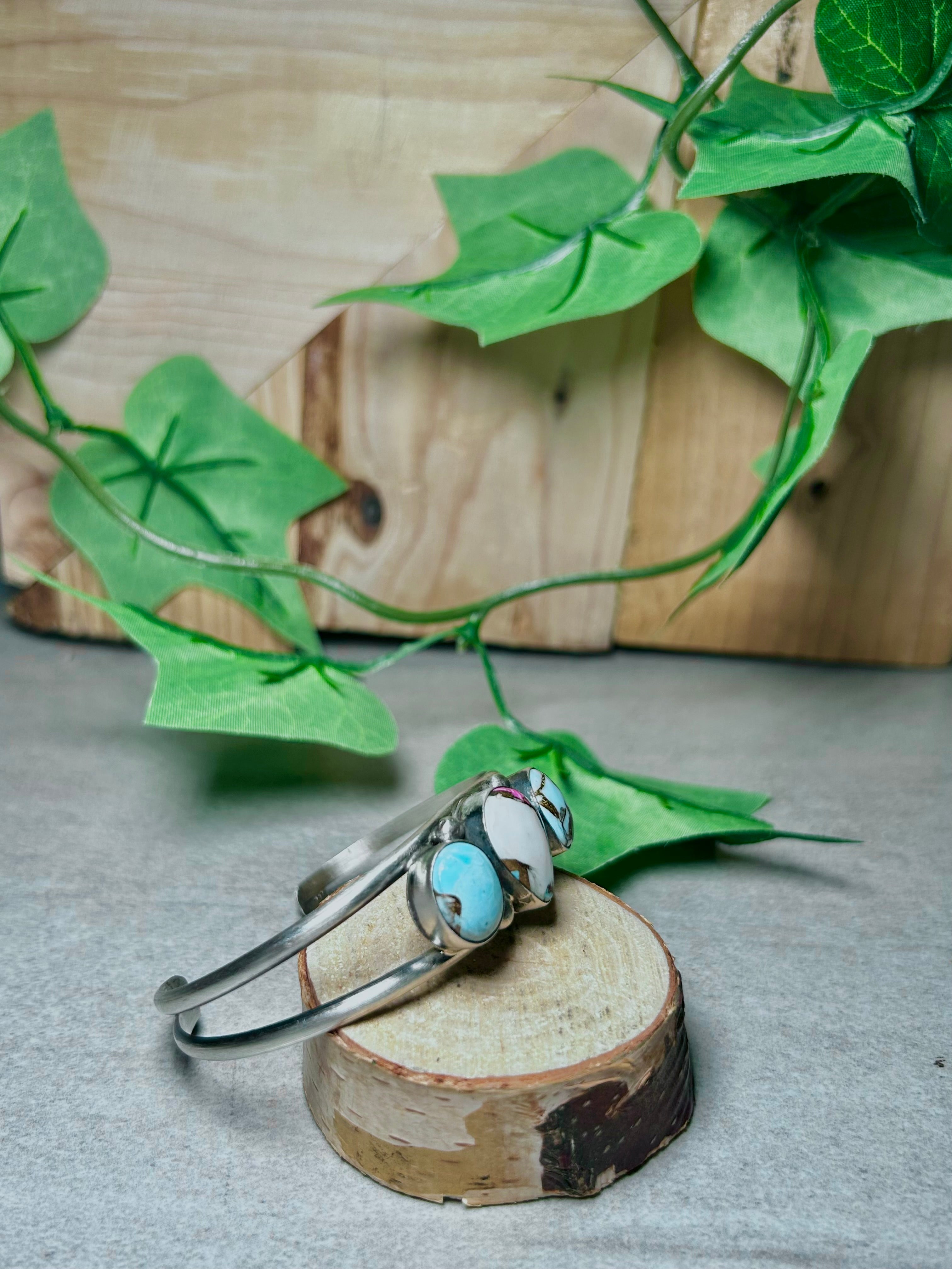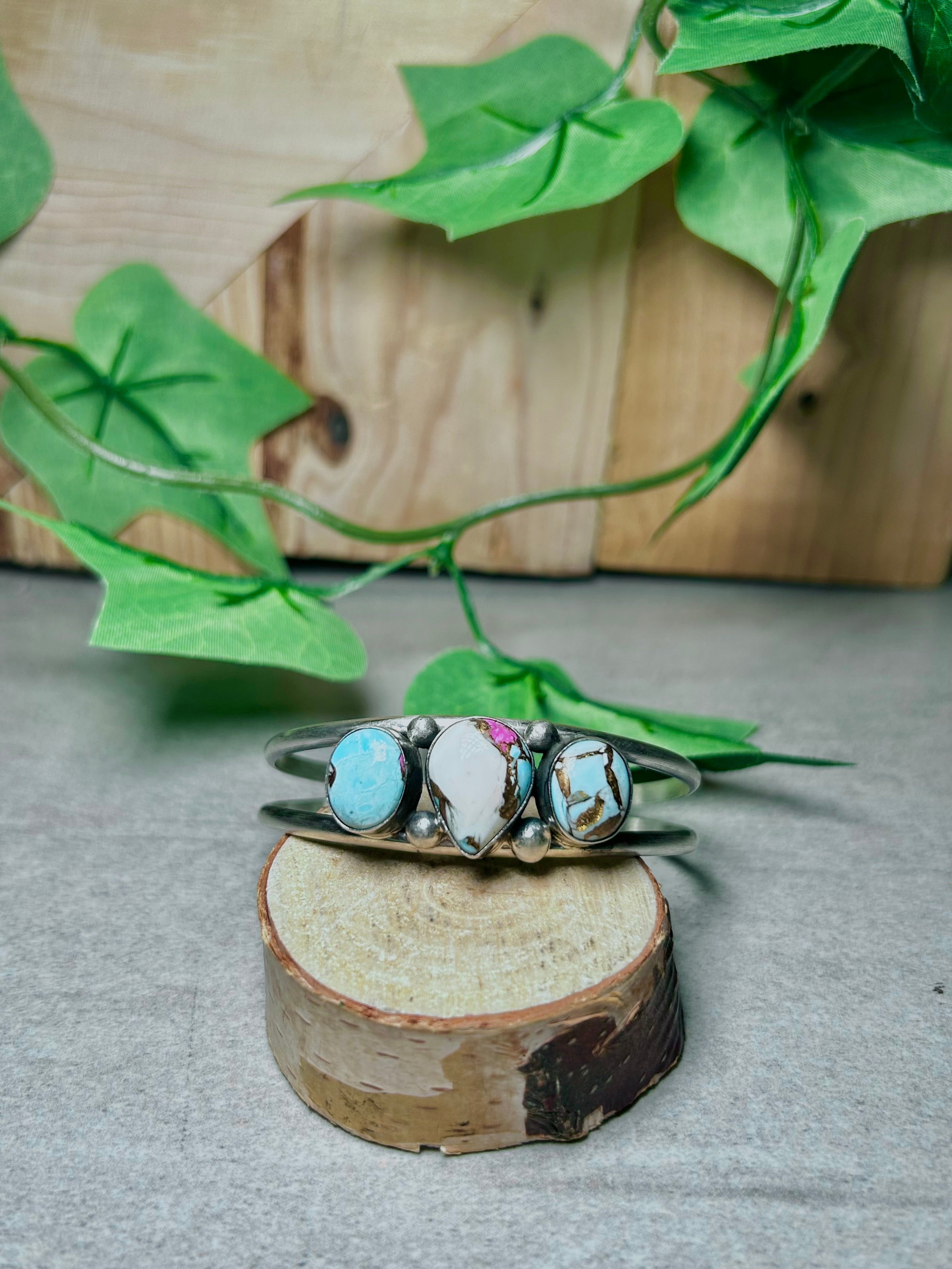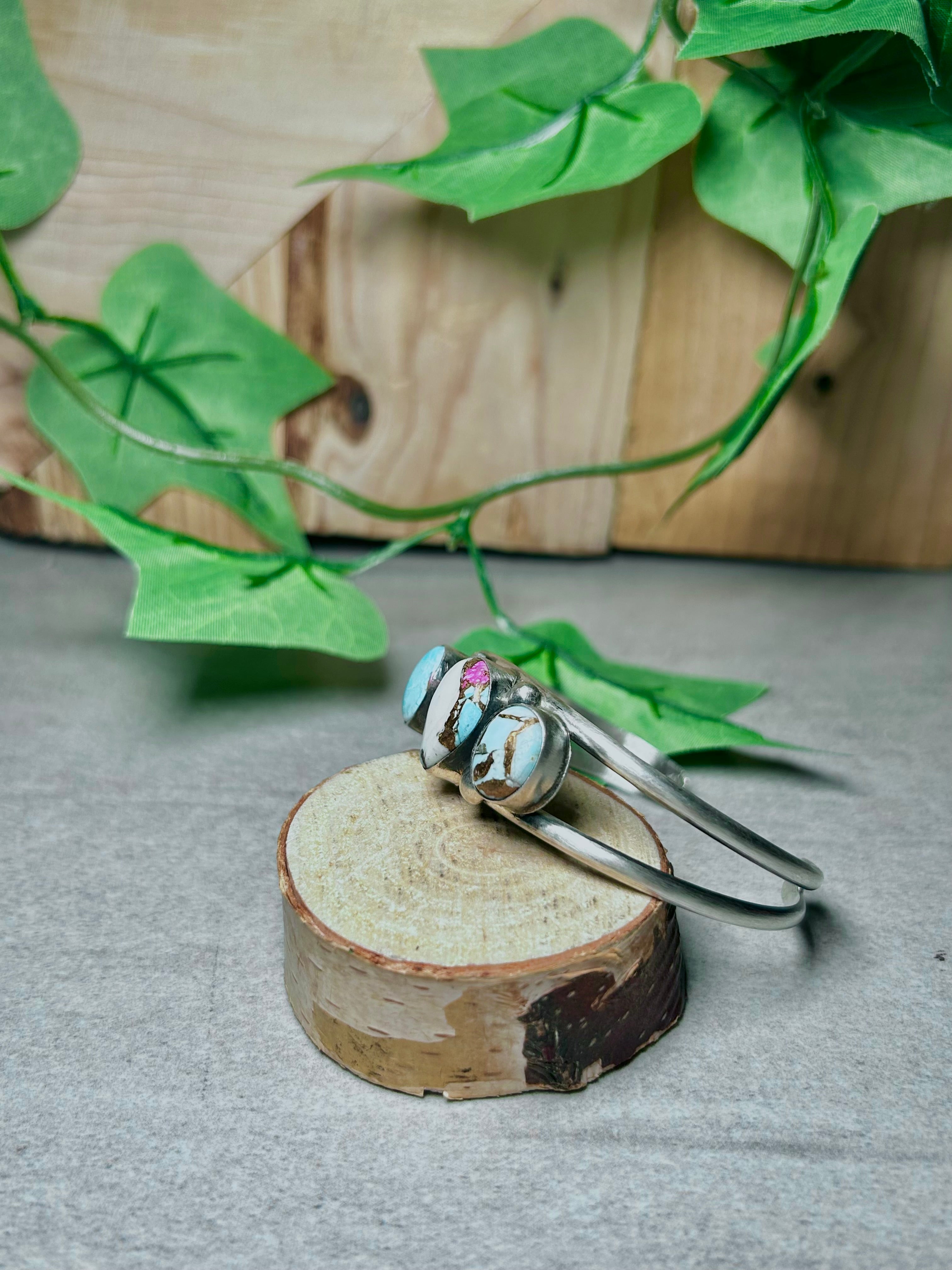 Augustine Largo Cotton Dahlia & Sterling Silver Cuff Bracelet. It measures 1 5/8 inches wide with an inside circumference of 5 1/2 inches and a gap of 1 inch Signed by the artist and stamped sterling silver.