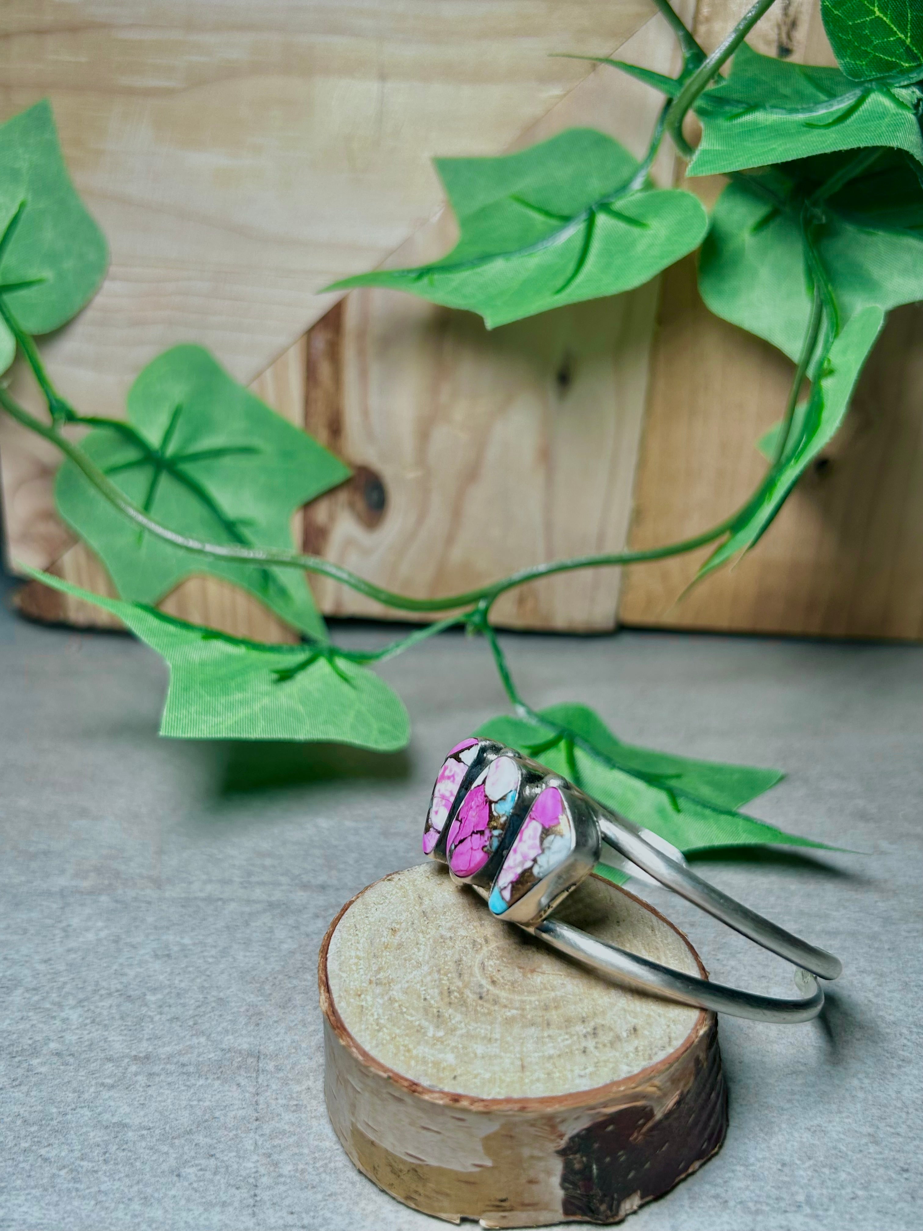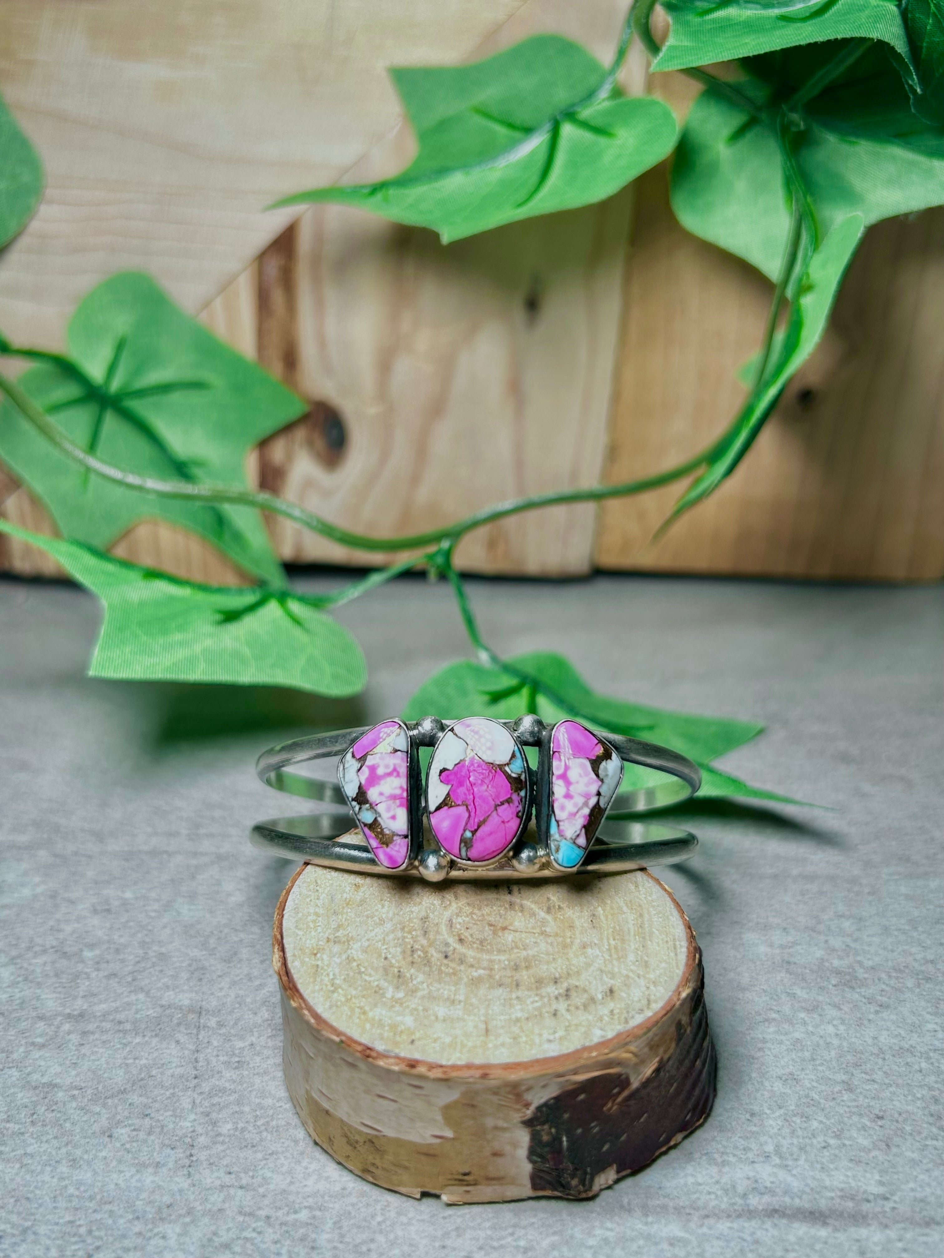 Augustine Largo Cotton Dahlia & Sterling Silver Cuff Bracelet. It measures 1 3/8 inches wide with an inside circumference of 5 1/2 inches and a gap of 1 inch Signed by the artist and stamped sterling silver.