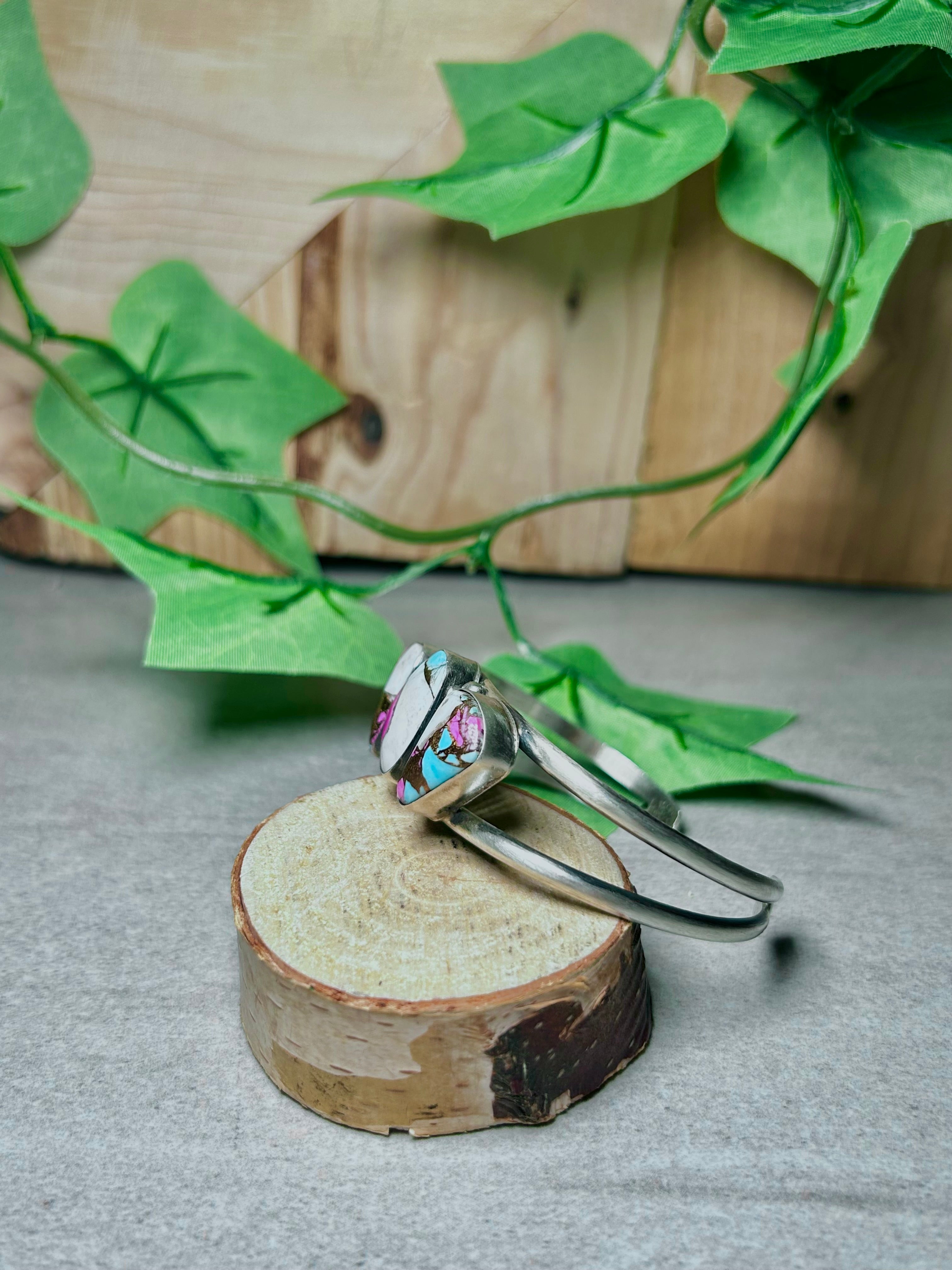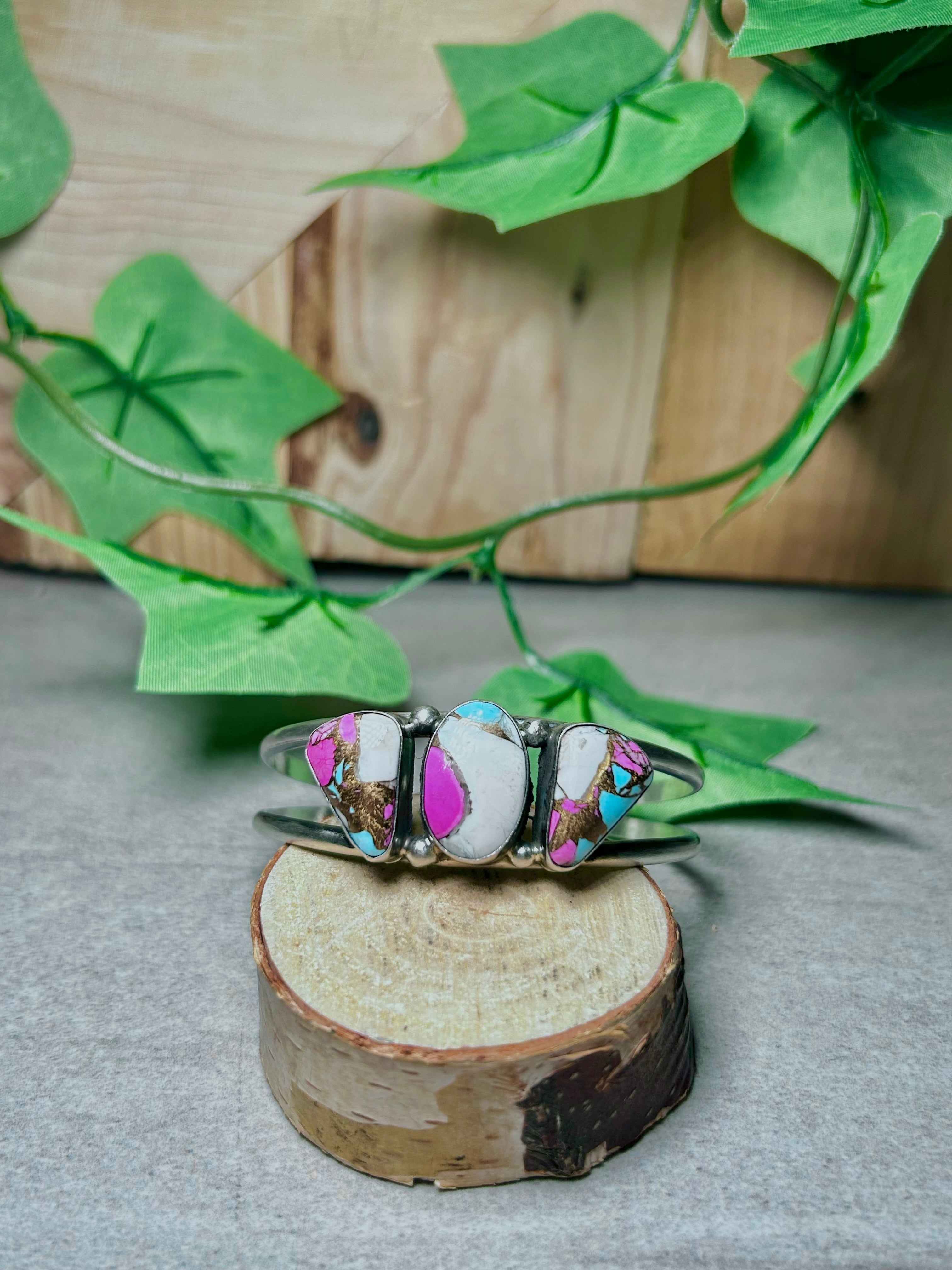 Augustine Largo Cotton Dahlia & Sterling Silver Cuff Bracelet. It measures 1 3/4 inches wide with an inside circumference of 5 1/2 inches and a gap of 1 inch Signed by the artist and stamped sterling silver.