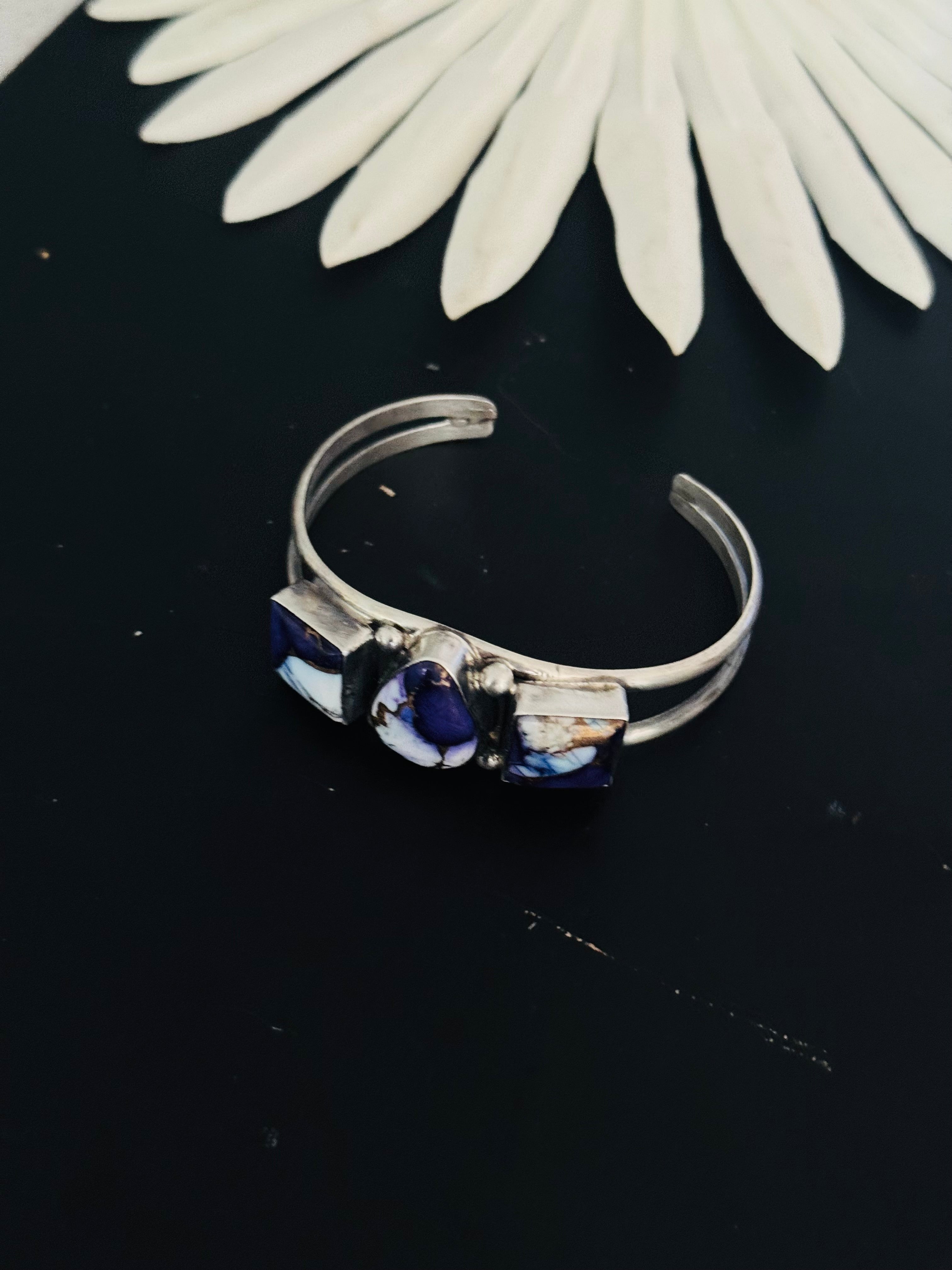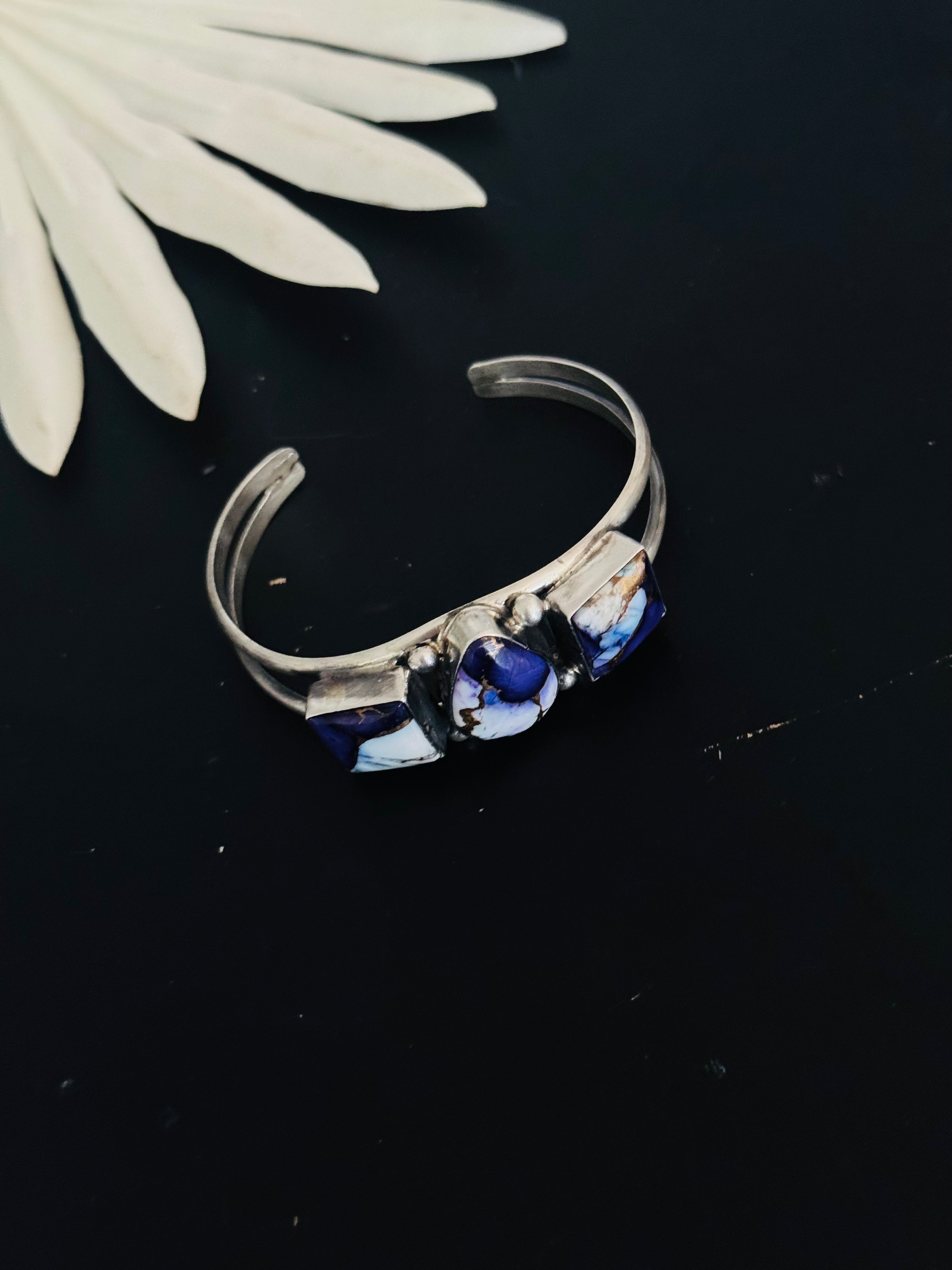 Augustine Largo Grape Dahlia & Sterling Silver Cuff Bracelet. It measures 3/4 of an inches wide with an inside circumference of 5 1/2 inches and a gap of 1 inch Signed by the artist and stamped sterling silver.