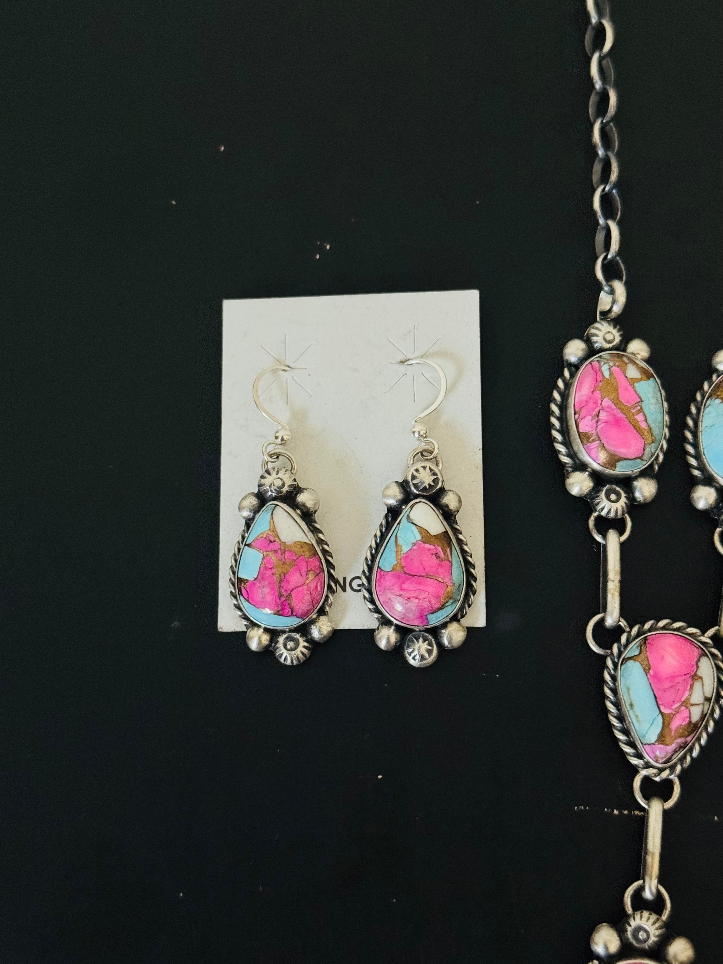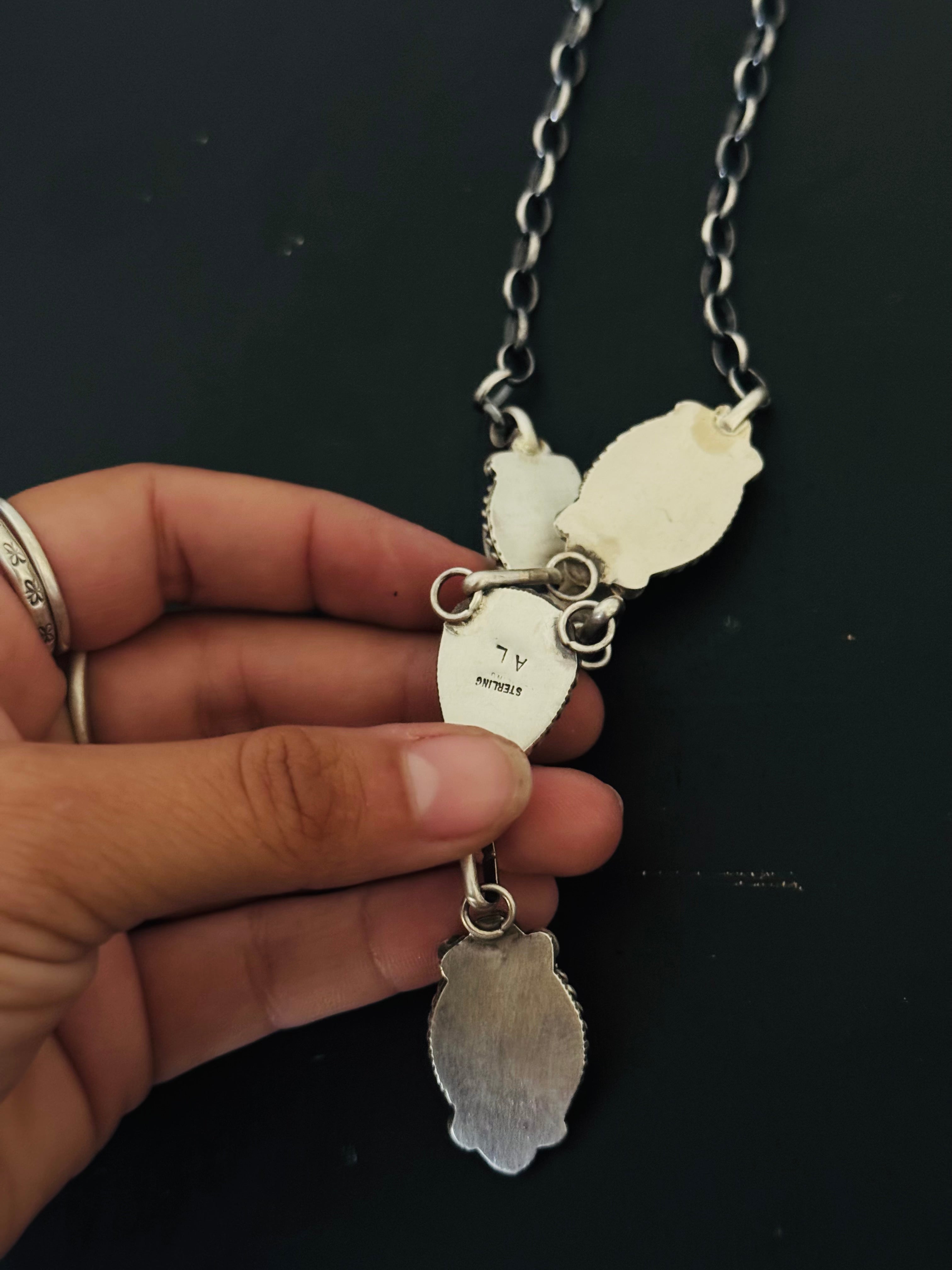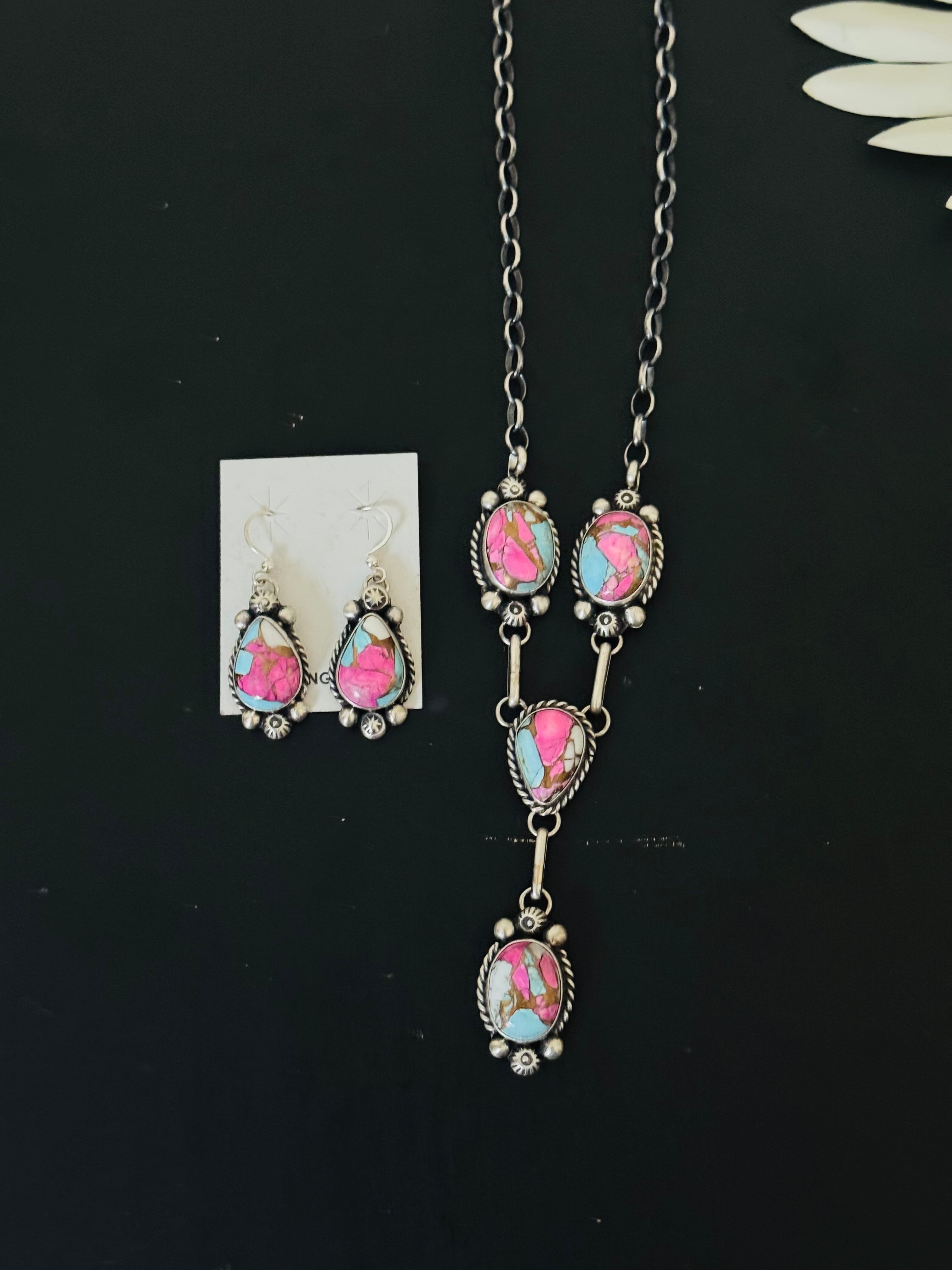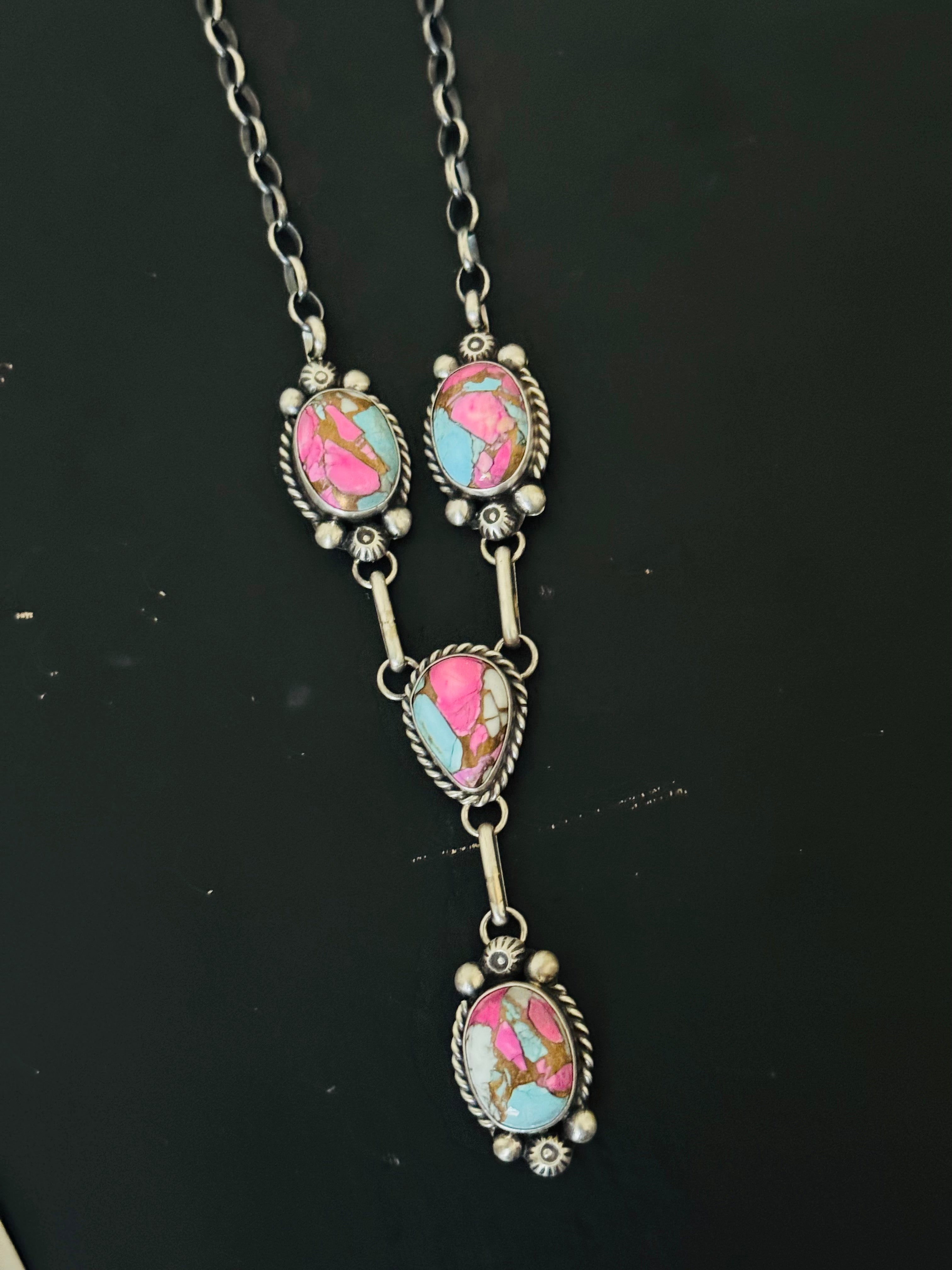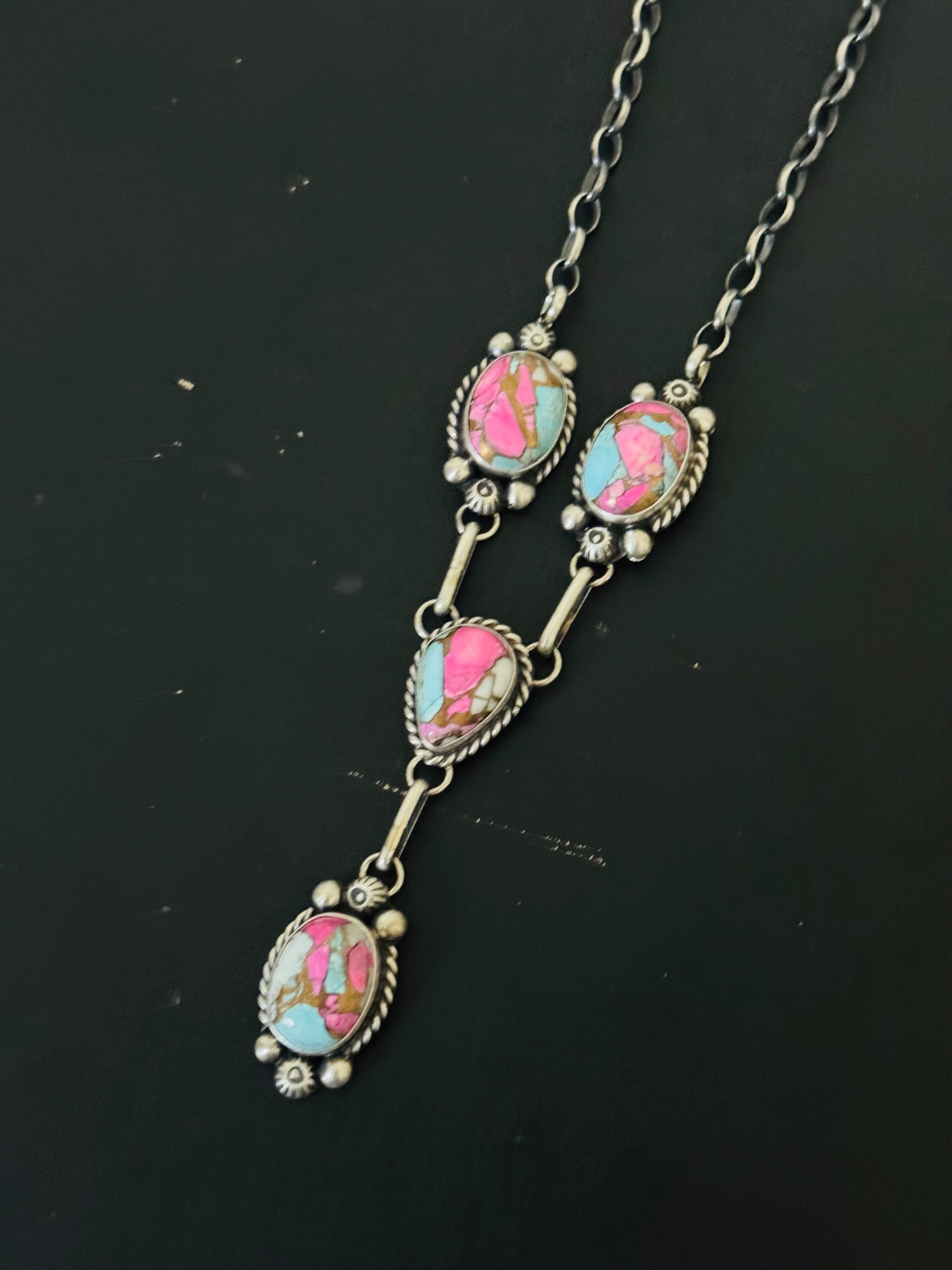 Augustine Largo Cotton Candy Dahlia Composite & Sterling Silver Lariat Necklace. It measures 25 inches long with hang while the chain by itself measures 20 inches long. Signed by the artist and stamped sterling silver.