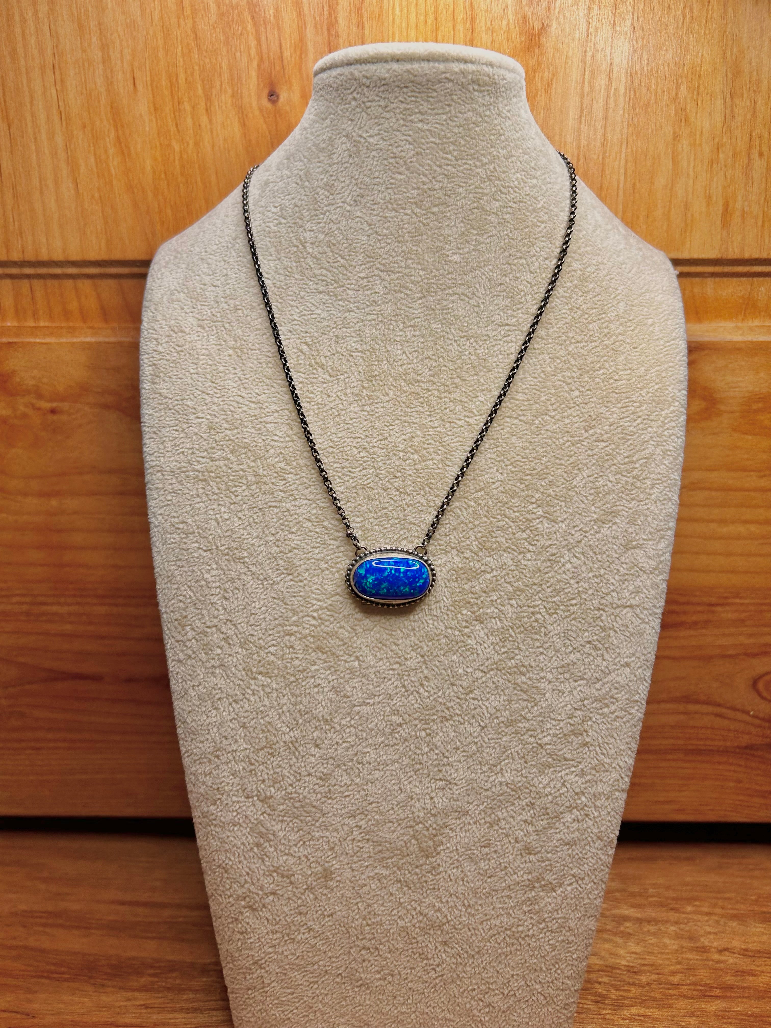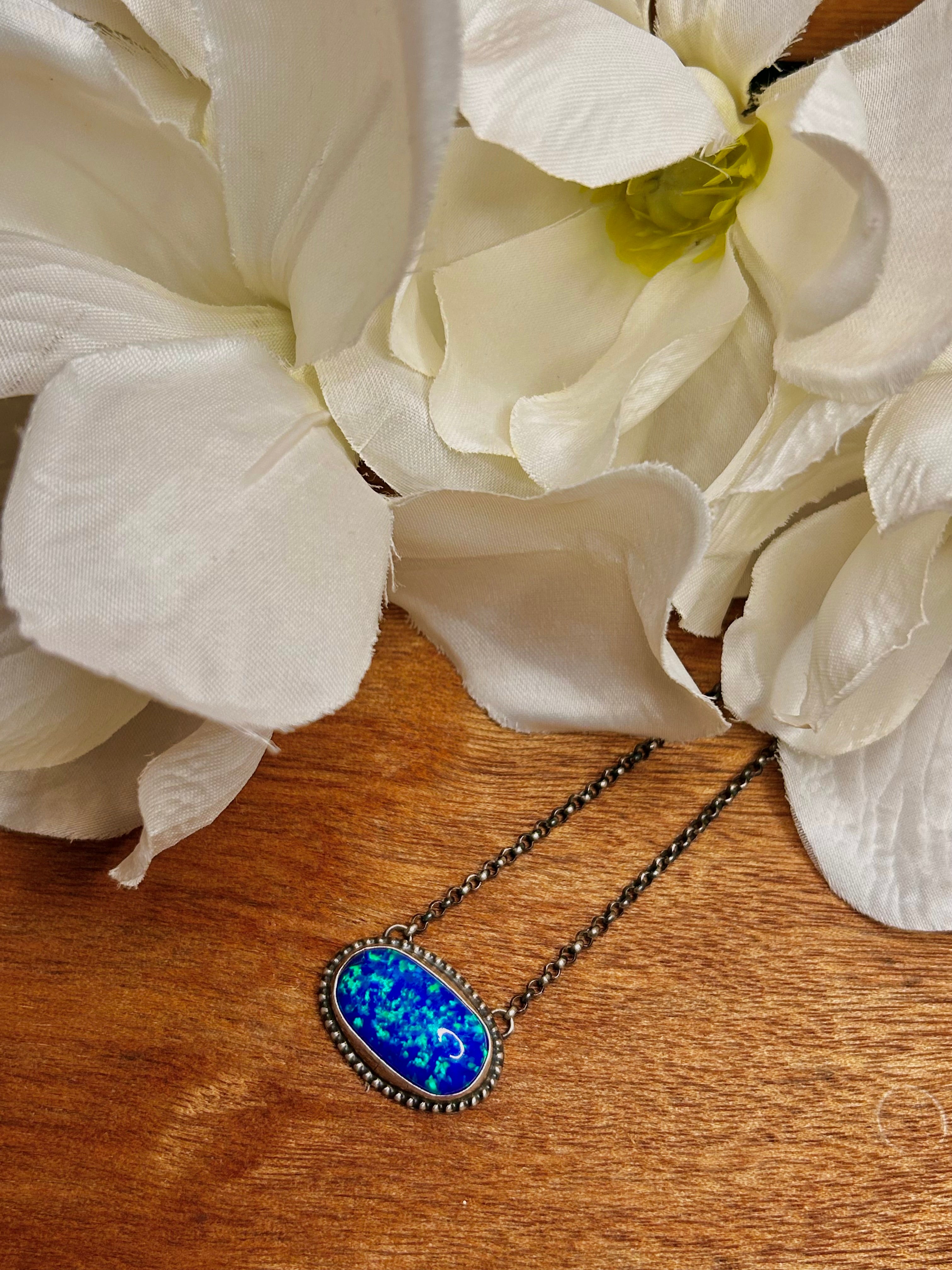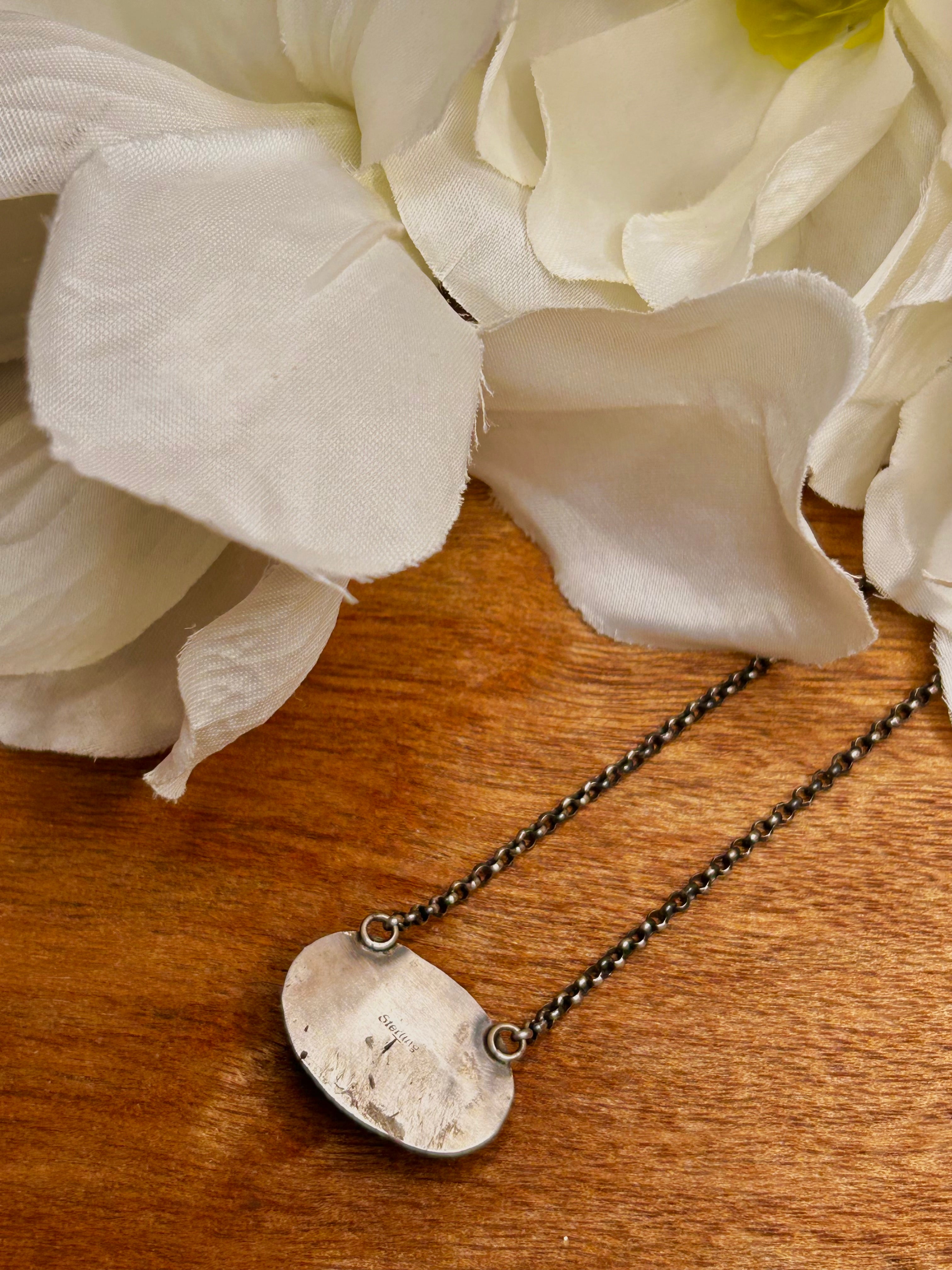Navajo Made Opal & Sterling Silver Necklace. It measures 19 1/4 inches long with hang while the chain measures 18 inches long. Signed by the artist and stamped sterling silver.